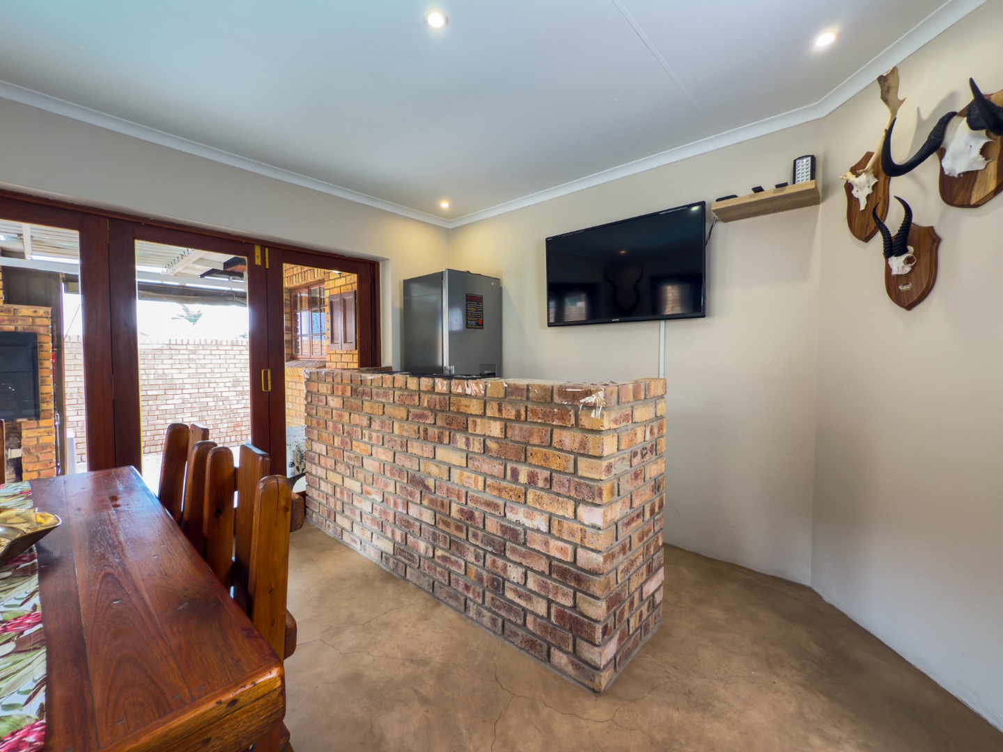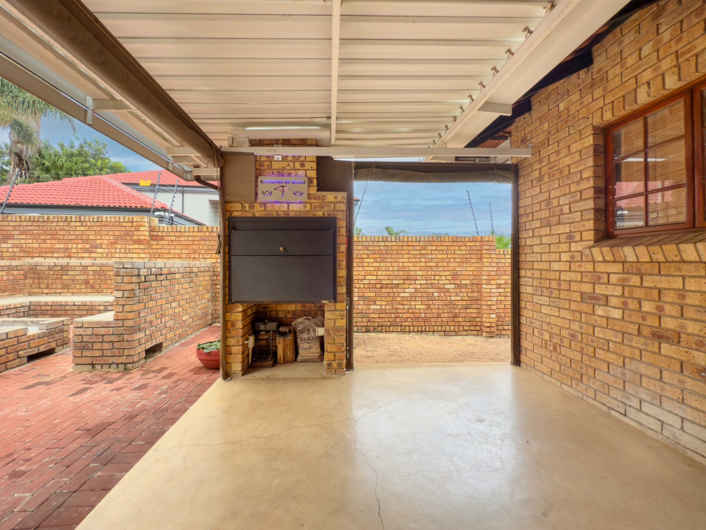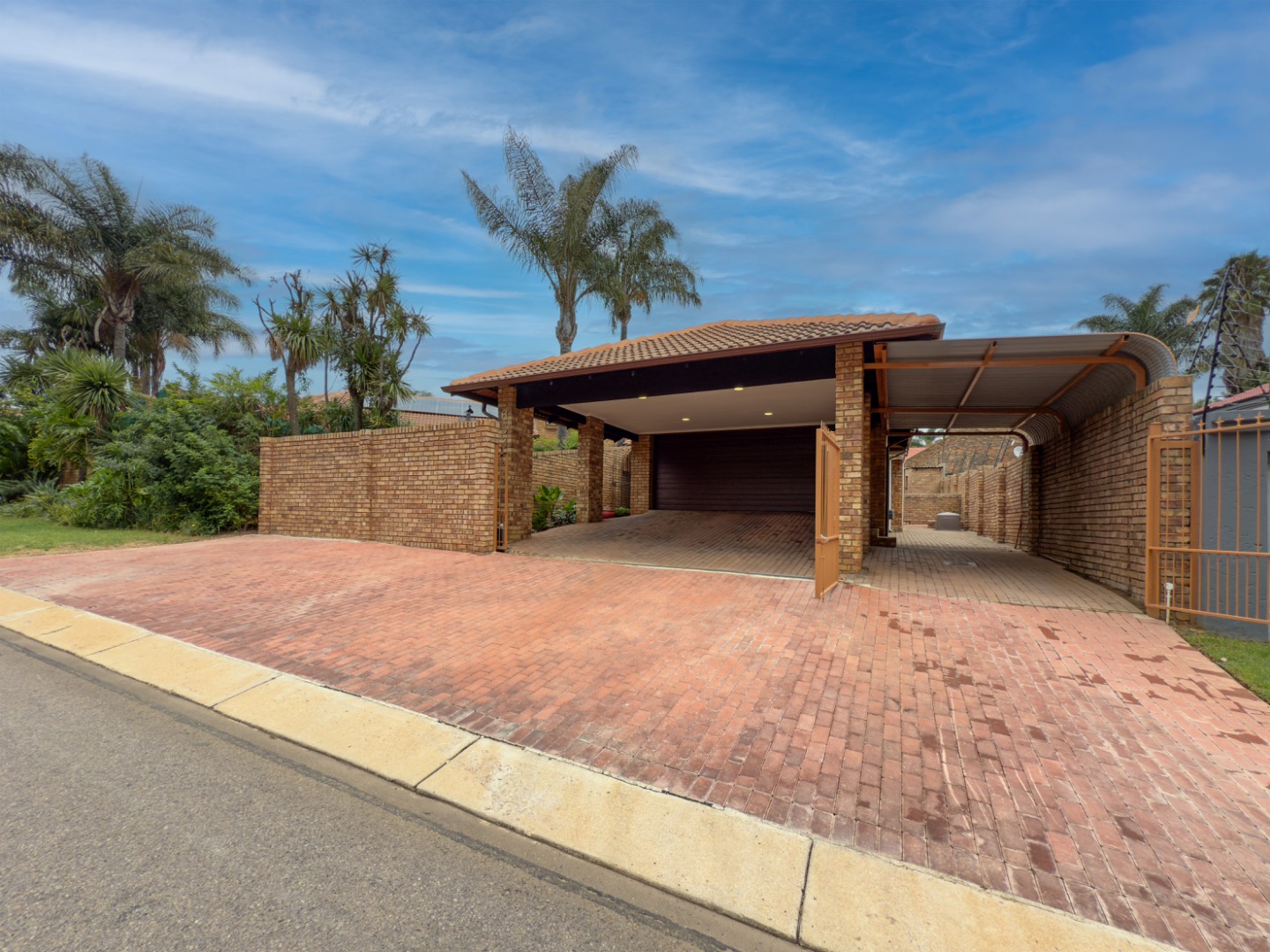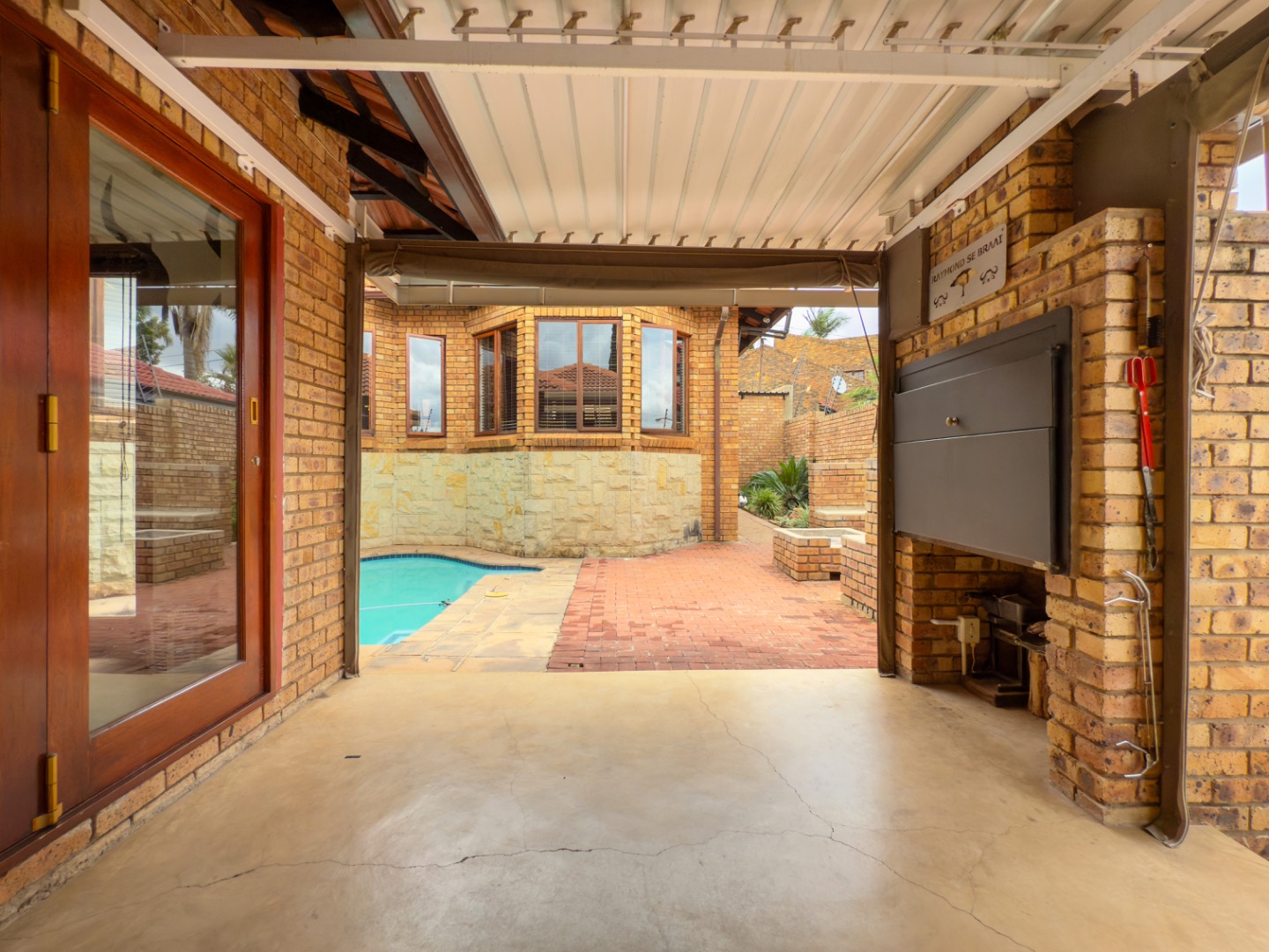 Outdoor entertainment is a highlight, featuring a bar area that flows effortlessly onto the patio. A built-in braai, a boma braai, and a sparkling pool create the perfect setting for hosting family and friends. This property includes Hunter auto irrigation, two storage rooms, and abundant parking with a double garage, three carports, and additional space for up to five vehicles.