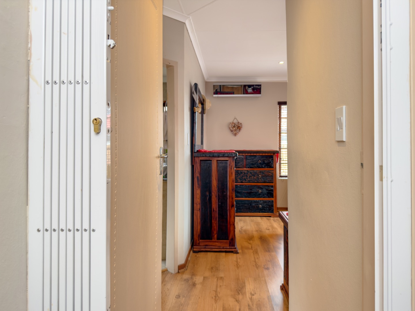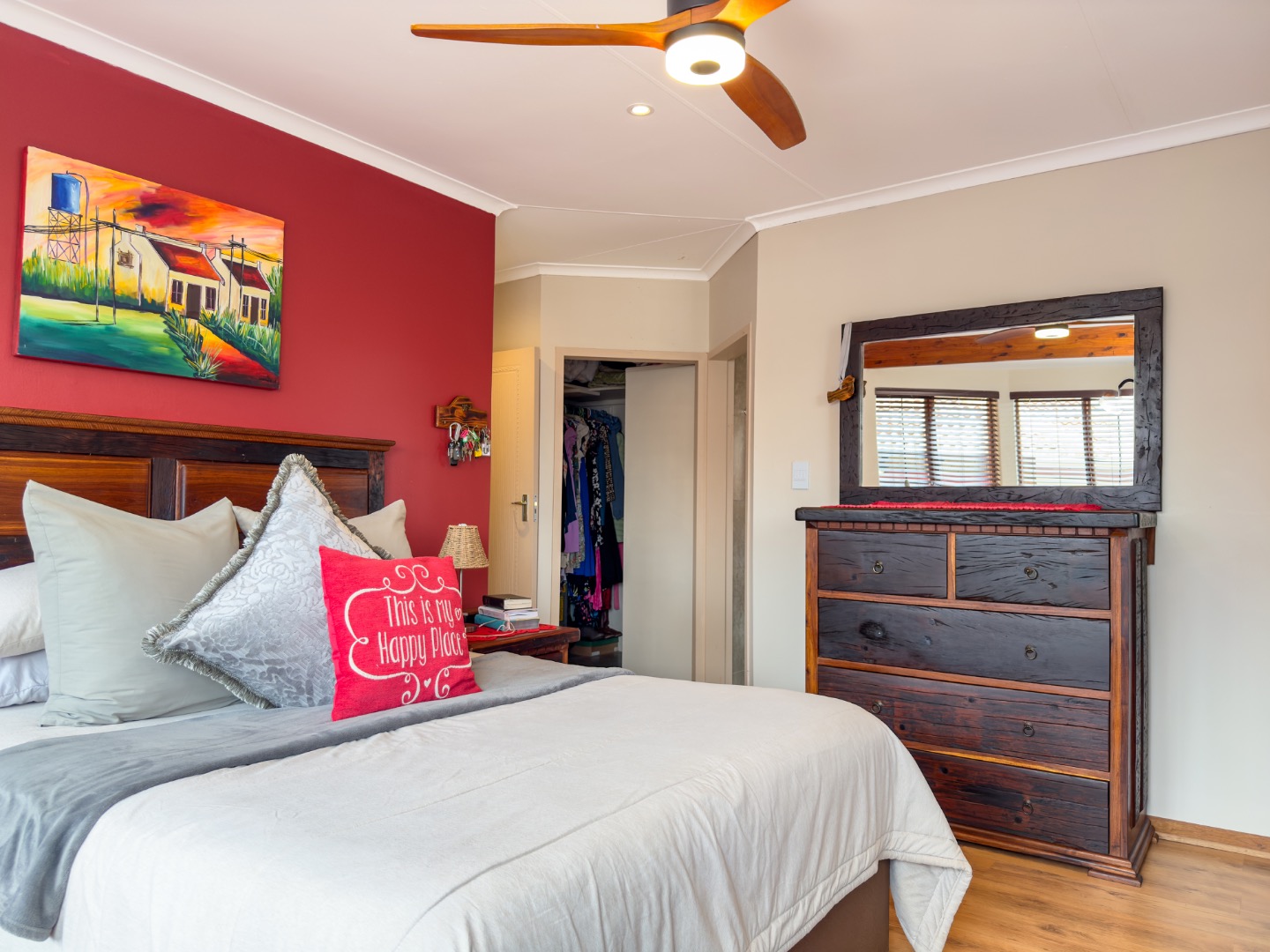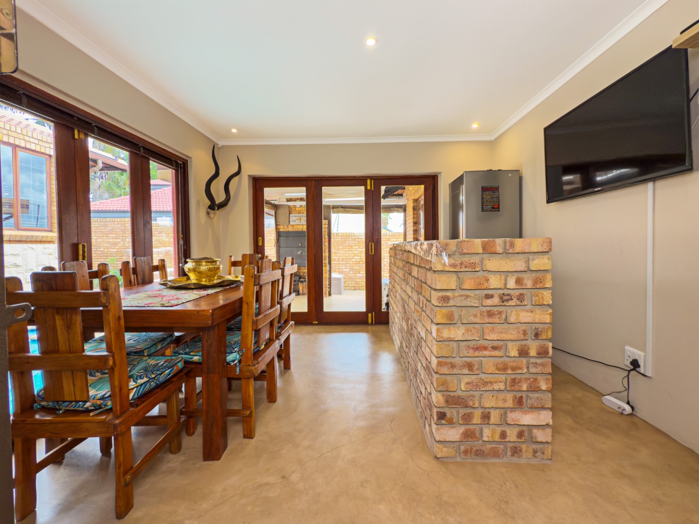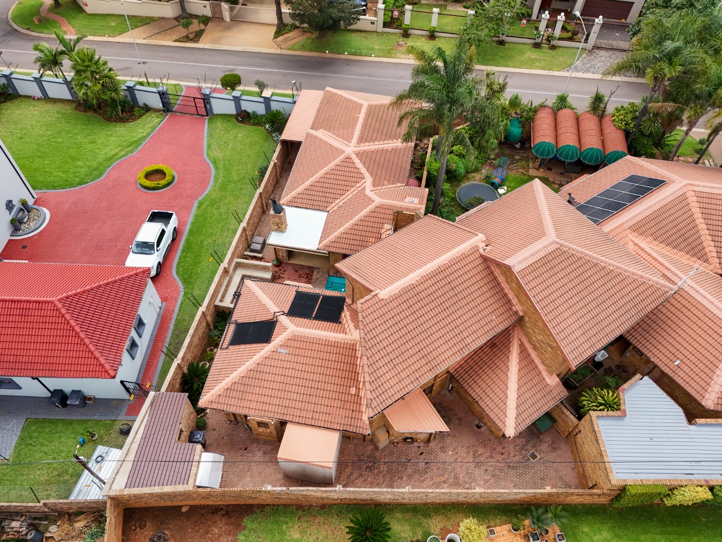 Outdoor entertainment is a highlight, featuring a bar area that flows effortlessly onto the patio. A built-in braai, a boma braai, and a sparkling pool create the perfect setting for hosting family and friends. This property includes Hunter auto irrigation, two storage rooms, and abundant parking with a double garage, three carports, and additional space for up to five vehicles.
