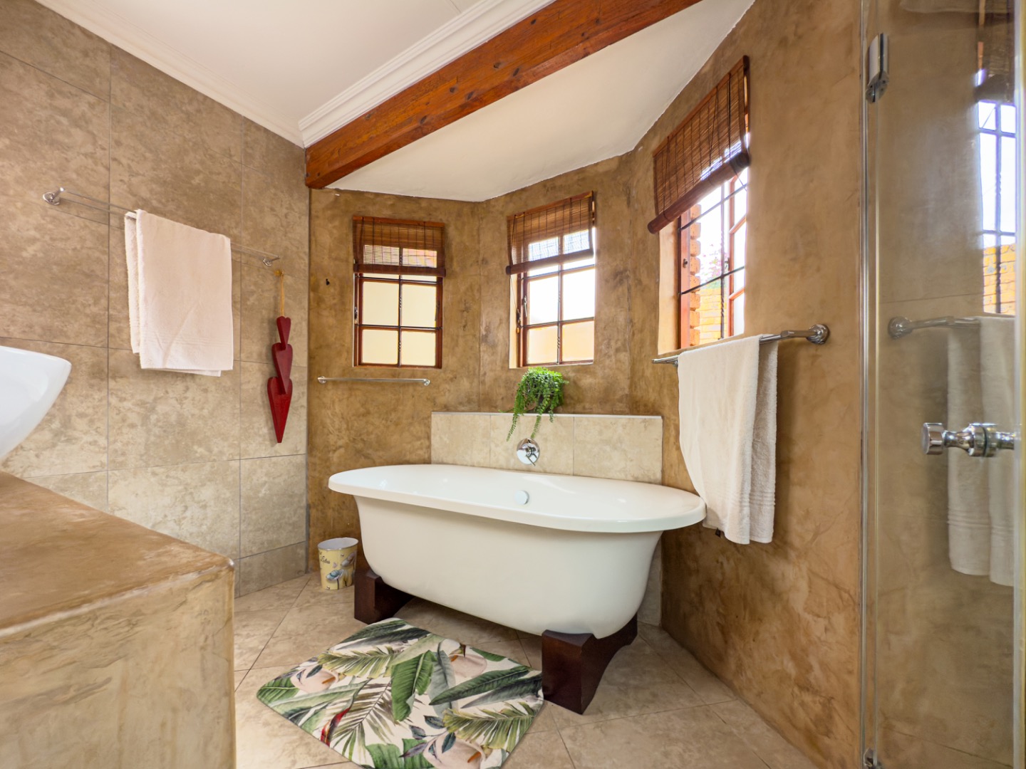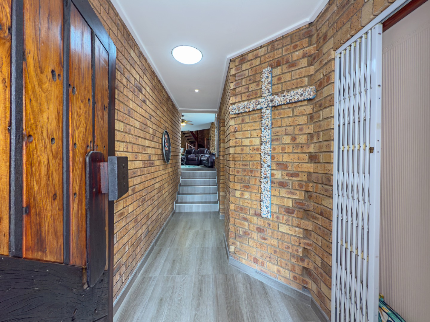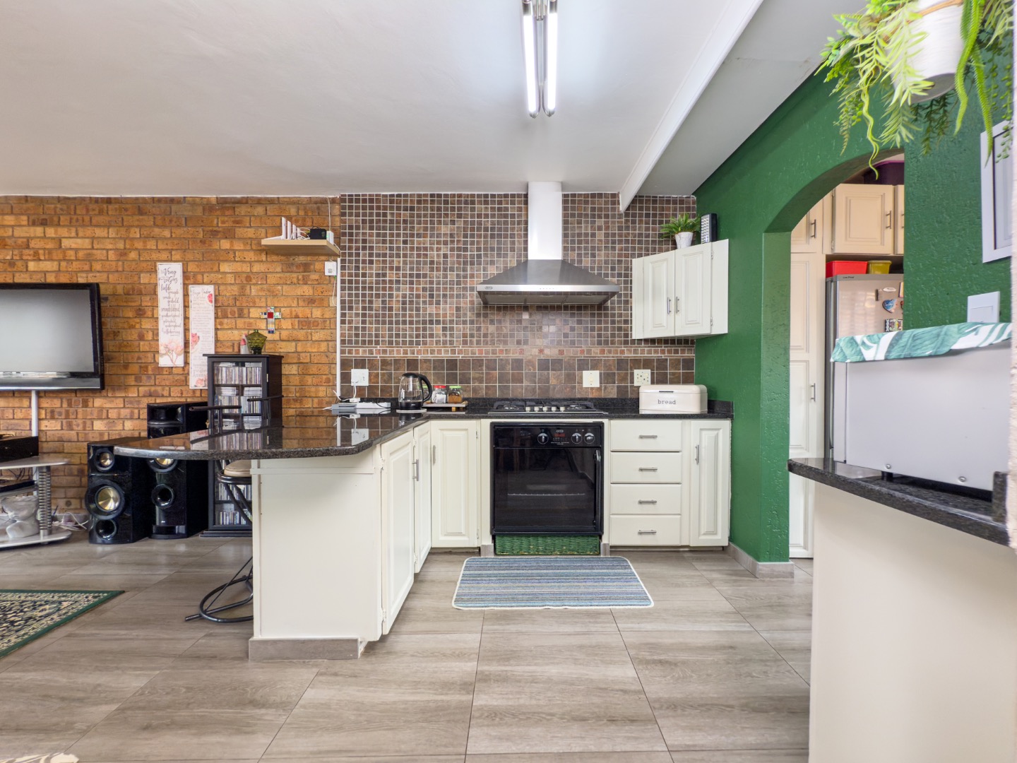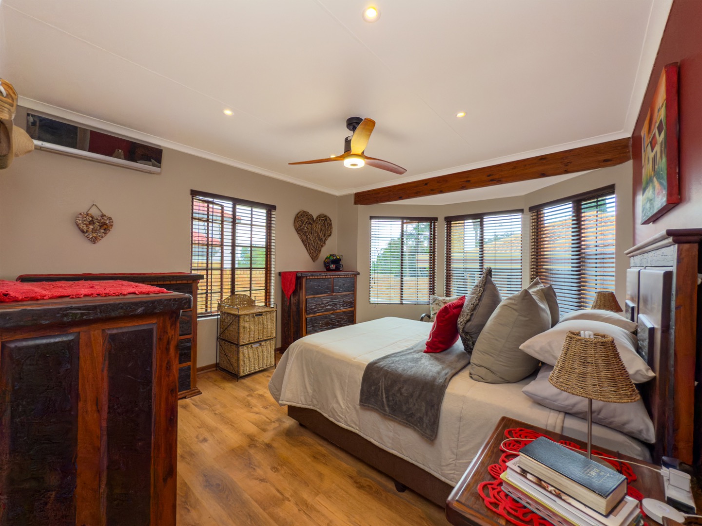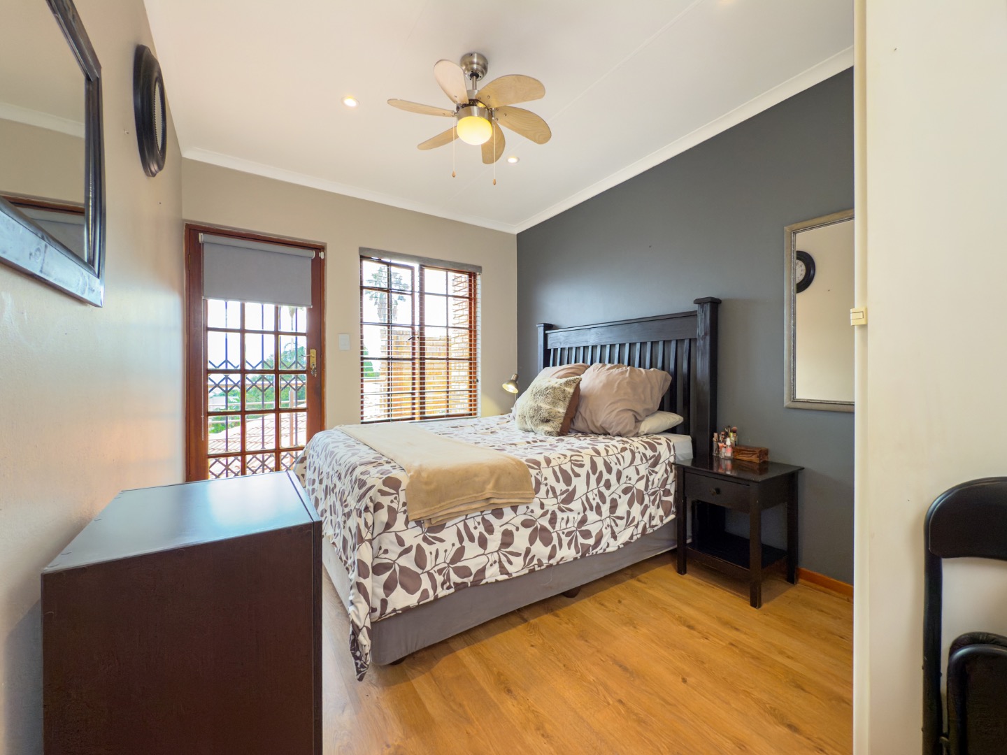Outdoor entertainment is a highlight, featuring a bar area that flows effortlessly onto the patio. A built-in braai, a boma braai, and a sparkling pool create the perfect setting for hosting family and friends. This property includes Hunter auto irrigation, two storage rooms, and abundant parking with a double garage, three carports, and additional space for up to five vehicles.