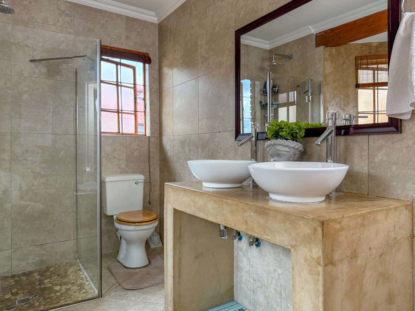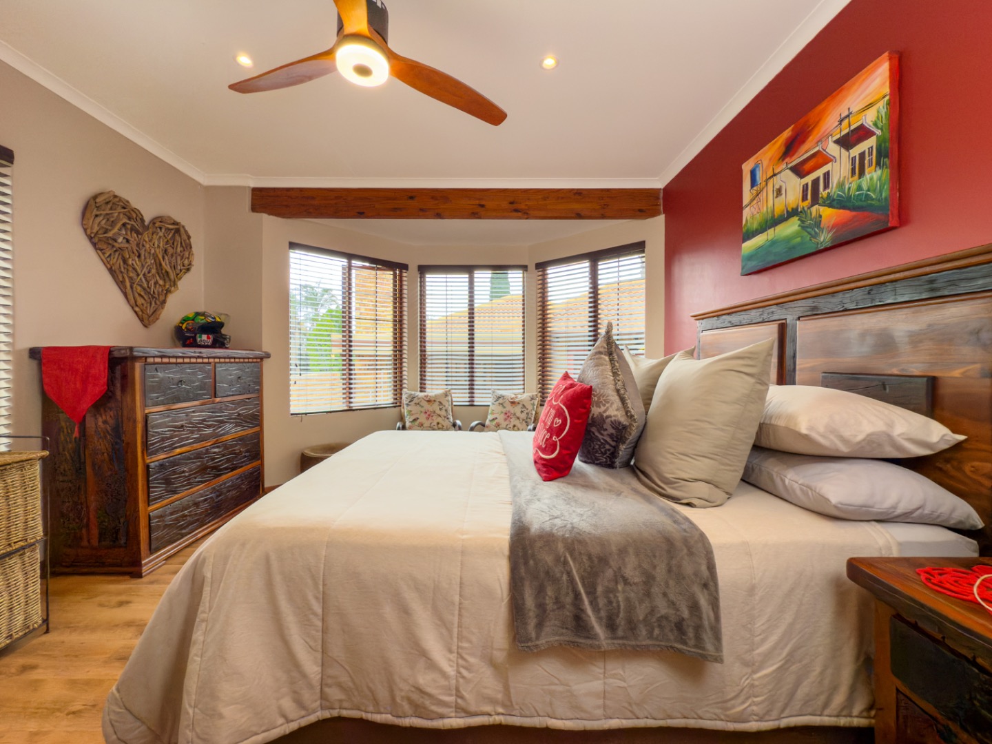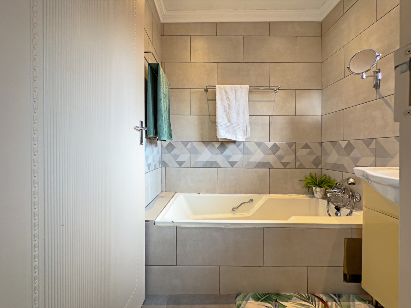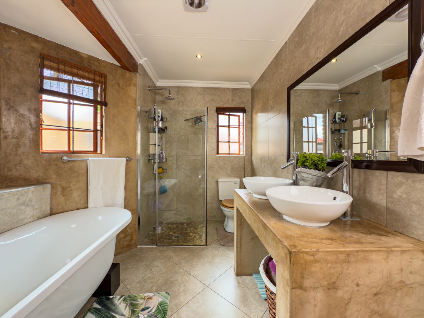 Outdoor entertainment is a highlight, featuring a bar area that flows effortlessly onto the patio. A built-in braai, a boma braai, and a sparkling pool create the perfect setting for hosting family and friends. This property includes Hunter auto irrigation, two storage rooms, and abundant parking with a double garage, three carports, and additional space for up to five vehicles.