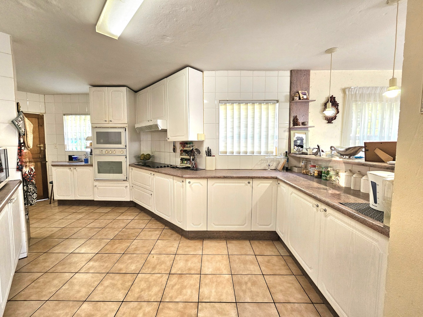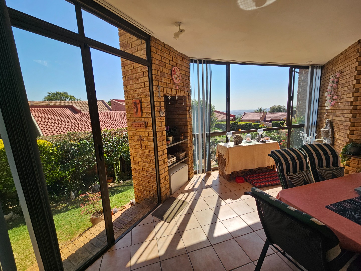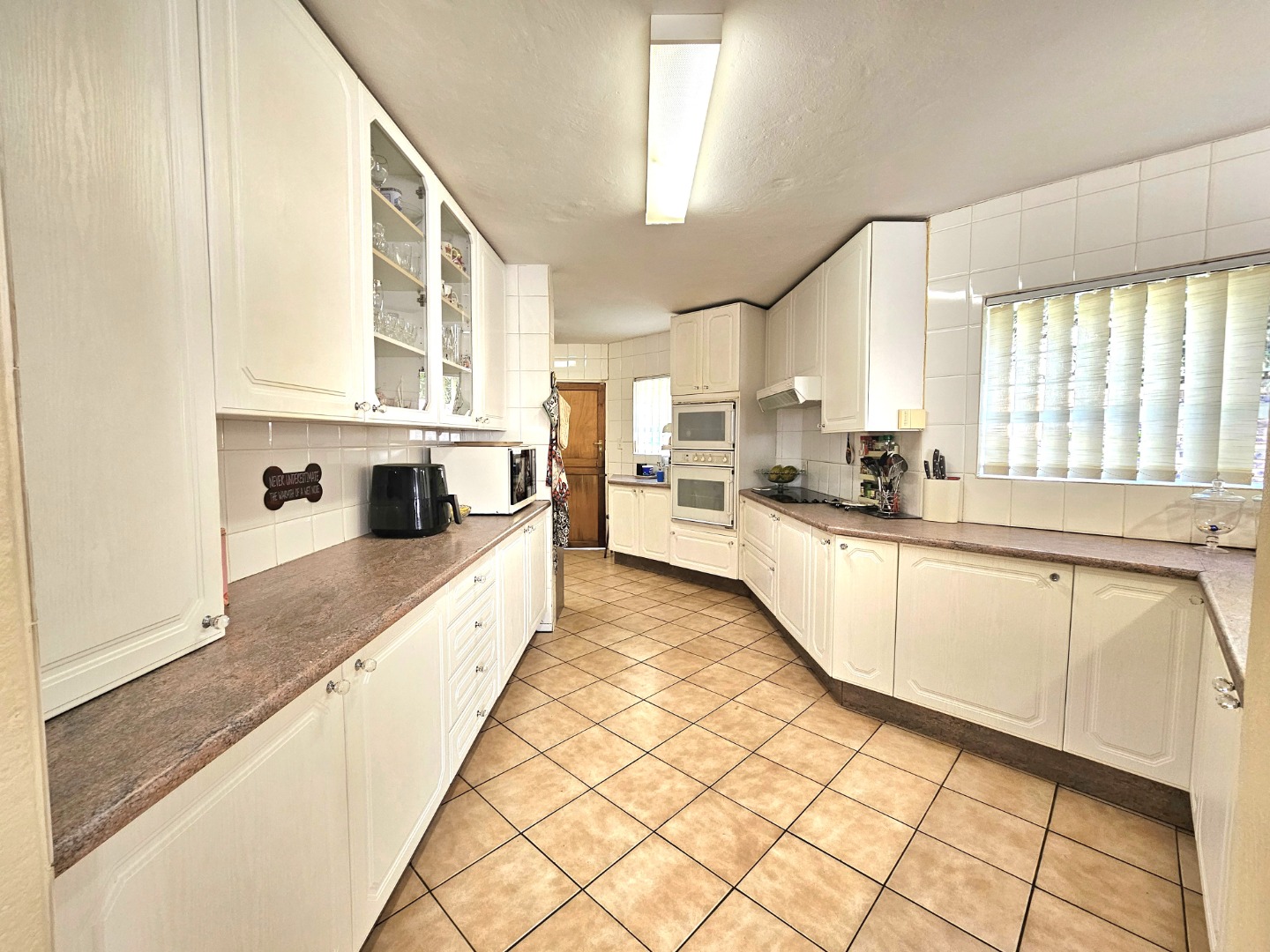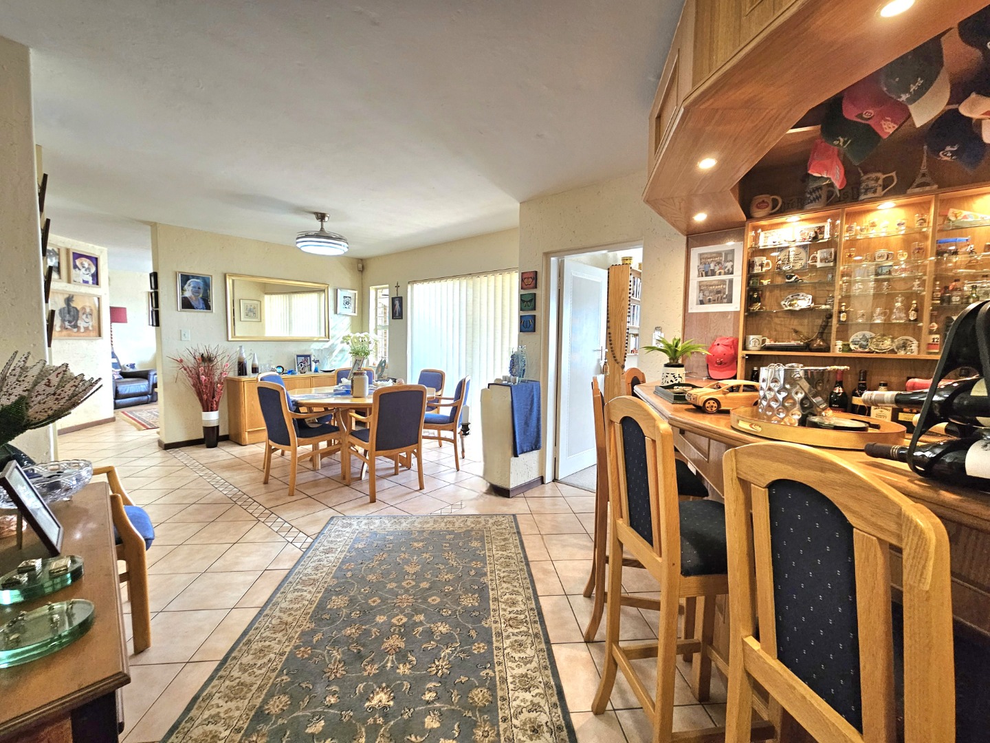 Situated atop a hill, this beautiful home offers breathtaking views, generous living spaces, a sunny patio and the comfort of solar power. The lower level features four versatile living areas: a private lounge or study, a spacious dining room with a built-in bar ideal for entertaining, and a TV room seamlessly integrated with the kitchen. Both the dining and TV room open through sliding doors into an enclosed patio with sliding windows and doors, flowing into the beautifully landscaped garden. The well-appointed kitchen includes a breakfast nook, ample cupboard space extending into the scullery, a pantry, and room for double fridges as well as three appliances—perfect for modern family living.
