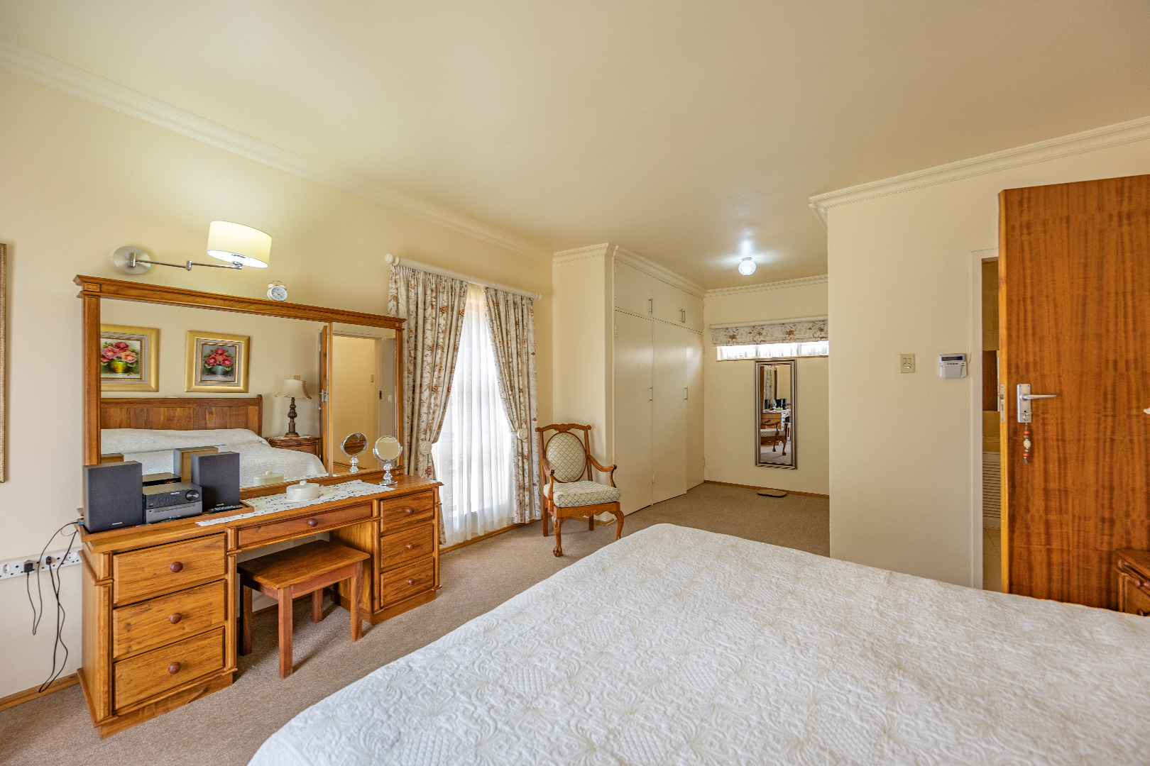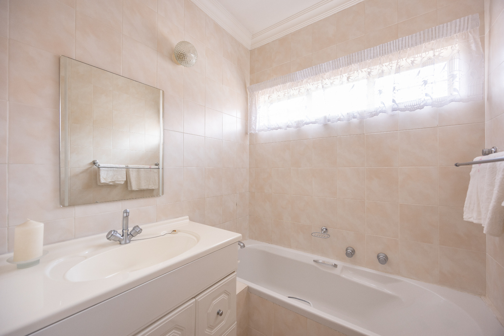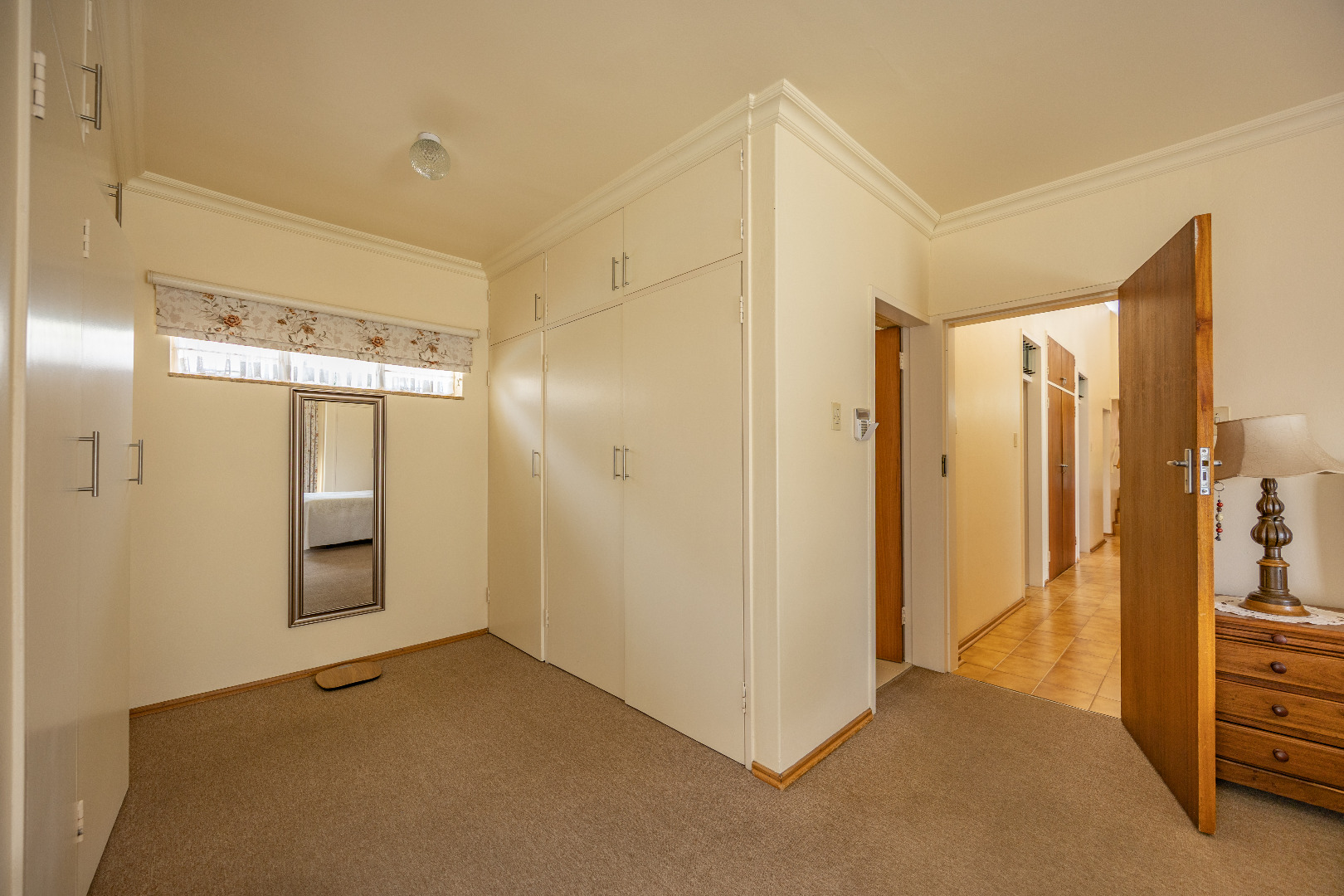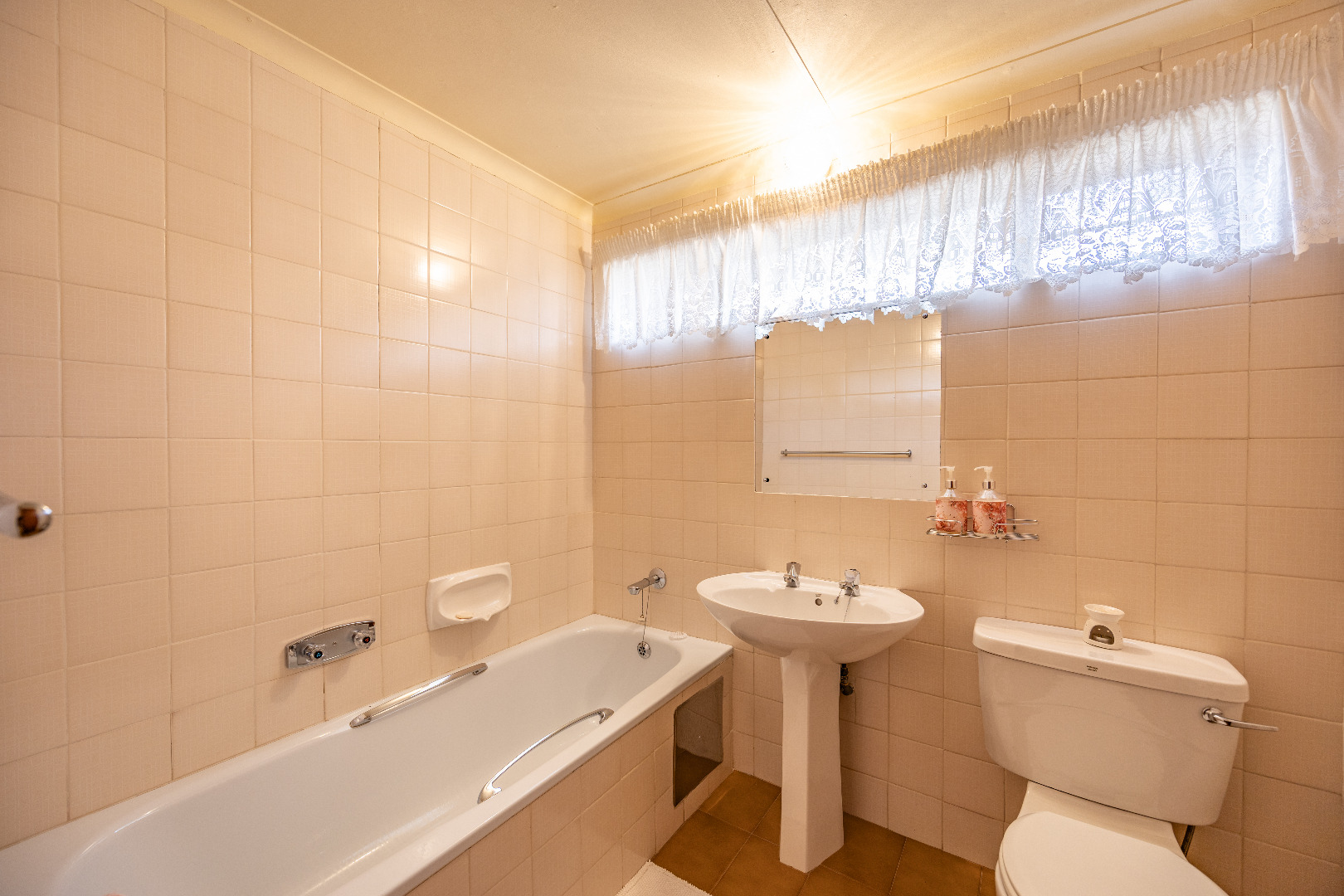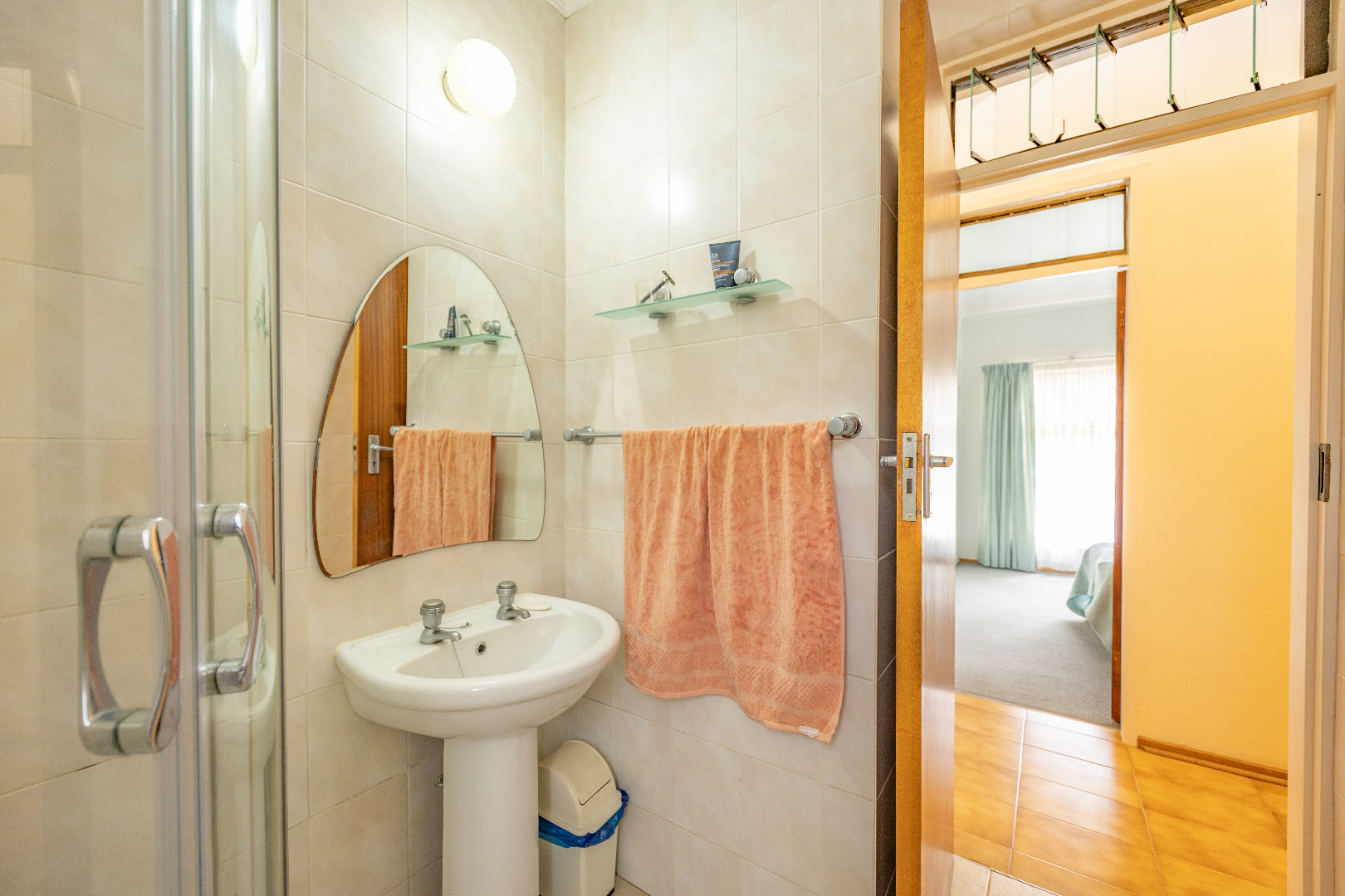 Accommodation is generous with three well-sized downstairs bedrooms, all carpeted with built-in cupboards. The main bedroom is particularly spacious with ample cupboards and an en-suite bathroom. Additional bathrooms include one with a bath and basin, a separate shower and toilet, and a family bathroom upstairs that serves the fourth bedroom. Upstairs, a spacious carpeted bedroom with built-in cupboards adds versatility, perfect for a guest suite or teenager’s retreat.