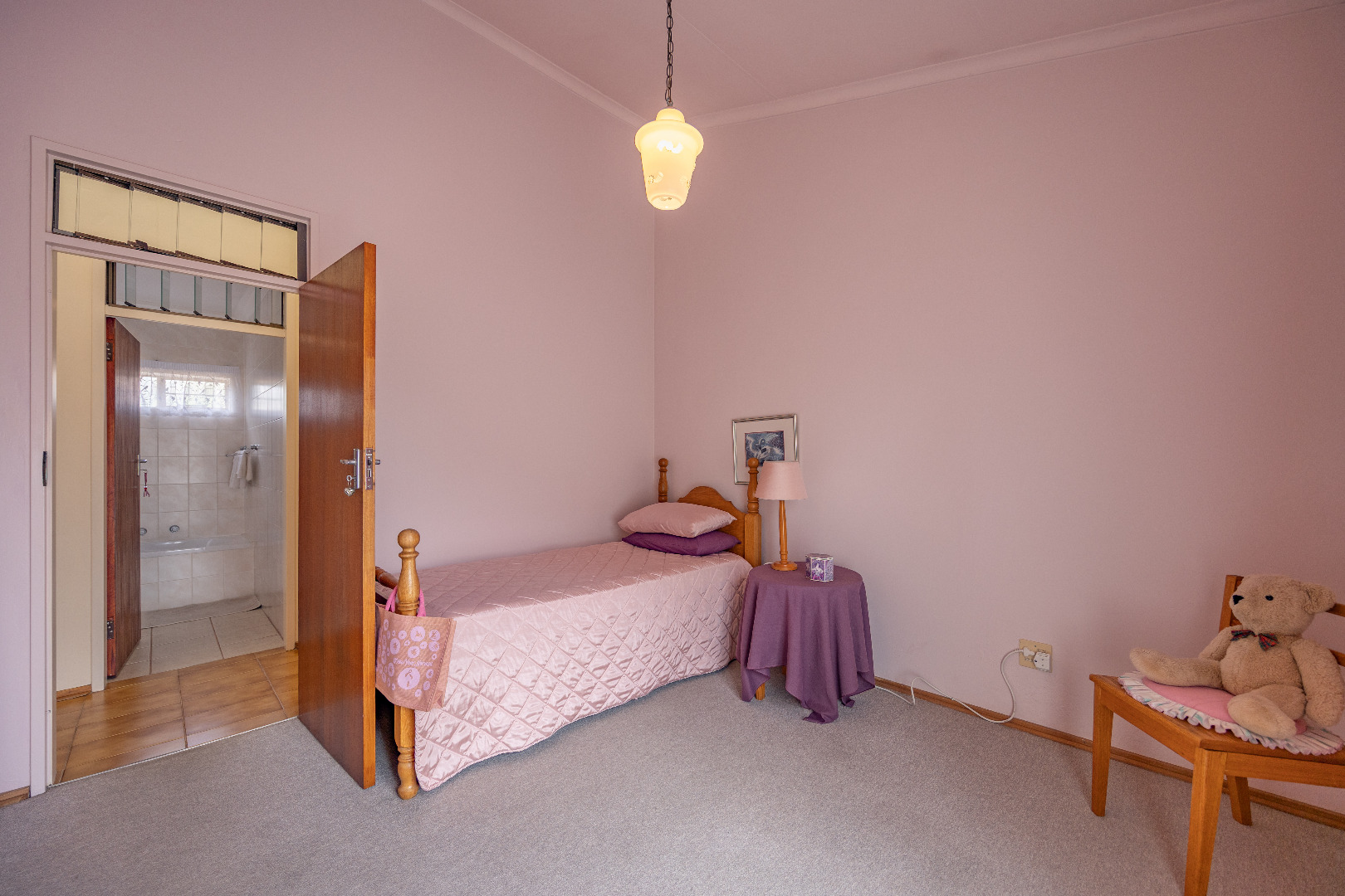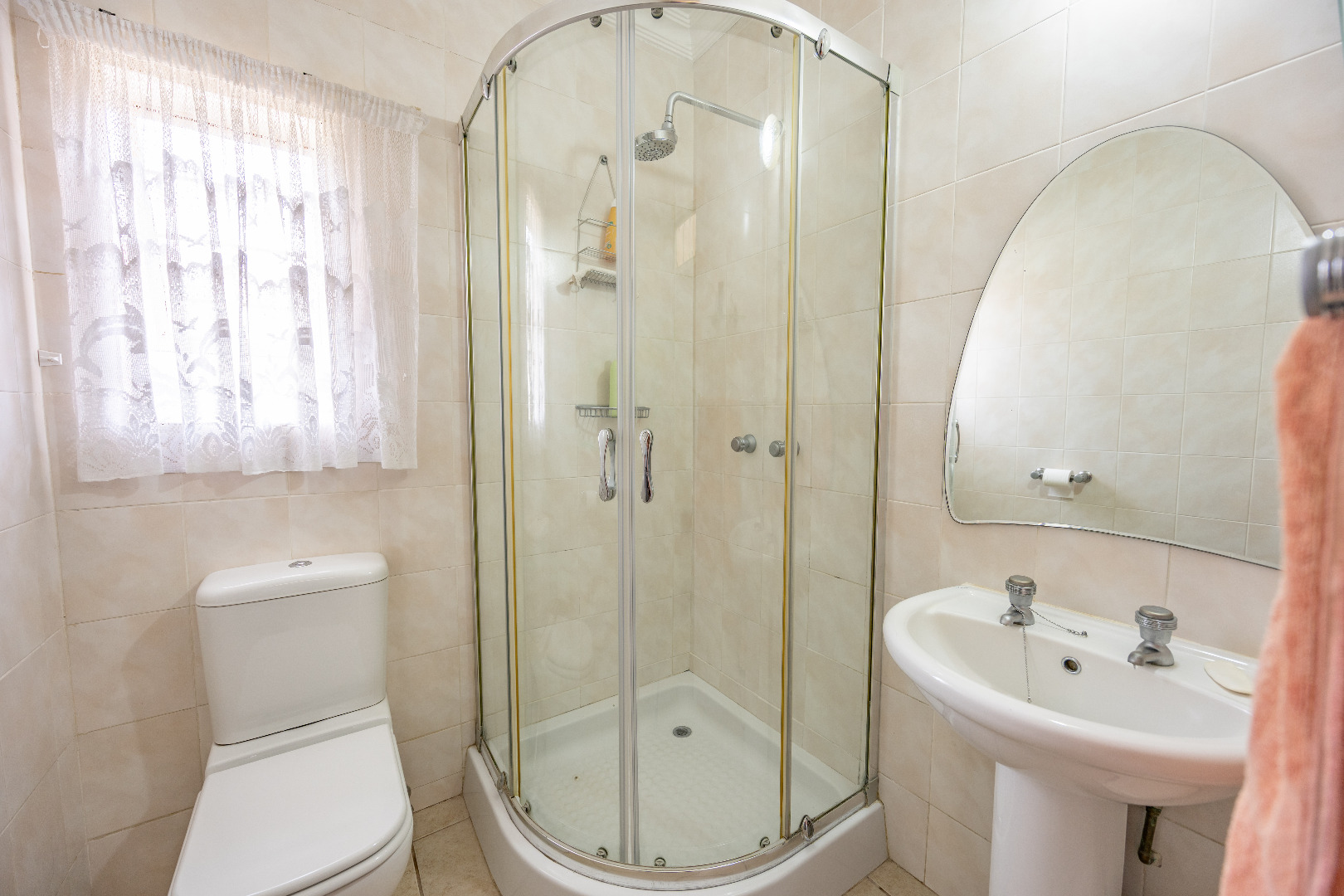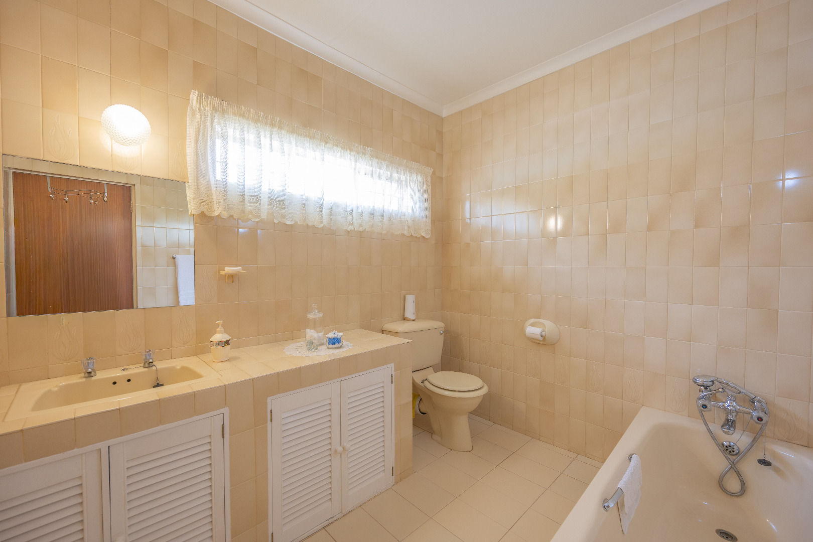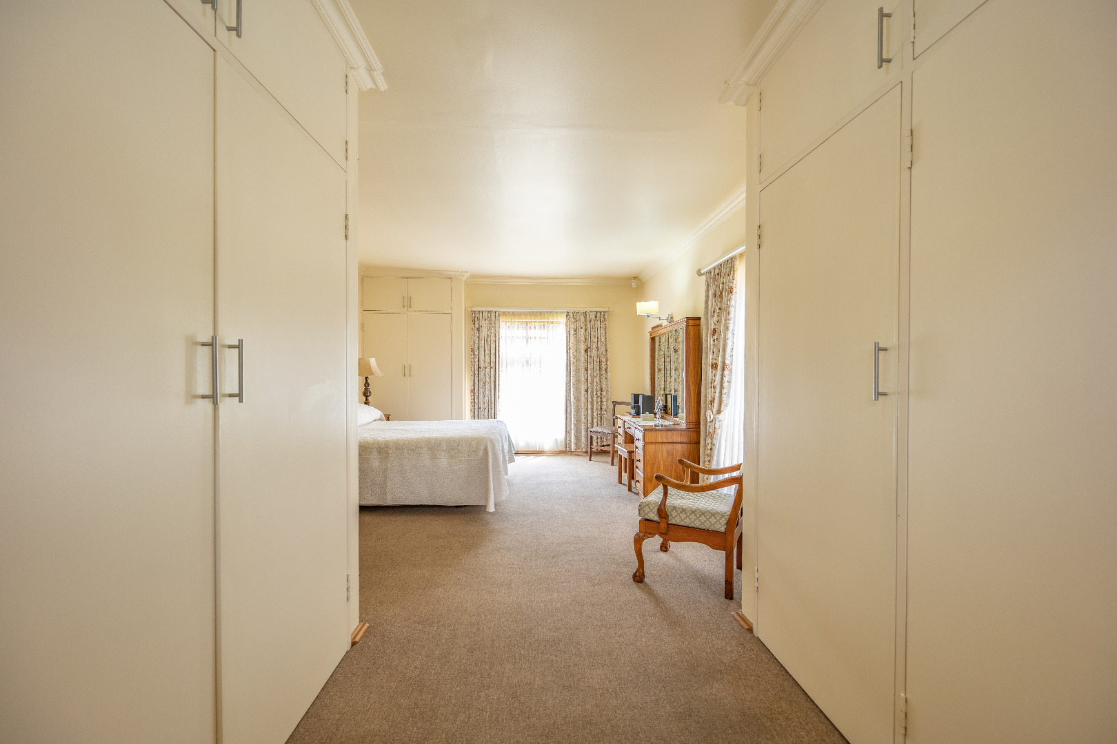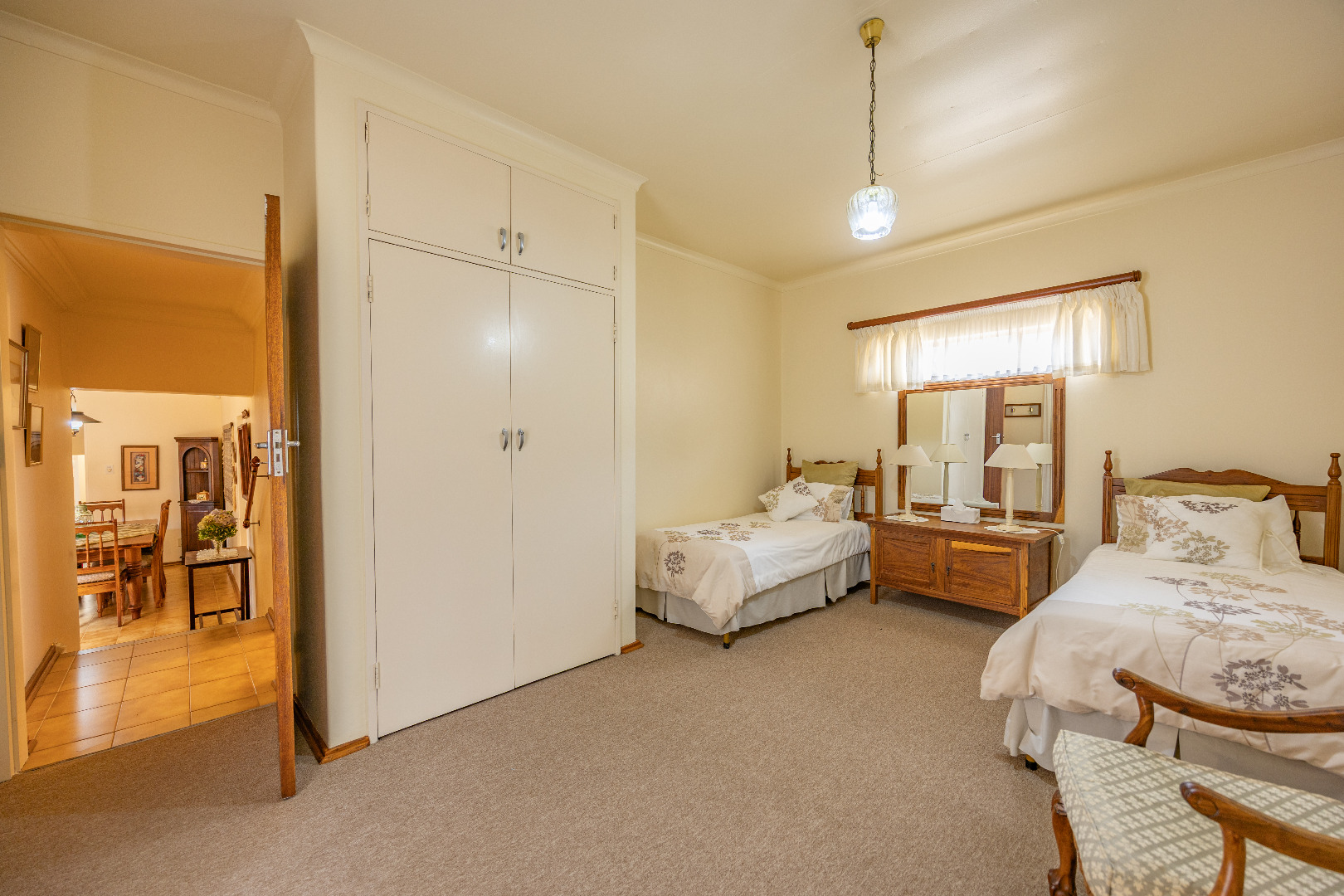 Accommodation is generous with three well-sized downstairs bedrooms, all carpeted with built-in cupboards. The main bedroom is particularly spacious with ample cupboards and an en-suite bathroom. Additional bathrooms include one with a bath and basin, a separate shower and toilet, and a family bathroom upstairs that serves the fourth bedroom. Upstairs, a spacious carpeted bedroom with built-in cupboards adds versatility, perfect for a guest suite or teenager’s retreat.