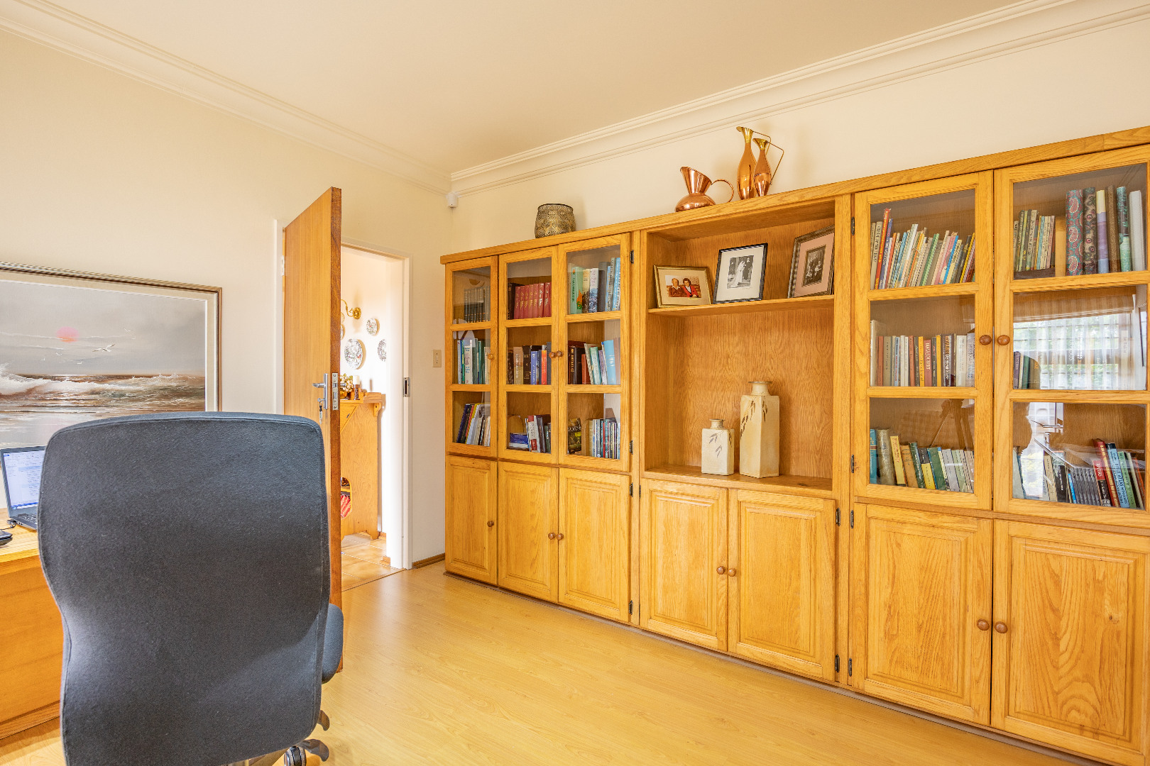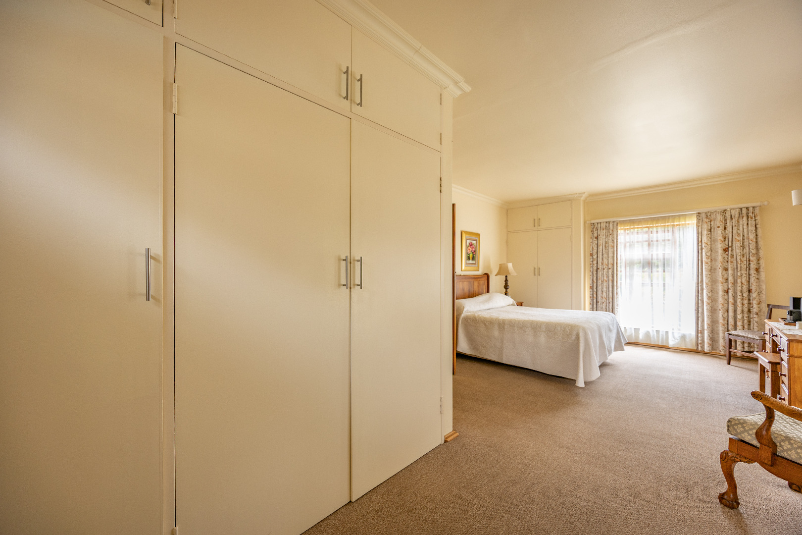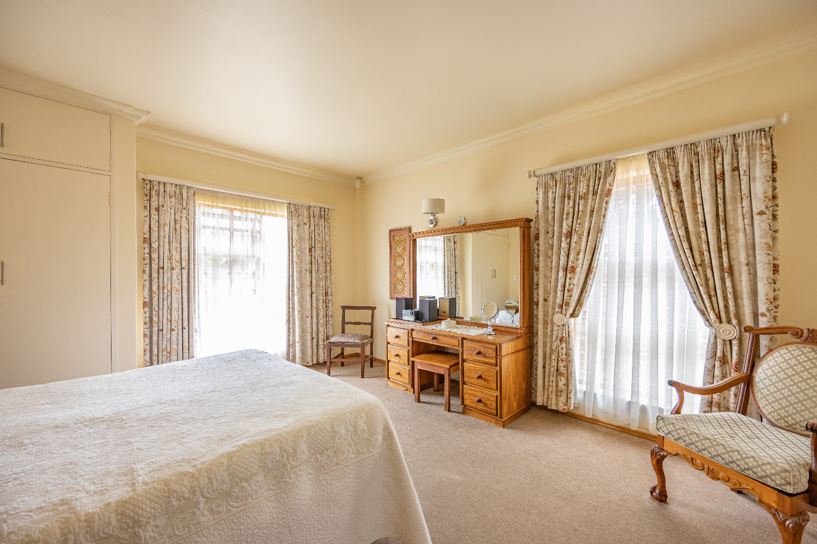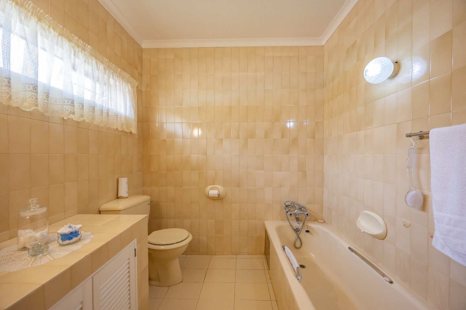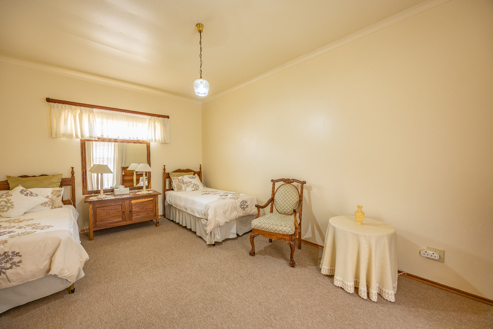 Accommodation is generous with three well-sized downstairs bedrooms, all carpeted with built-in cupboards. The main bedroom is particularly spacious with ample cupboards and an en-suite bathroom. Additional bathrooms include one with a bath and basin, a separate shower and toilet, and a family bathroom upstairs that serves the fourth bedroom. Upstairs, a spacious carpeted bedroom with built-in cupboards adds versatility, perfect for a guest suite or teenager’s retreat.