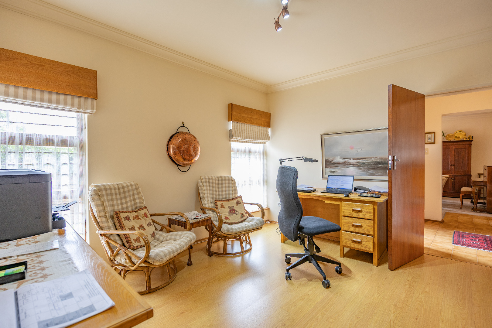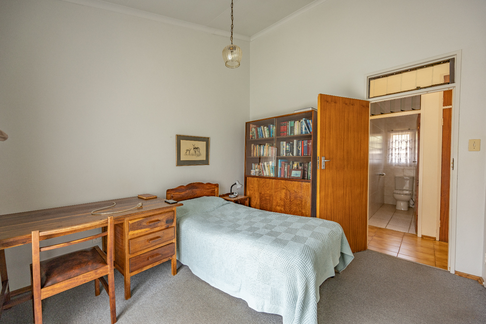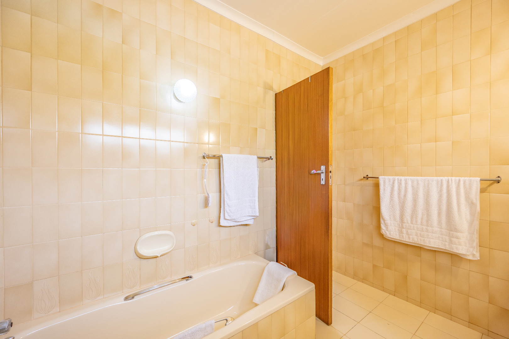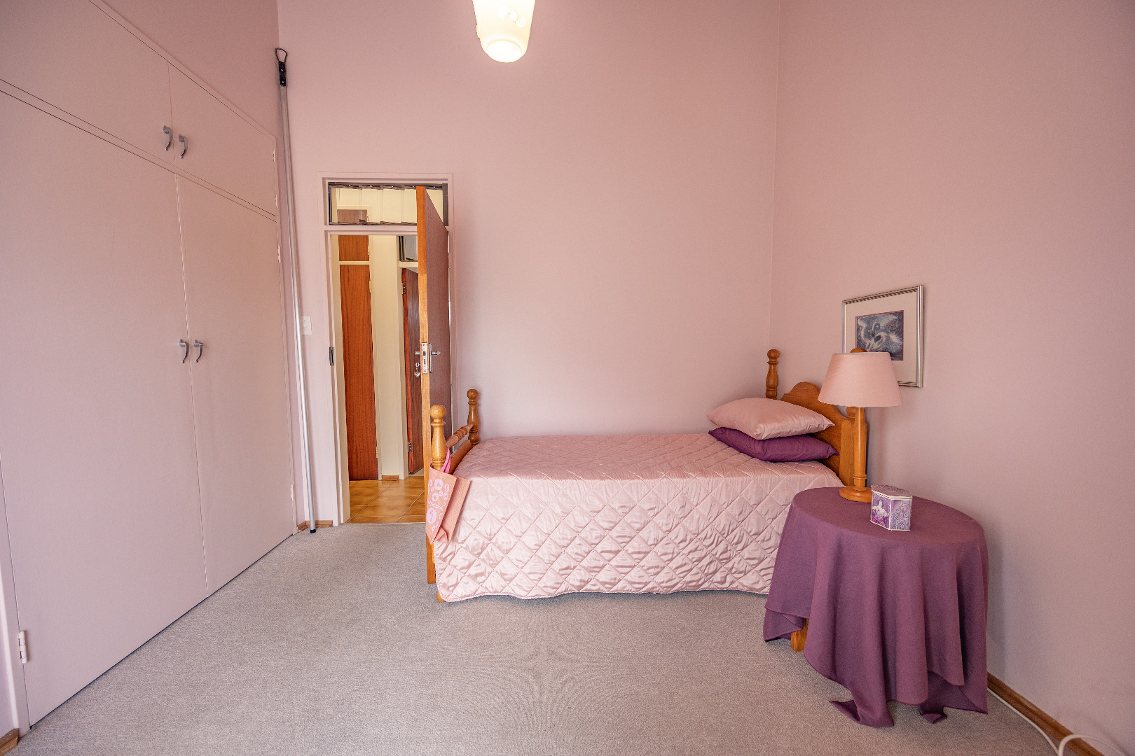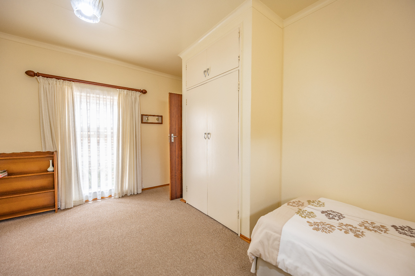Accommodation is generous with three well-sized downstairs bedrooms, all carpeted with built-in cupboards. The main bedroom is particularly spacious with ample cupboards and an en-suite bathroom. Additional bathrooms include one with a bath and basin, a separate shower and toilet, and a family bathroom upstairs that serves the fourth bedroom. Upstairs, a spacious carpeted bedroom with built-in cupboards adds versatility, perfect for a guest suite or teenager’s retreat.