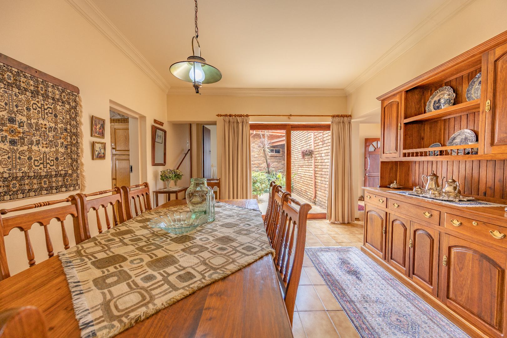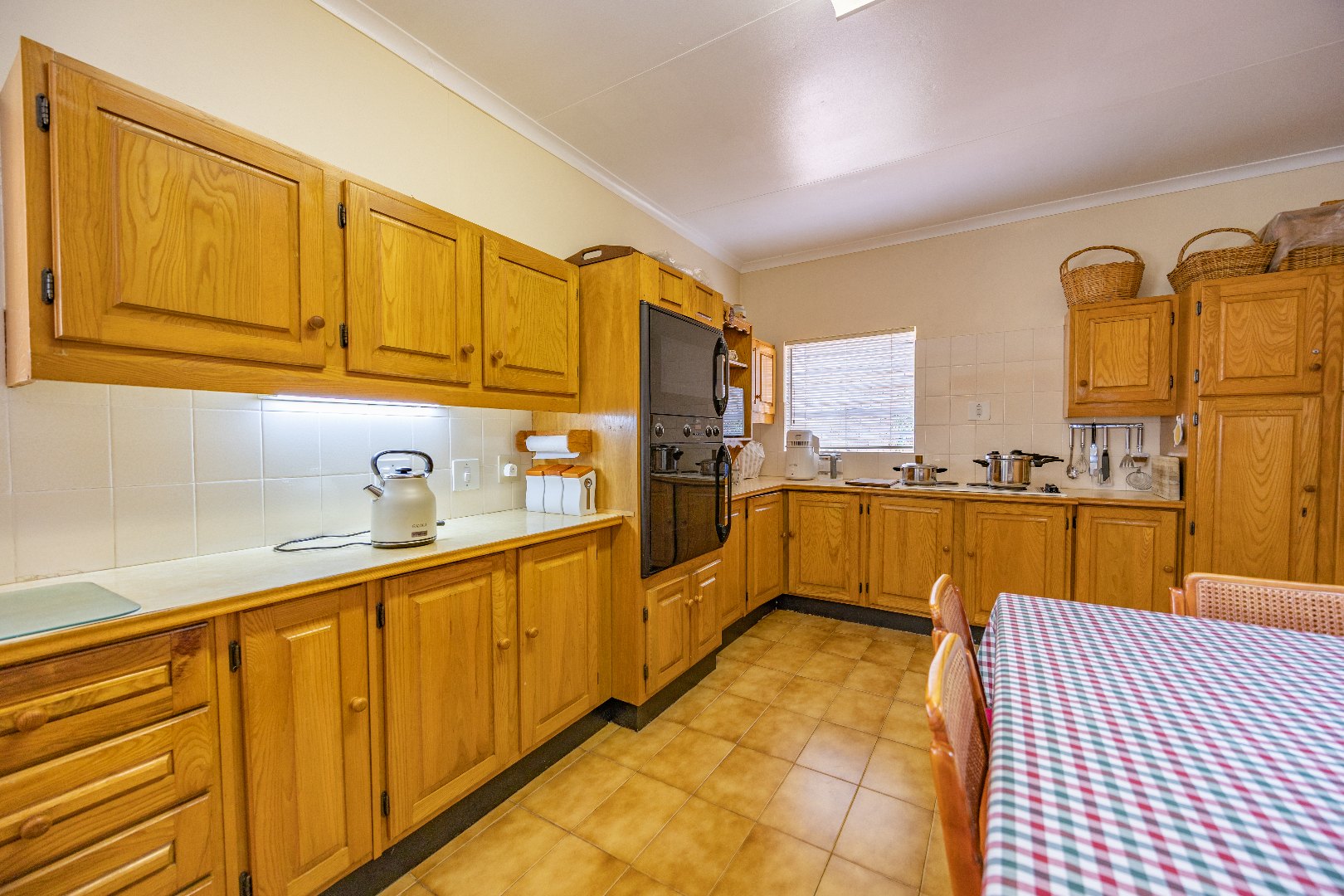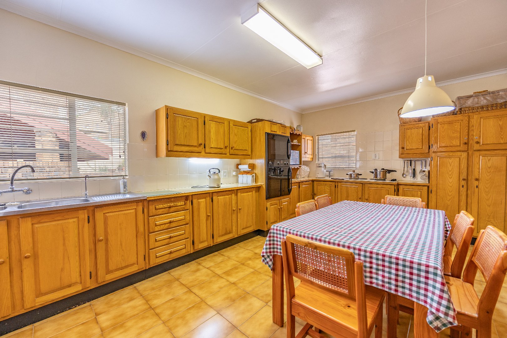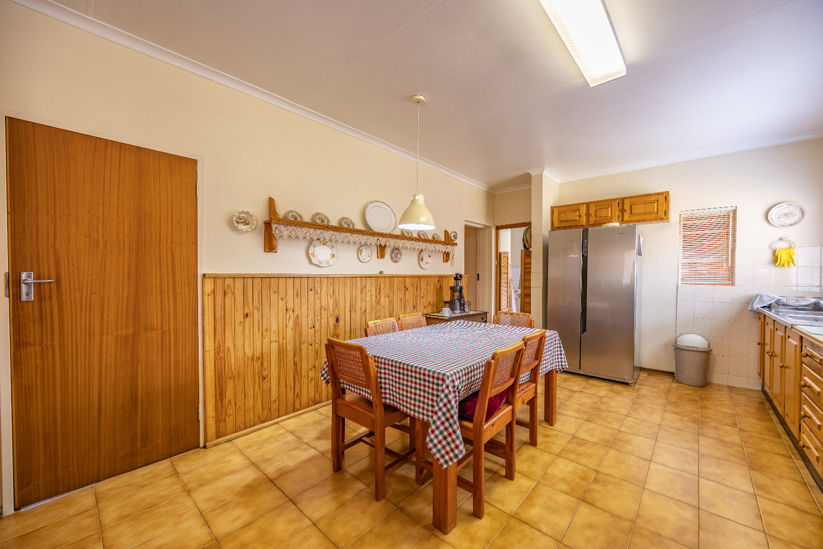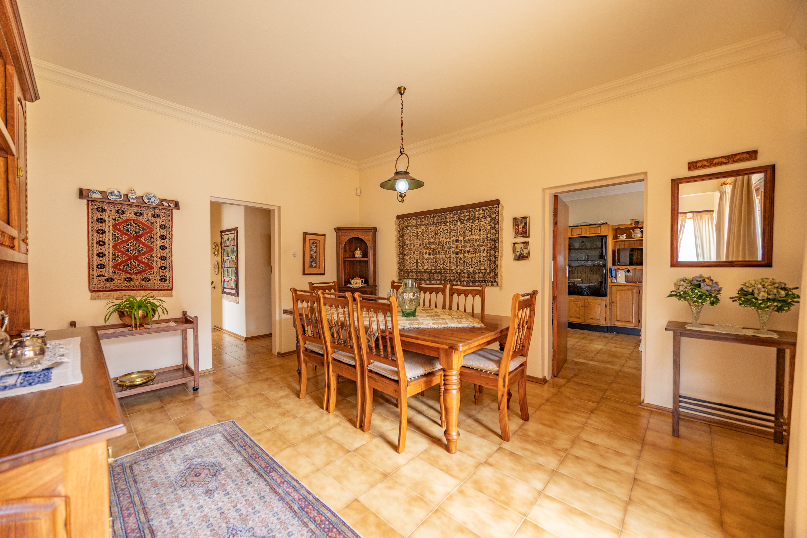 The home features multiple living zones including a dining room with sliding doors to a small porch, a TV room with outside access, and a downstairs study nook. The well-appointed kitchen offers ample cupboard space, double fridge capacity, a double basin, and a separate scullery with space for four appliances. High ceilings throughout the living areas create a light and airy atmosphere. The property is also equipped with two geysers, a 1000-gallon water tank connected to a borehole with automatic switching, and a domestic room with its own geyser.