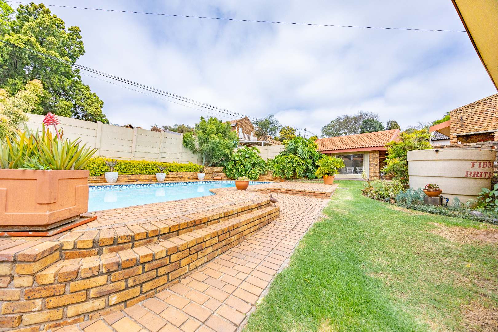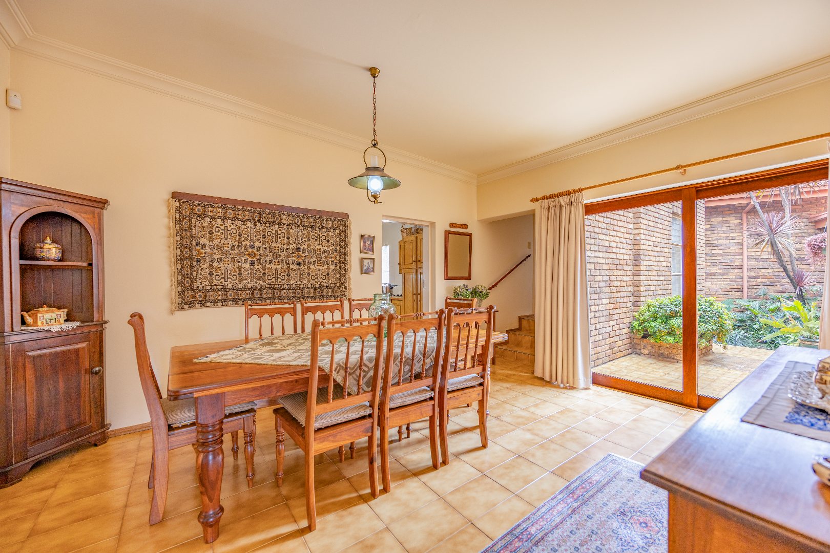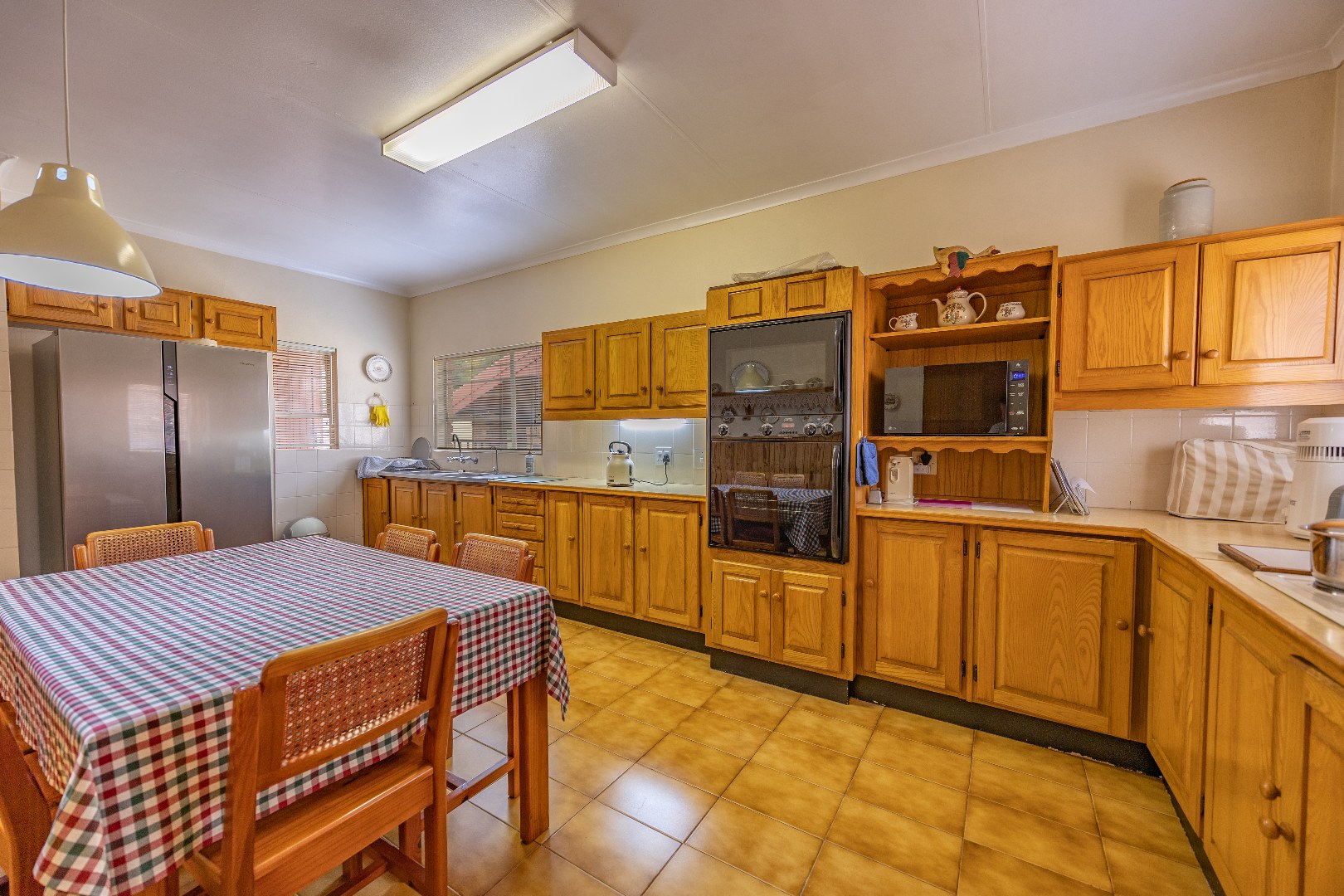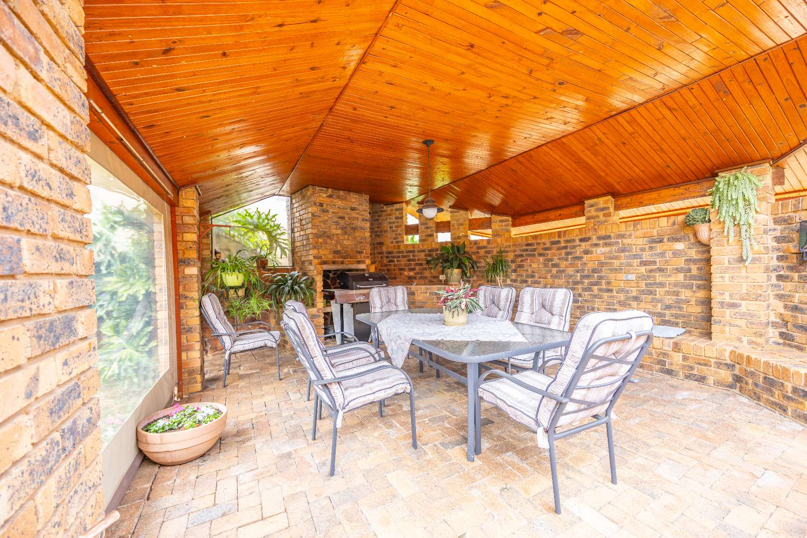 The home features multiple living zones including a dining room with sliding doors to a small porch, a TV room with outside access, and a downstairs study nook. The well-appointed kitchen offers ample cupboard space, double fridge capacity, a double basin, and a separate scullery with space for four appliances. High ceilings throughout the living areas create a light and airy atmosphere. The property is also equipped with two geysers, a 1000-gallon water tank connected to a borehole with automatic switching, and a domestic room with its own geyser.