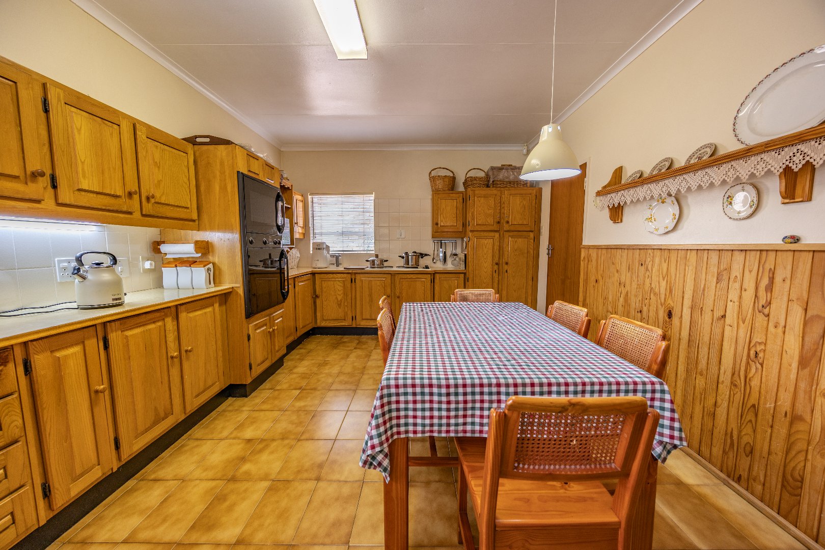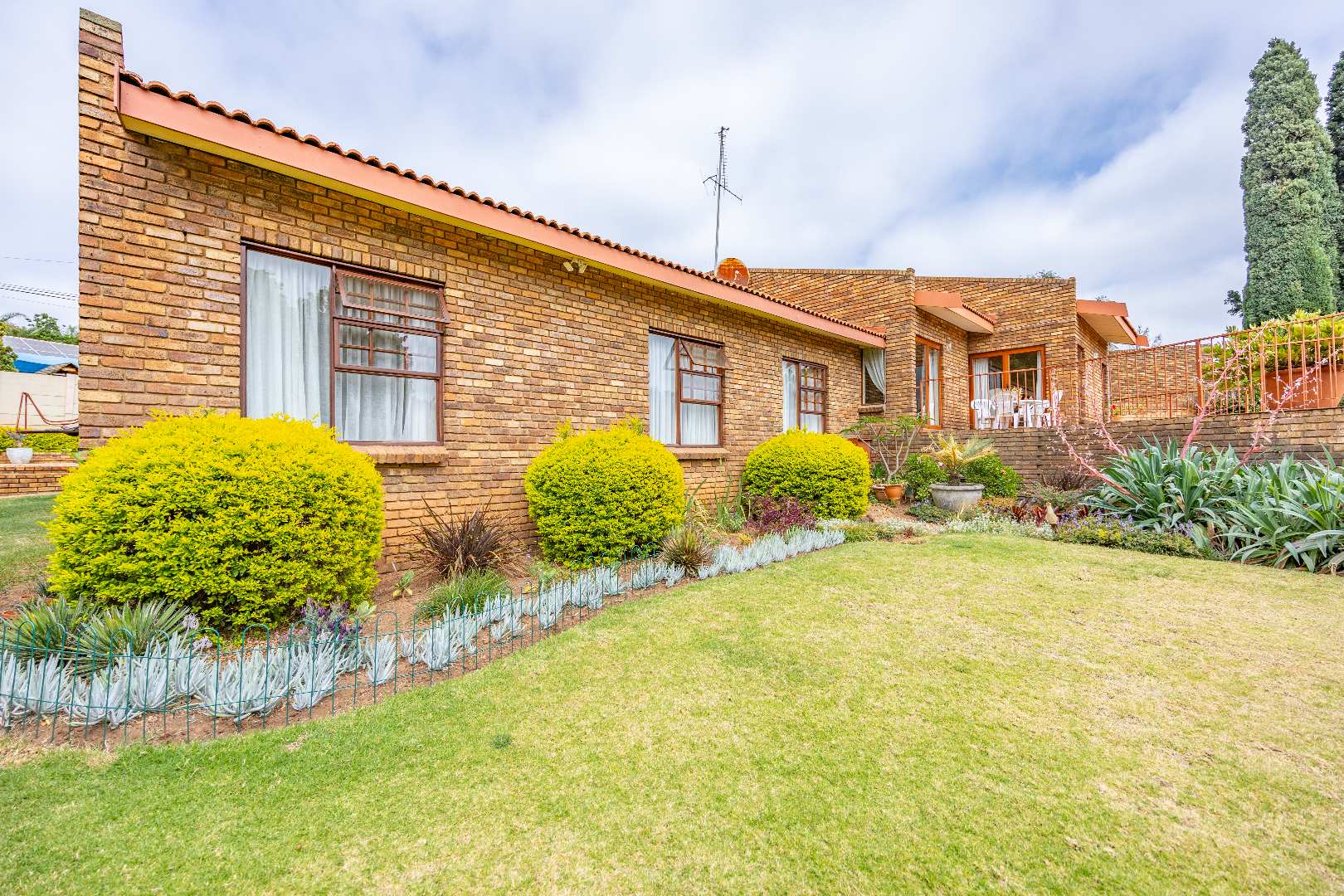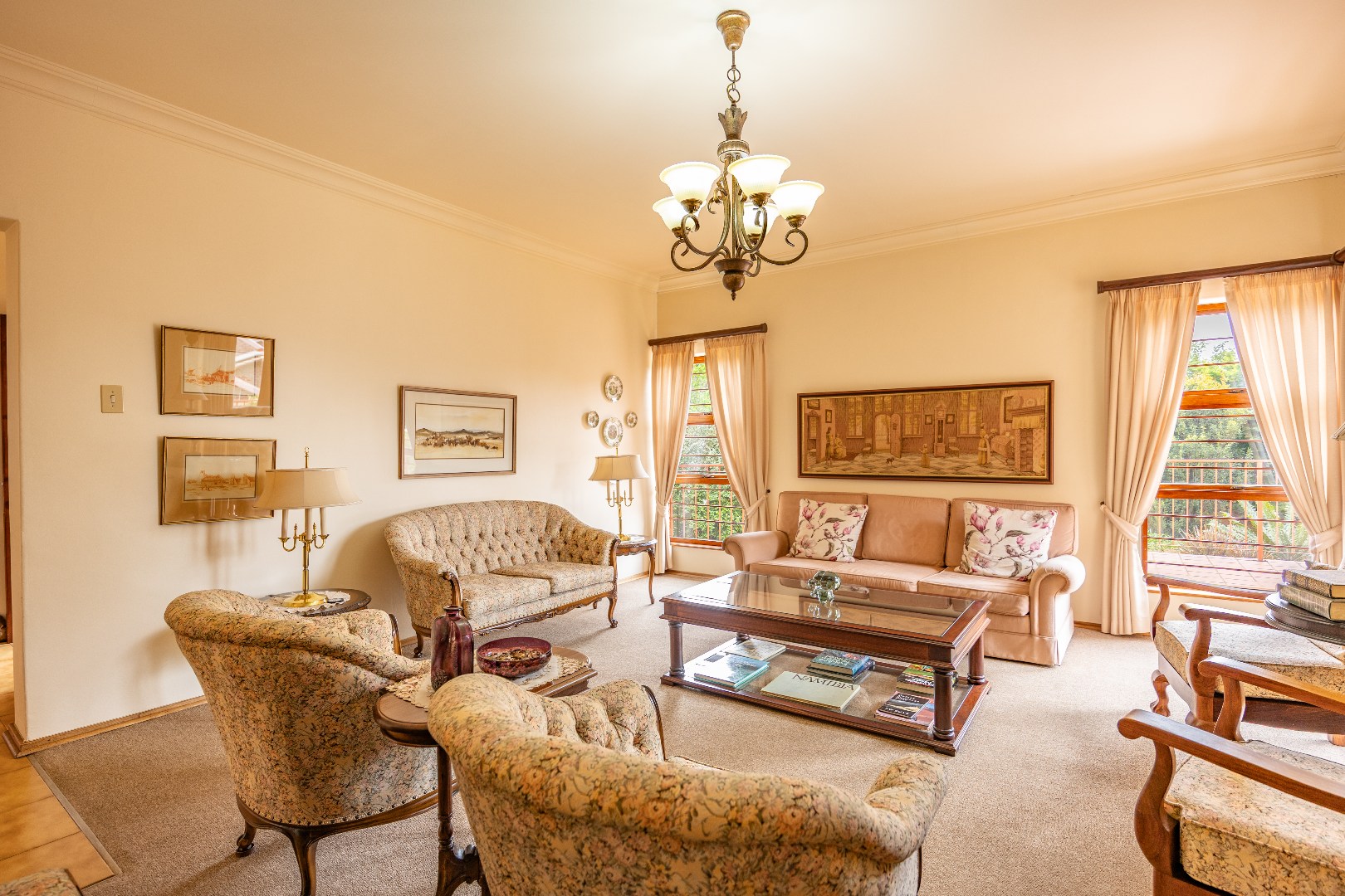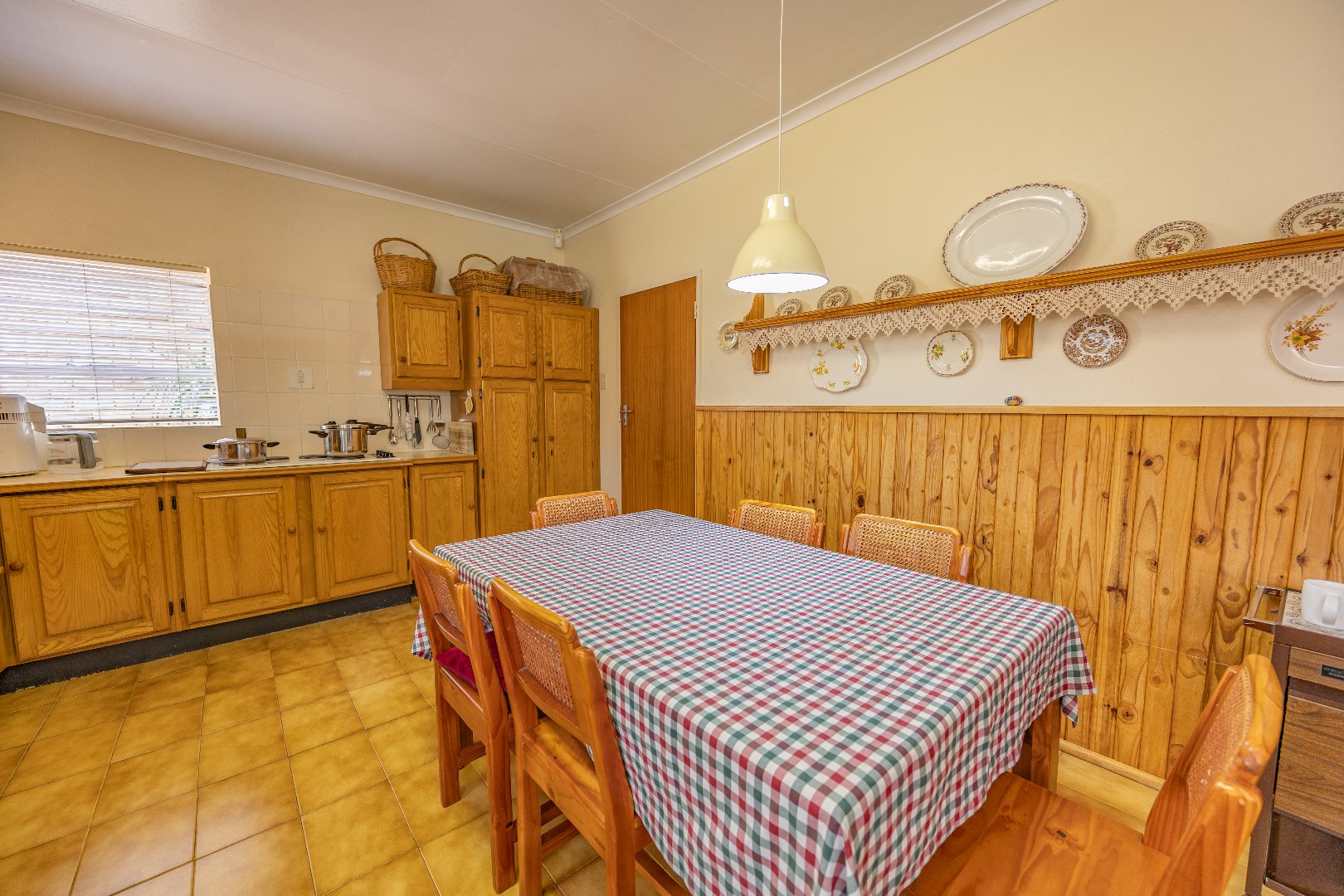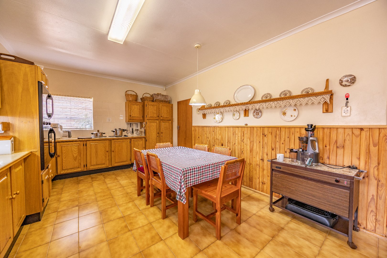 The home features multiple living zones including a dining room with sliding doors to a small porch, a TV room with outside access, and a downstairs study nook. The well-appointed kitchen offers ample cupboard space, double fridge capacity, a double basin, and a separate scullery with space for four appliances. High ceilings throughout the living areas create a light and airy atmosphere. The property is also equipped with two geysers, a 1000-gallon water tank connected to a borehole with automatic switching, and a domestic room with its own geyser.