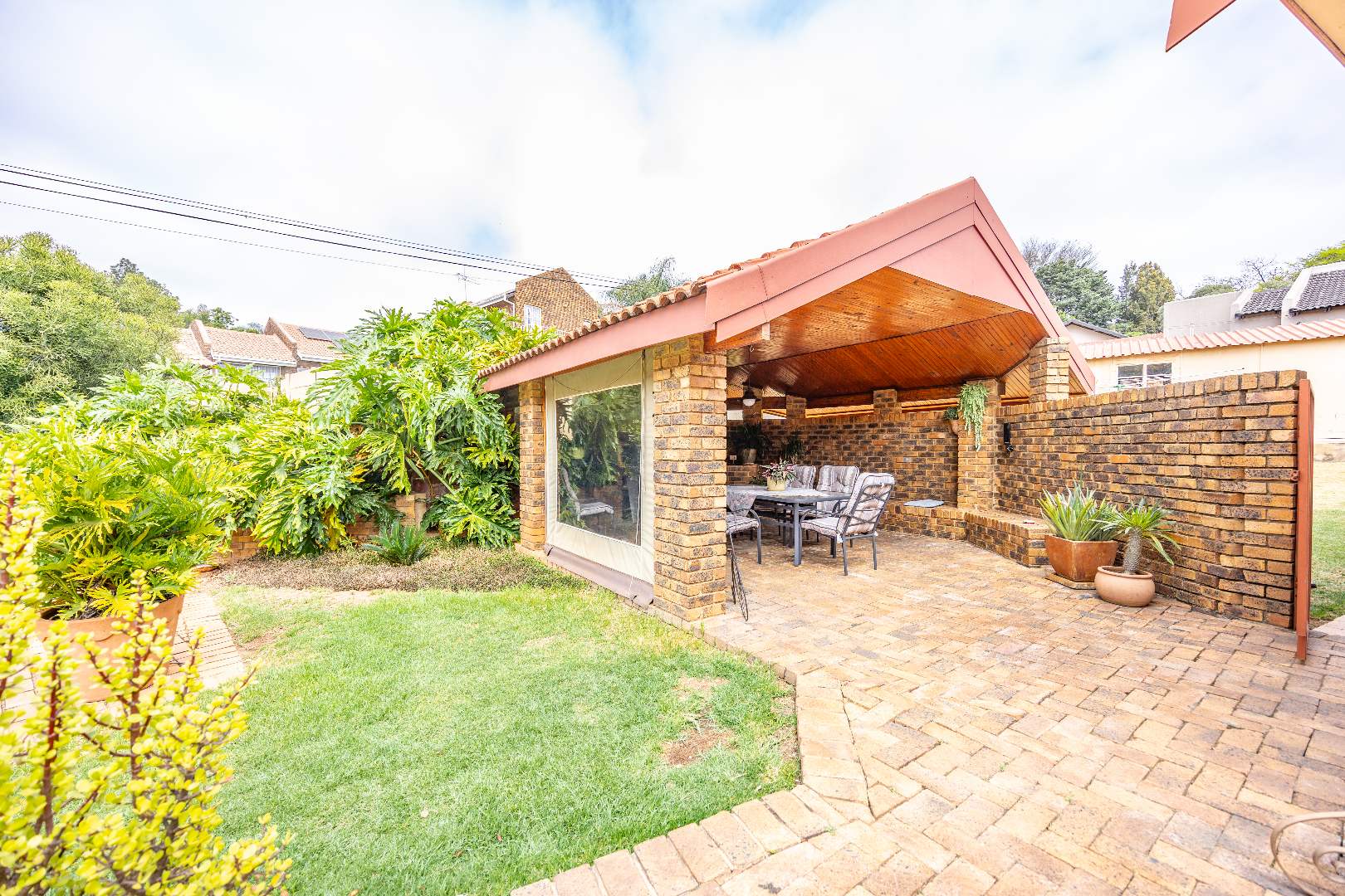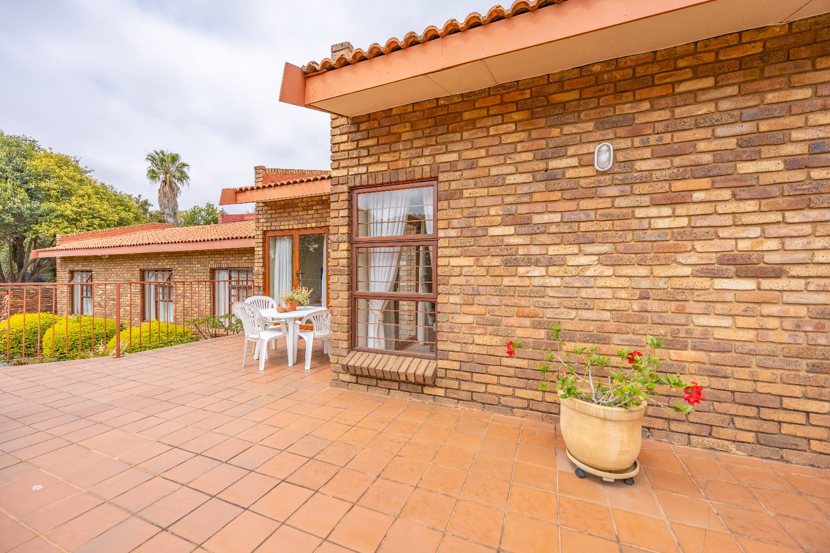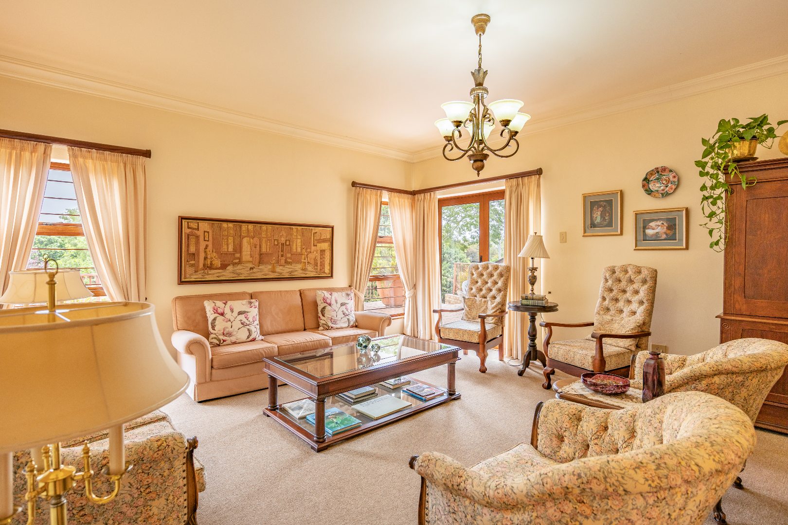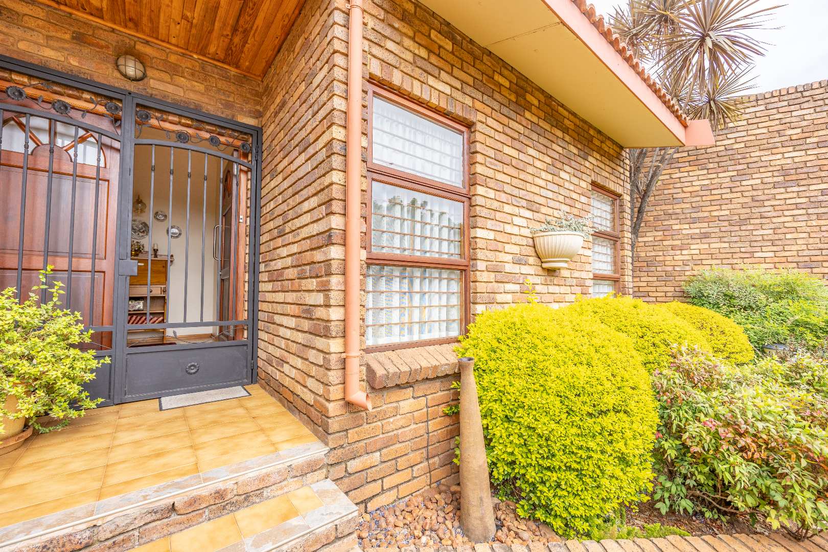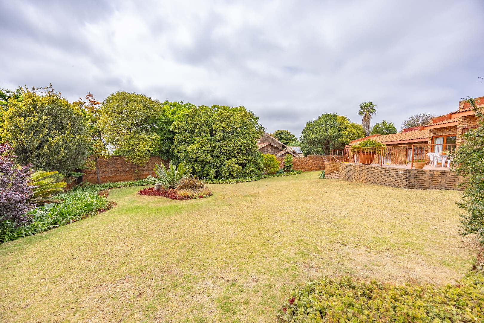 The home features multiple living zones including a dining room with sliding doors to a small porch, a TV room with outside access, and a downstairs study nook. The well-appointed kitchen offers ample cupboard space, double fridge capacity, a double basin, and a separate scullery with space for four appliances. High ceilings throughout the living areas create a light and airy atmosphere. The property is also equipped with two geysers, a 1000-gallon water tank connected to a borehole with automatic switching, and a domestic room with its own geyser.