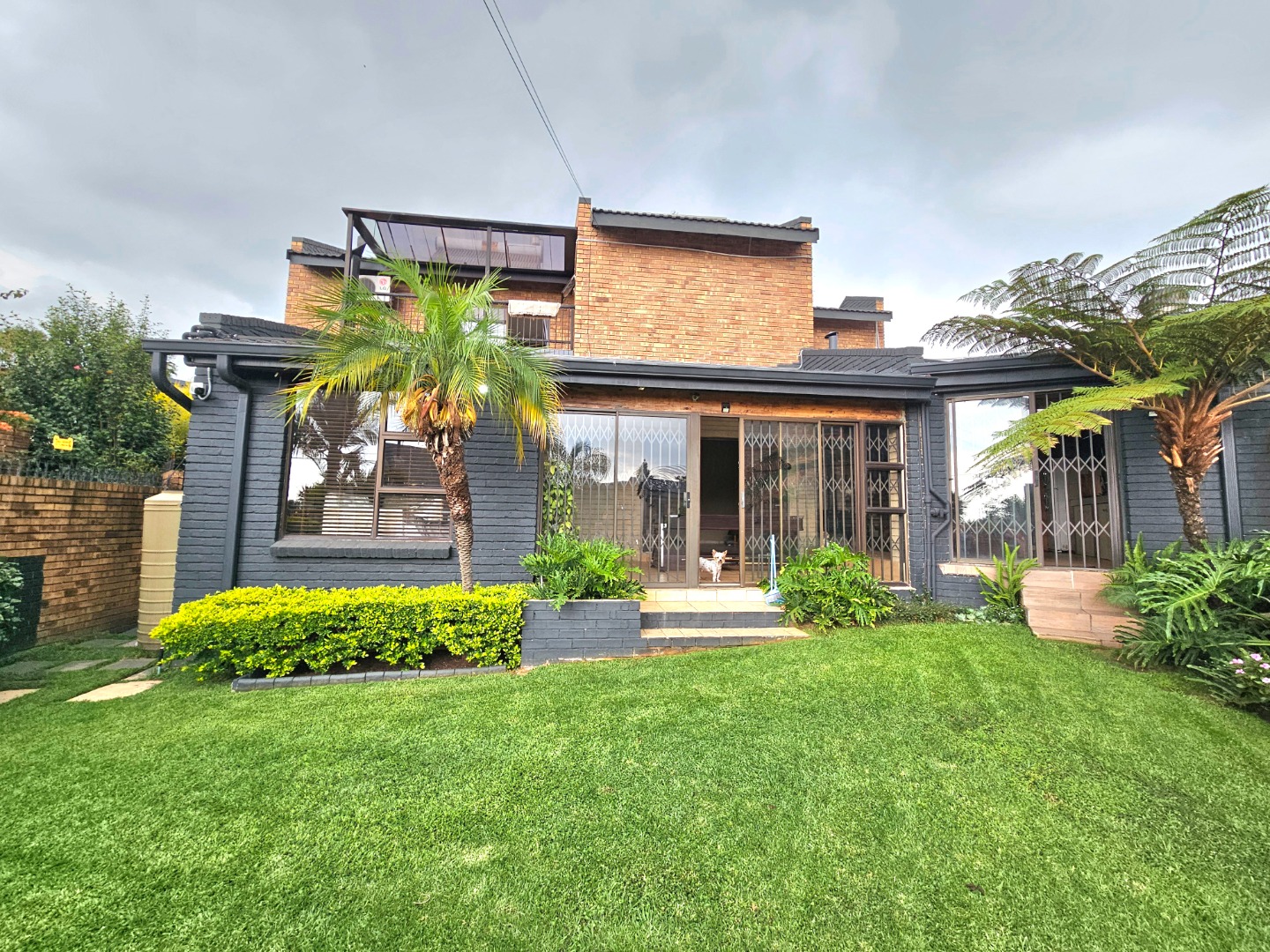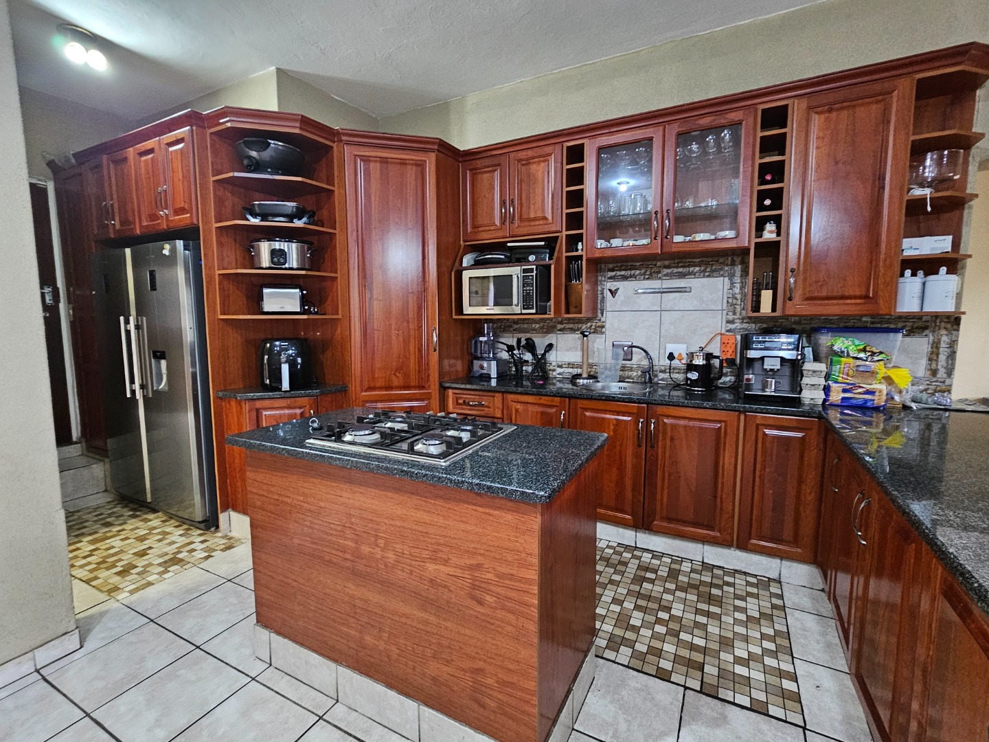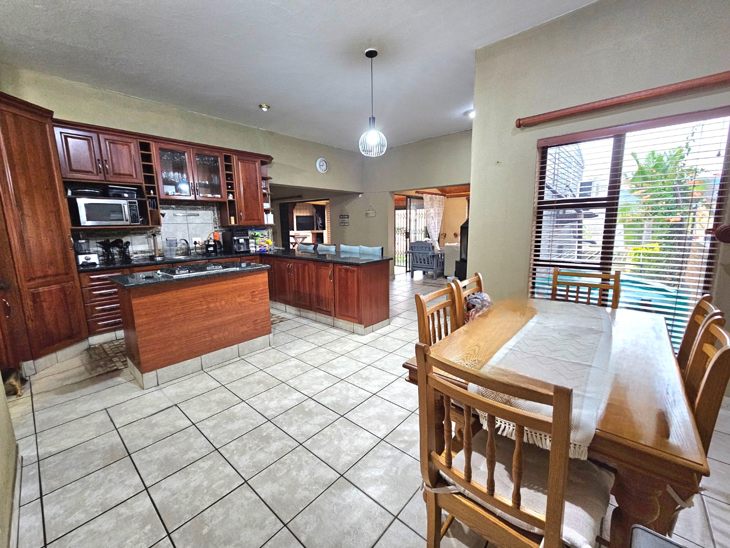 The interior features a spacious and functional layout, including five versatile lounges one which is upstairs and a dedicated dining room, providing ample space for relaxation and entertaining. The heart of the home is a well-appointed kitchen, showcasing extensive dark wood cabinetry, durable dark granite countertops, and a central island with a built-in gas hob. This open-plan design, complete with a pantry and scullery, ensures convenience and connectivity.