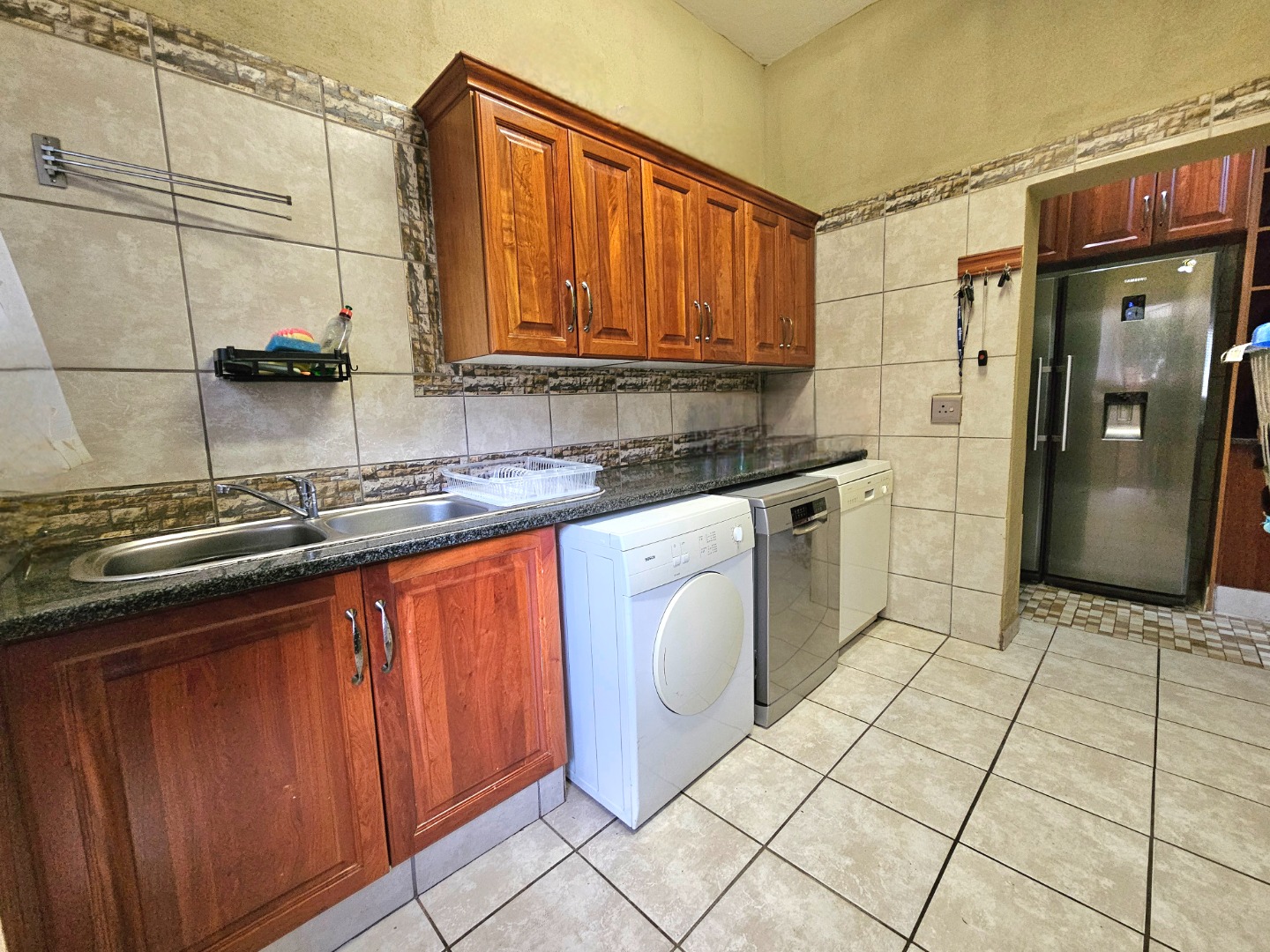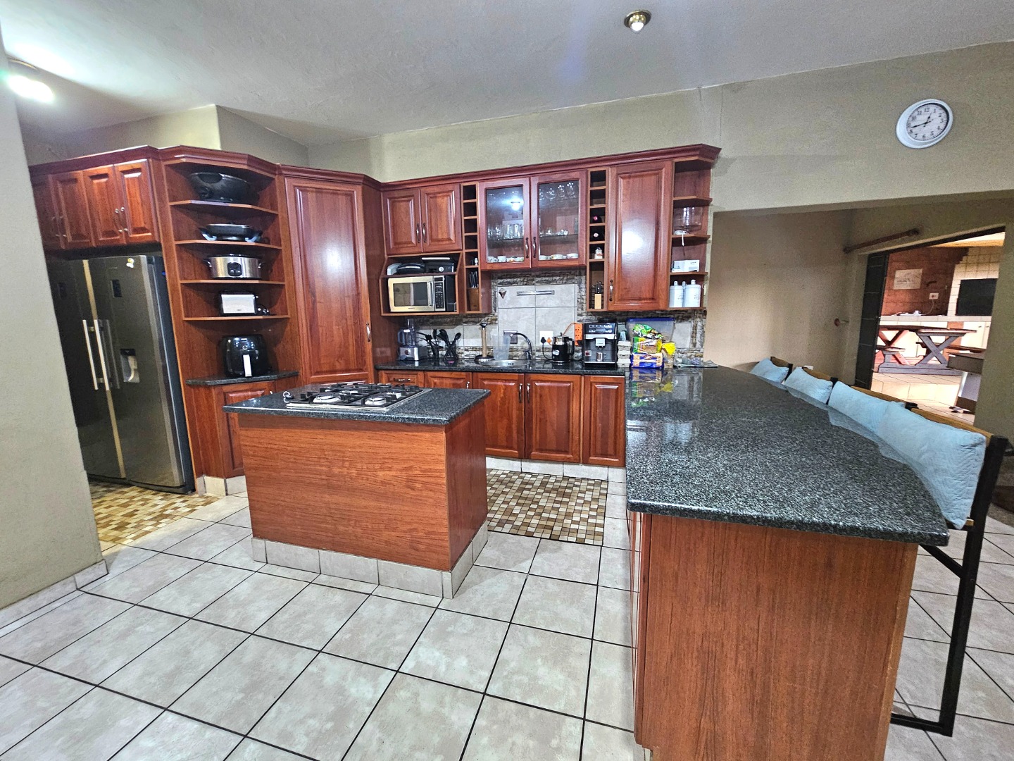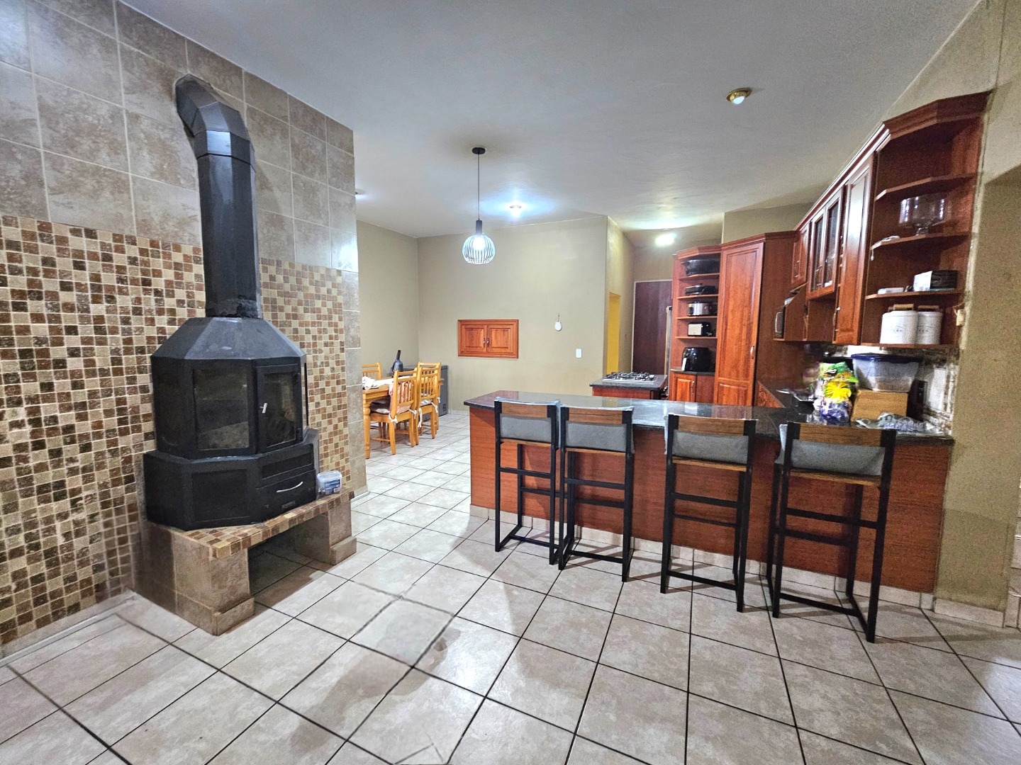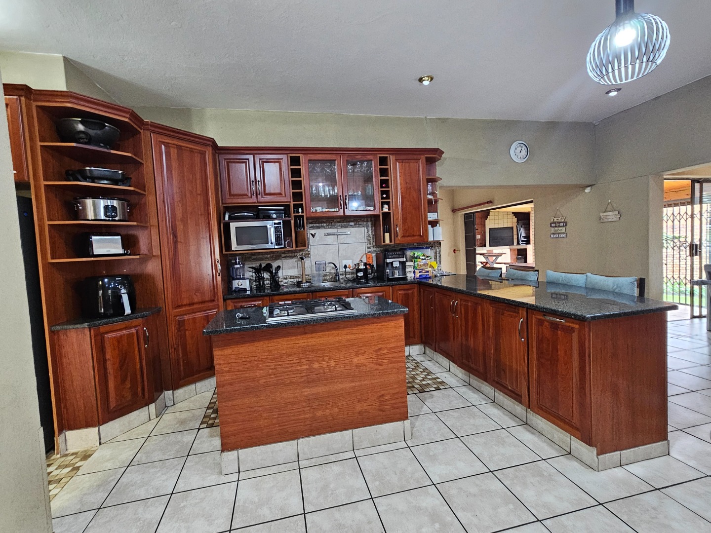 The interior features a spacious and functional layout, including five versatile lounges one which is upstairs and a dedicated dining room, providing ample space for relaxation and entertaining. The heart of the home is a well-appointed kitchen, showcasing extensive dark wood cabinetry, durable dark granite countertops, and a central island with a built-in gas hob. This open-plan design, complete with a pantry and scullery, ensures convenience and connectivity.