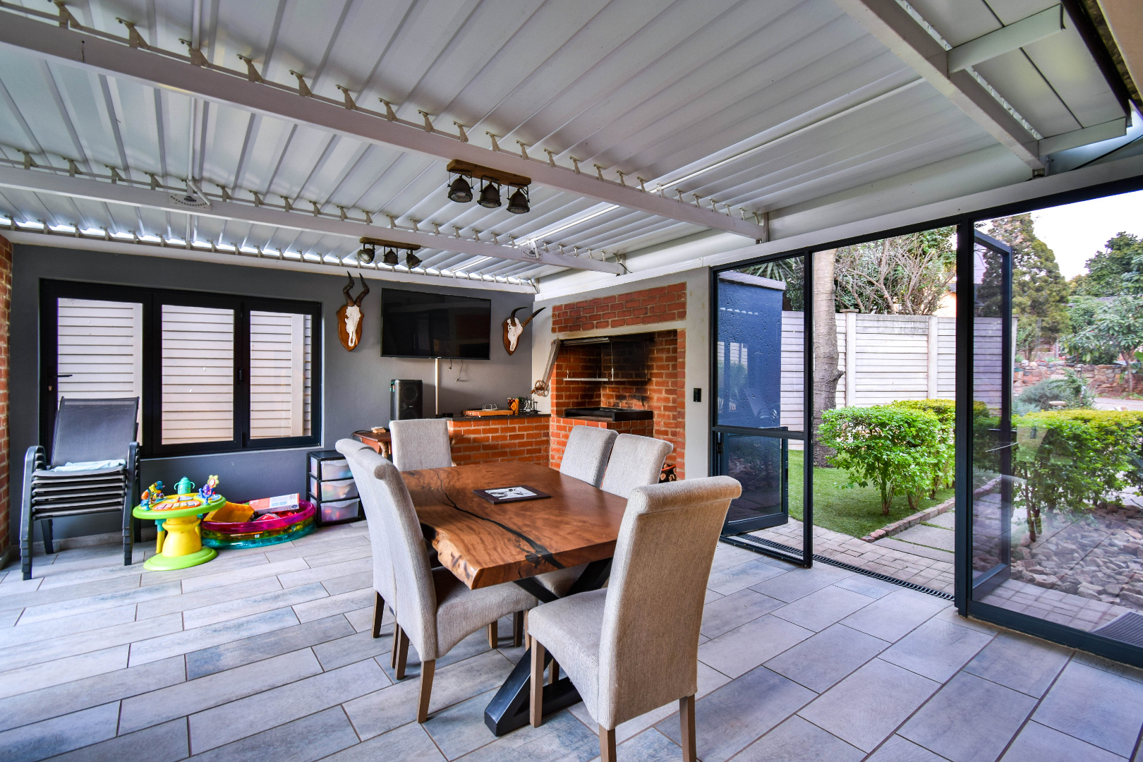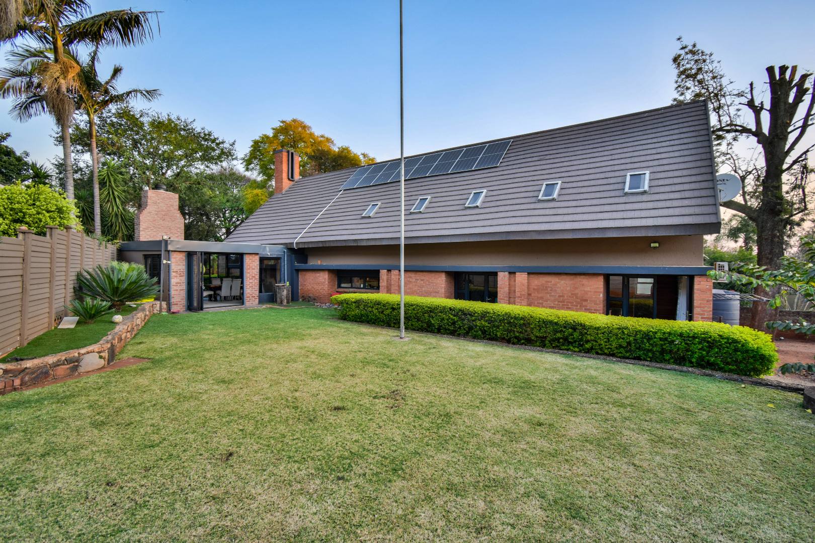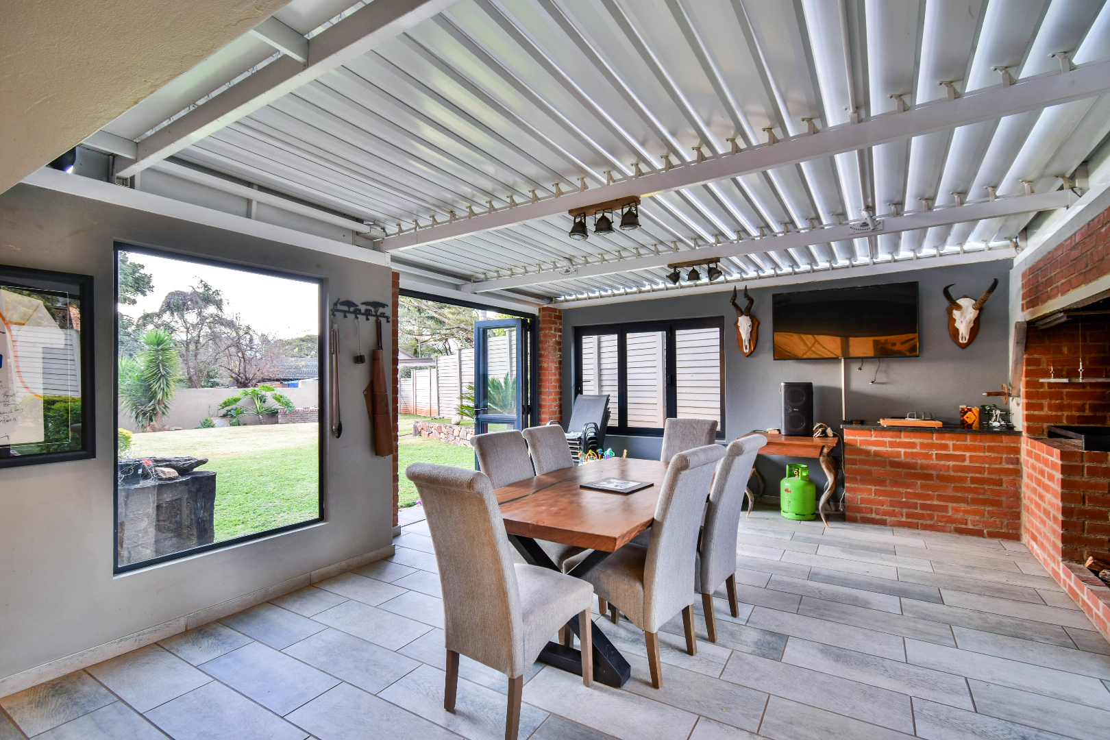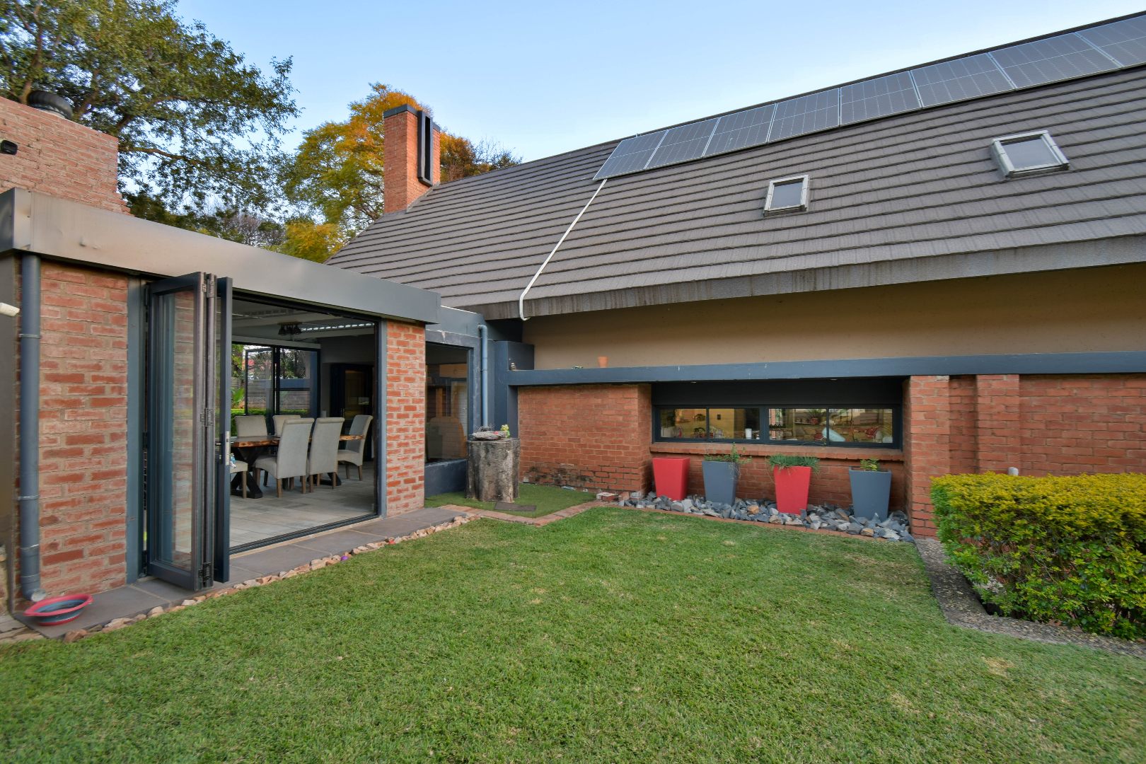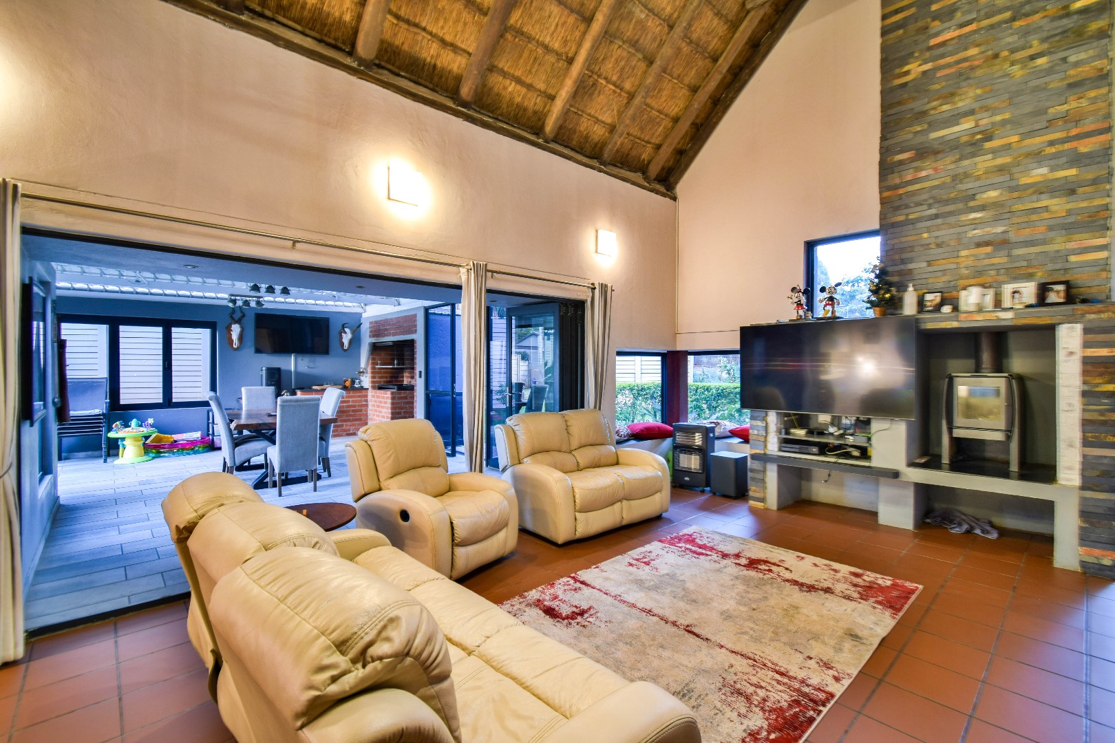 Outdoor features include a covered braai area with aluminum stacker doors and built-in doggy doors—perfect for relaxed entertaining. The well-maintained wrap-around garden offers plenty of space for pets and children to enjoy. Additional highlights include JoJo tank and a borehole that is ready as an optional connection. Sustainable living is made easy with 16 solar panels, an 8kW inverter and 15kWh battery system The property also boasts a tiled Havi-tiled roof, three garages, and thoughtful extras such as filtered water to taps and geysers, a geyser on WiFi timer, and modern finishes throughout. This is a refined, well-designed home ready for comfortable and stylish family living.