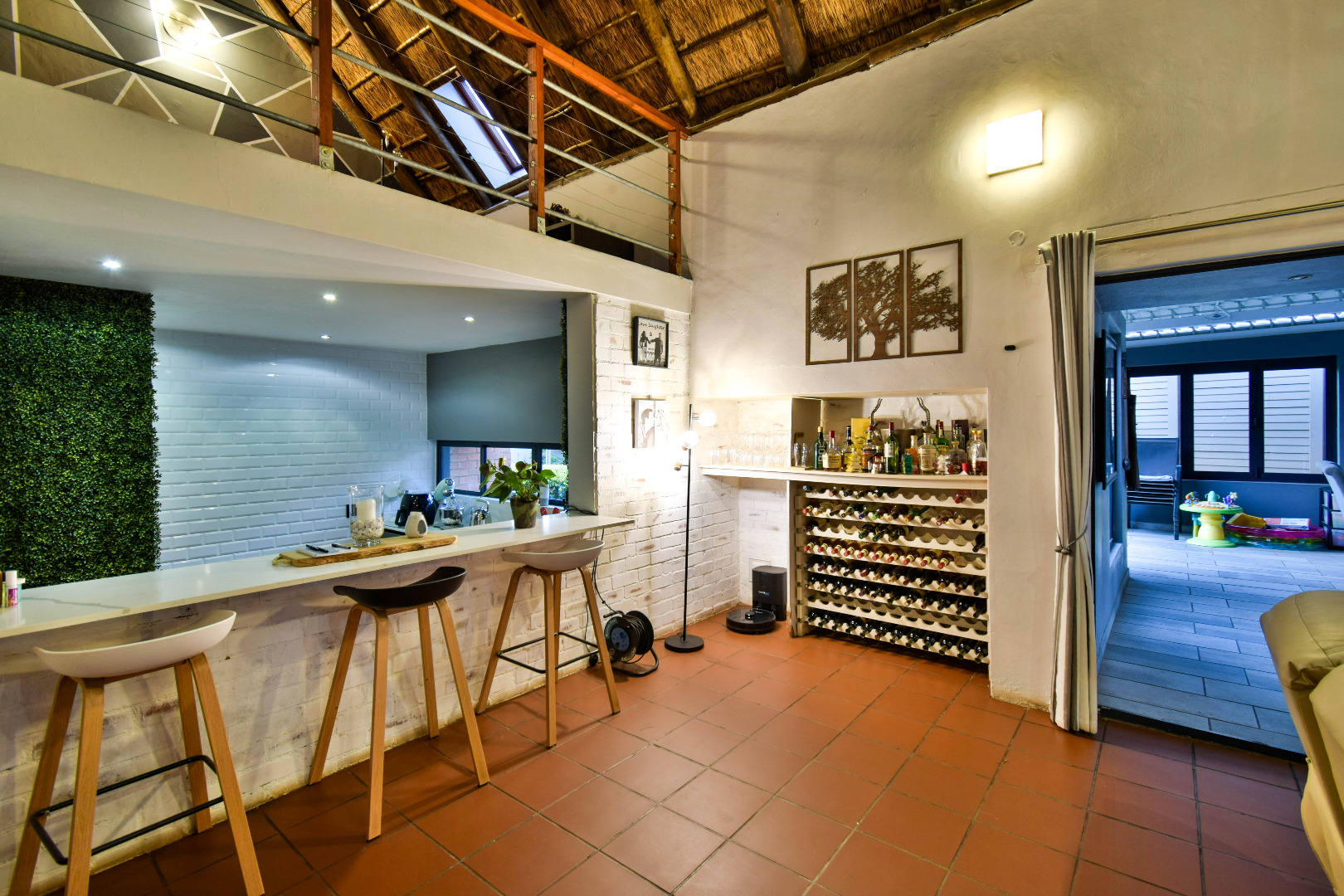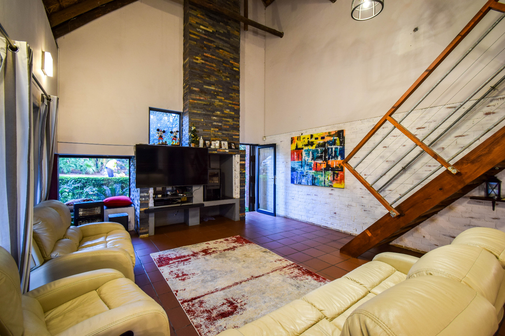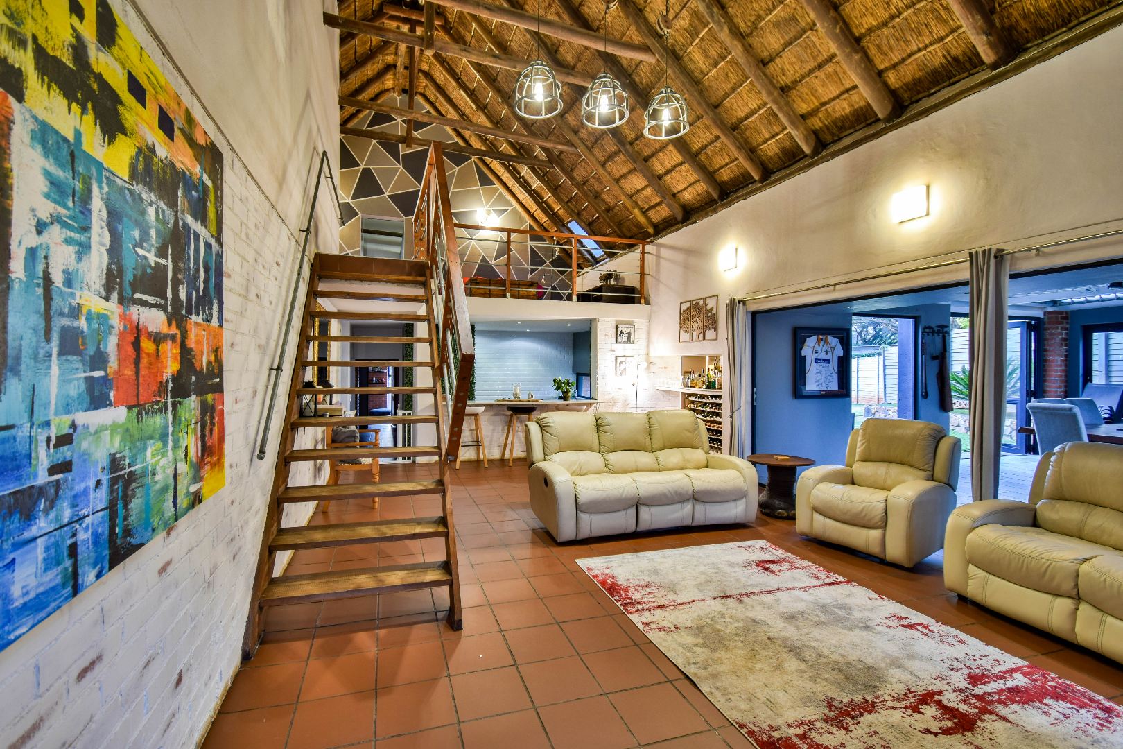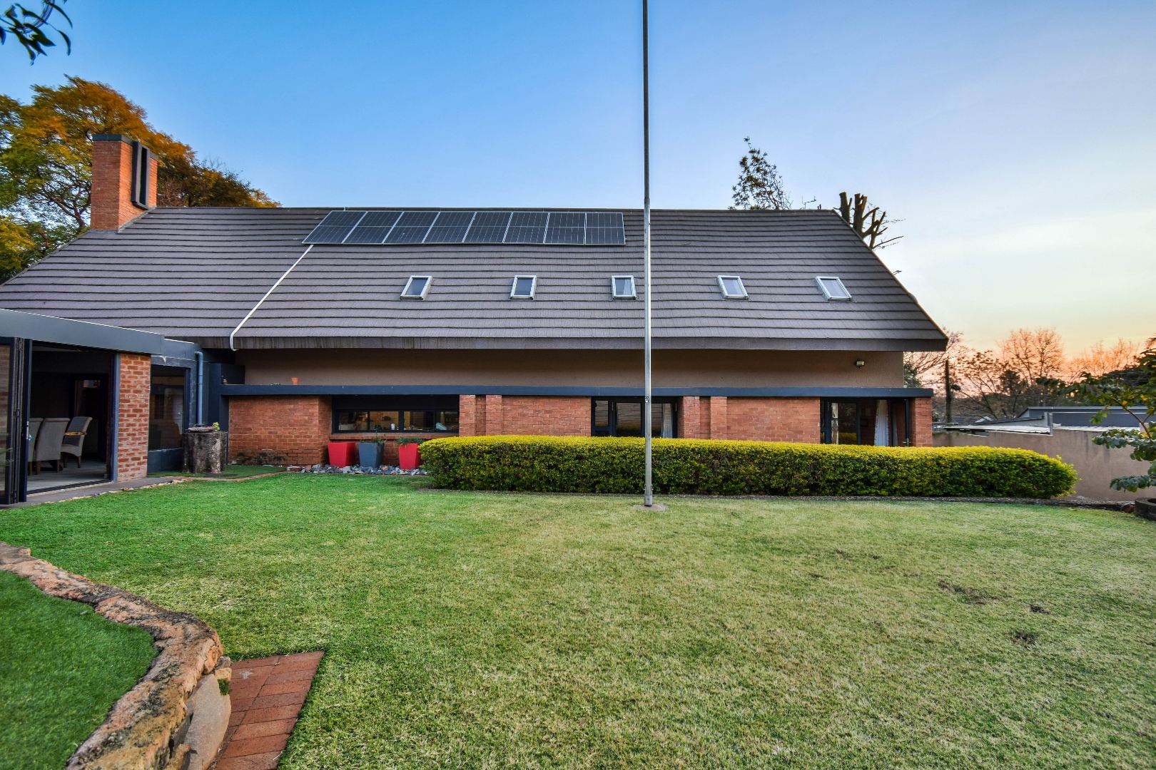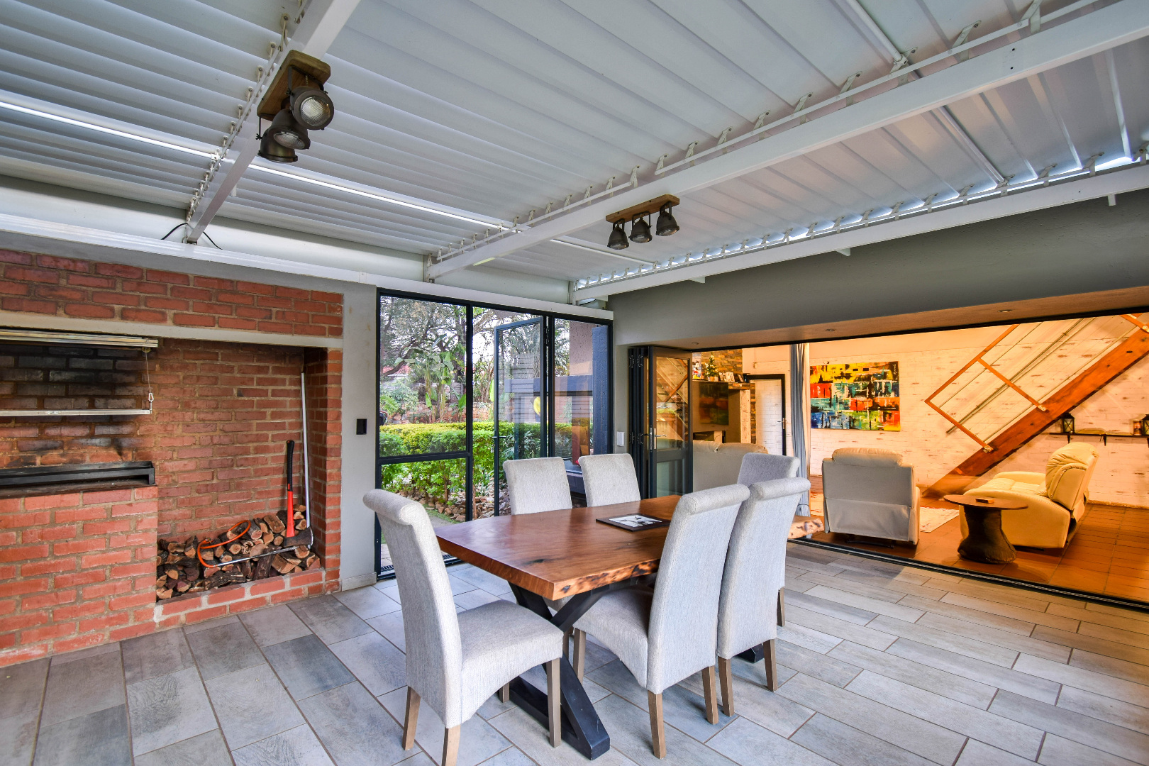 Outdoor features include a covered braai area with aluminum stacker doors and built-in doggy doors—perfect for relaxed entertaining. The well-maintained wrap-around garden offers plenty of space for pets and children to enjoy. Additional highlights include JoJo tank and a borehole that is ready as an optional connection. Sustainable living is made easy with 16 solar panels, an 8kW inverter and 15kWh battery system The property also boasts a tiled Havi-tiled roof, three garages, and thoughtful extras such as filtered water to taps and geysers, a geyser on WiFi timer, and modern finishes throughout. This is a refined, well-designed home ready for comfortable and stylish family living.