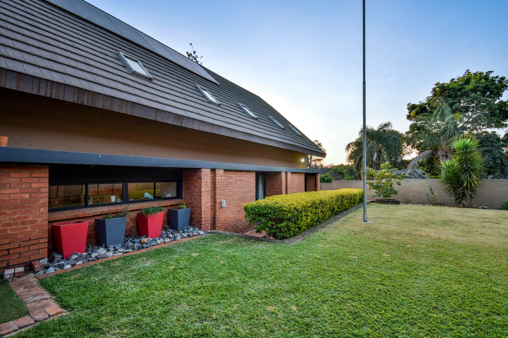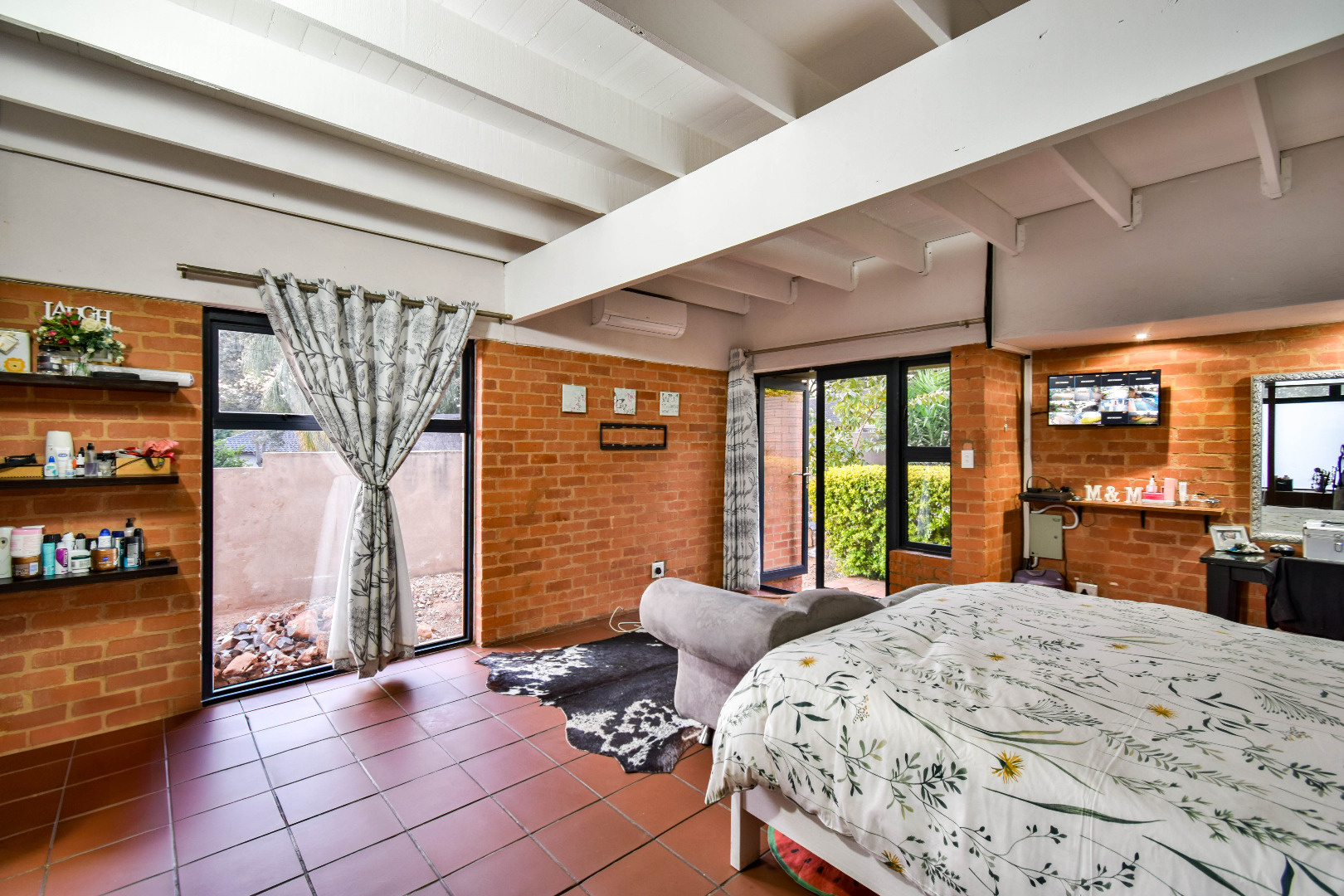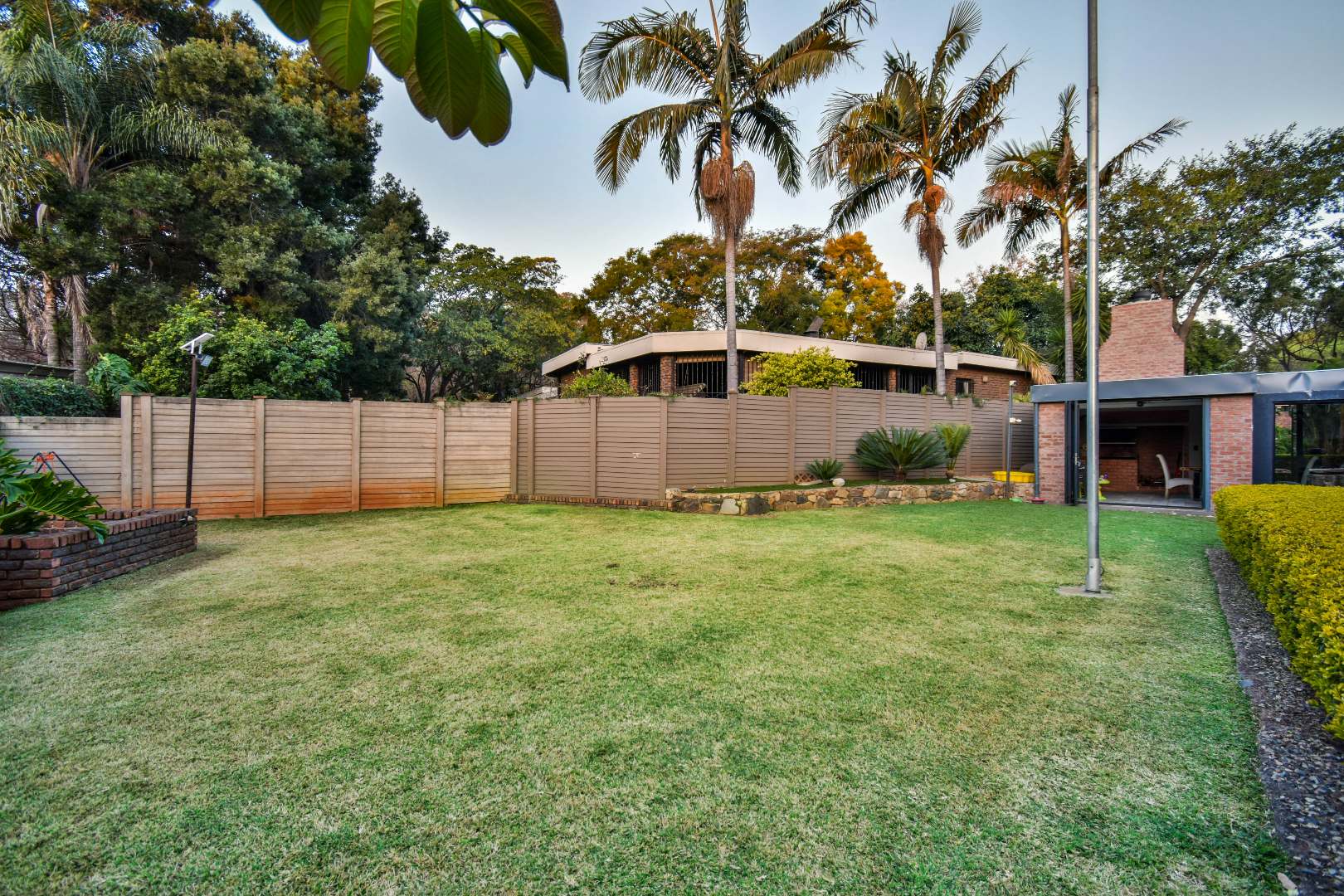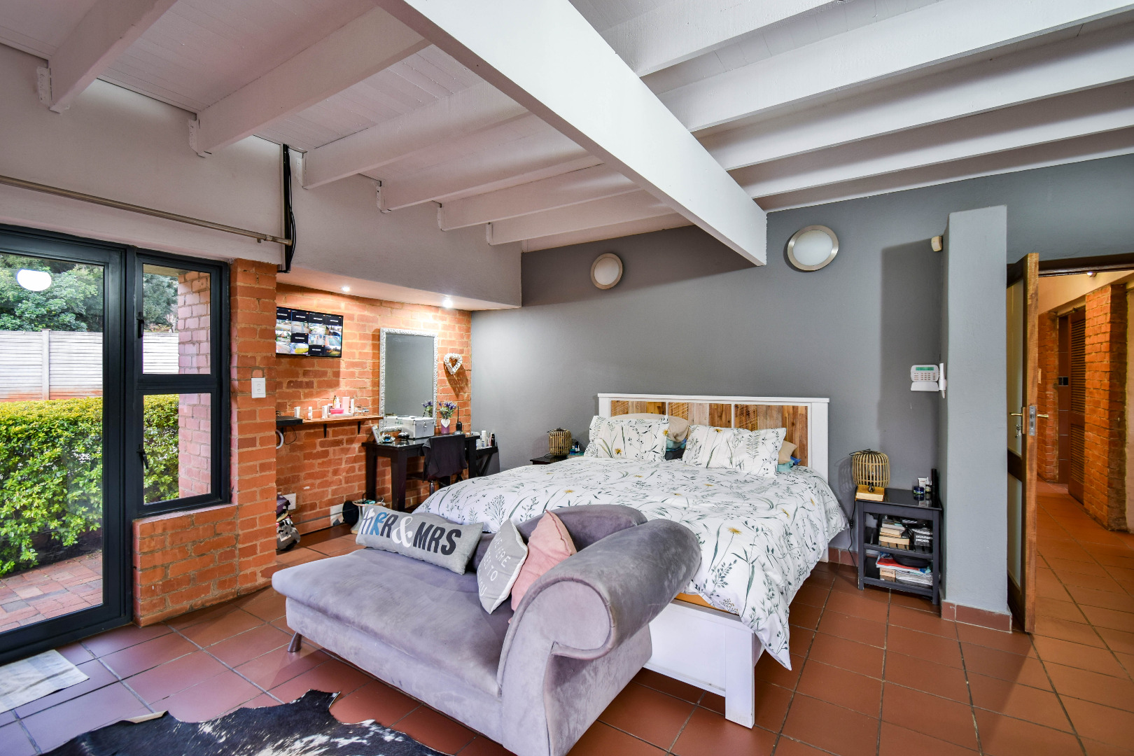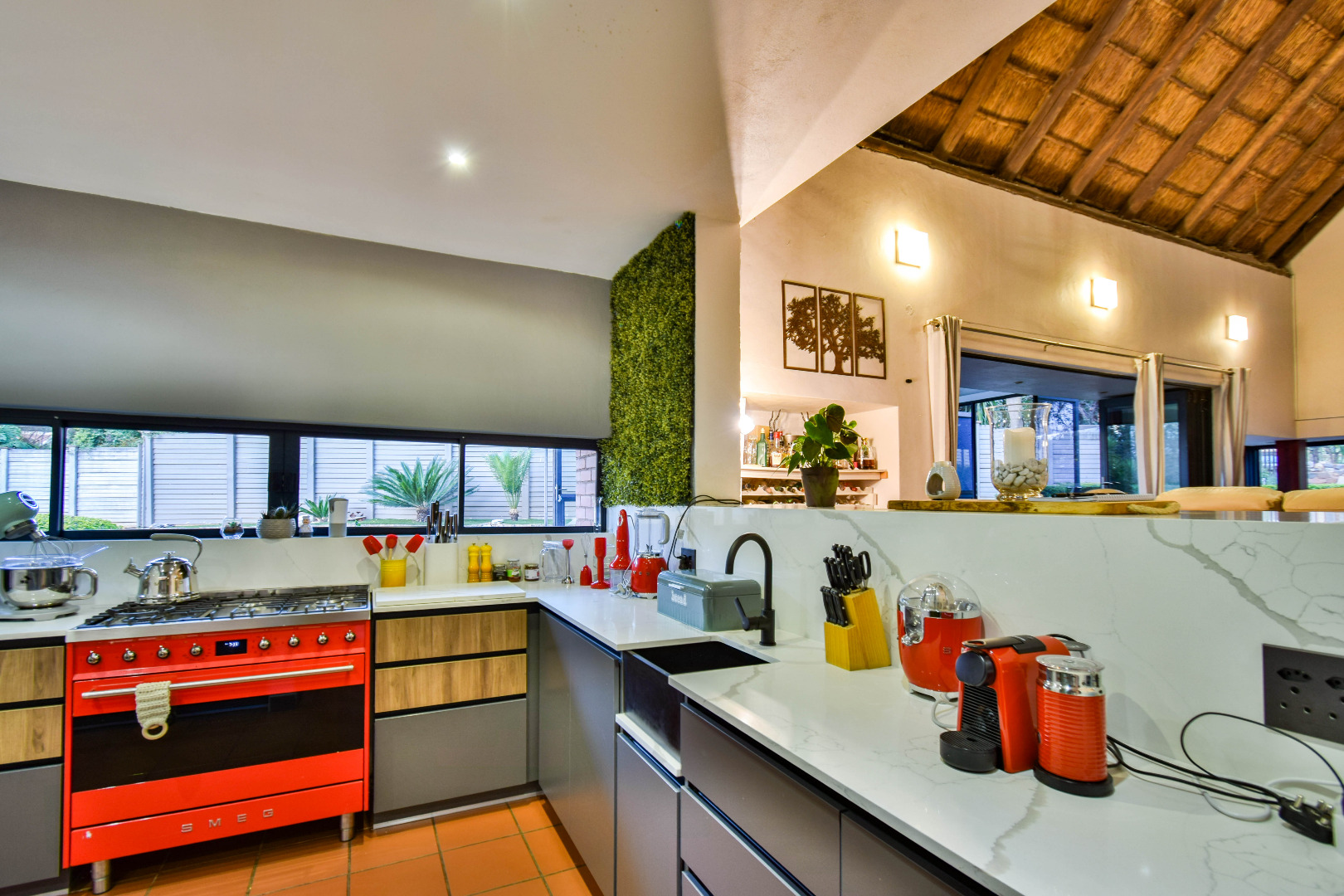 Outdoor features include a covered braai area with aluminum stacker doors and built-in doggy doors—perfect for relaxed entertaining. The well-maintained wrap-around garden offers plenty of space for pets and children to enjoy. Additional highlights include JoJo tank and a borehole that is ready as an optional connection. Sustainable living is made easy with 16 solar panels, an 8kW inverter and 15kWh battery system The property also boasts a tiled Havi-tiled roof, three garages, and thoughtful extras such as filtered water to taps and geysers, a geyser on WiFi timer, and modern finishes throughout. This is a refined, well-designed home ready for comfortable and stylish family living.