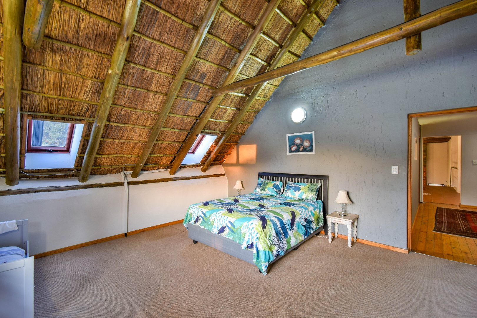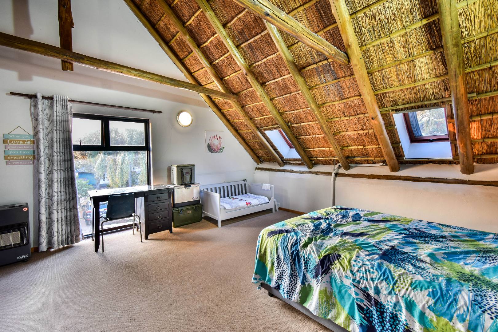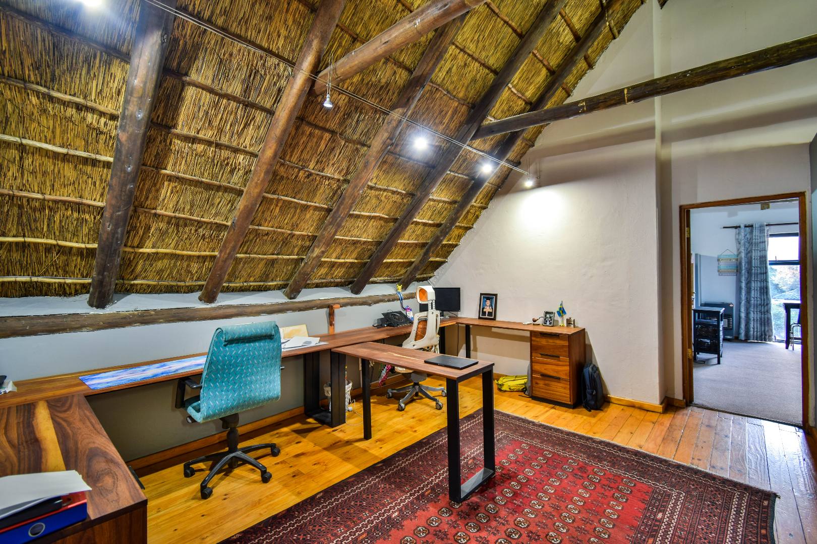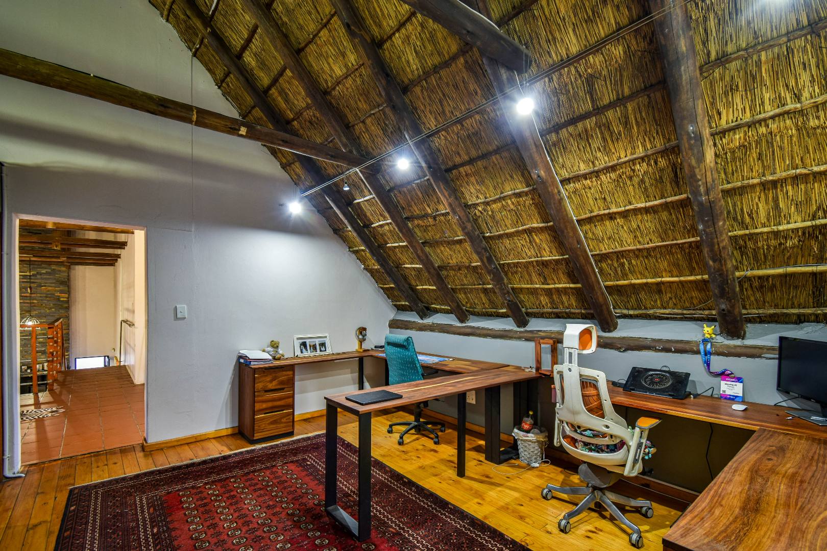 Upstairs, the home continues to impress with a cozy pajama lounge and an open-plan office space—ideal for remote work, studying, or creative pursuits. Two generously sized bedrooms are located on this level, including a large suite with a full bathroom, making it perfect for guests, teens, or extended family. The under-roof size is approximately 300m², offering ample living space throughout. A walk-in linen cupboard provides practical storage, and the home’s layout supports flexible family living across both levels.