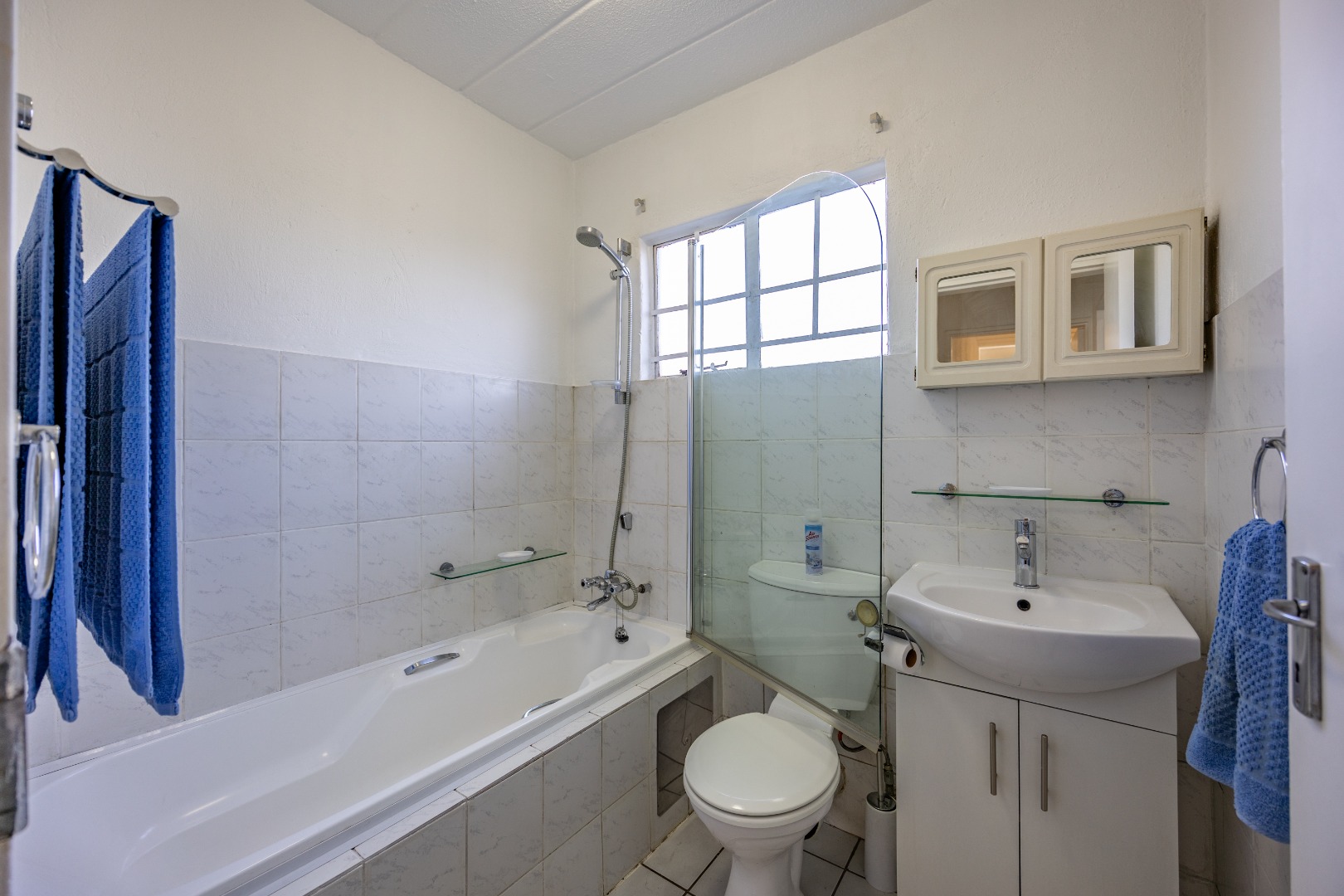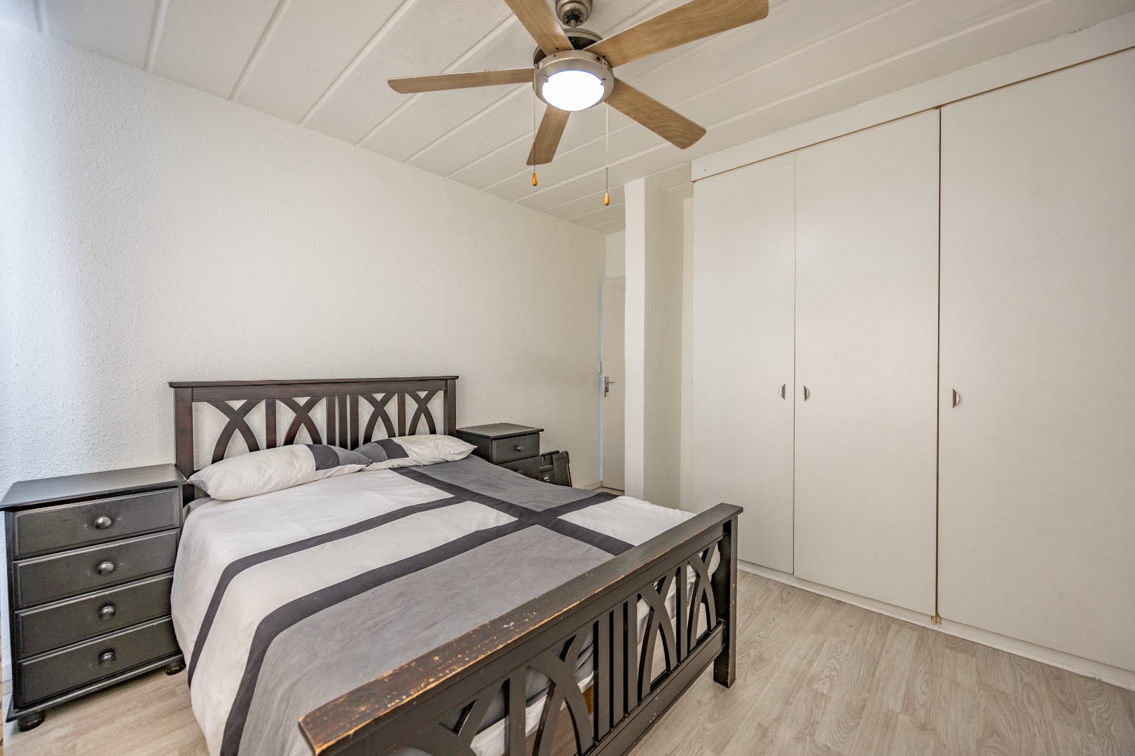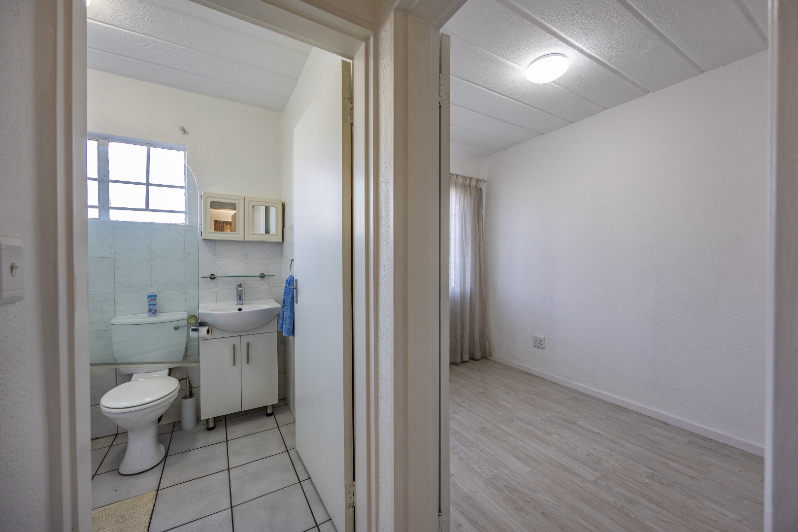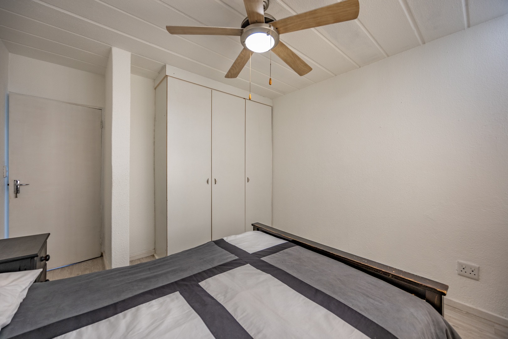 Both bedrooms are well-sized with built-in cupboards, and the full bathroom includes a bath, basin, and toilet – clean and functional.
