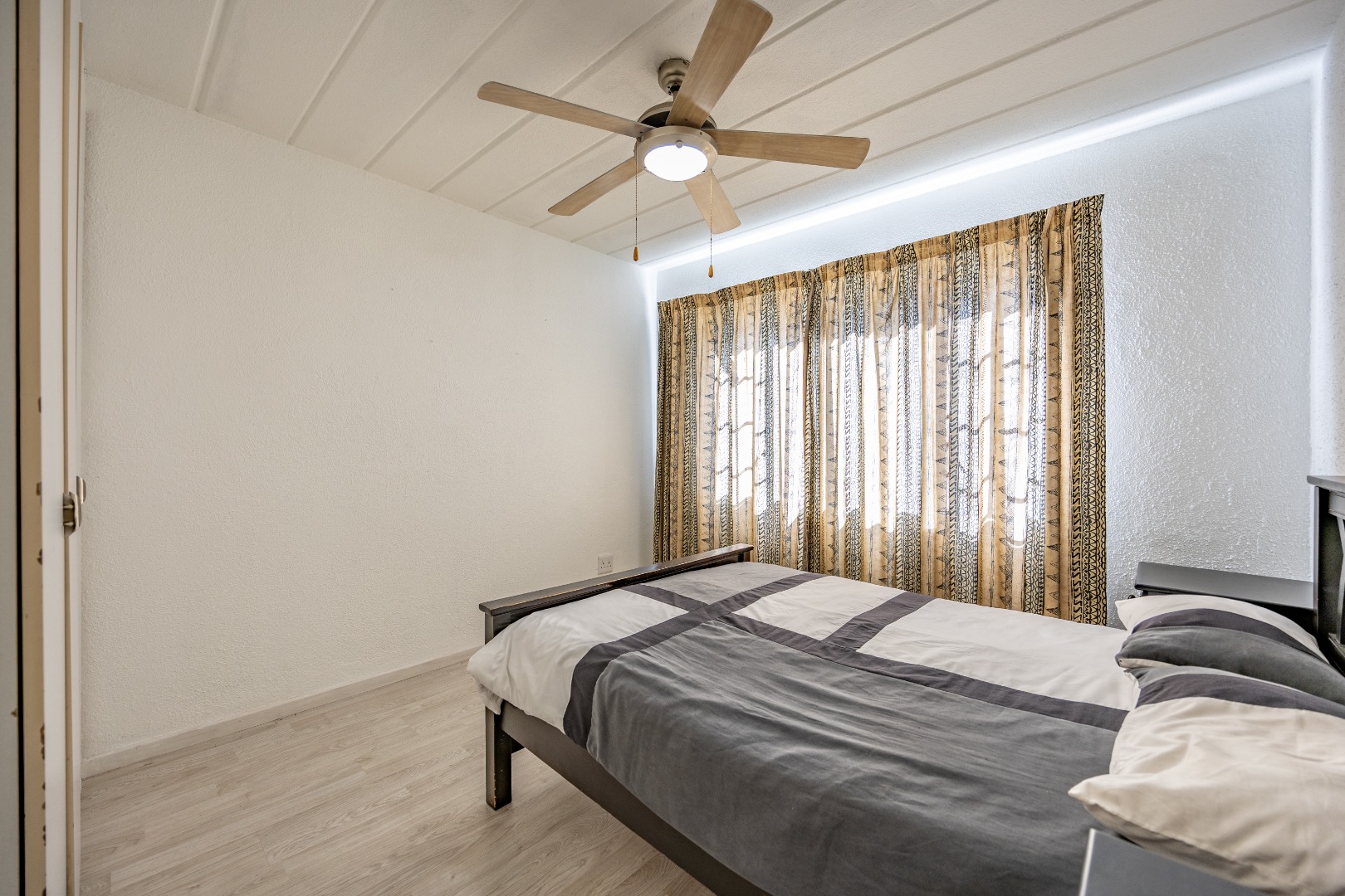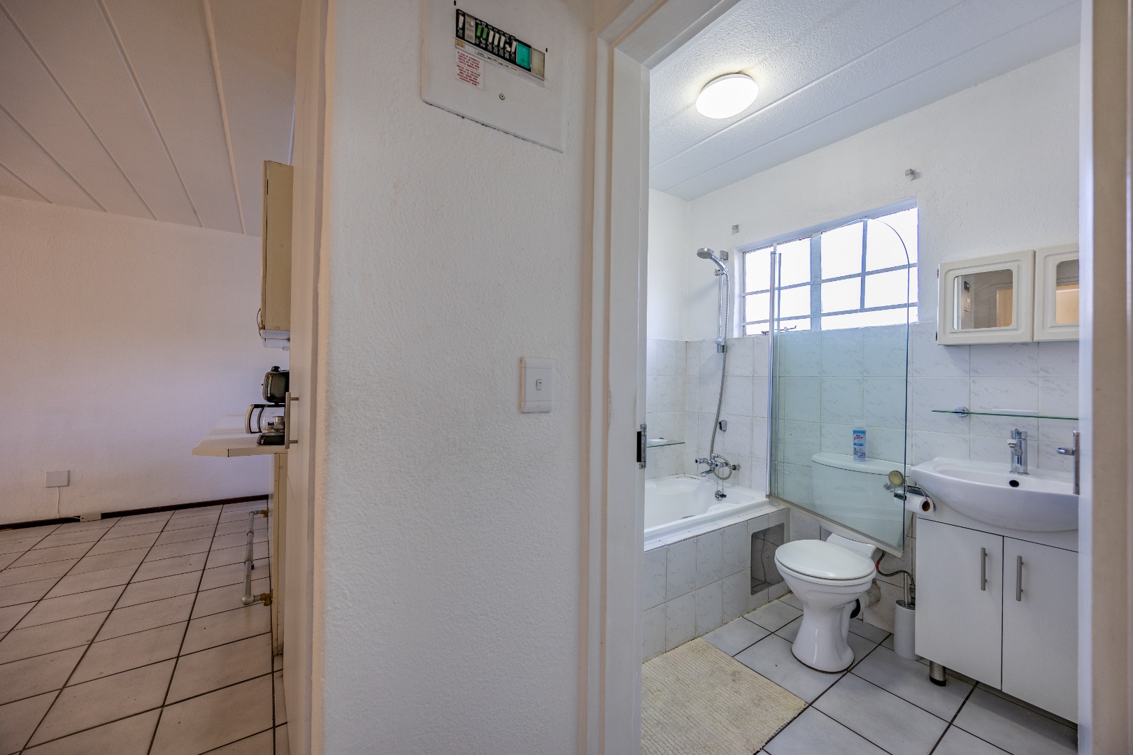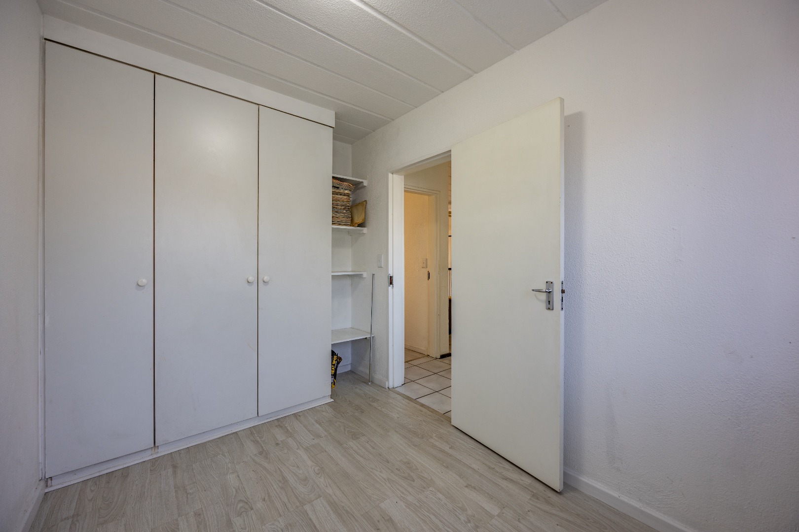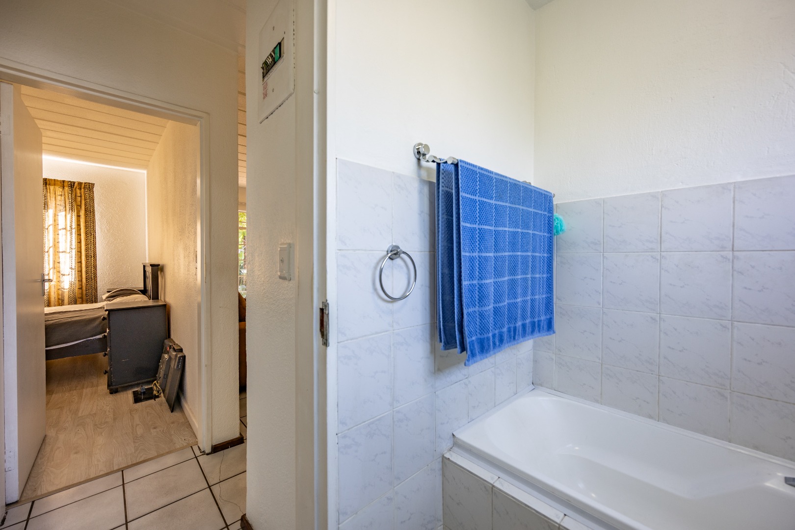 Both bedrooms are well-sized with built-in cupboards, and the full bathroom includes a bath, basin, and toilet – clean and functional.