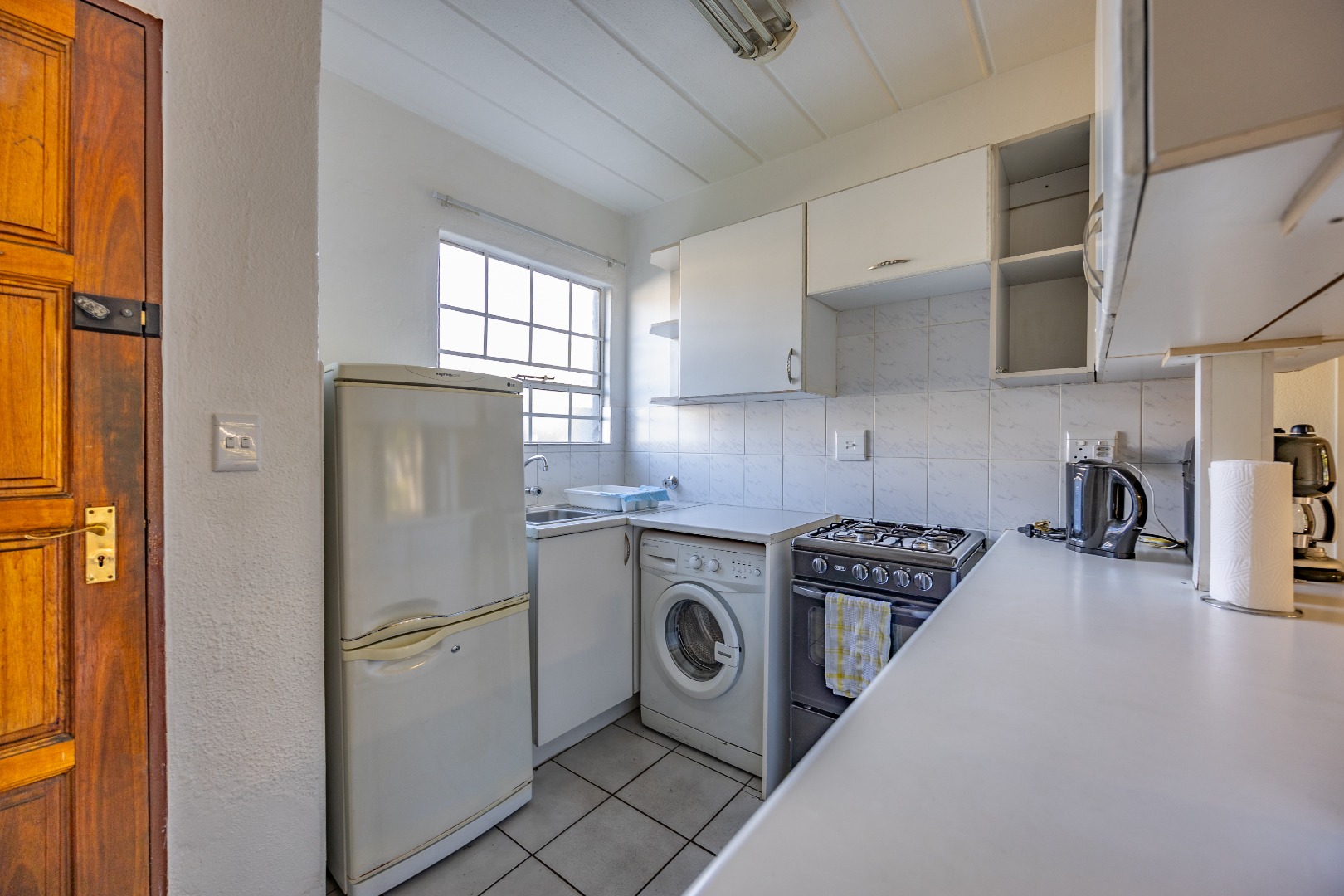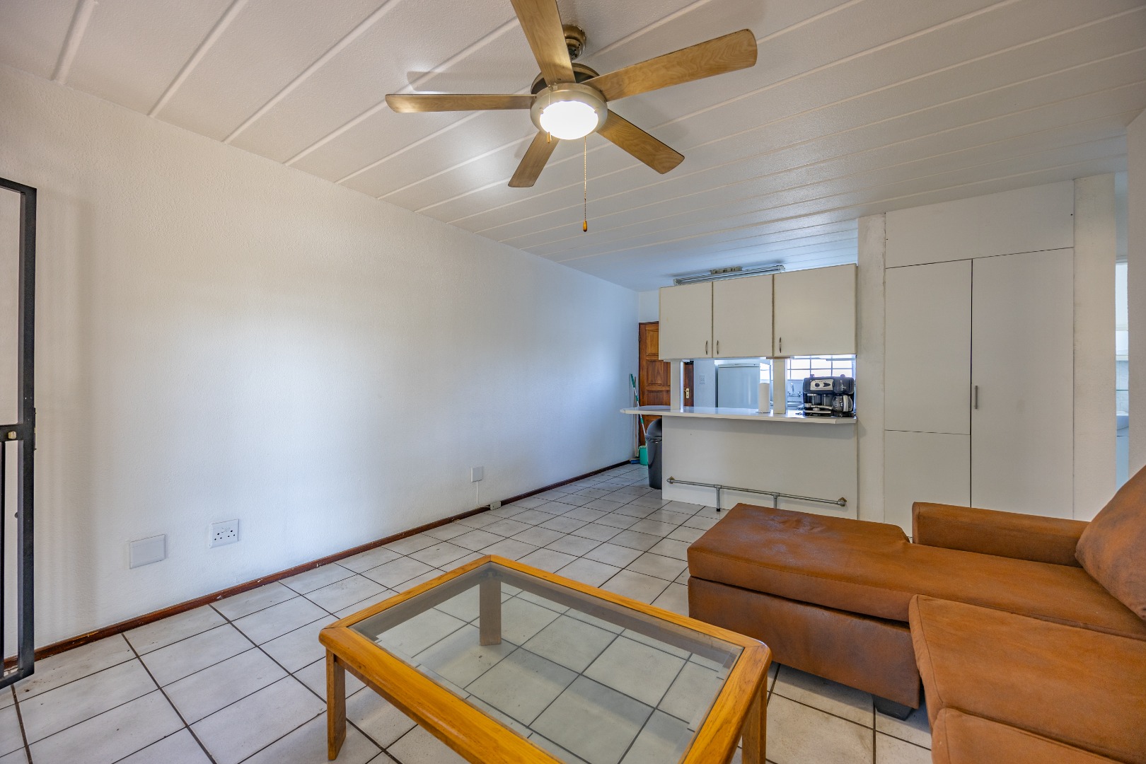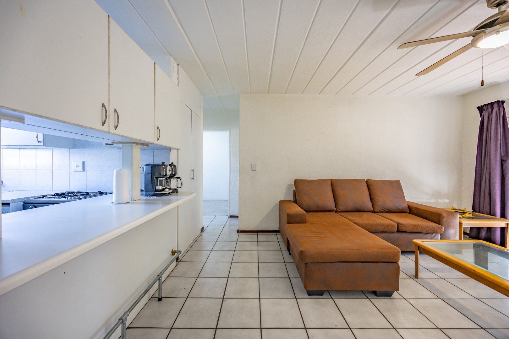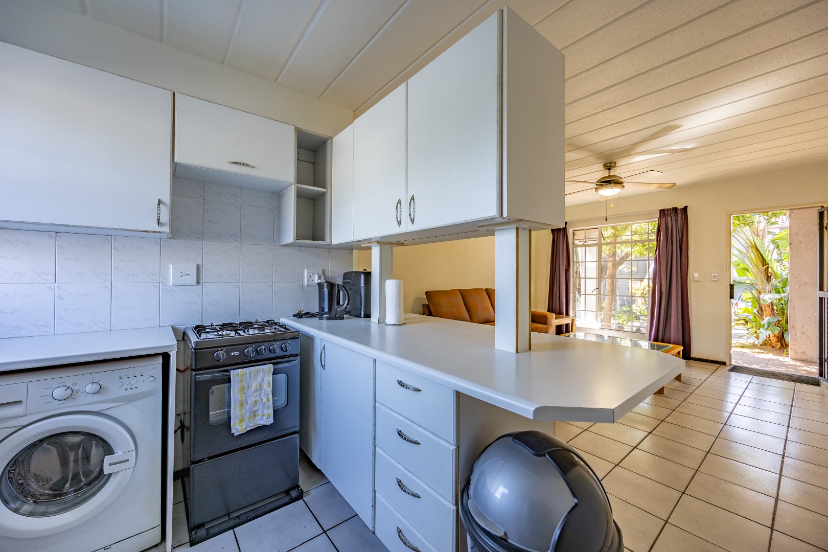 Step into a neatly designed open-plan living space, featuring a spacious lounge area that leads to a small patio – ideal for morning coffee or entertaining friends. The modern kitchen is fitted with ample cupboard space and a gas stove, offering both practicality and savings on electricity.