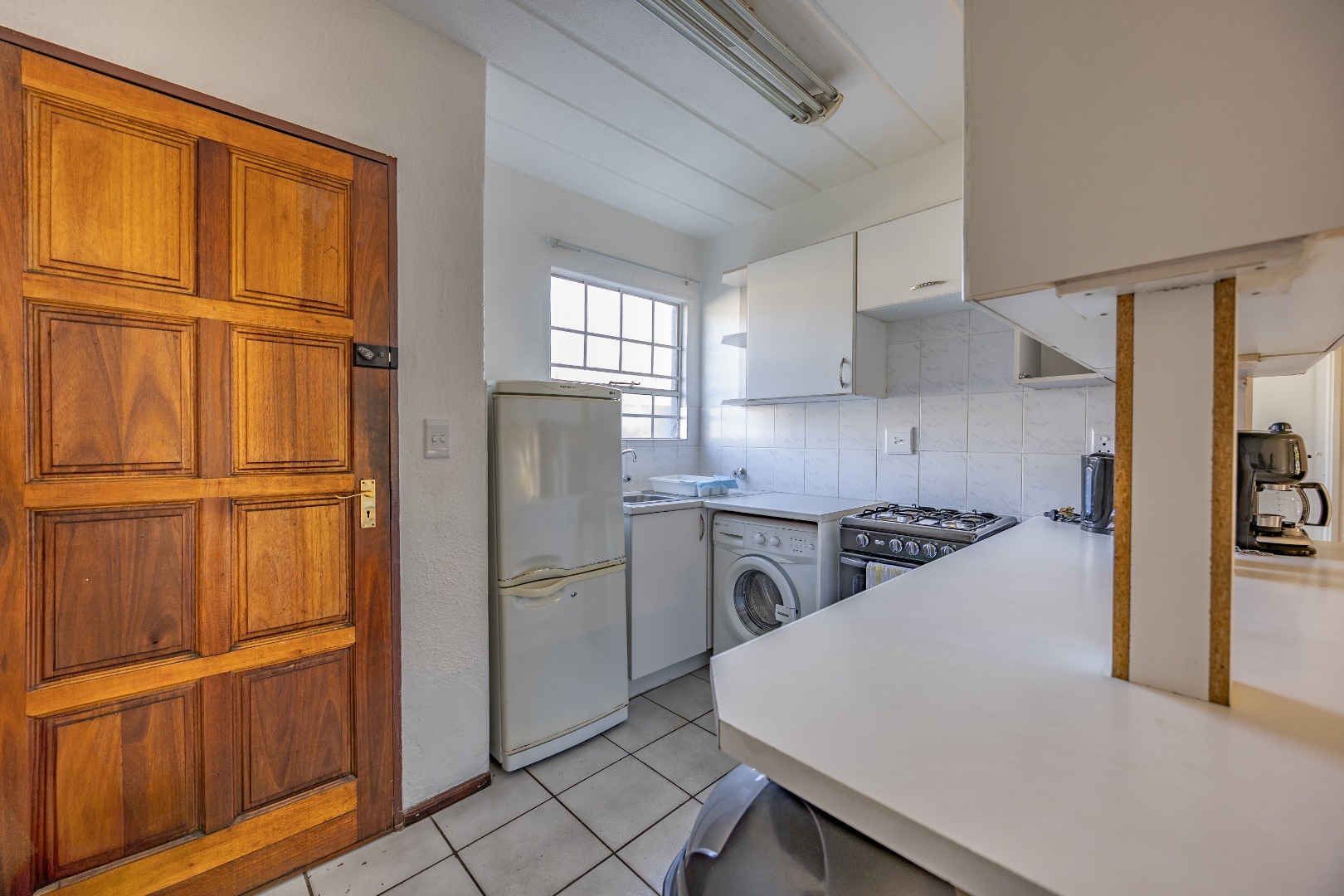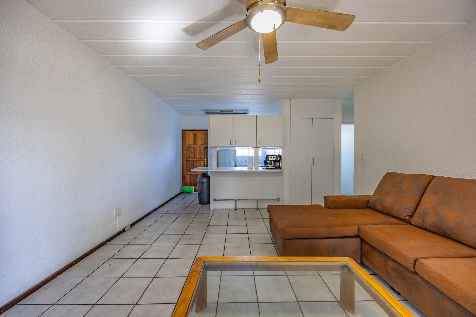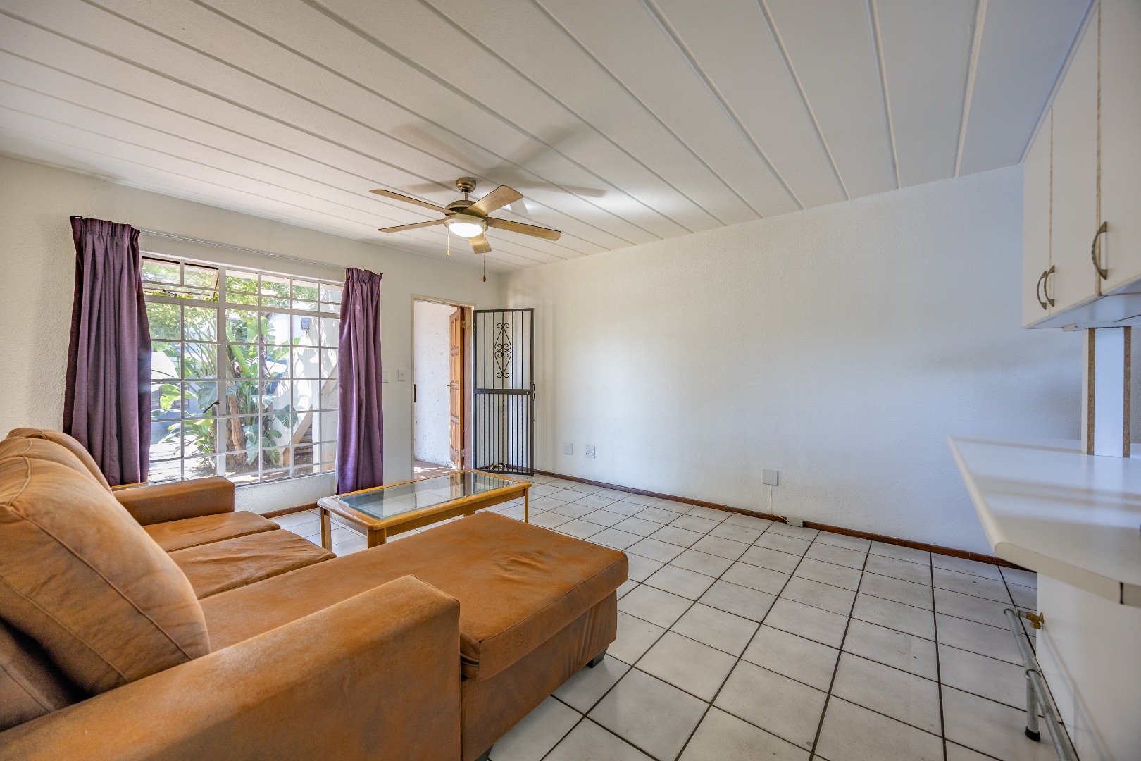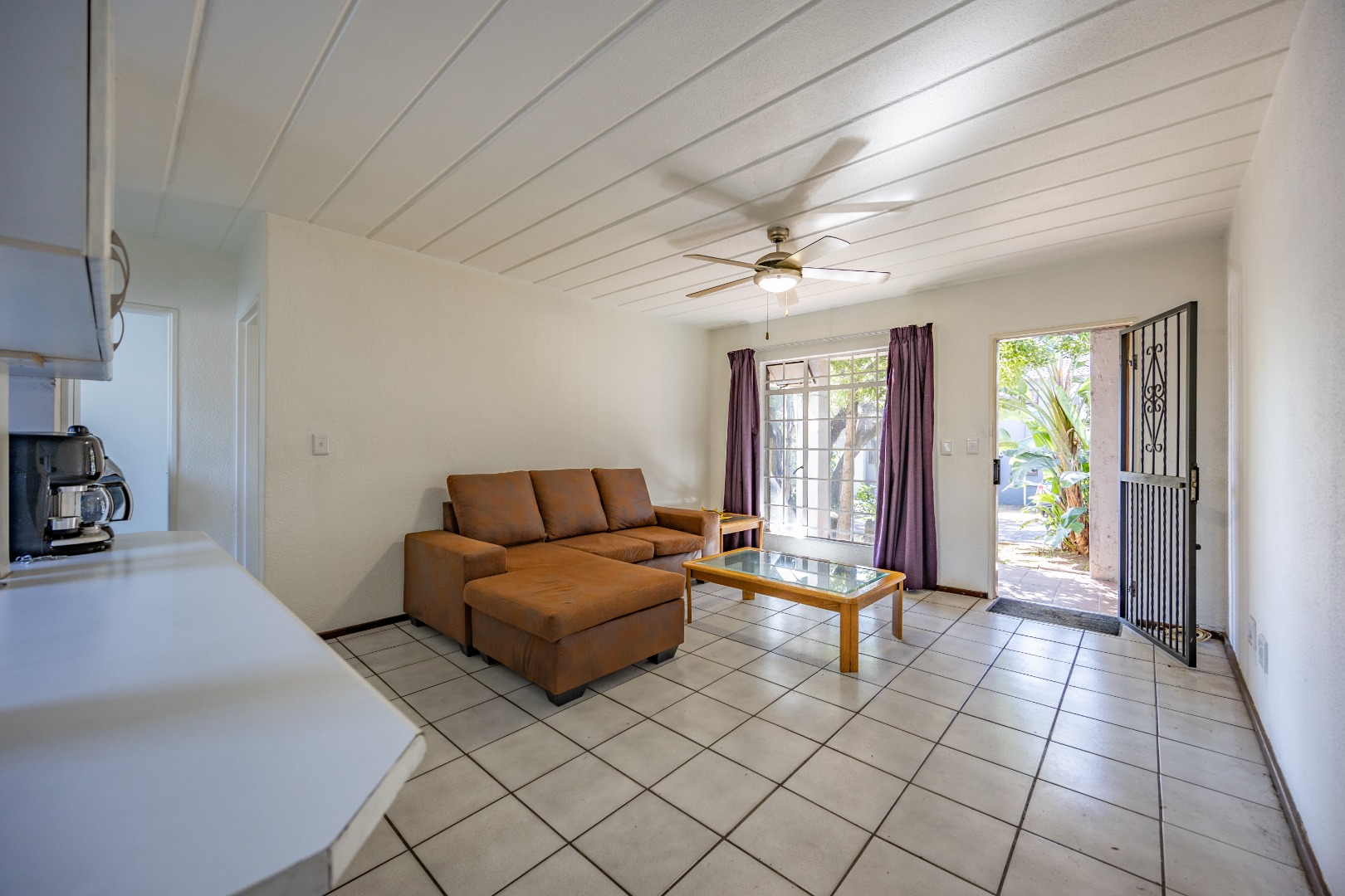 Step into a neatly designed open-plan living space, featuring a spacious lounge area that leads to a small patio – ideal for morning coffee or entertaining friends. The modern kitchen is fitted with ample cupboard space and a gas stove, offering both practicality and savings on electricity.