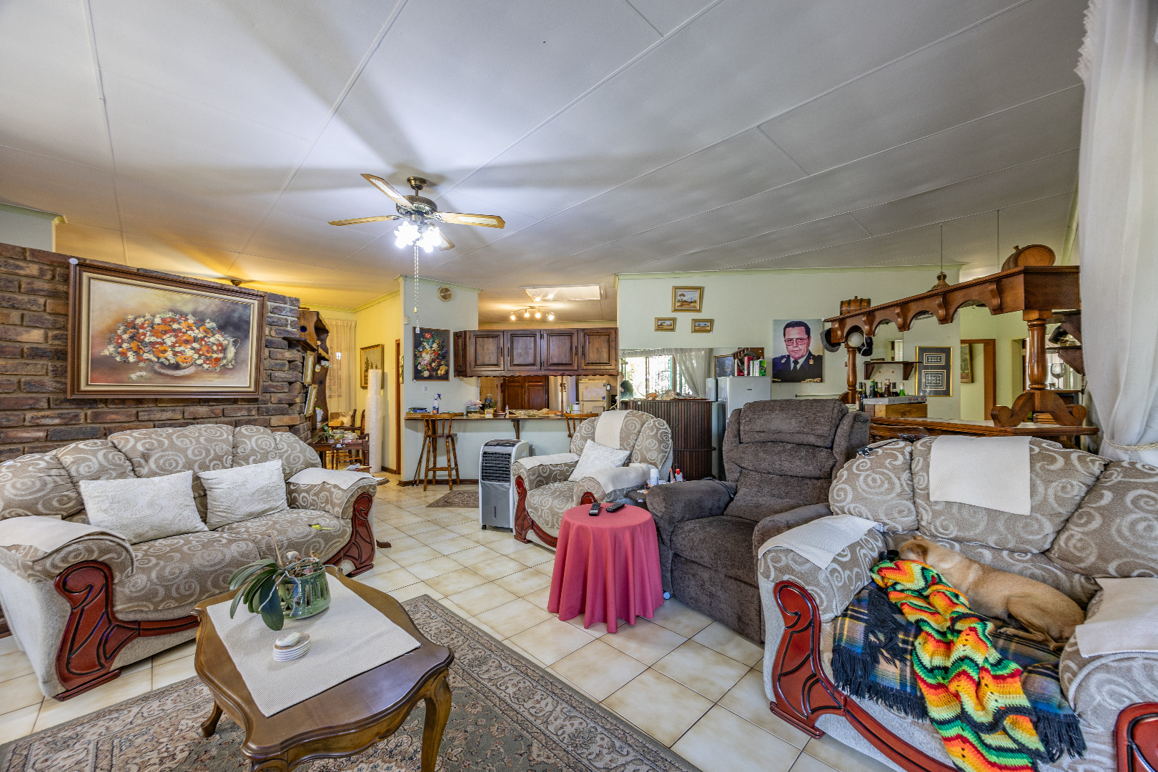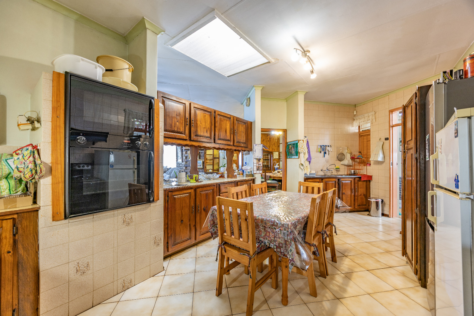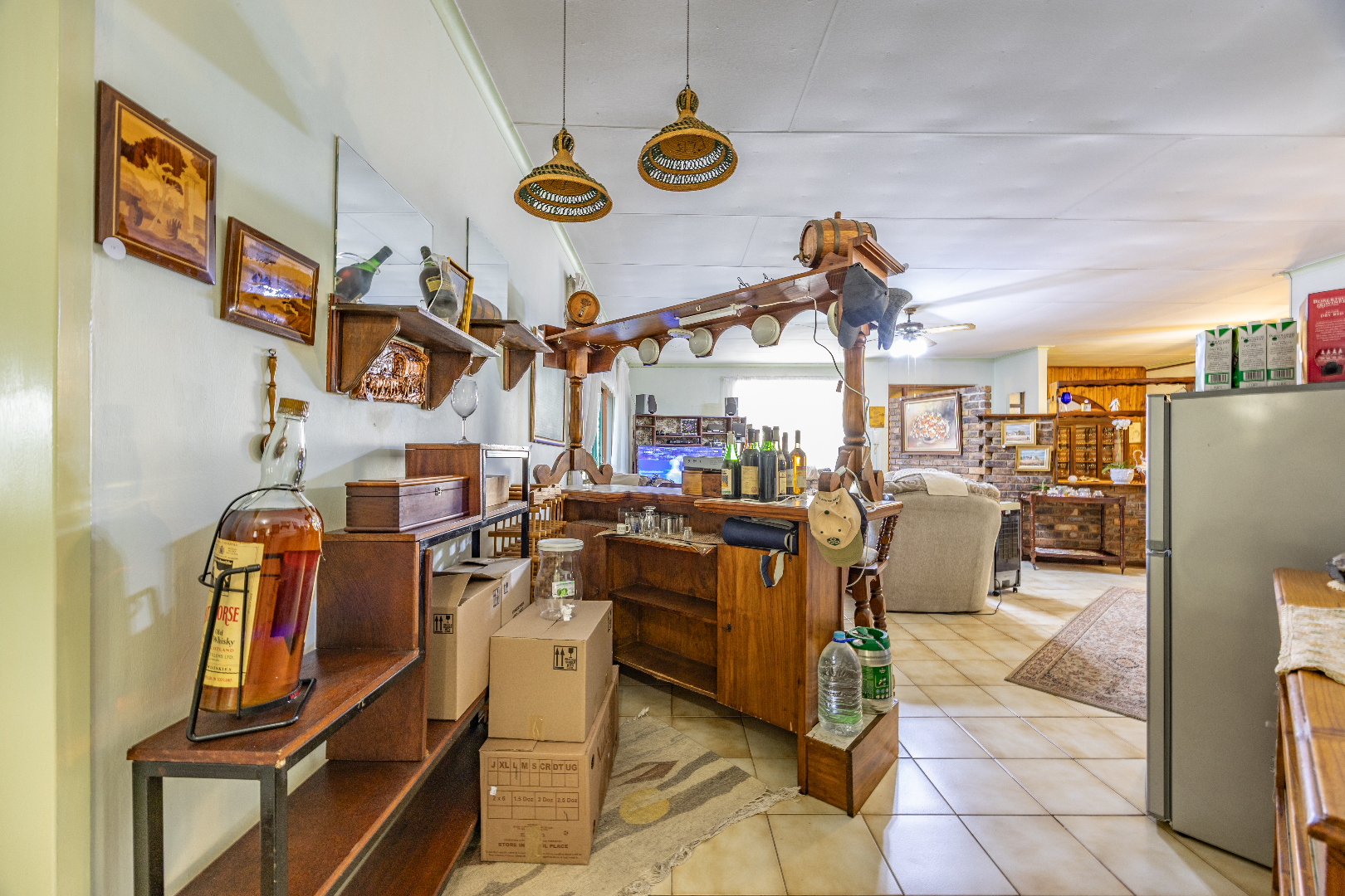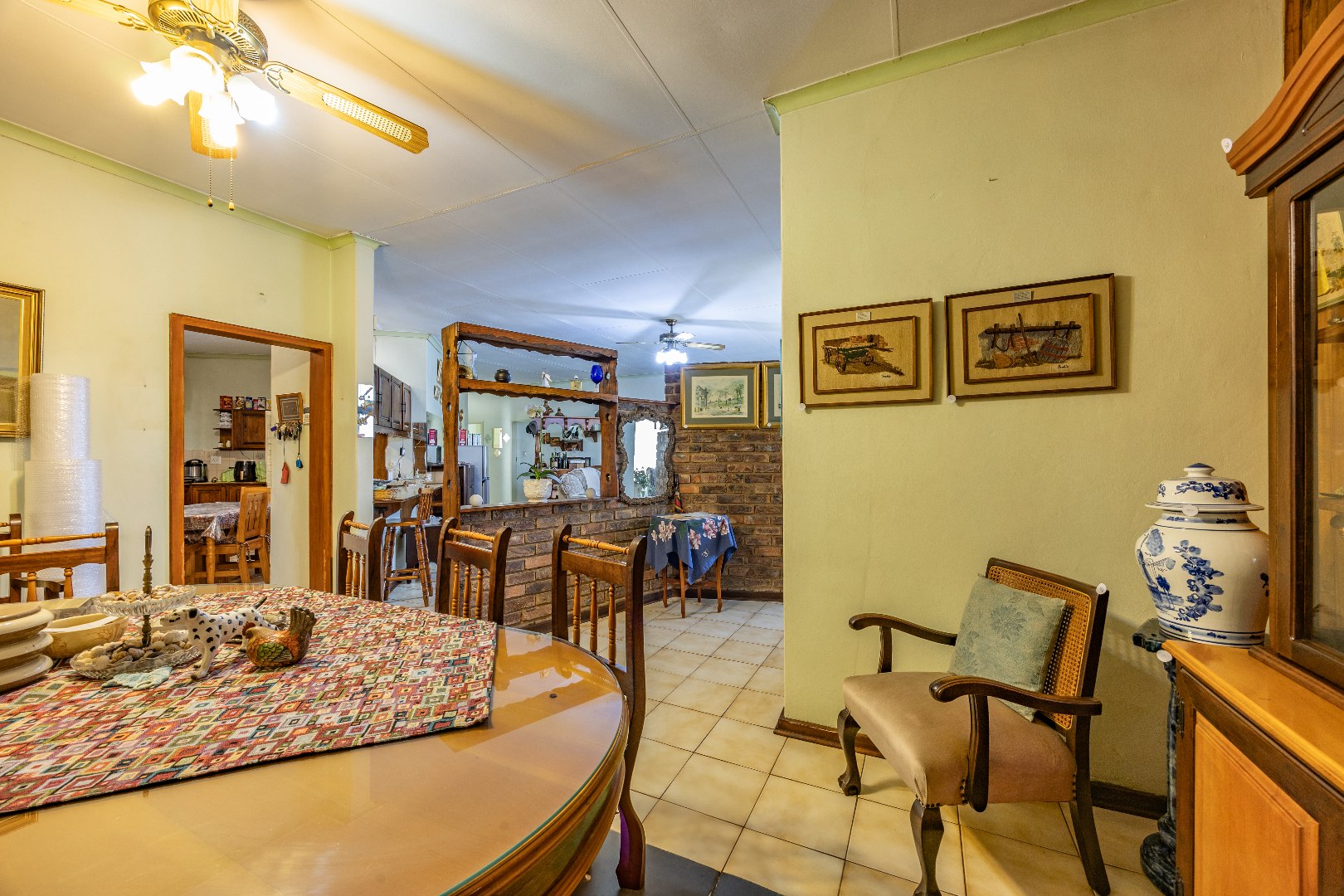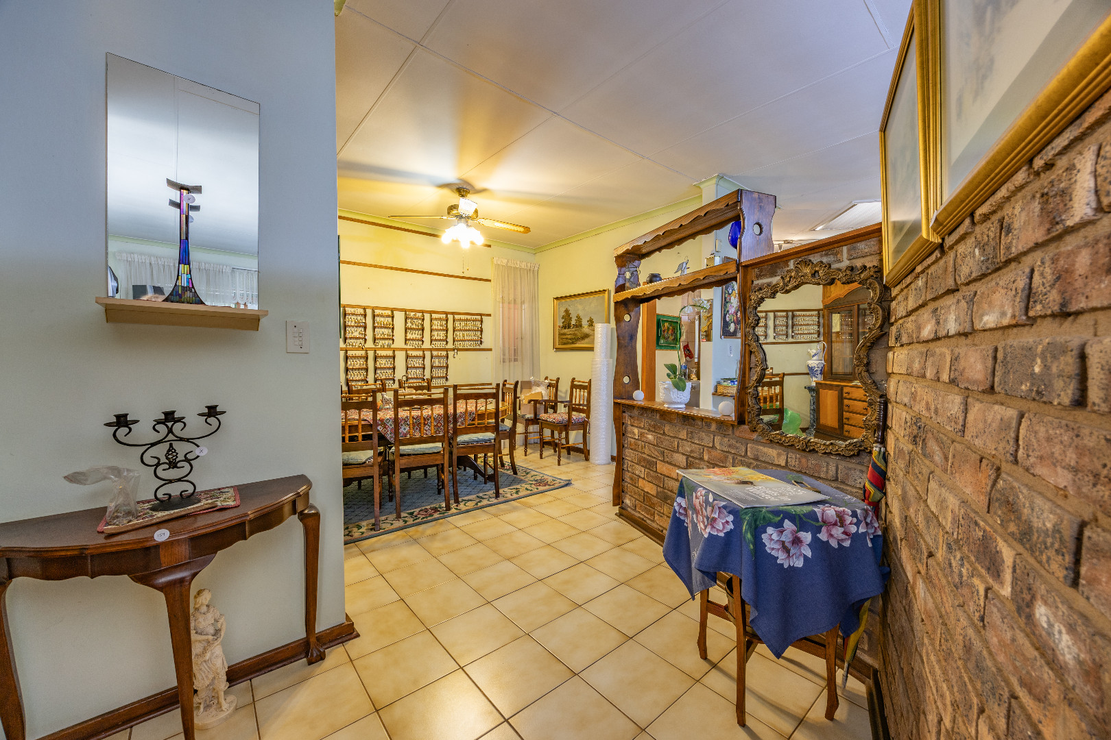 The home opens with an entrance hall and a cosy stoep area, leading to a spacious living room and TV room. The dining area flows to an older-style kitchen, which shows some wear with roof stains and dated finishes but offers great renovation potential. The living room ceiling requires attention, presenting an opportunity to modernize and add value.
