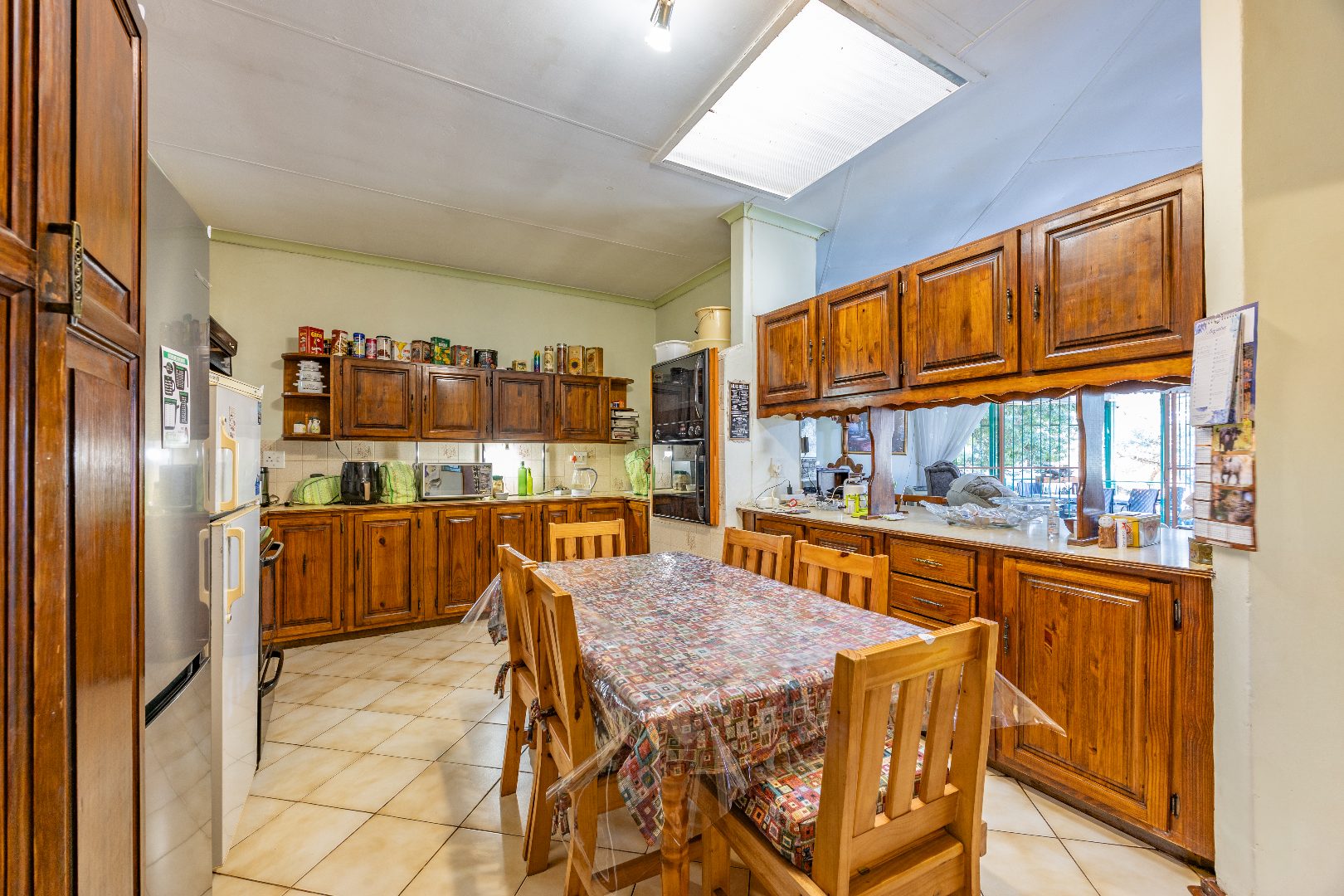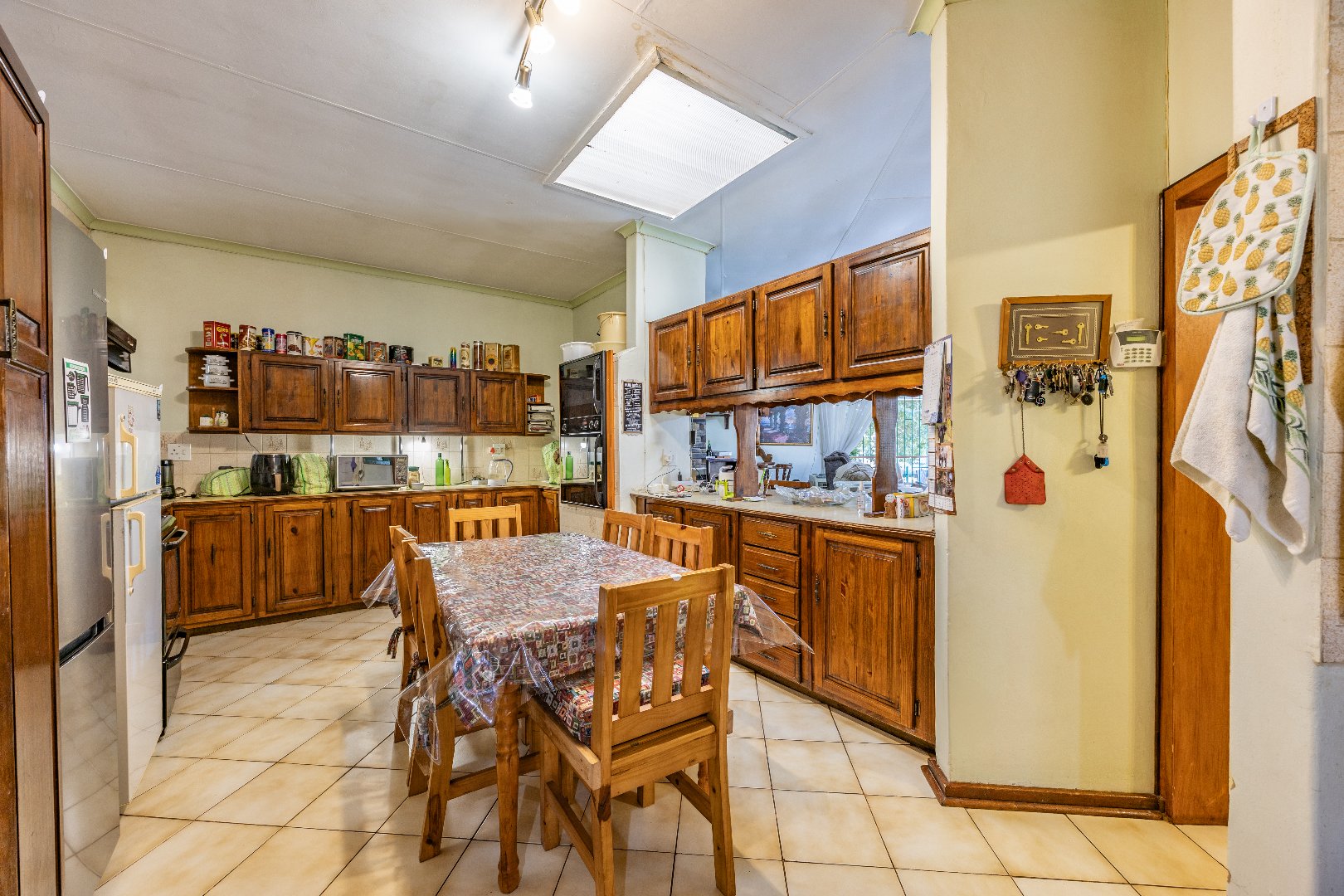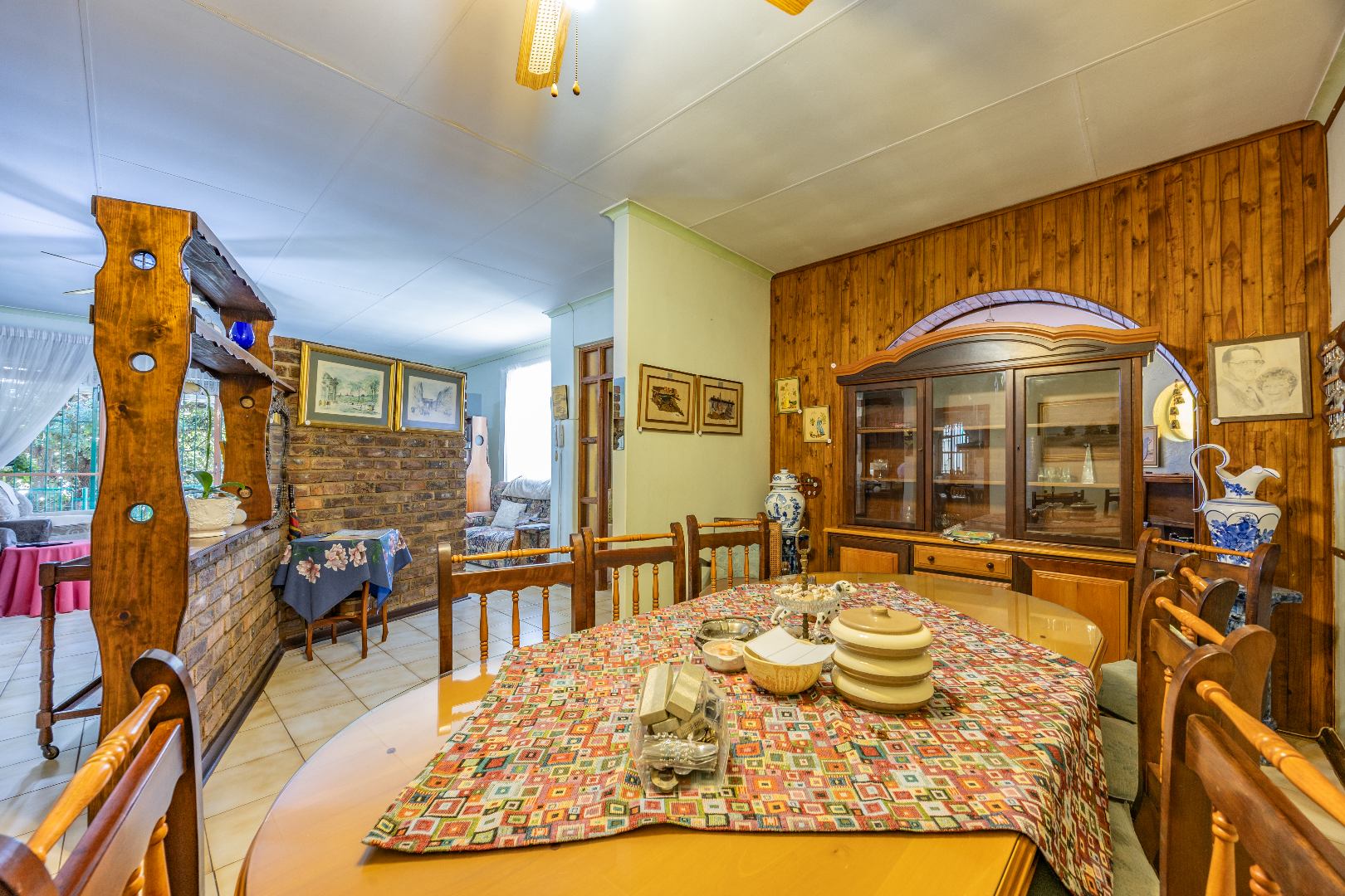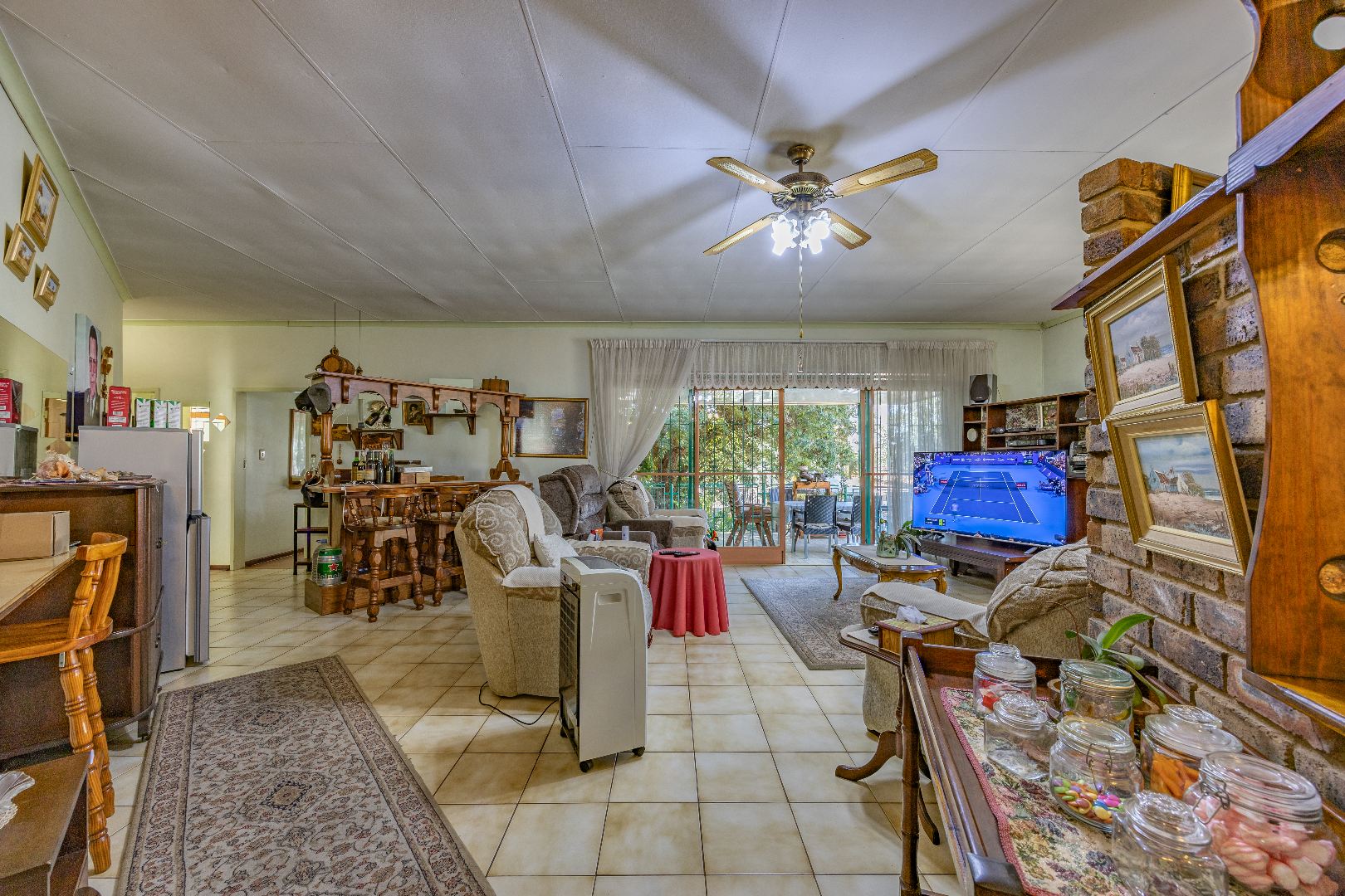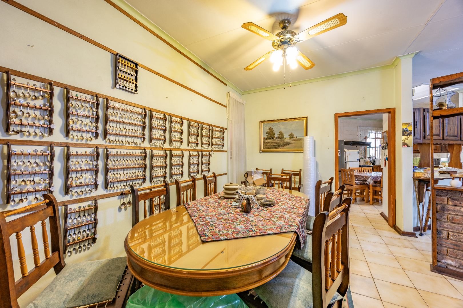The home opens with an entrance hall and a cosy stoep area, leading to a spacious living room and TV room. The dining area flows to an older-style kitchen, which shows some wear with roof stains and dated finishes but offers great renovation potential. The living room ceiling requires attention, presenting an opportunity to modernize and add value.