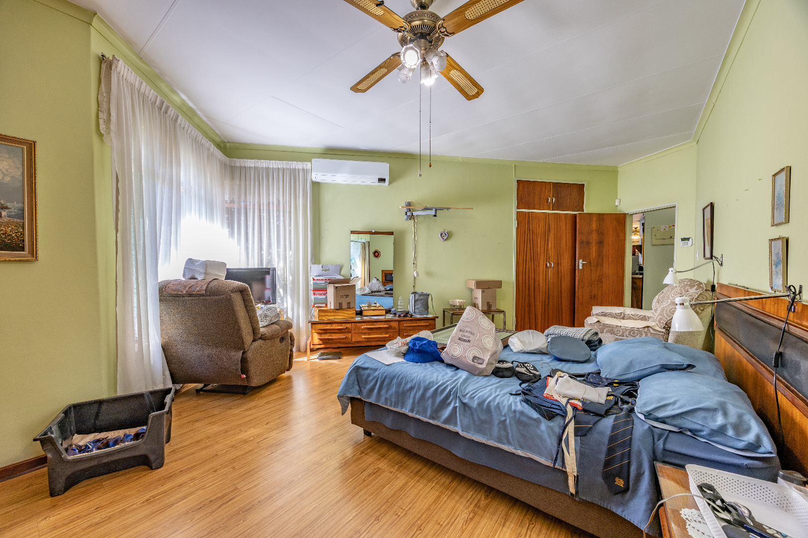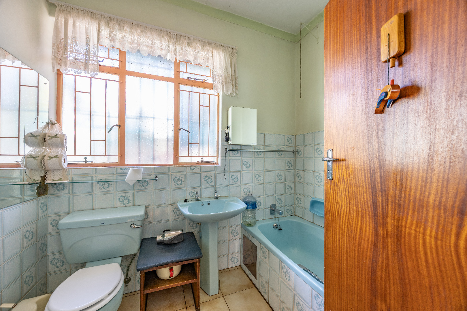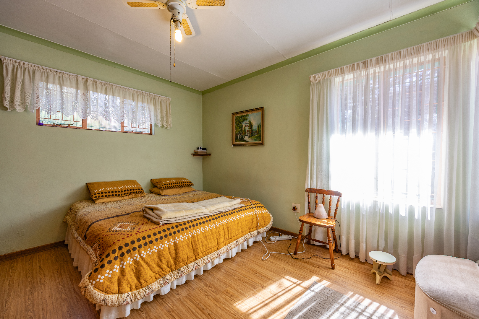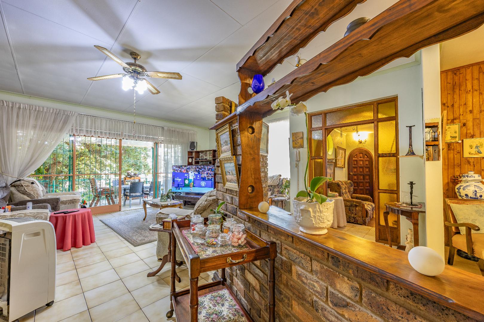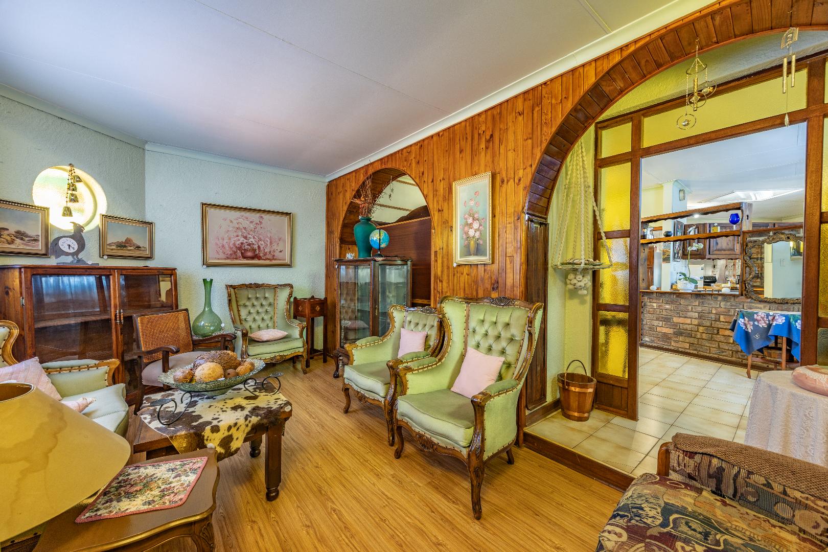 The home opens with an entrance hall and a cosy stoep area, leading to a spacious living room and TV room. The dining area flows to an older-style kitchen, which shows some wear with roof stains and dated finishes but offers great renovation potential. The living room ceiling requires attention, presenting an opportunity to modernize and add value.