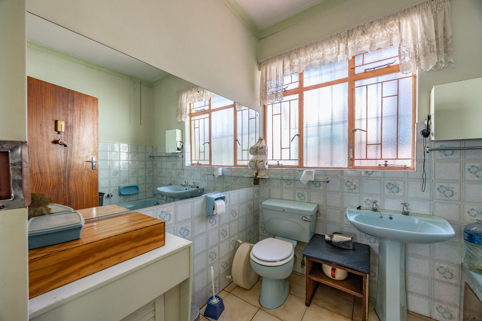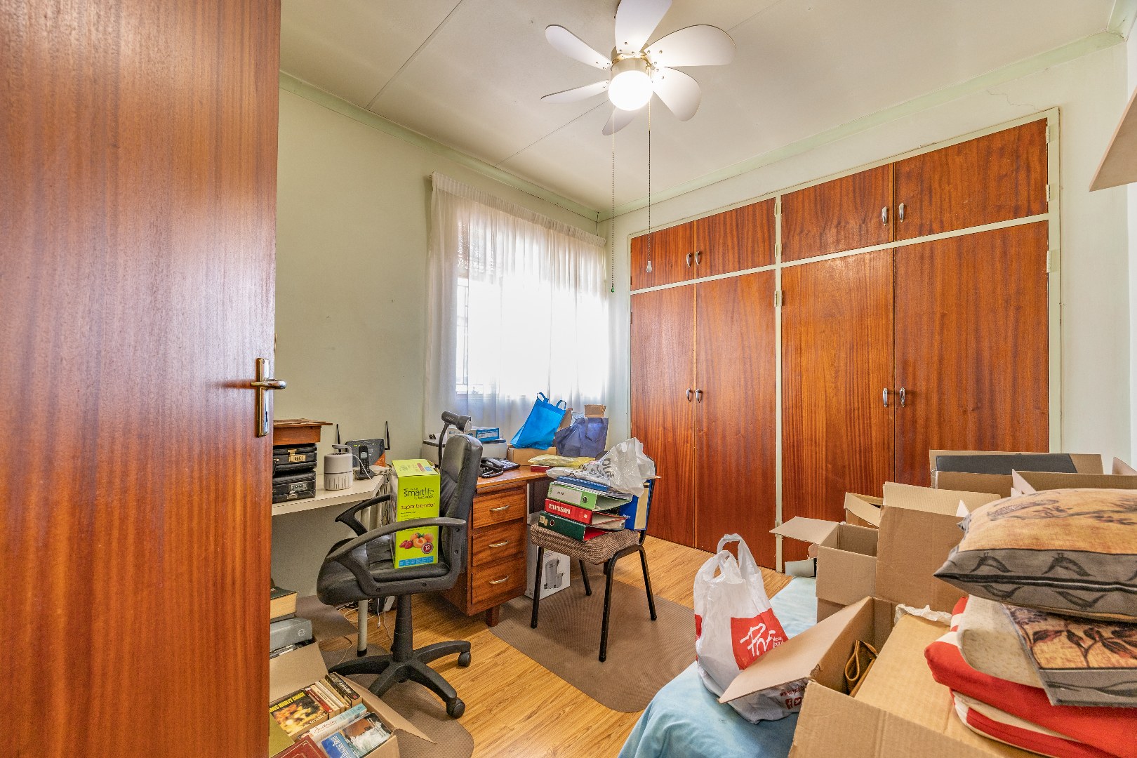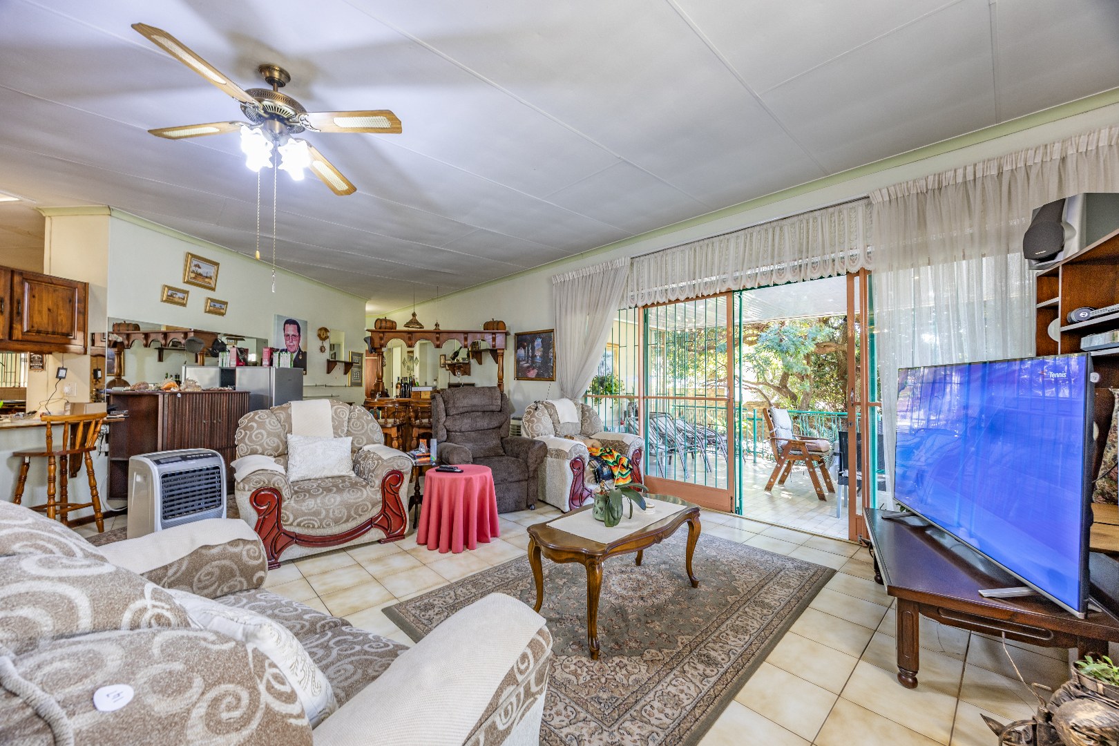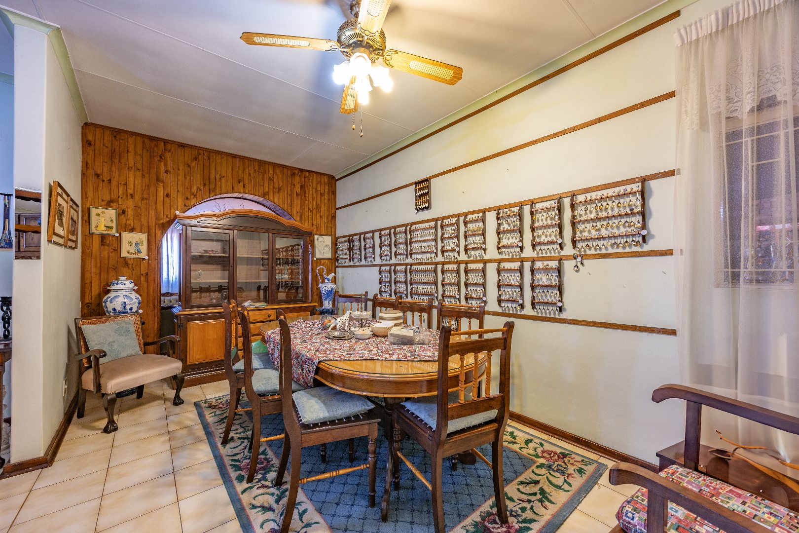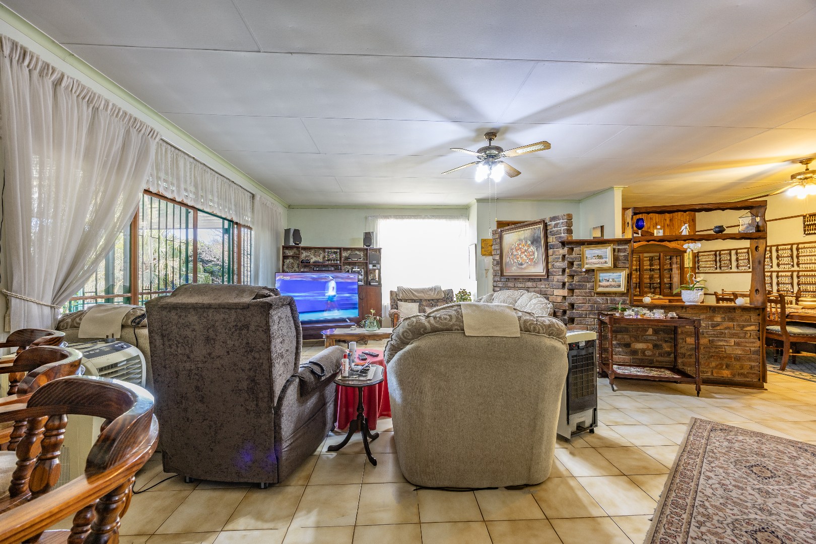 The home opens with an entrance hall and a cosy stoep area, leading to a spacious living room and TV room. The dining area flows to an older-style kitchen, which shows some wear with roof stains and dated finishes but offers great renovation potential. The living room ceiling requires attention, presenting an opportunity to modernize and add value.