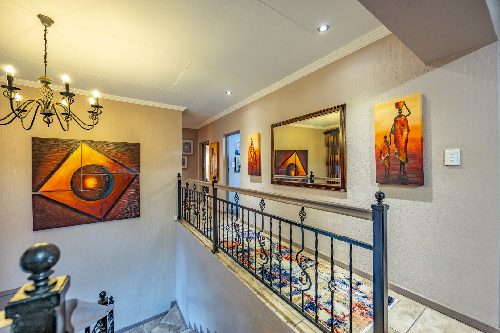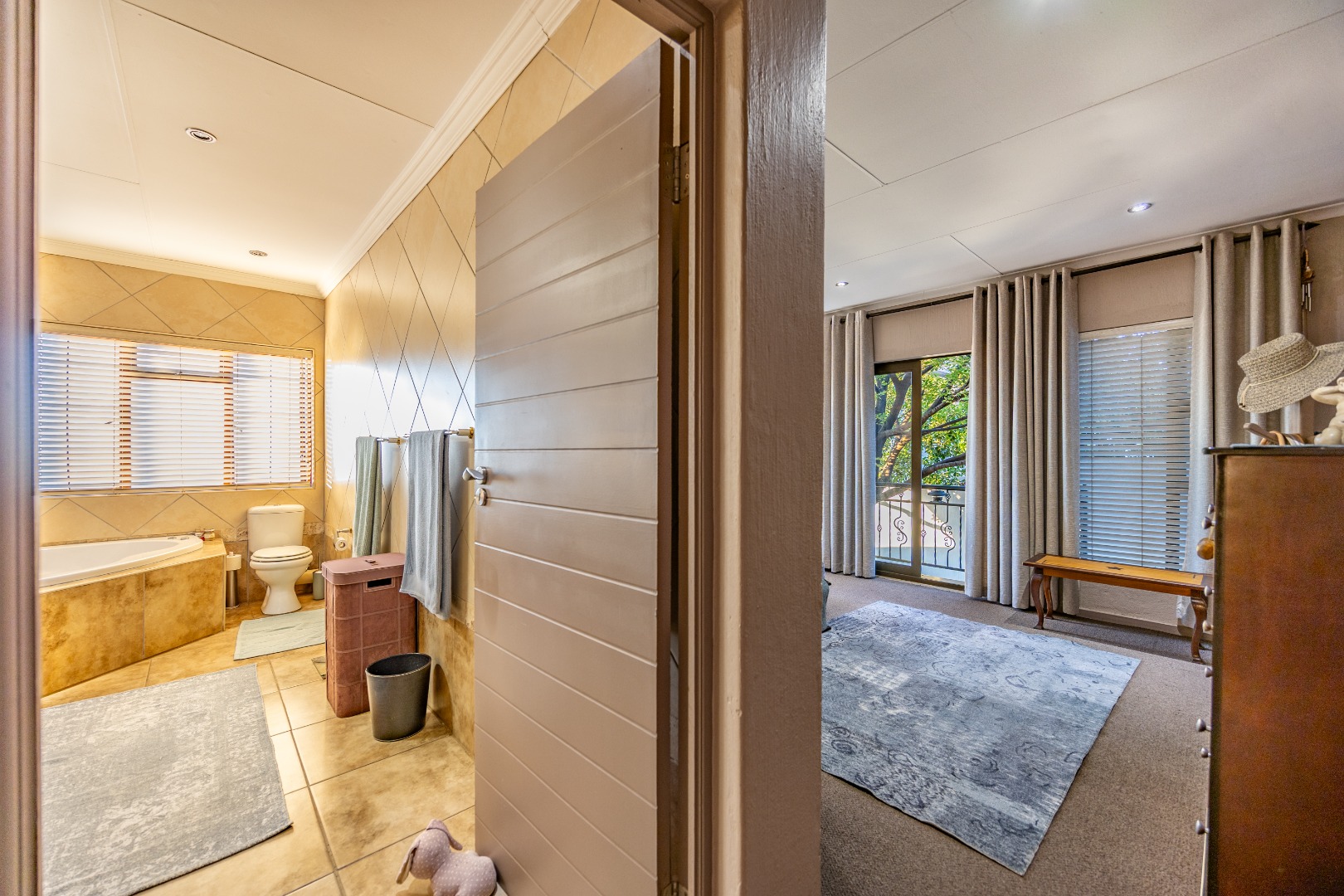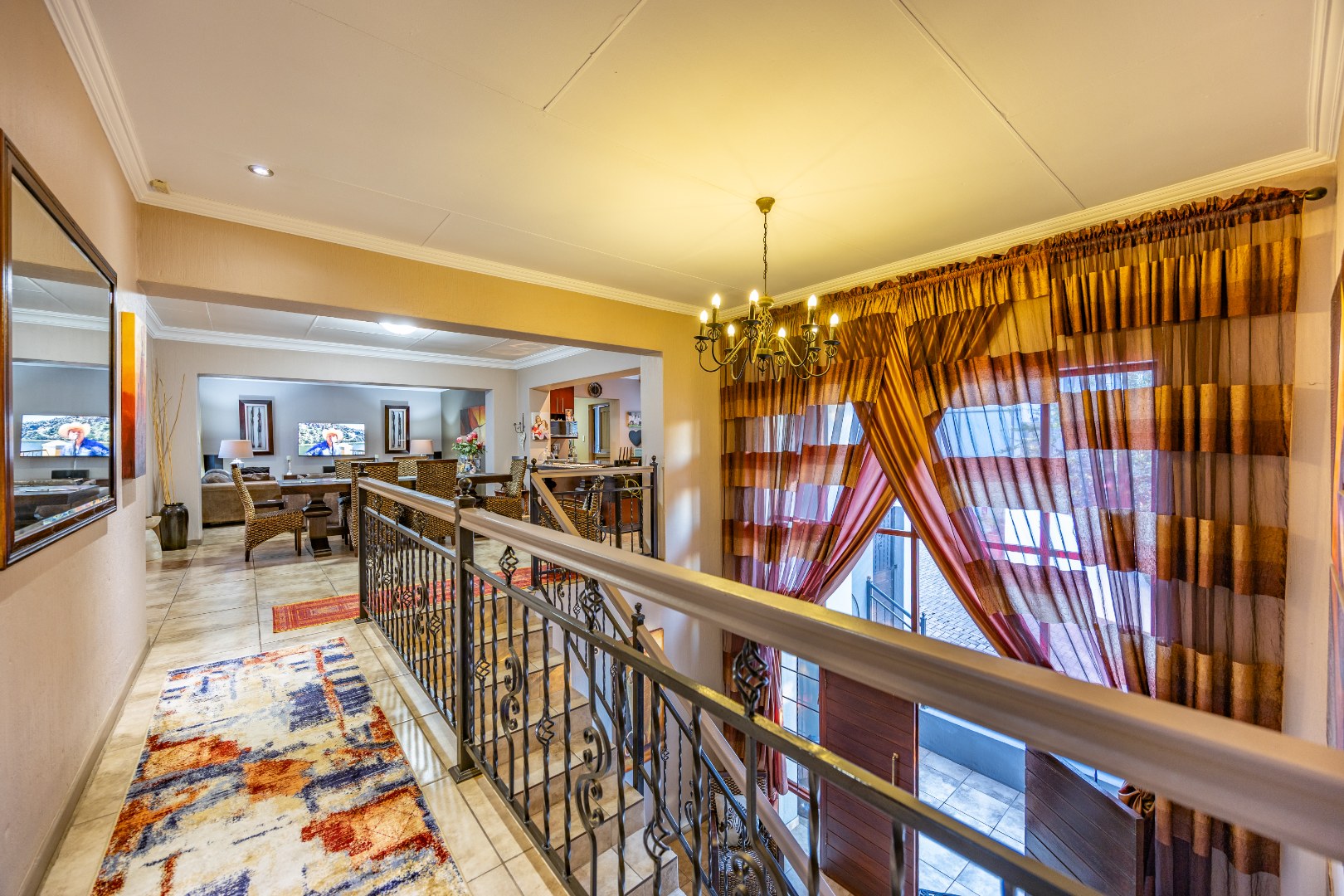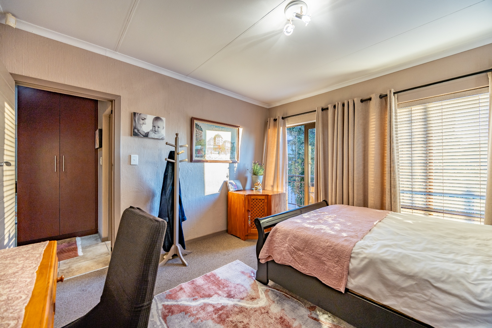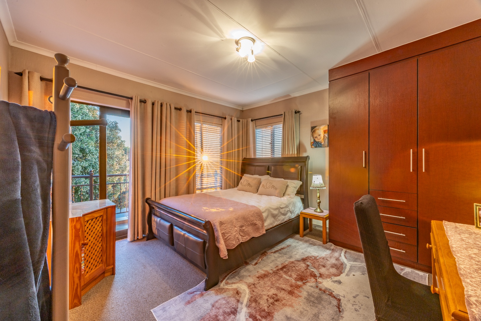 The private bedroom wing is designed with both comfort and luxury in mind. Bedroom 1 features built-in cupboards, offering a cozy yet functional space. Bedroom 2 is a true highlight of the home, boasting the most incredible view from its private balcony, a place to start the day with serenity and end it with reflection as the sun sets over Pretoria. Between the bedrooms, linen cupboards and a full bathroom provide thoughtful practicality. The main bedroom is an indulgent retreat, complete with a jet bath en-suite, ample built-in cupboards, and its own balcony overlooking the magnificent cityscape, offering a perfect sanctuary for rest and rejuvenation. The property also includes staff quarters with a private bathroom, a garden shed, and additional parking for two vehicles, providing both versatility and convenience. Aluminium windows frame the stunning vistas, while wall-mounted exterior lights enhance the home’s charm and elegance at night. This home is far more than a residence — it is a statement of lifestyle within Highlands Estate, combining luxurious living, family-friendly functionality, and panoramic Pretoria views to create a space where memories are made, celebrations are enjoyed, and everyday life is elevated to something truly extraordinary.