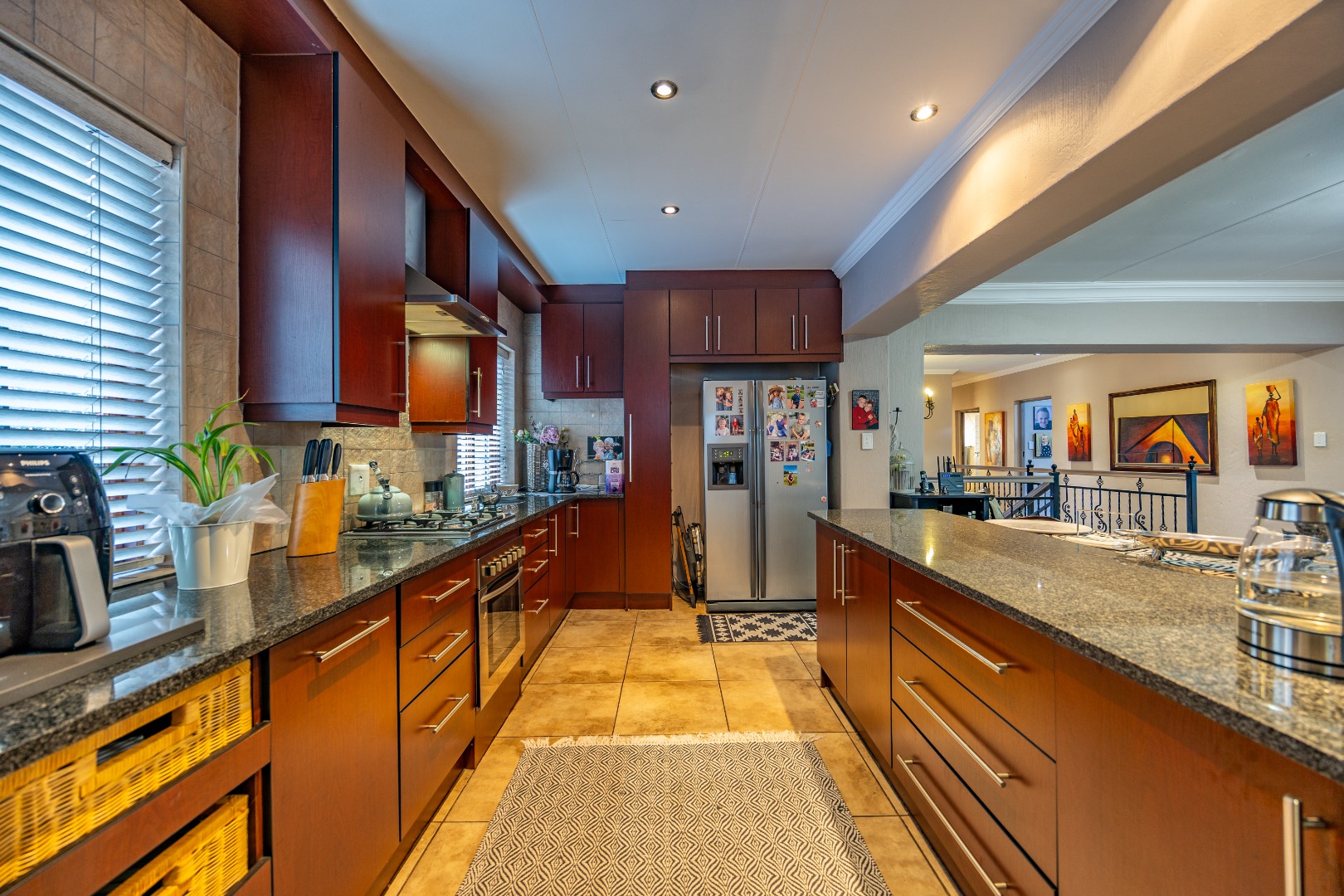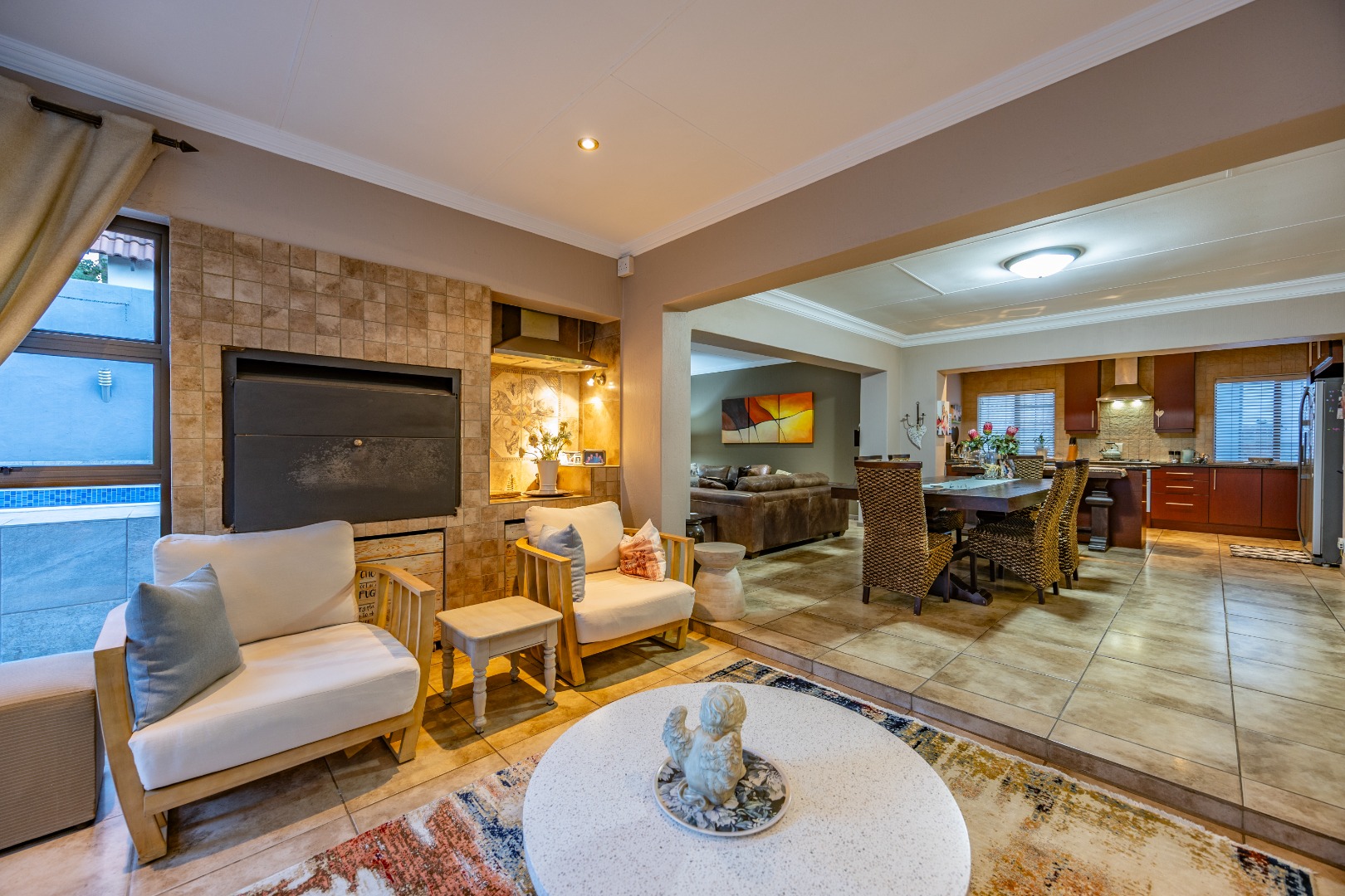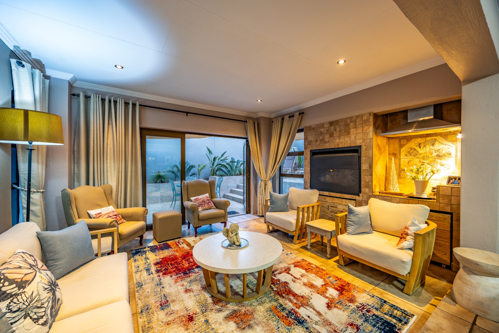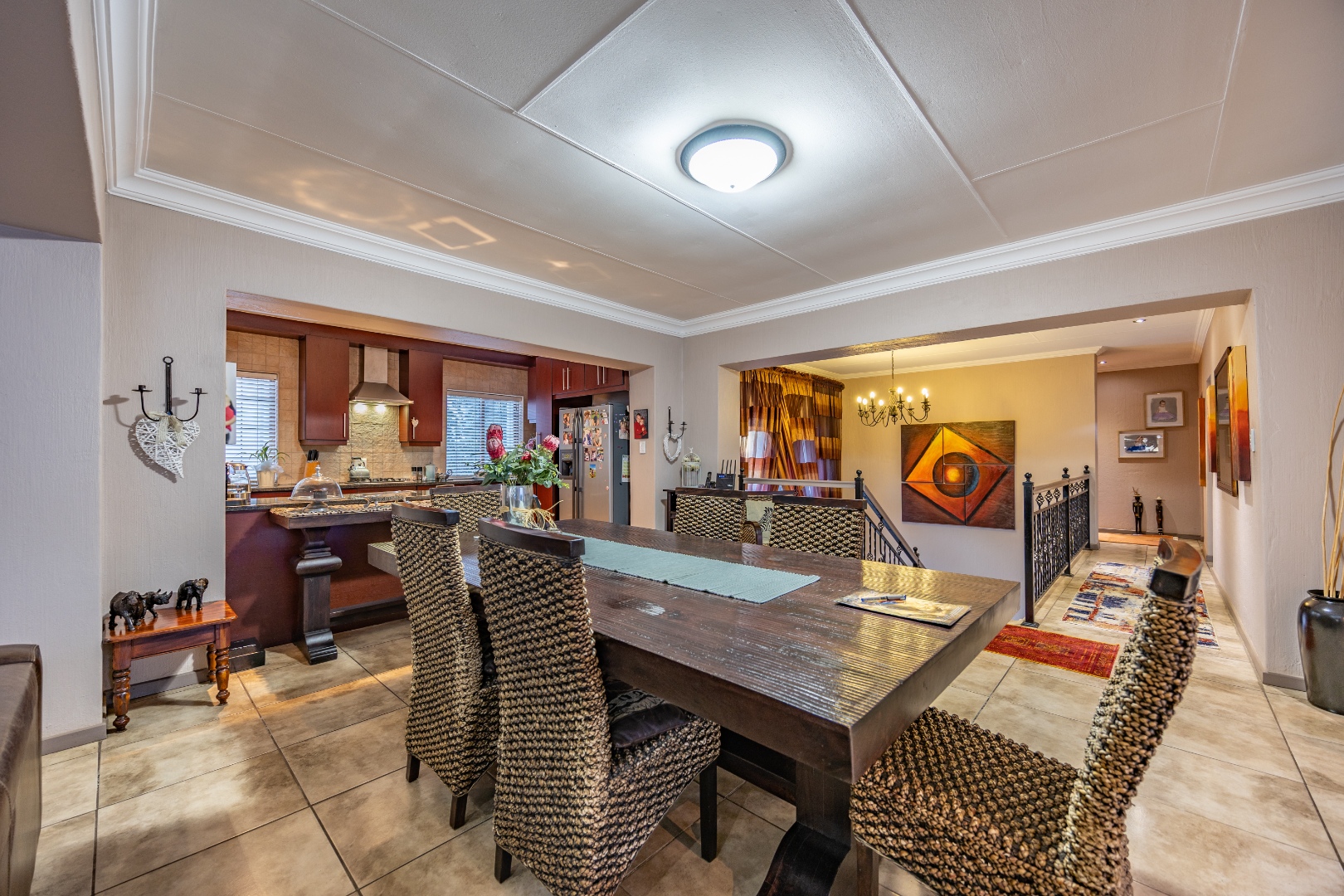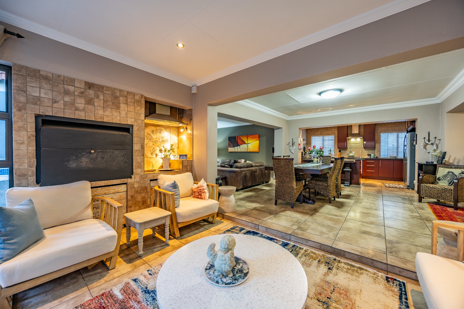 Nestled in the highly sought-after Highlands Estate, this elevated modern family home offers a rare combination of style, comfort, and thoughtful design. From the moment you arrive, the double garage on the ground floor sets the tone, providing convenience while adding to the impressive street presence of the property. Step through the spacious entrance hall and immediately feel a sense of grandeur as the home opens up, guiding you upstairs to the main living level. Here, the flow is effortless, with the kitchen, lounge, and dining area interconnected in an open-plan layout that invites natural light to fill every corner. The kitchen, adorned with granite countertops, a gas stove, and a water connection for your fridge, is designed for both functionality and elegance. Adjacent, the scullery ensures practicality without compromising on aesthetics. Beyond the kitchen, the built-in braai area with folding doors opens to the sparkling swimming pool and sun-soaked terrace, creating a seamless connection between indoors and outdoors. From this vantage point, the home offers breathtaking panoramic views of most of Pretoria, where city lights and natural landscapes blend beautifully, making every gathering, every family moment, and every quiet evening an extraordinary experience.