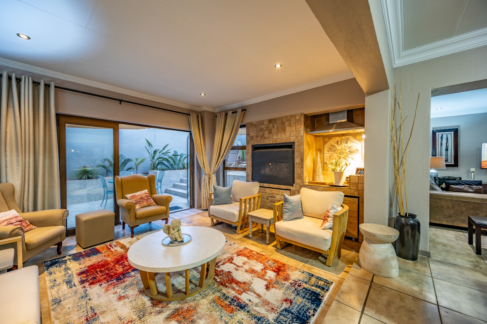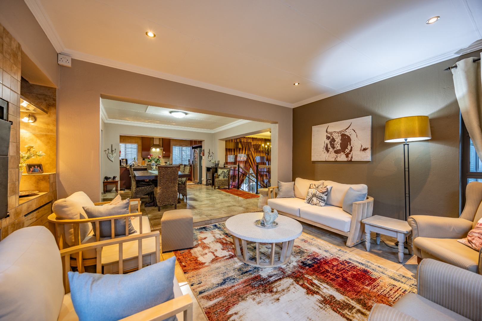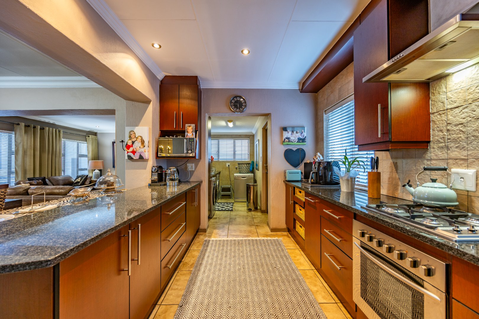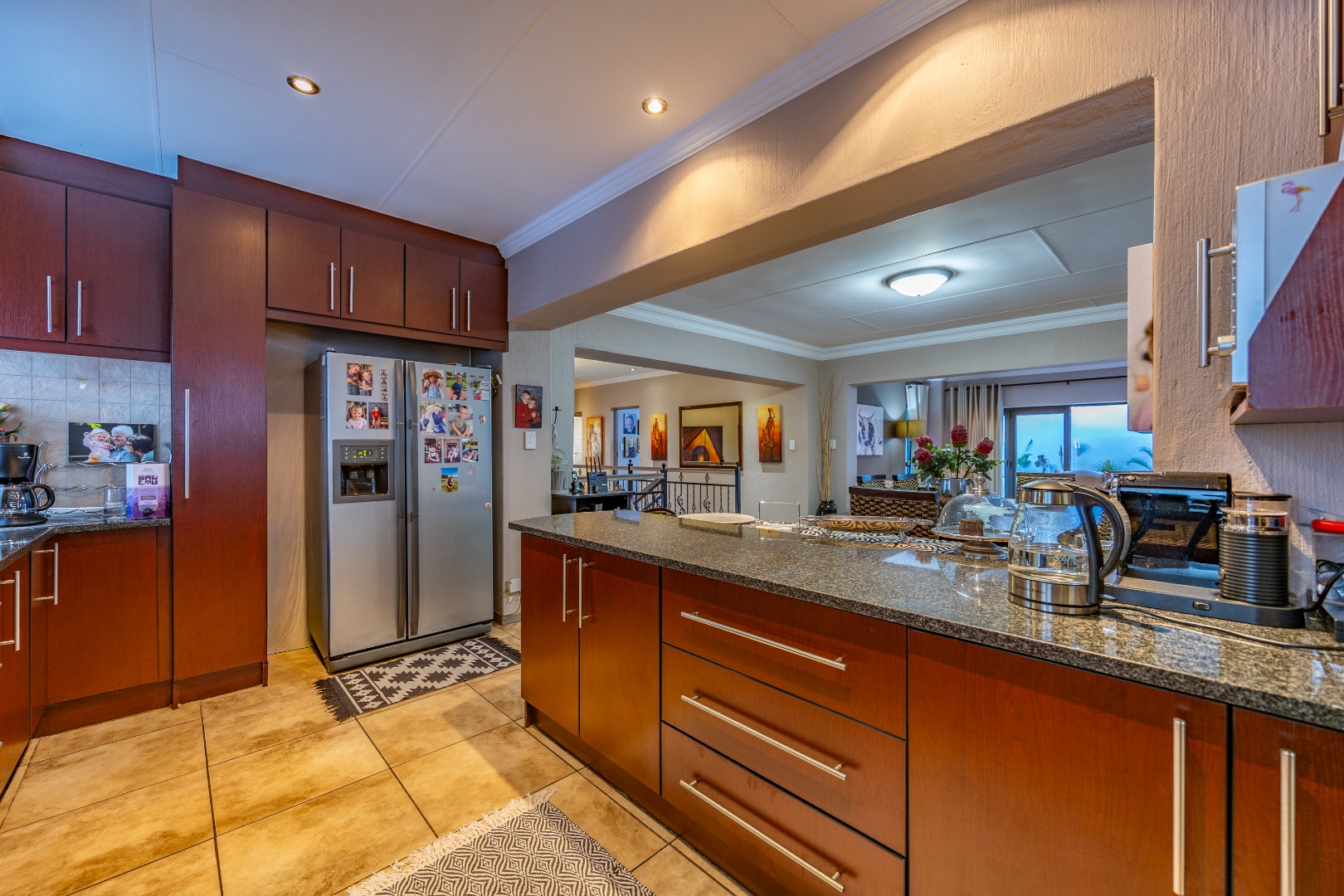 Nestled in the highly sought-after Highlands Estate, this elevated modern family home offers a rare combination of style, comfort, and thoughtful design. From the moment you arrive, the double garage on the ground floor sets the tone, providing convenience while adding to the impressive street presence of the property. Step through the spacious entrance hall and immediately feel a sense of grandeur as the home opens up, guiding you upstairs to the main living level. Here, the flow is effortless, with the kitchen, lounge, and dining area interconnected in an open-plan layout that invites natural light to fill every corner. The kitchen, adorned with granite countertops, a gas stove, and a water connection for your fridge, is designed for both functionality and elegance. Adjacent, the scullery ensures practicality without compromising on aesthetics. Beyond the kitchen, the built-in braai area with folding doors opens to the sparkling swimming pool and sun-soaked terrace, creating a seamless connection between indoors and outdoors. From this vantage point, the home offers breathtaking panoramic views of most of Pretoria, where city lights and natural landscapes blend beautifully, making every gathering, every family moment, and every quiet evening an extraordinary experience.