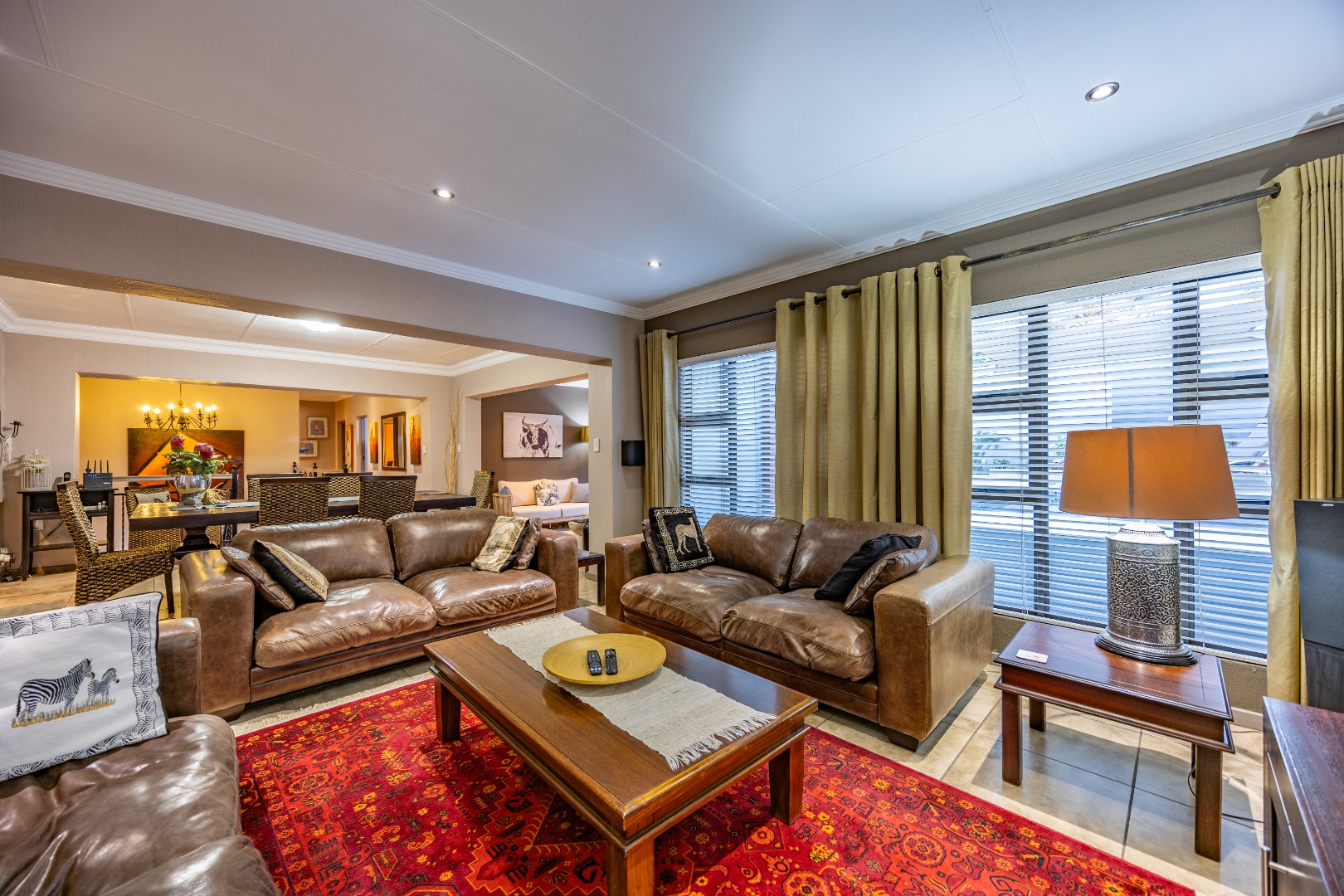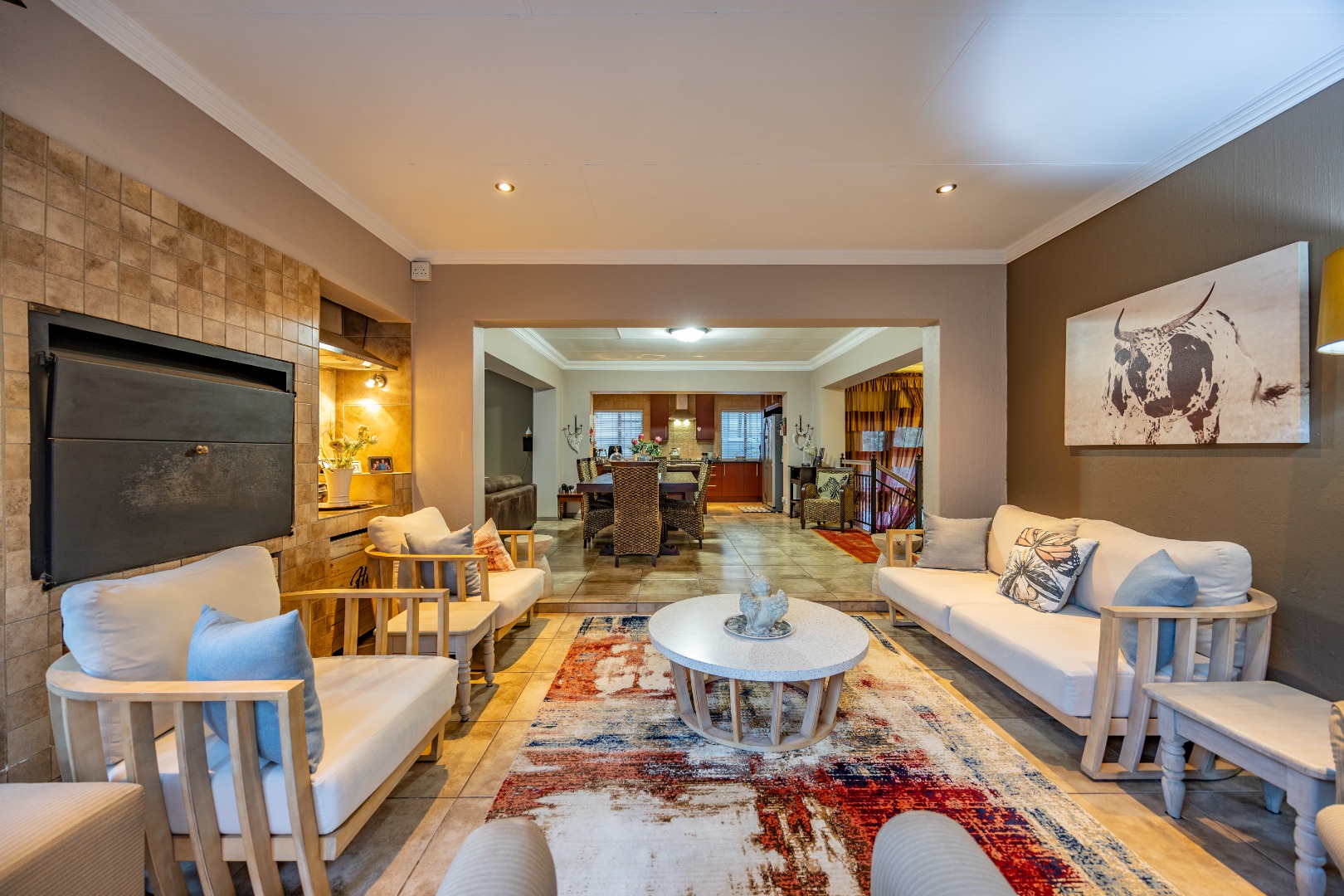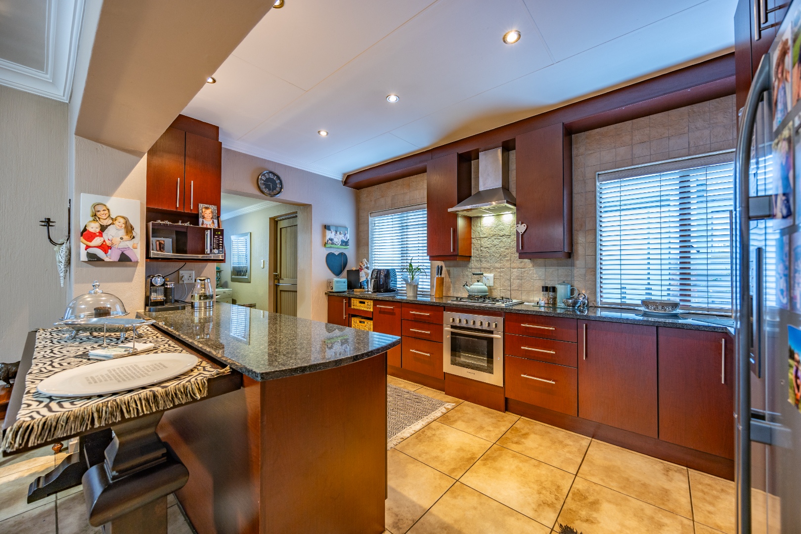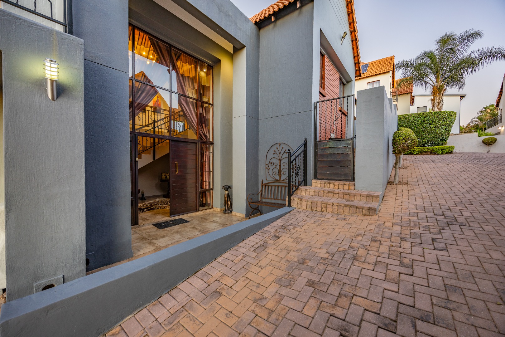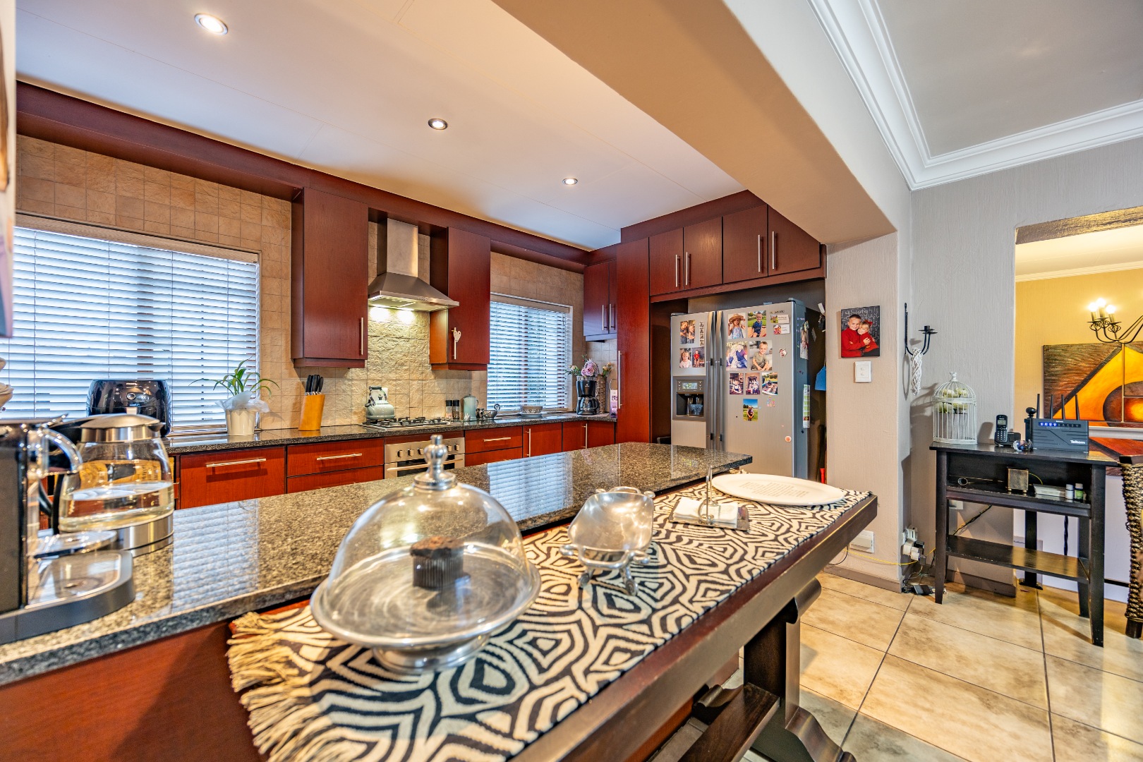 Nestled in the highly sought-after Highlands Estate, this elevated modern family home offers a rare combination of style, comfort, and thoughtful design. From the moment you arrive, the double garage on the ground floor sets the tone, providing convenience while adding to the impressive street presence of the property. Step through the spacious entrance hall and immediately feel a sense of grandeur as the home opens up, guiding you upstairs to the main living level. Here, the flow is effortless, with the kitchen, lounge, and dining area interconnected in an open-plan layout that invites natural light to fill every corner. The kitchen, adorned with granite countertops, a gas stove, and a water connection for your fridge, is designed for both functionality and elegance. Adjacent, the scullery ensures practicality without compromising on aesthetics. Beyond the kitchen, the built-in braai area with folding doors opens to the sparkling swimming pool and sun-soaked terrace, creating a seamless connection between indoors and outdoors. From this vantage point, the home offers breathtaking panoramic views of most of Pretoria, where city lights and natural landscapes blend beautifully, making every gathering, every family moment, and every quiet evening an extraordinary experience.