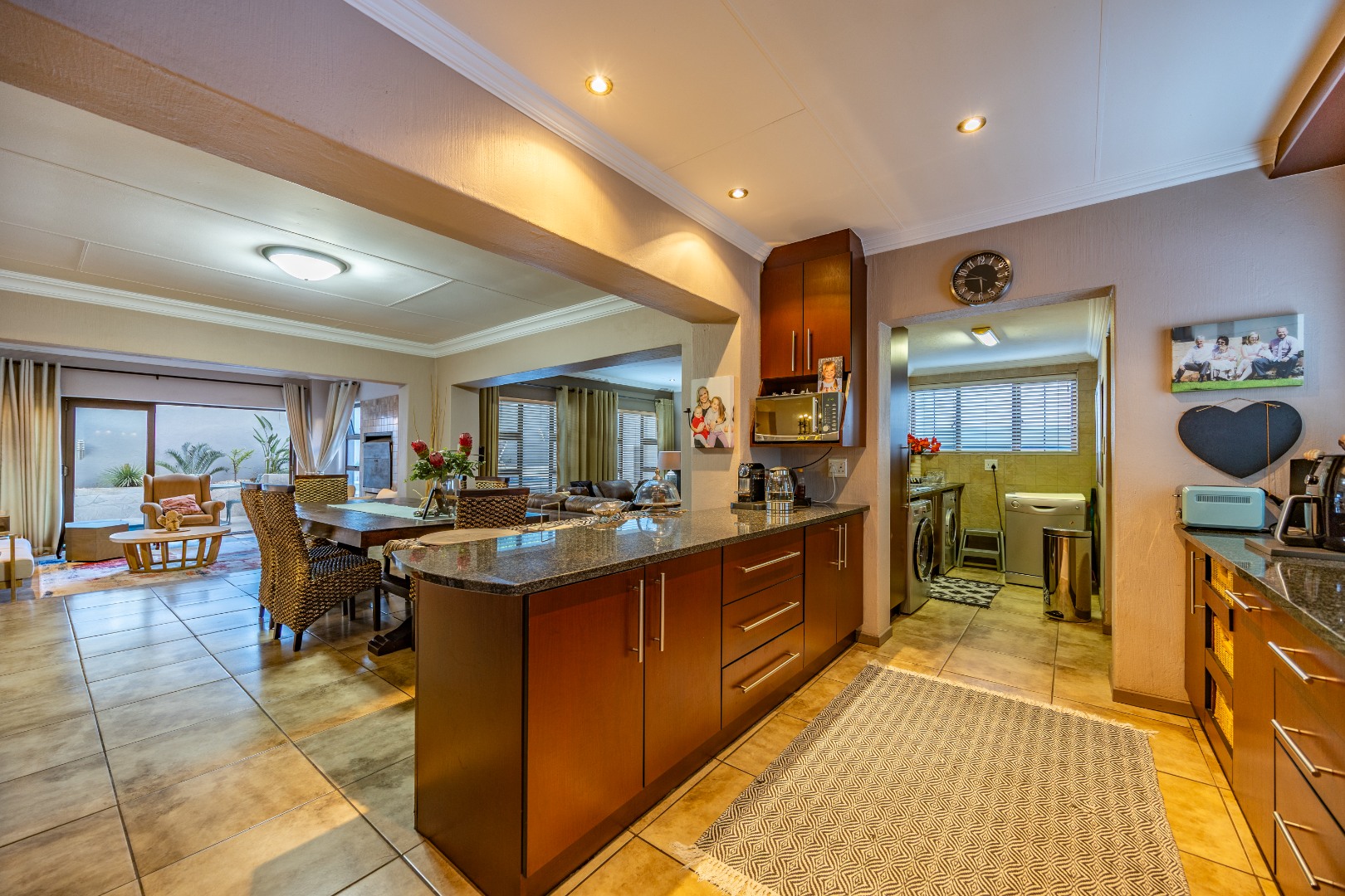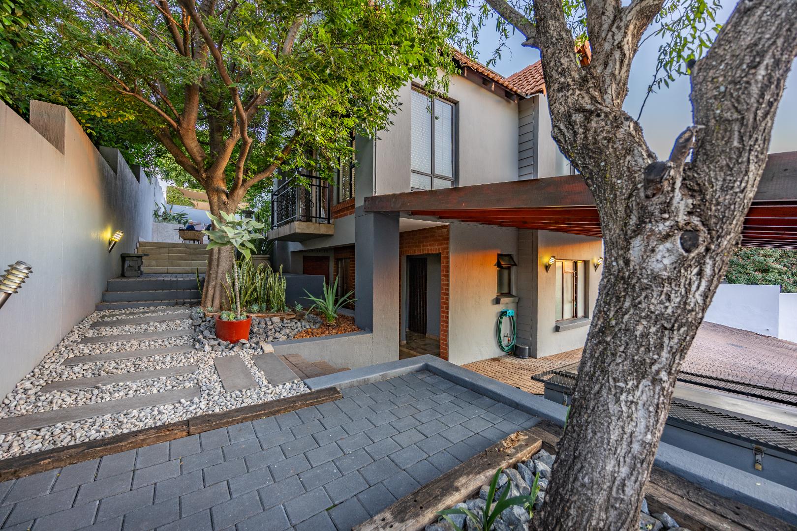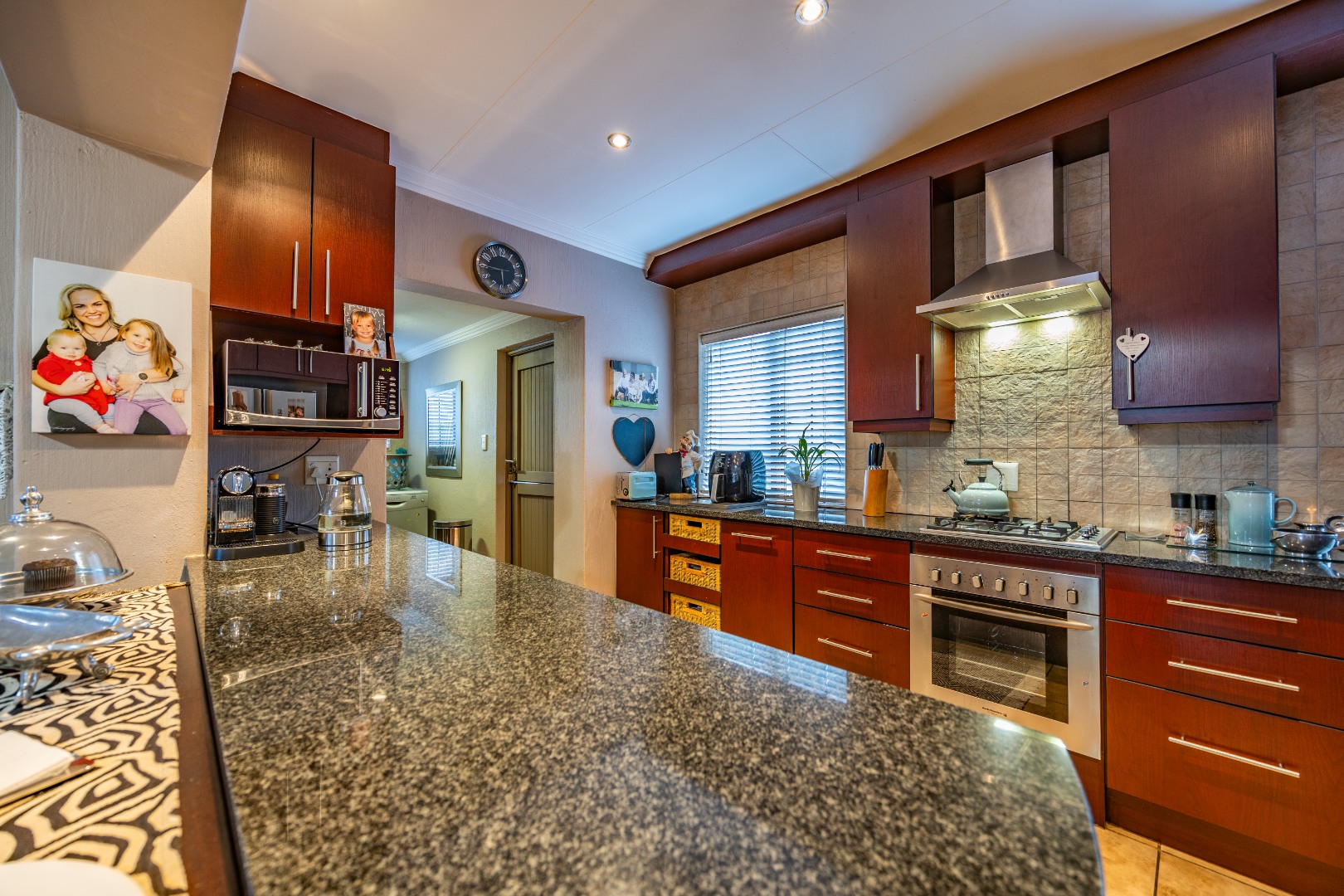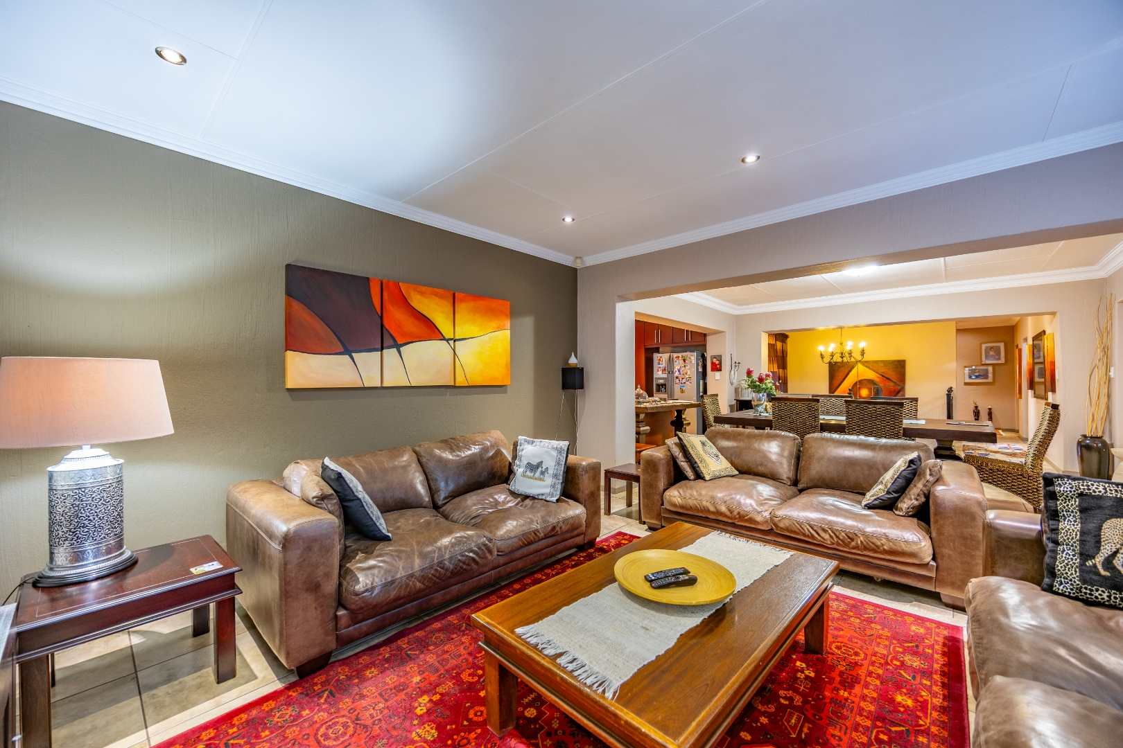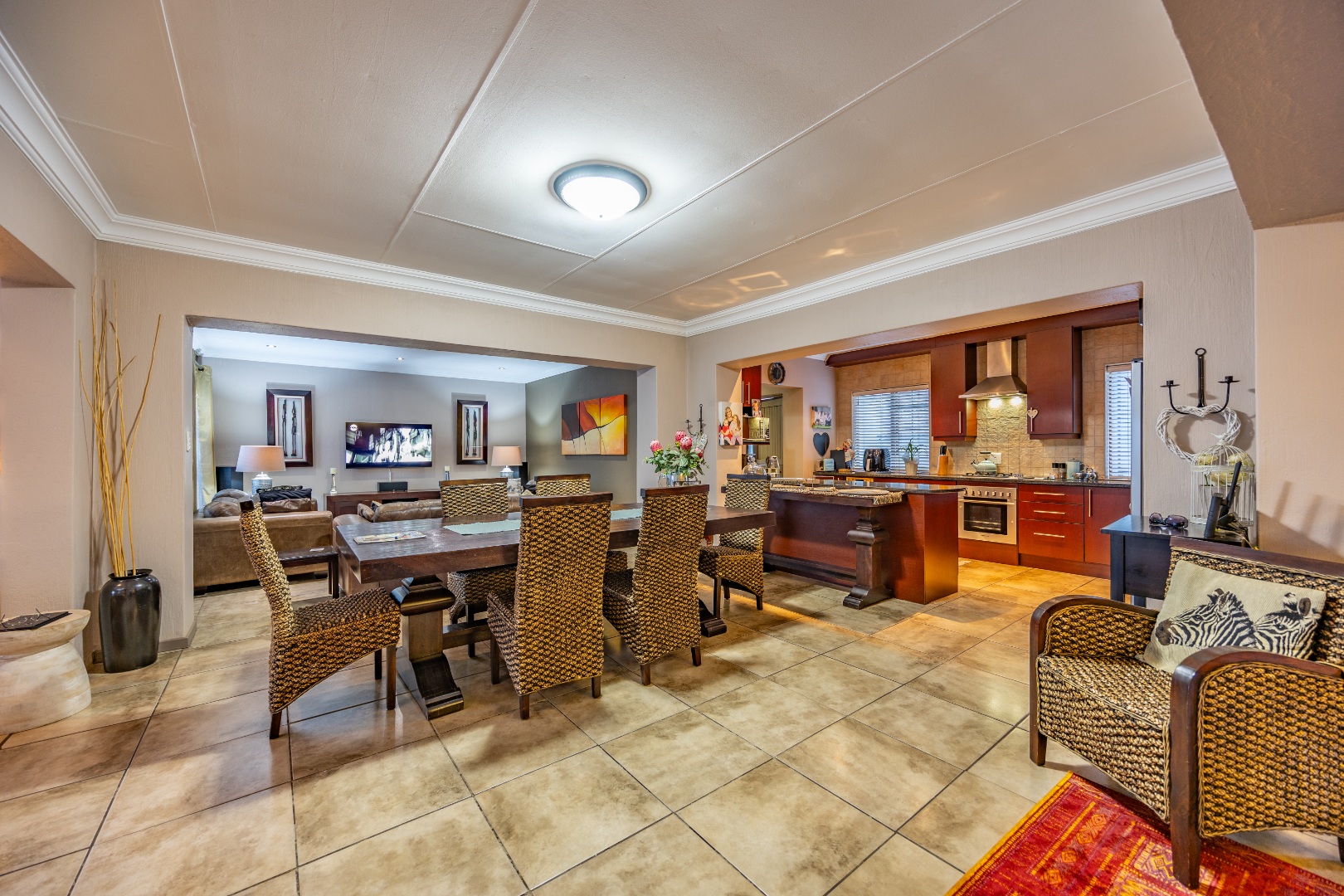 Nestled in the highly sought-after Highlands Estate, this elevated modern family home offers a rare combination of style, comfort, and thoughtful design. From the moment you arrive, the double garage on the ground floor sets the tone, providing convenience while adding to the impressive street presence of the property. Step through the spacious entrance hall and immediately feel a sense of grandeur as the home opens up, guiding you upstairs to the main living level. Here, the flow is effortless, with the kitchen, lounge, and dining area interconnected in an open-plan layout that invites natural light to fill every corner. The kitchen, adorned with granite countertops, a gas stove, and a water connection for your fridge, is designed for both functionality and elegance. Adjacent, the scullery ensures practicality without compromising on aesthetics. Beyond the kitchen, the built-in braai area with folding doors opens to the sparkling swimming pool and sun-soaked terrace, creating a seamless connection between indoors and outdoors. From this vantage point, the home offers breathtaking panoramic views of most of Pretoria, where city lights and natural landscapes blend beautifully, making every gathering, every family moment, and every quiet evening an extraordinary experience.