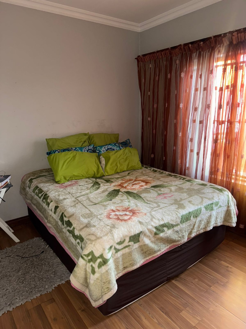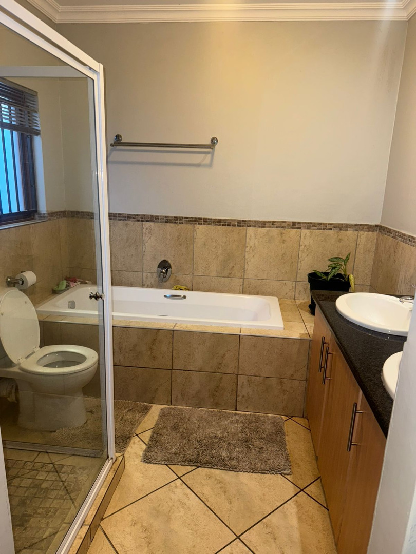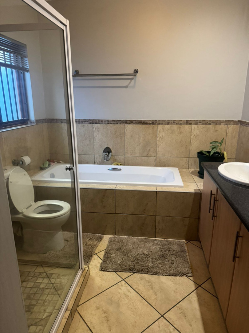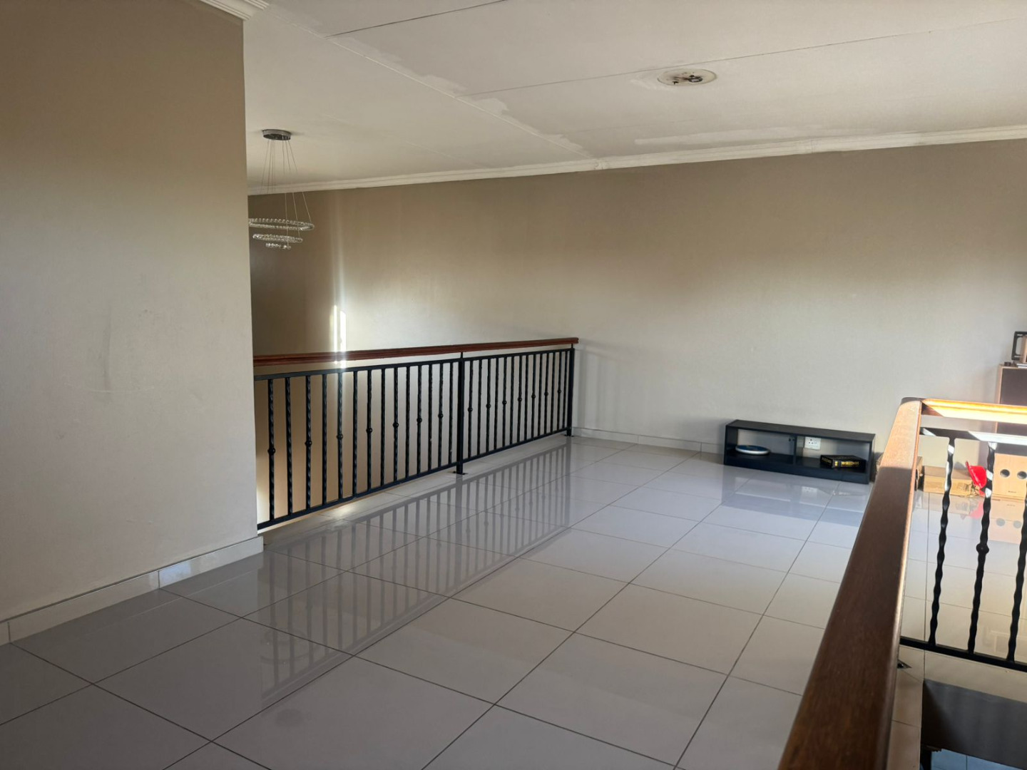 Upstairs, a comfortable pyjama lounge leads to two more bedrooms—both with laminated flooring and built-in cupboards. The main bedroom is generously sized, offering plenty of cupboard space and a full en-suite bathroom featuring a double basin, shower, bath, and toilet.