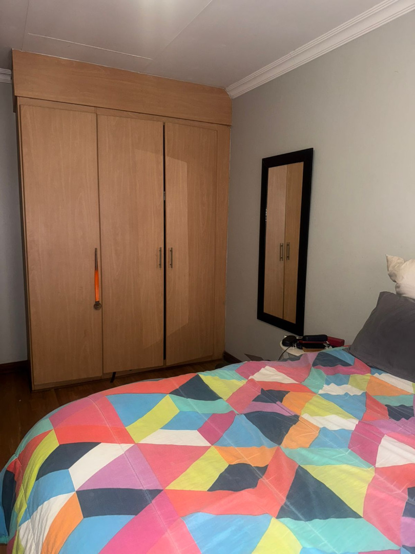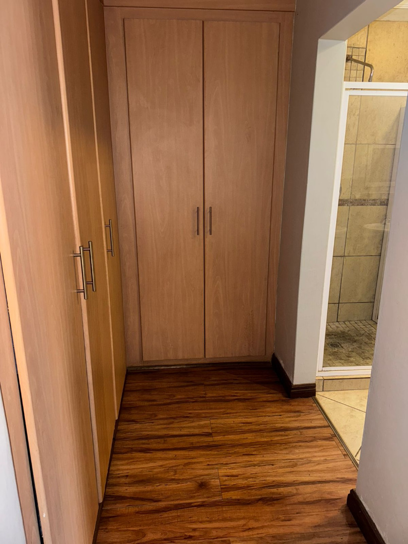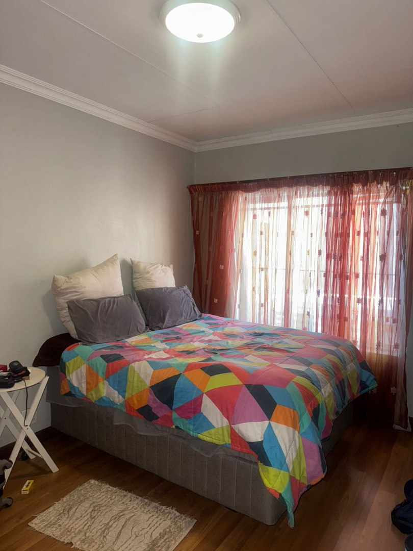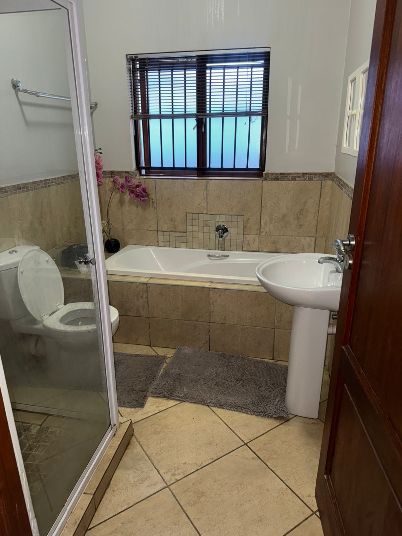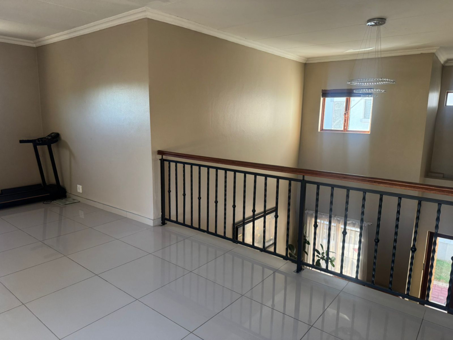 Upstairs, a comfortable pyjama lounge leads to two more bedrooms—both with laminated flooring and built-in cupboards. The main bedroom is generously sized, offering plenty of cupboard space and a full en-suite bathroom featuring a double basin, shower, bath, and toilet.