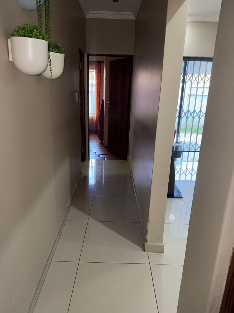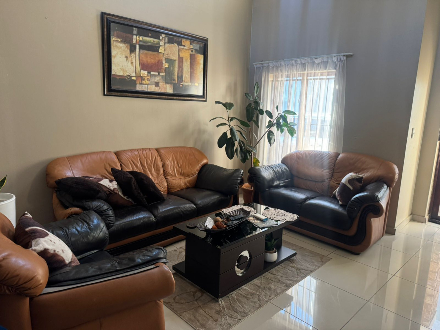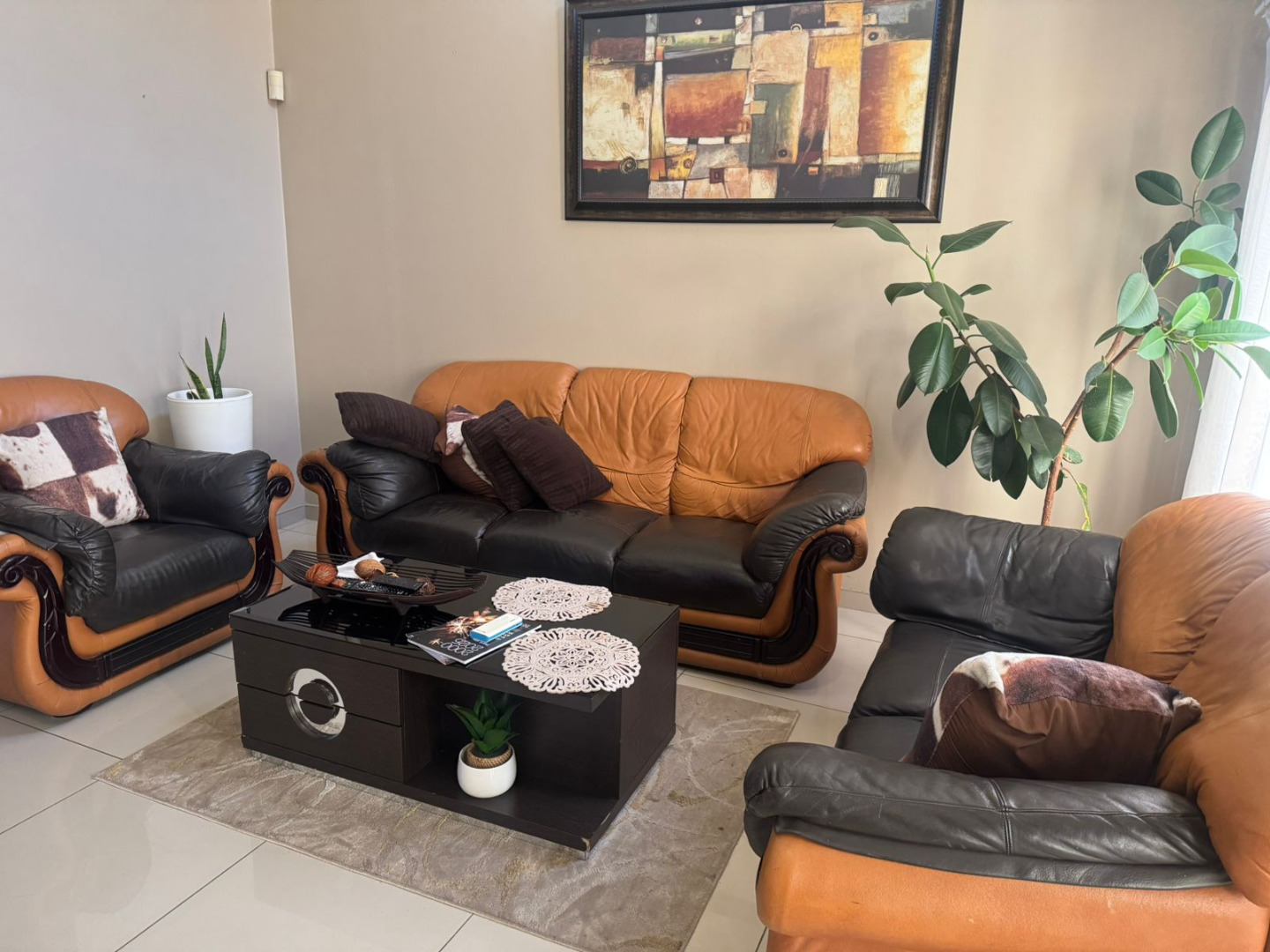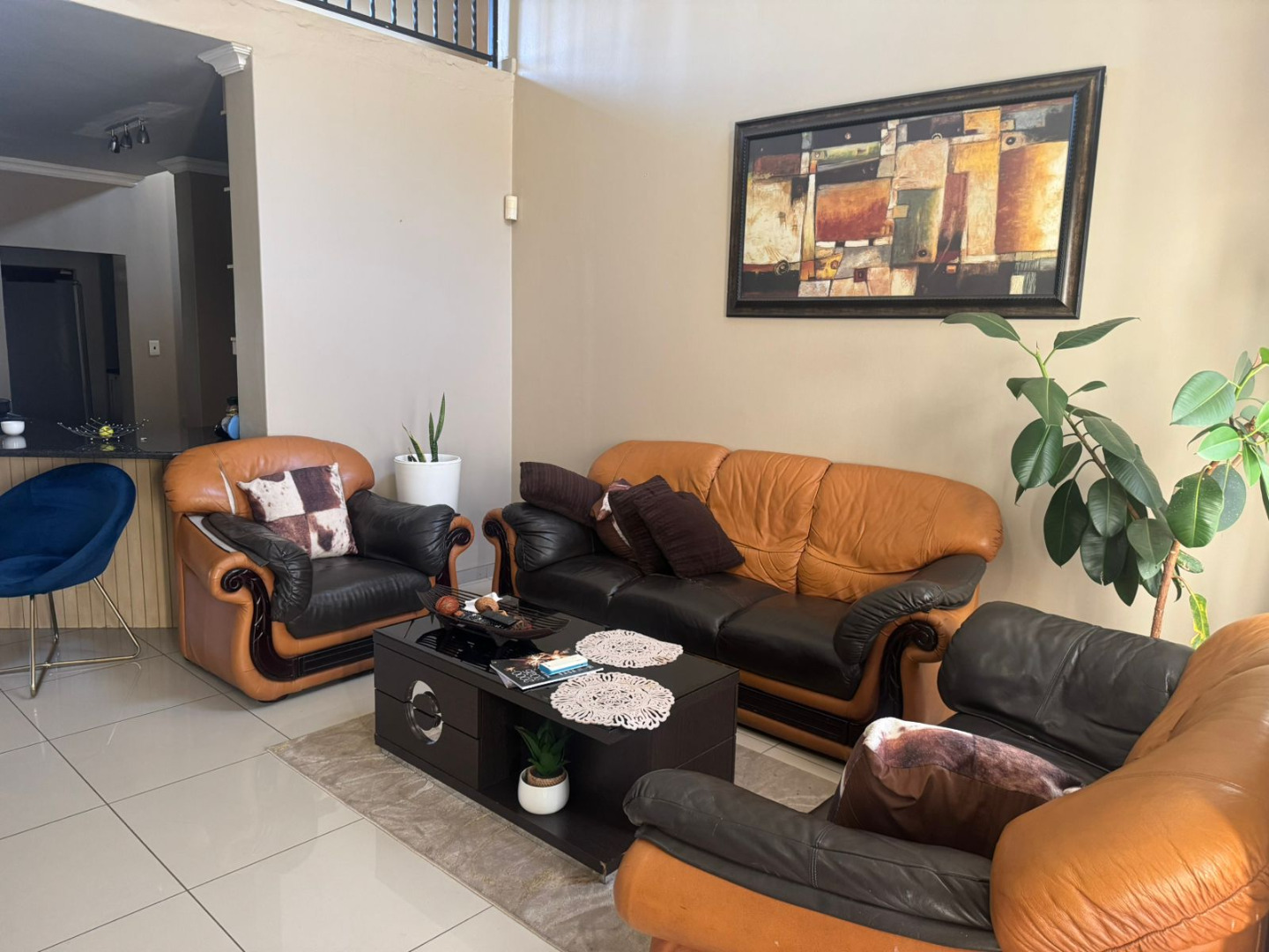 Upstairs, a comfortable pyjama lounge leads to two more bedrooms—both with laminated flooring and built-in cupboards. The main bedroom is generously sized, offering plenty of cupboard space and a full en-suite bathroom featuring a double basin, shower, bath, and toilet.
