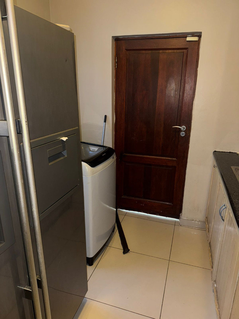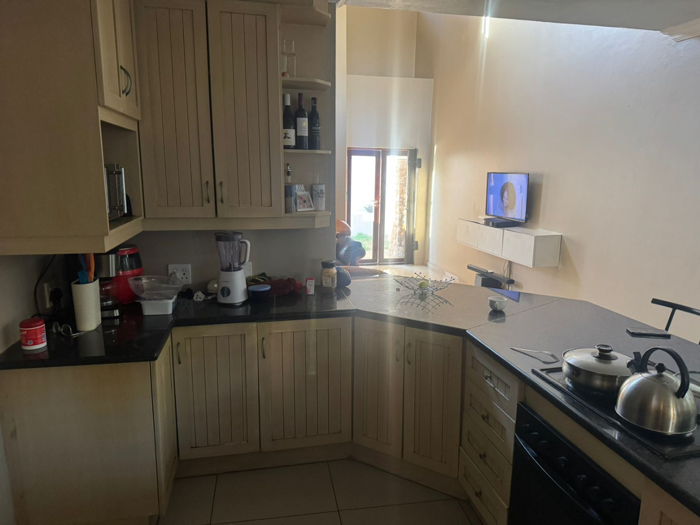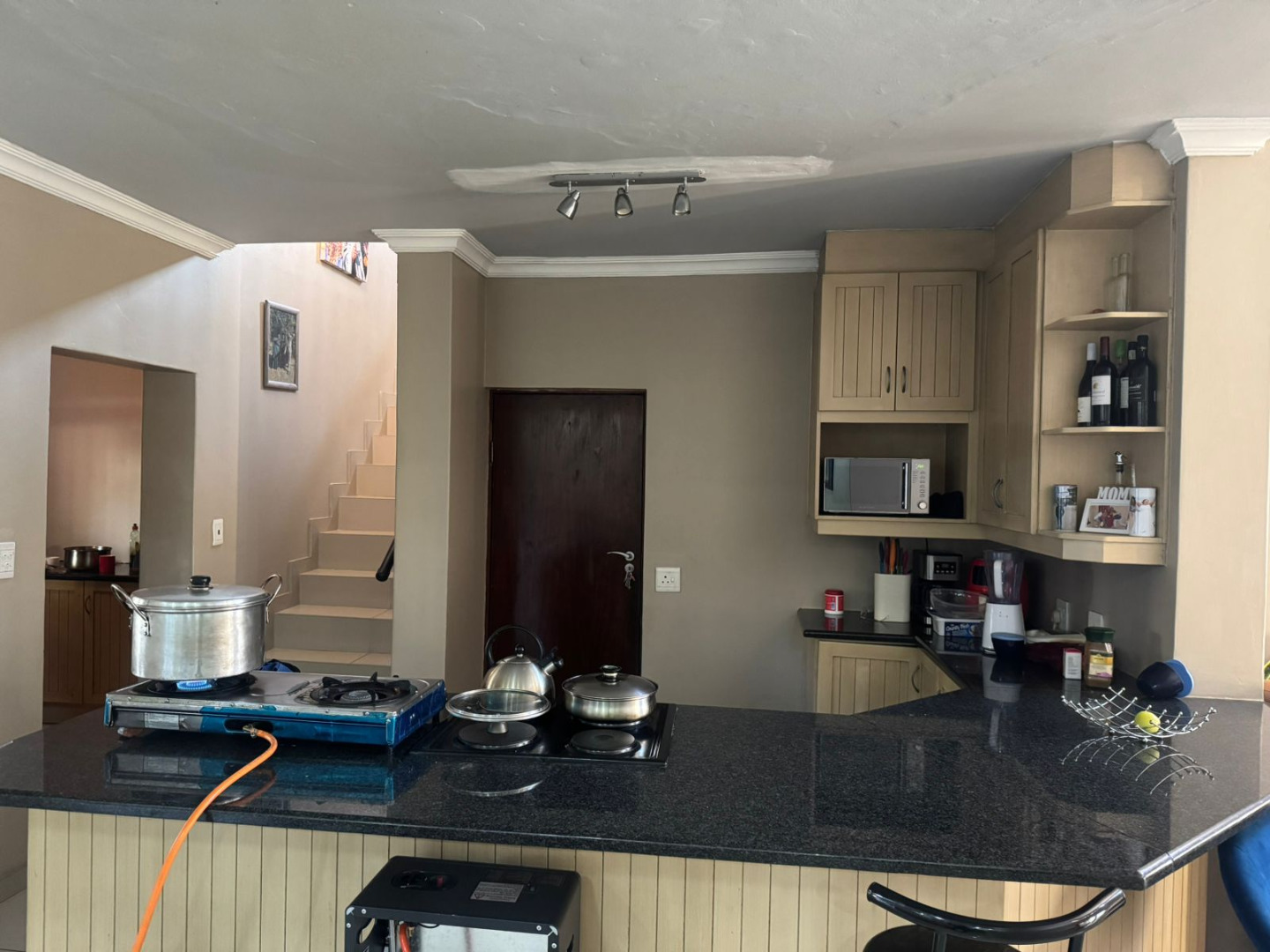 Inside, the open-plan kitchen flows to the dining area and out to the garden via sliding doors. There's a separate scullery with space for appliances, a welcoming TV lounge, and a ground-floor bedroom with built-in cupboards, serviced by a full bathroom with shower, basin, and toilet. Domestic quarters with their own shower and toilet can be accessed from both inside the garage and outside.