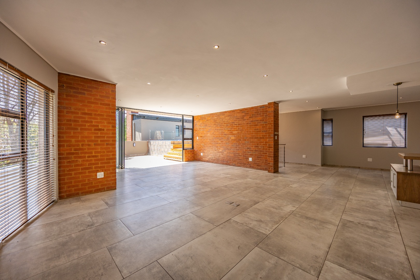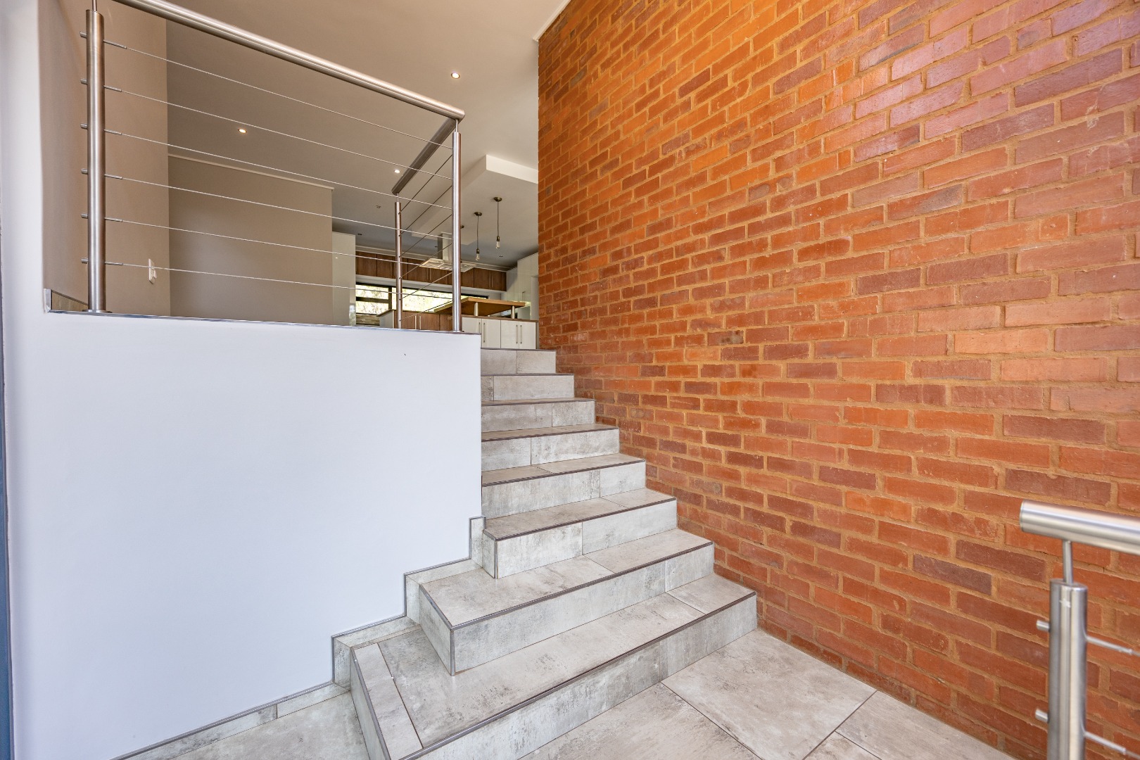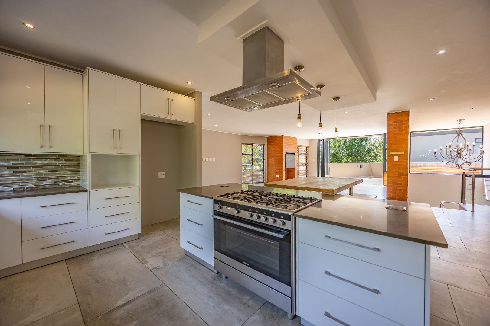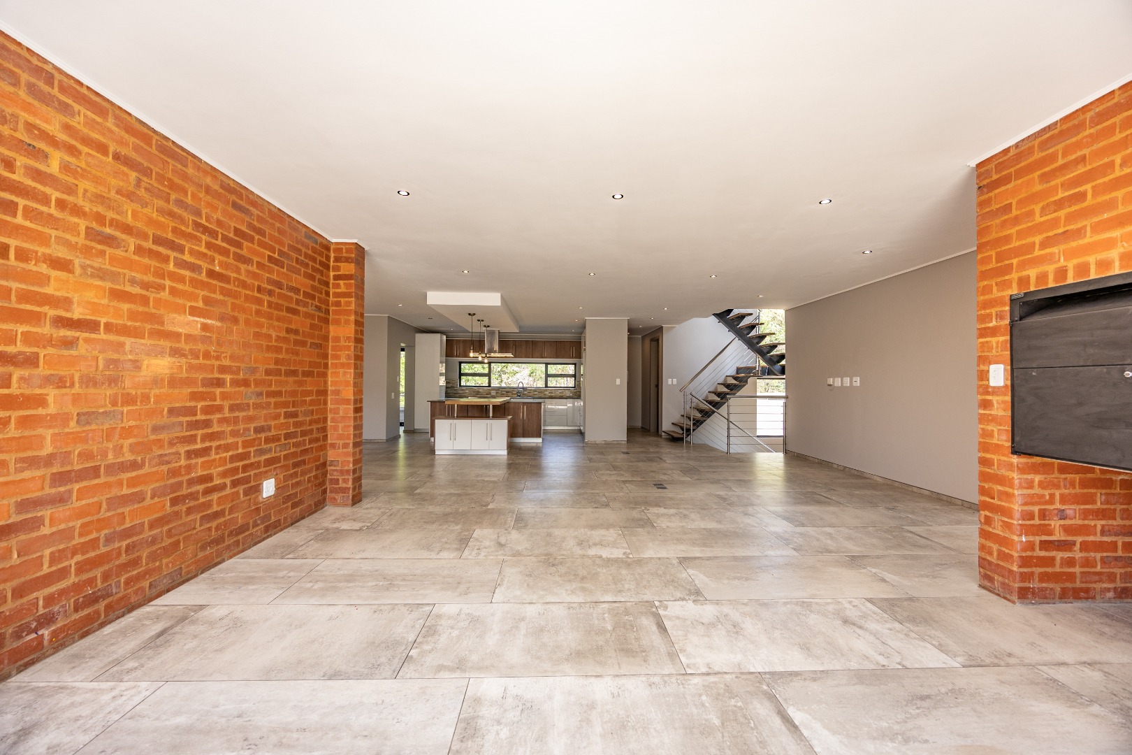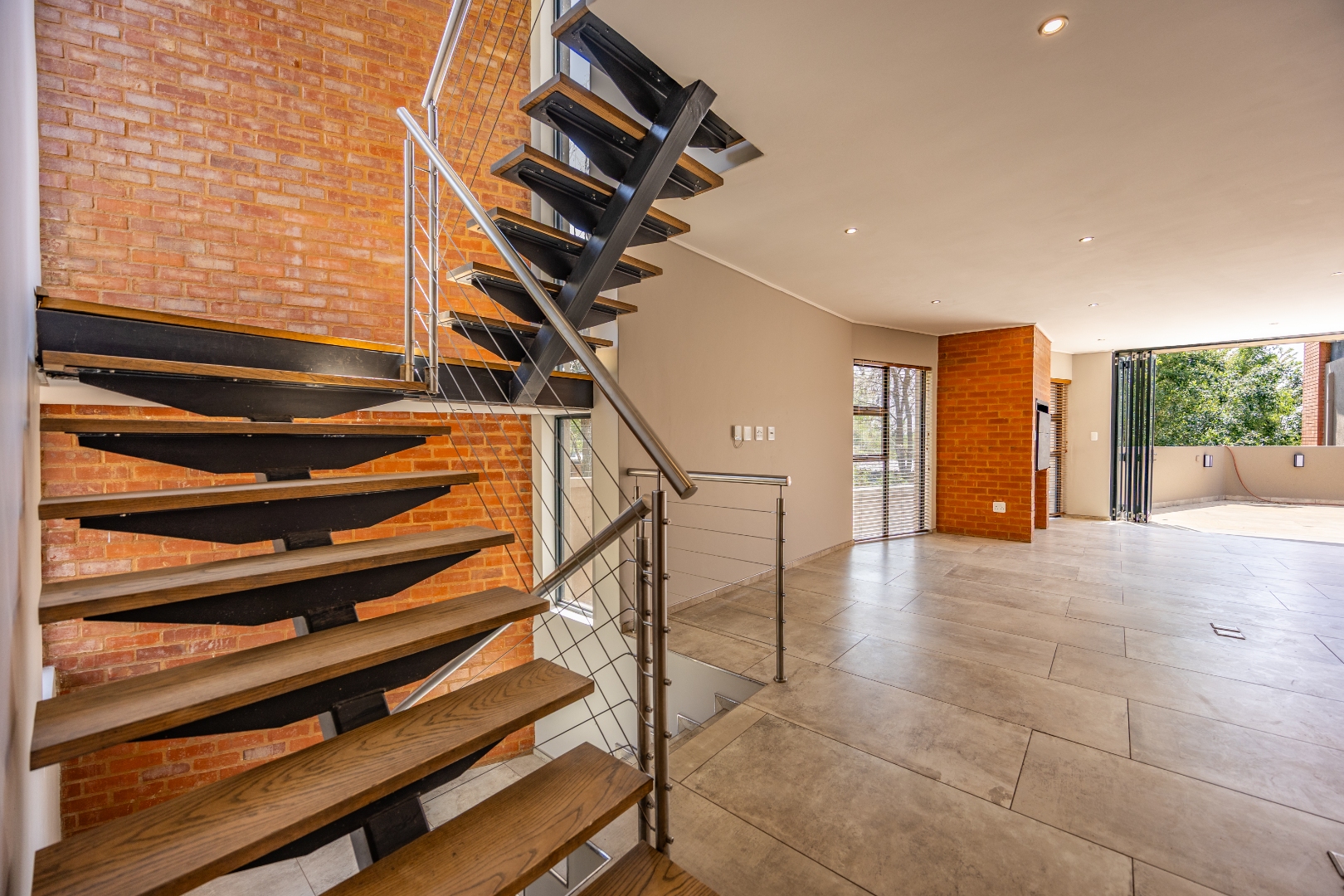 The main floor features an inviting entrance hall that opens into a spacious open-plan living area. Here, the dining room, lounge, and enclosed braai area flow effortlessly together, creating a versatile space for family gatherings or entertaining. A contemporary kitchen with a separate scullery completes the picture.
