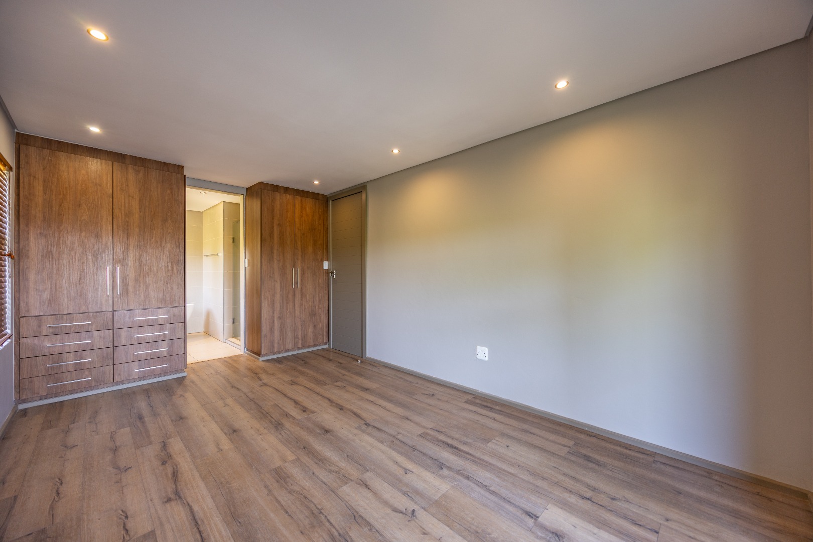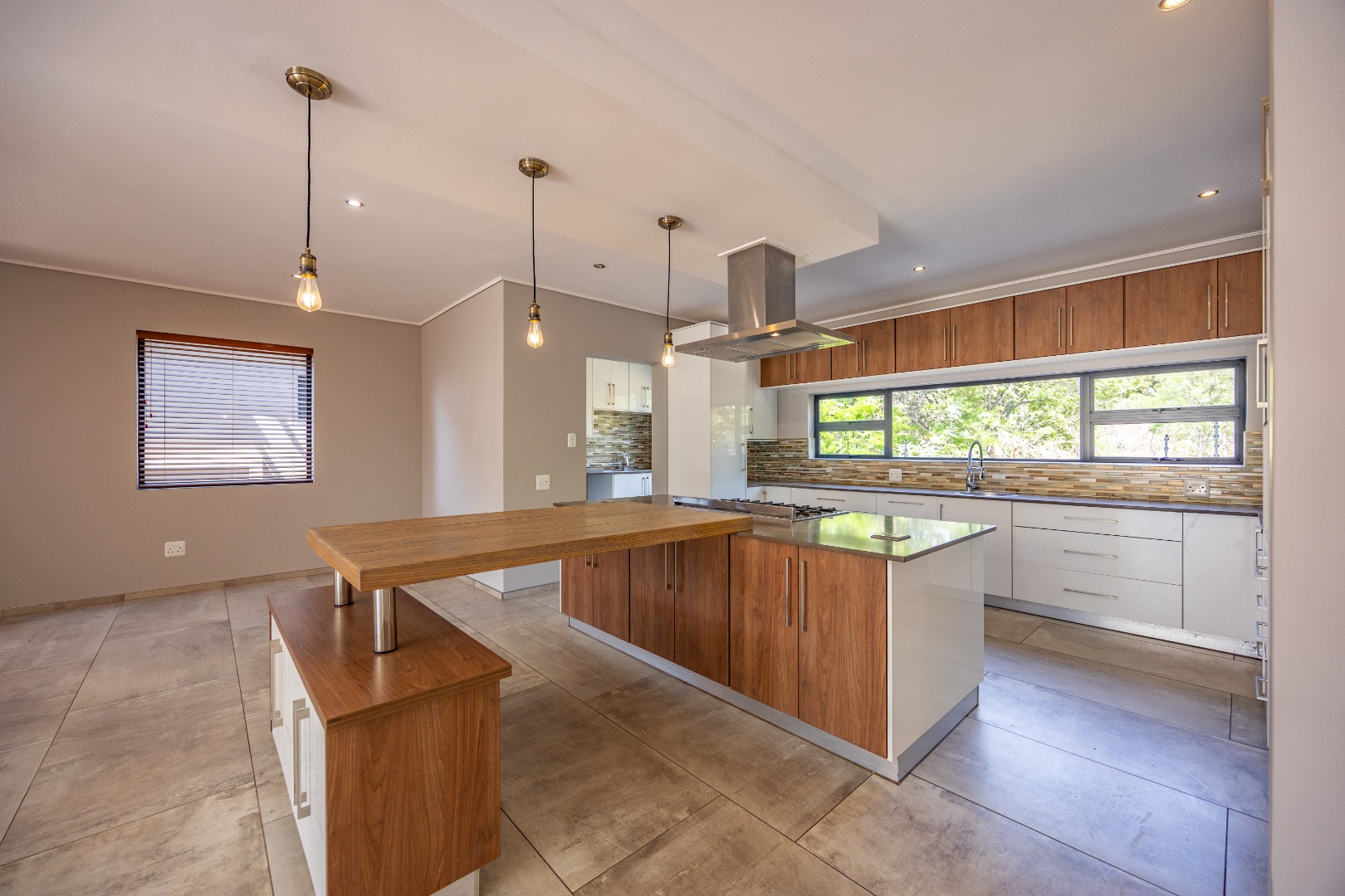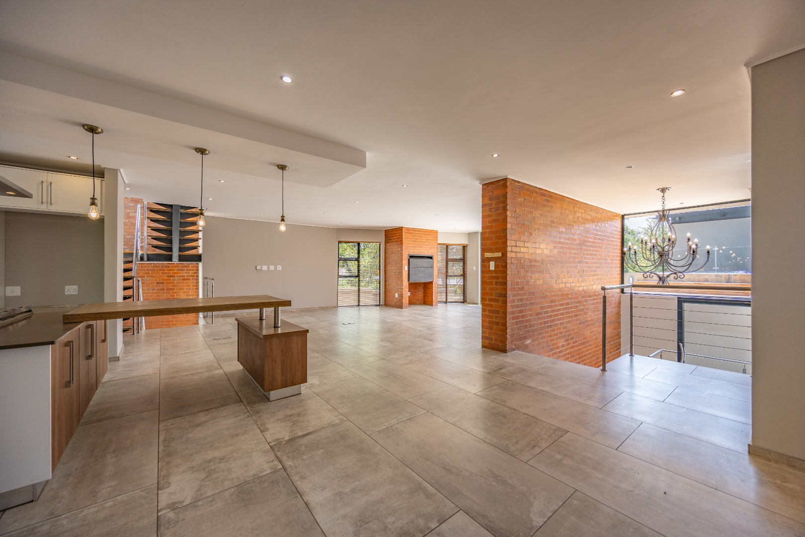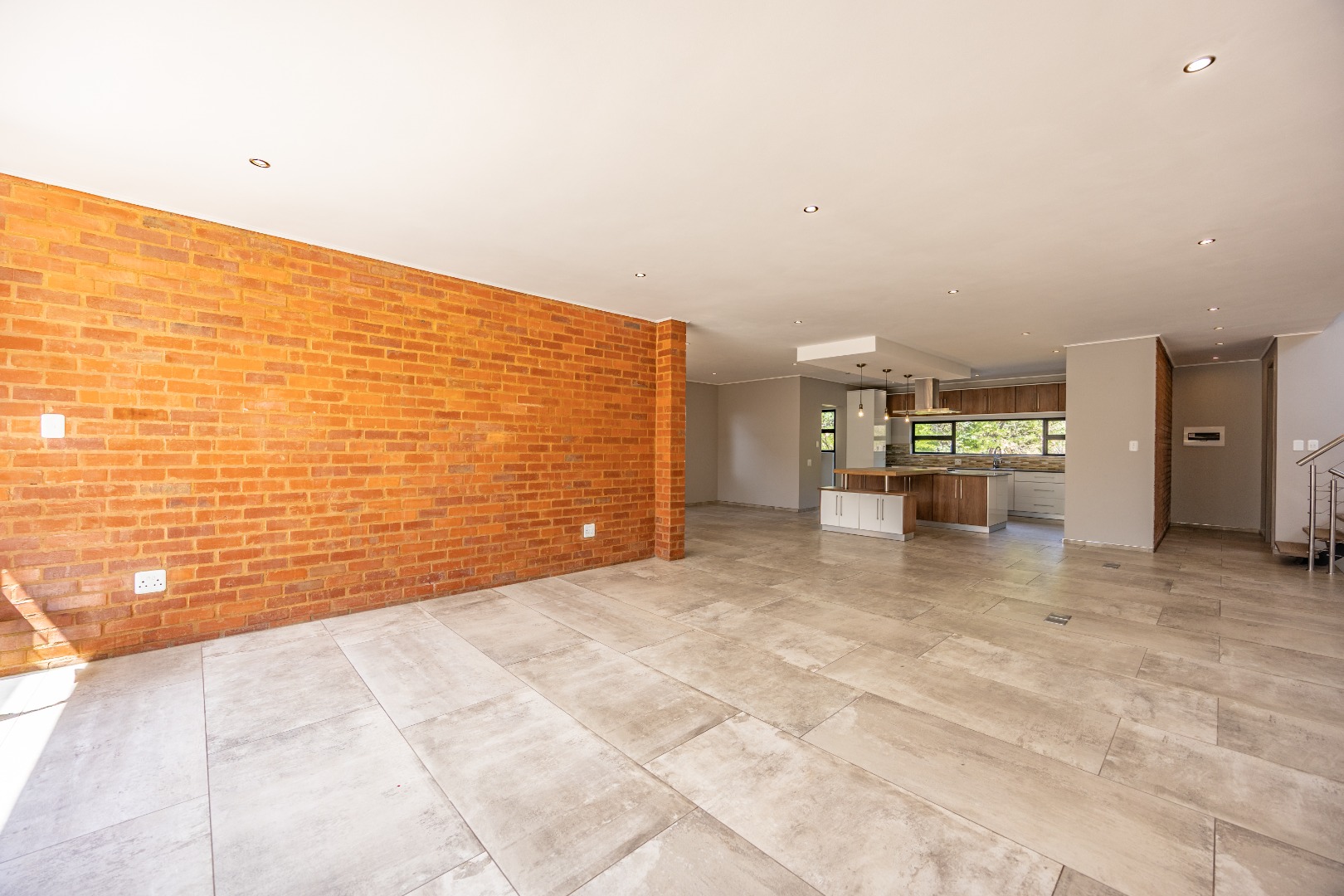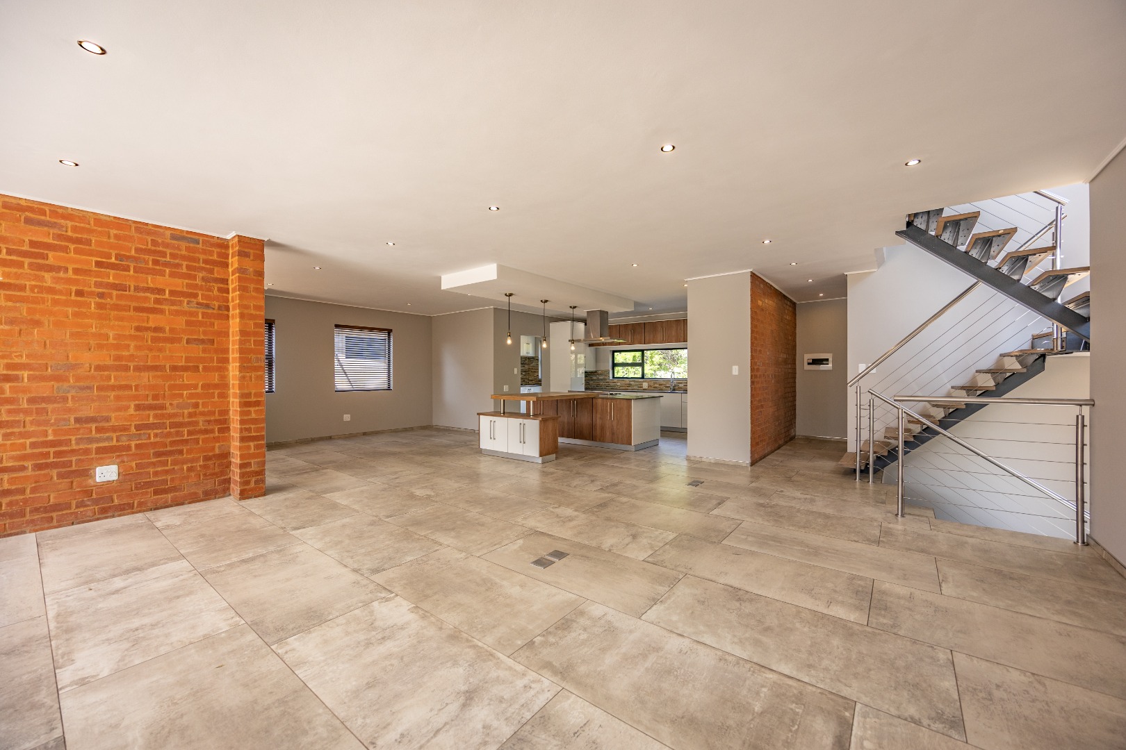 The main floor features an inviting entrance hall that opens into a spacious open-plan living area. Here, the dining room, lounge, and enclosed braai area flow effortlessly together, creating a versatile space for family gatherings or entertaining. A contemporary kitchen with a separate scullery completes the picture.