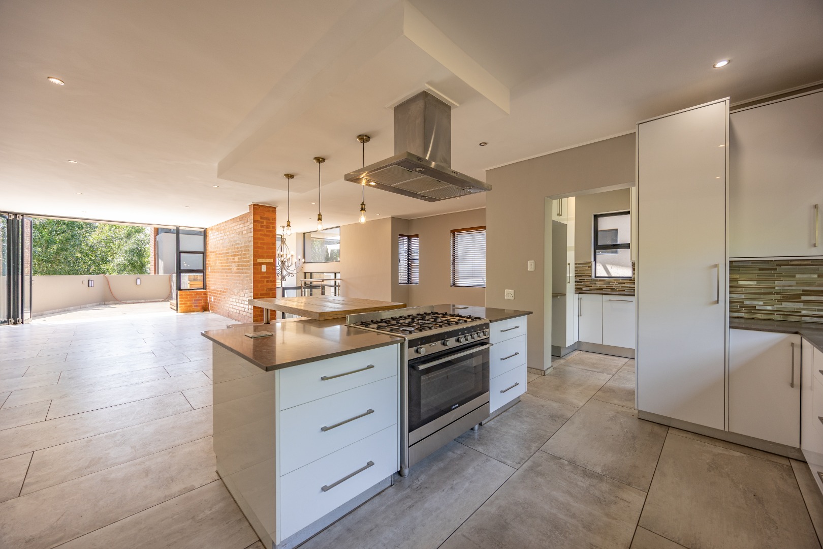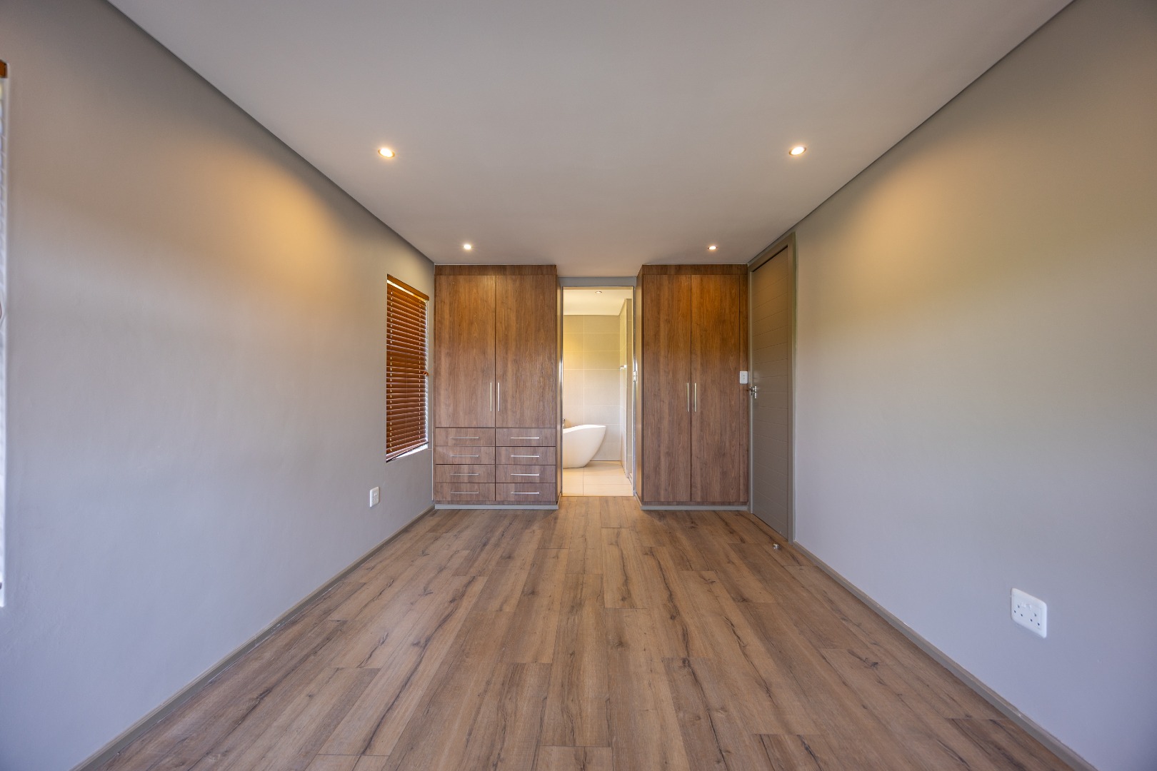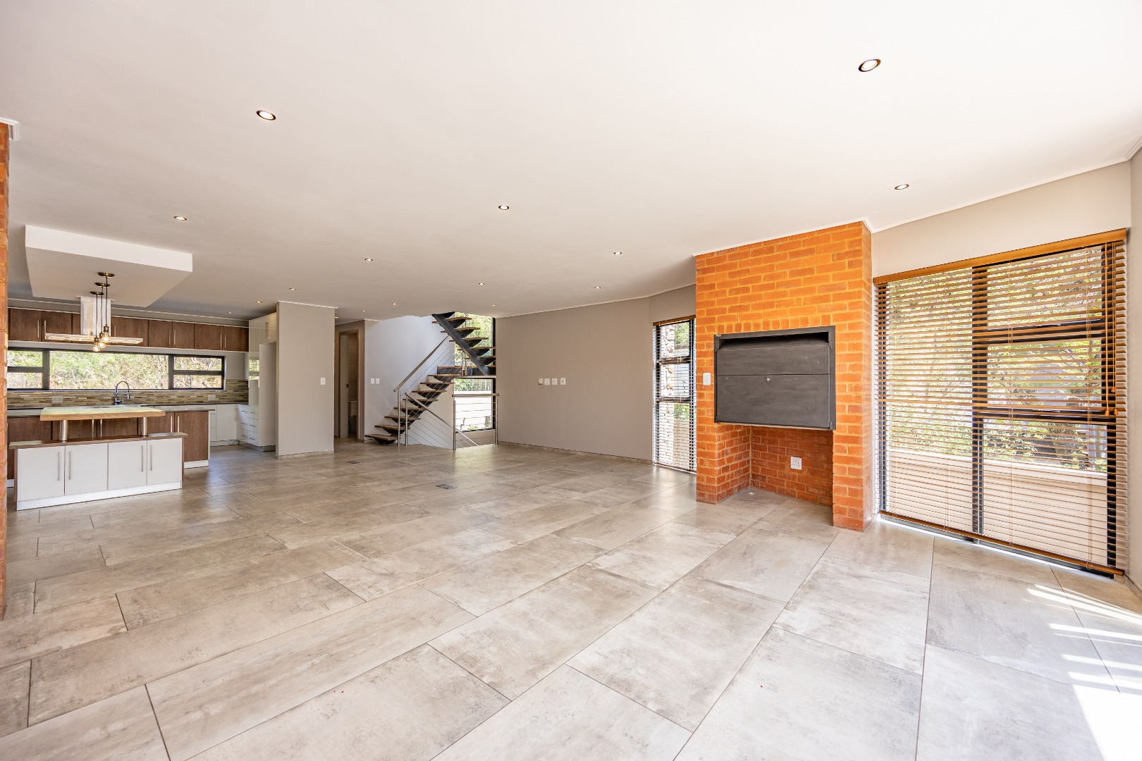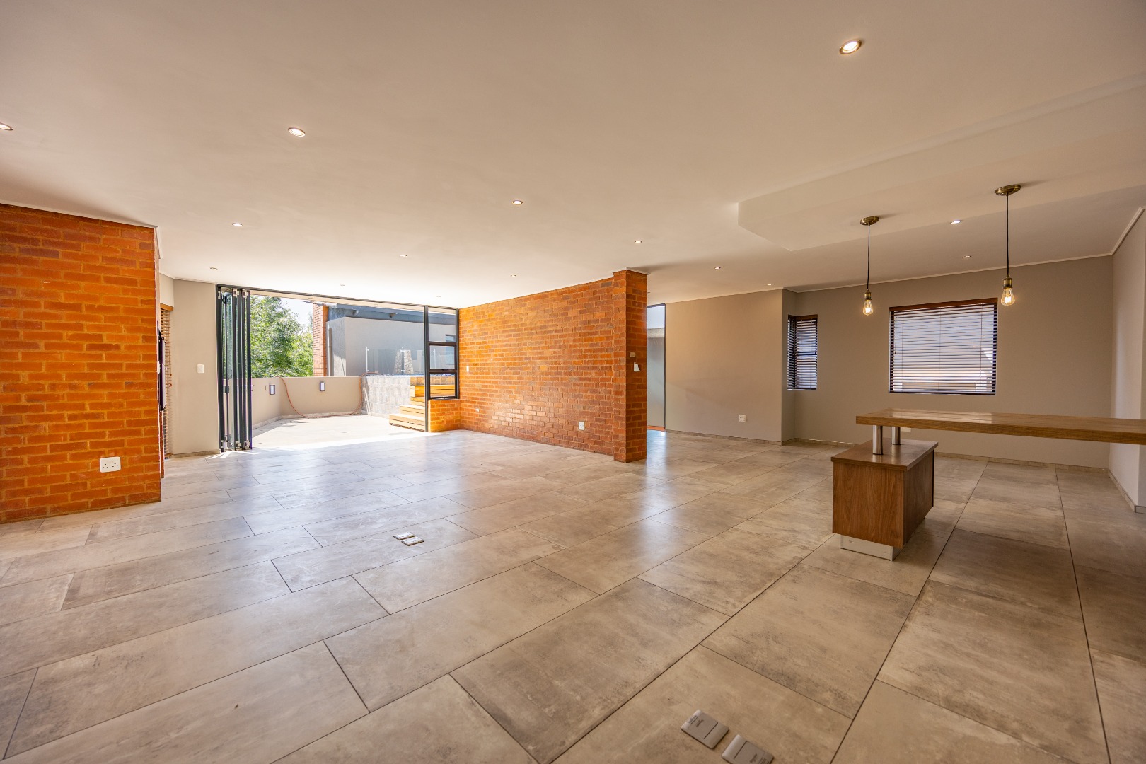 The main floor features an inviting entrance hall that opens into a spacious open-plan living area. Here, the dining room, lounge, and enclosed braai area flow effortlessly together, creating a versatile space for family gatherings or entertaining. A contemporary kitchen with a separate scullery completes the picture.