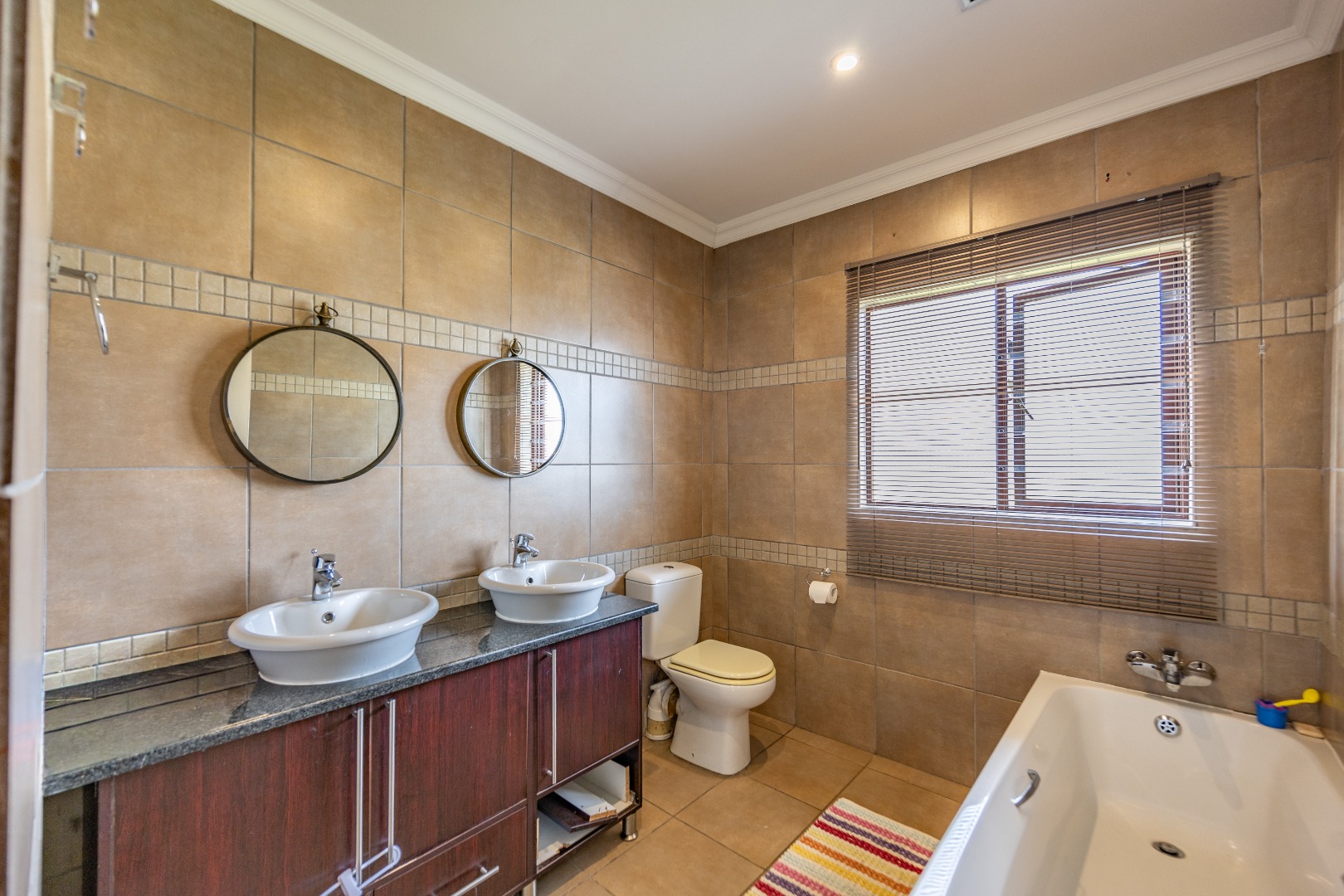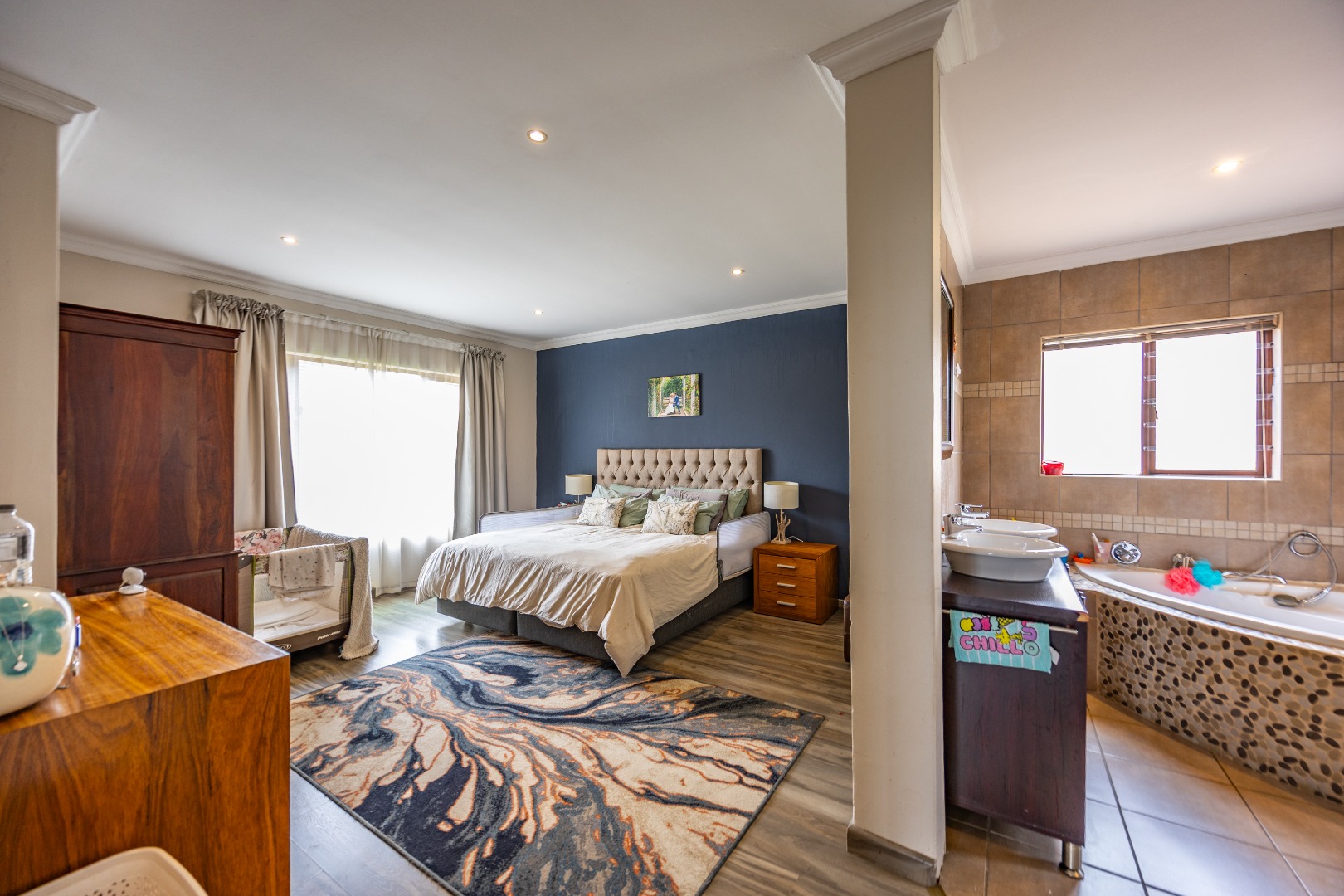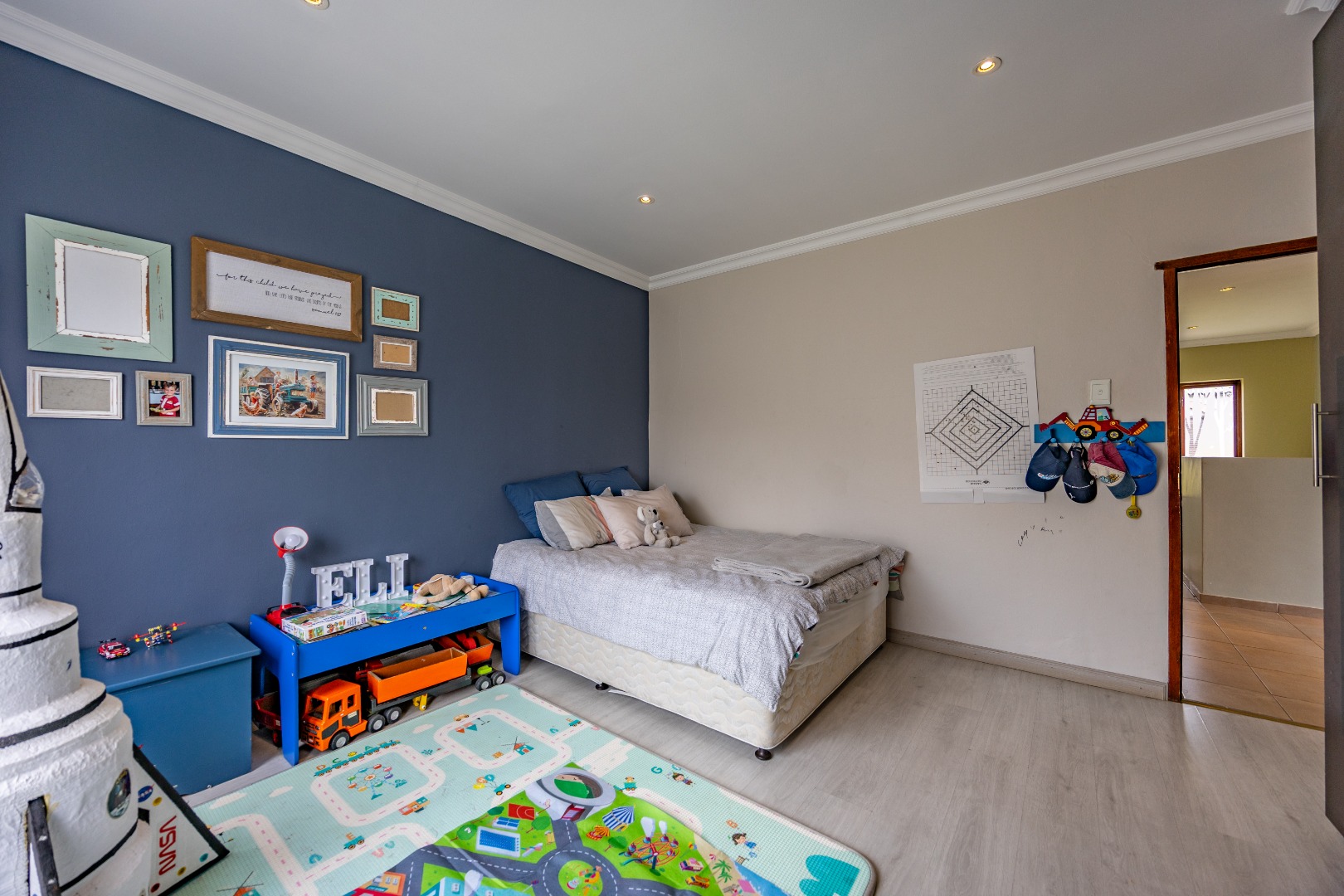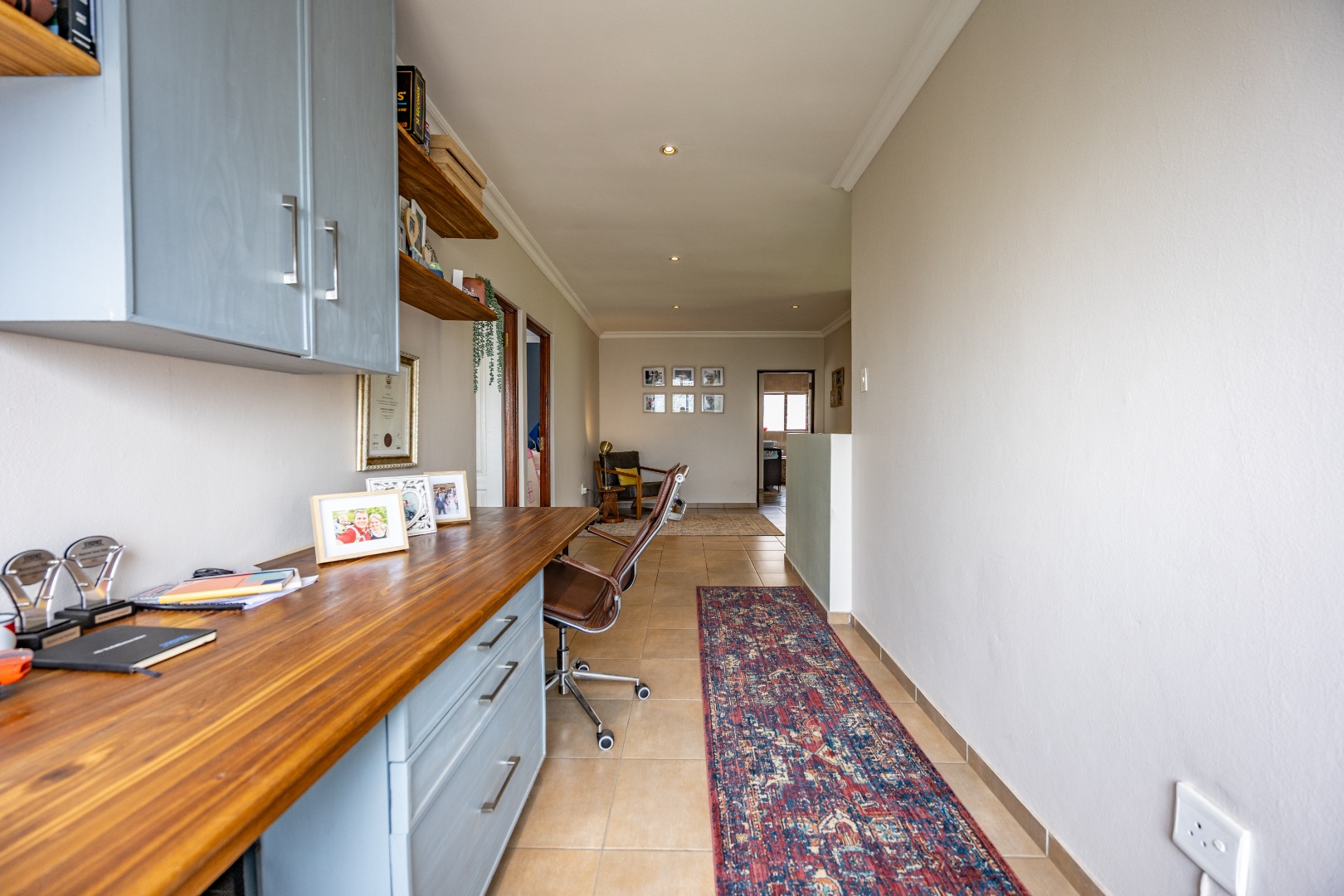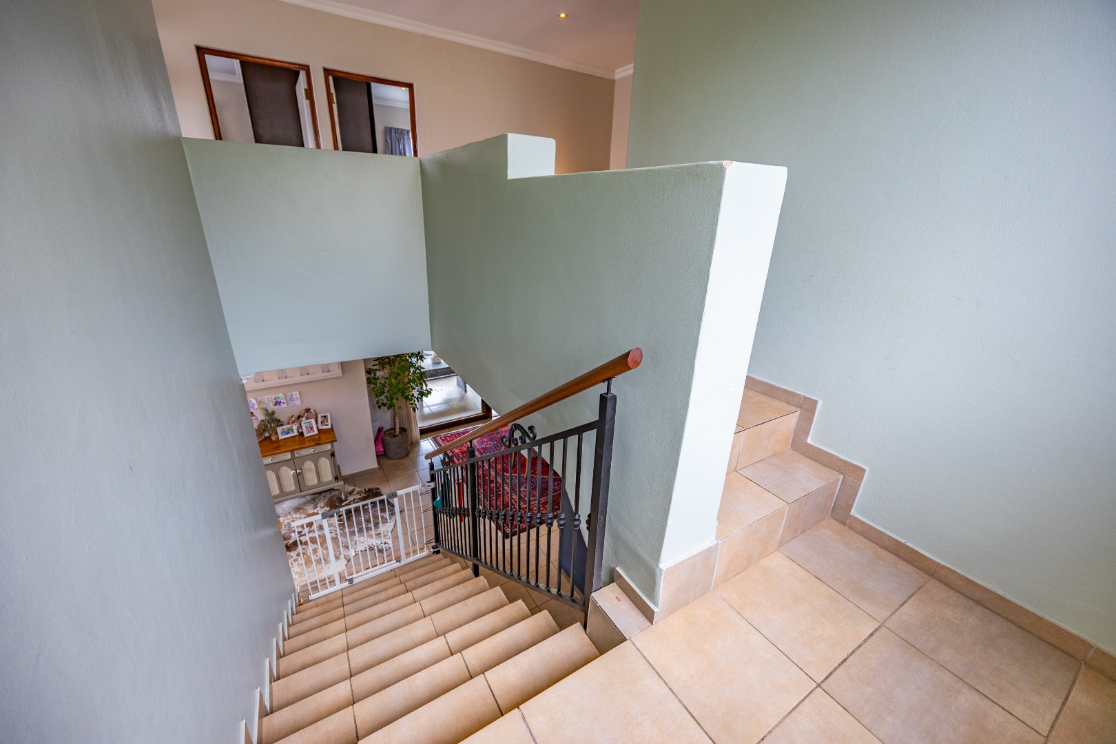 The ground floor welcomes you with light-filled living areas that flow seamlessly from a formal lounge and dining room to a relaxed family room. The open-plan kitchen, fitted with a gas stove and electric oven, offers an abundance of cupboard space and a separate scullery for added convenience.