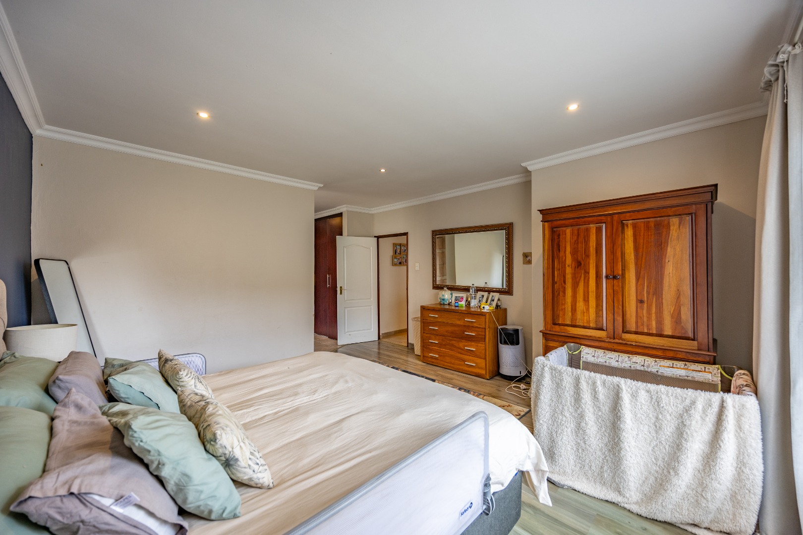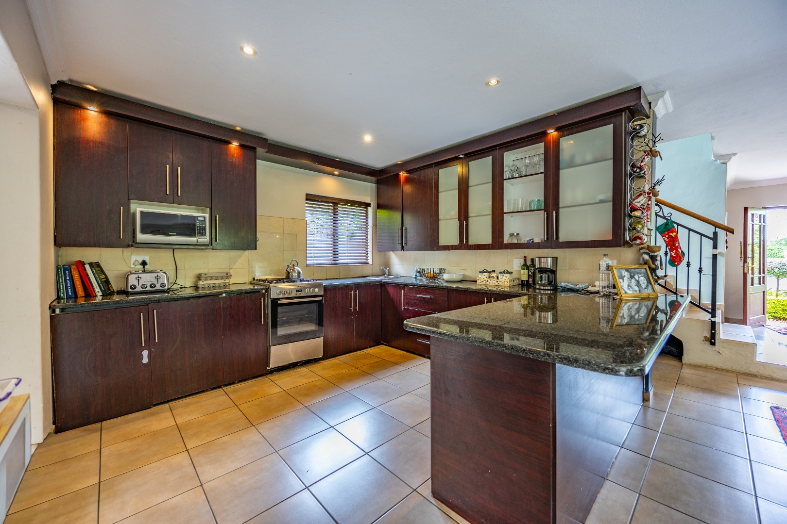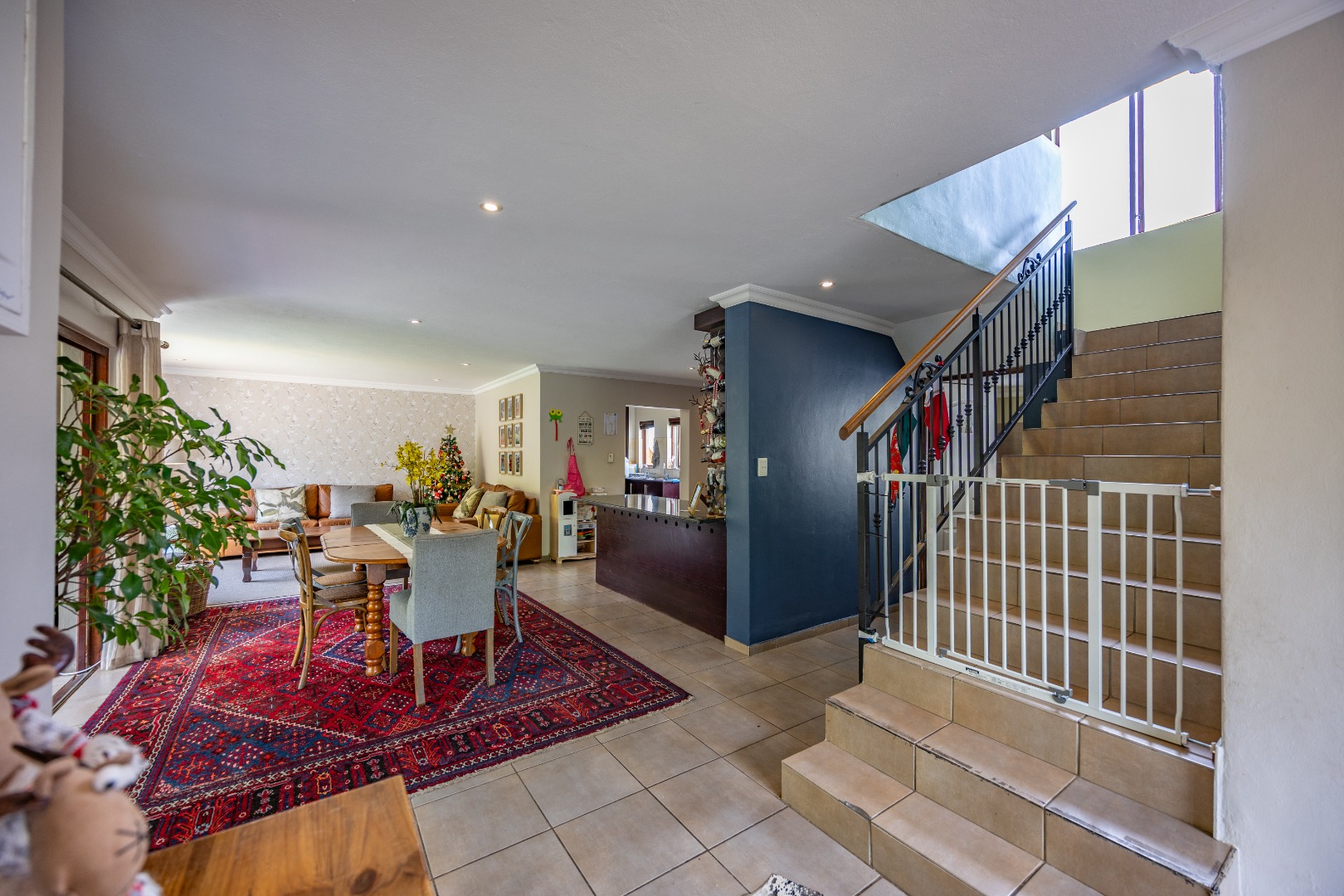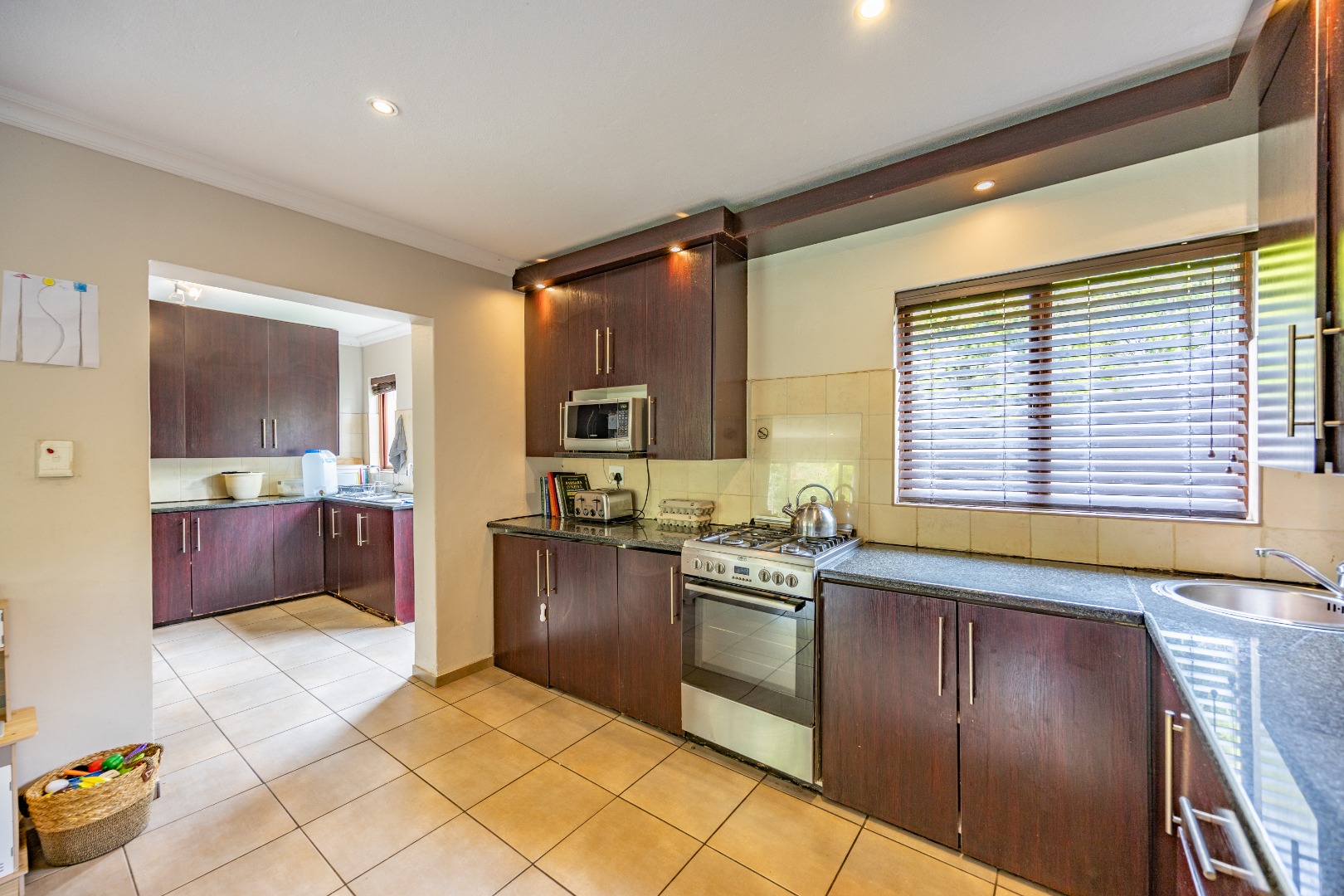 The ground floor welcomes you with light-filled living areas that flow seamlessly from a formal lounge and dining room to a relaxed family room. The open-plan kitchen, fitted with a gas stove and electric oven, offers an abundance of cupboard space and a separate scullery for added convenience.