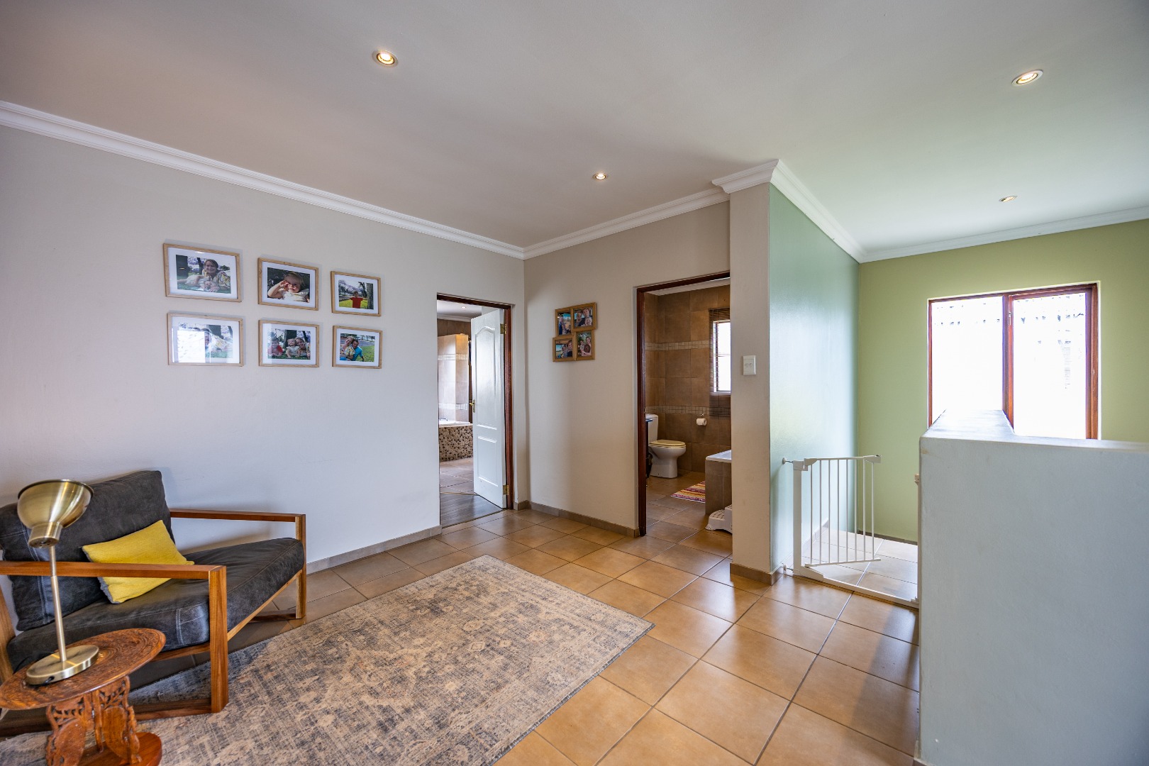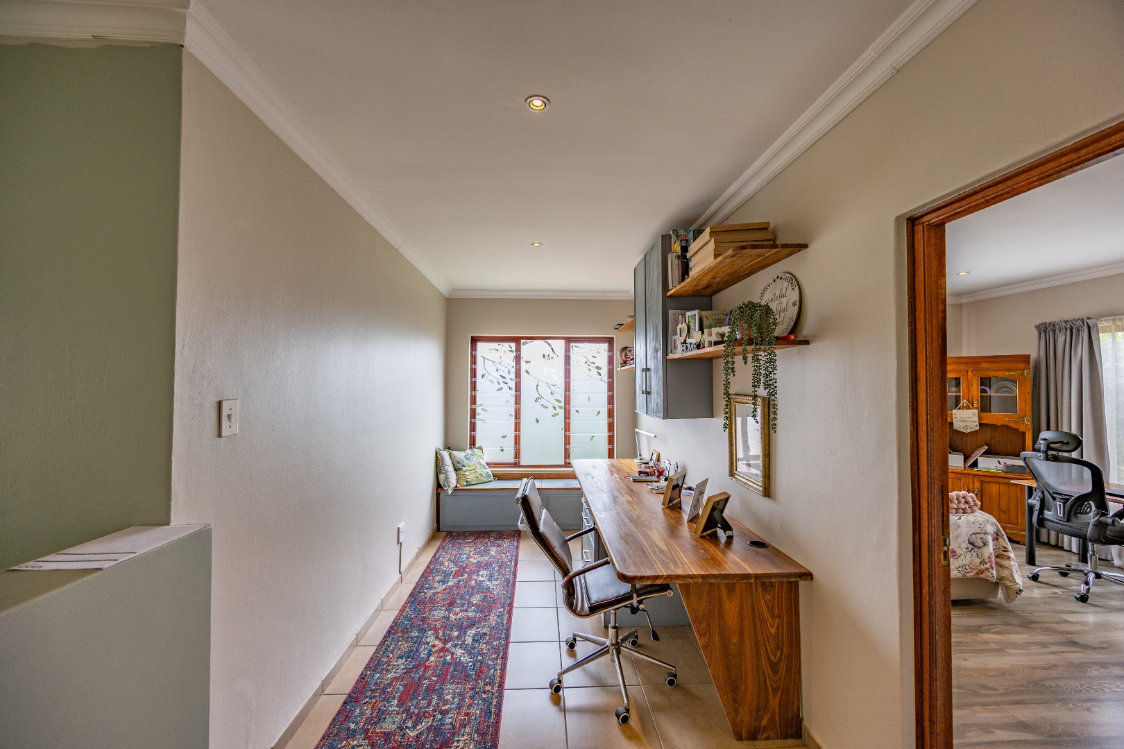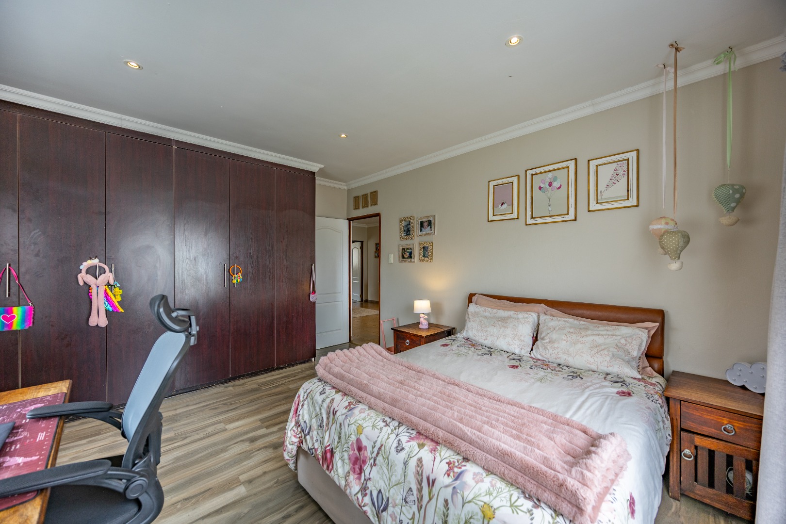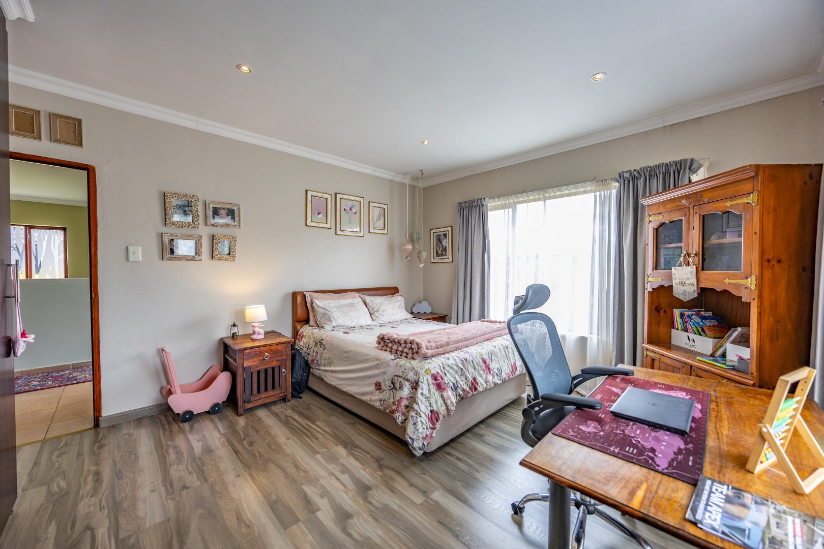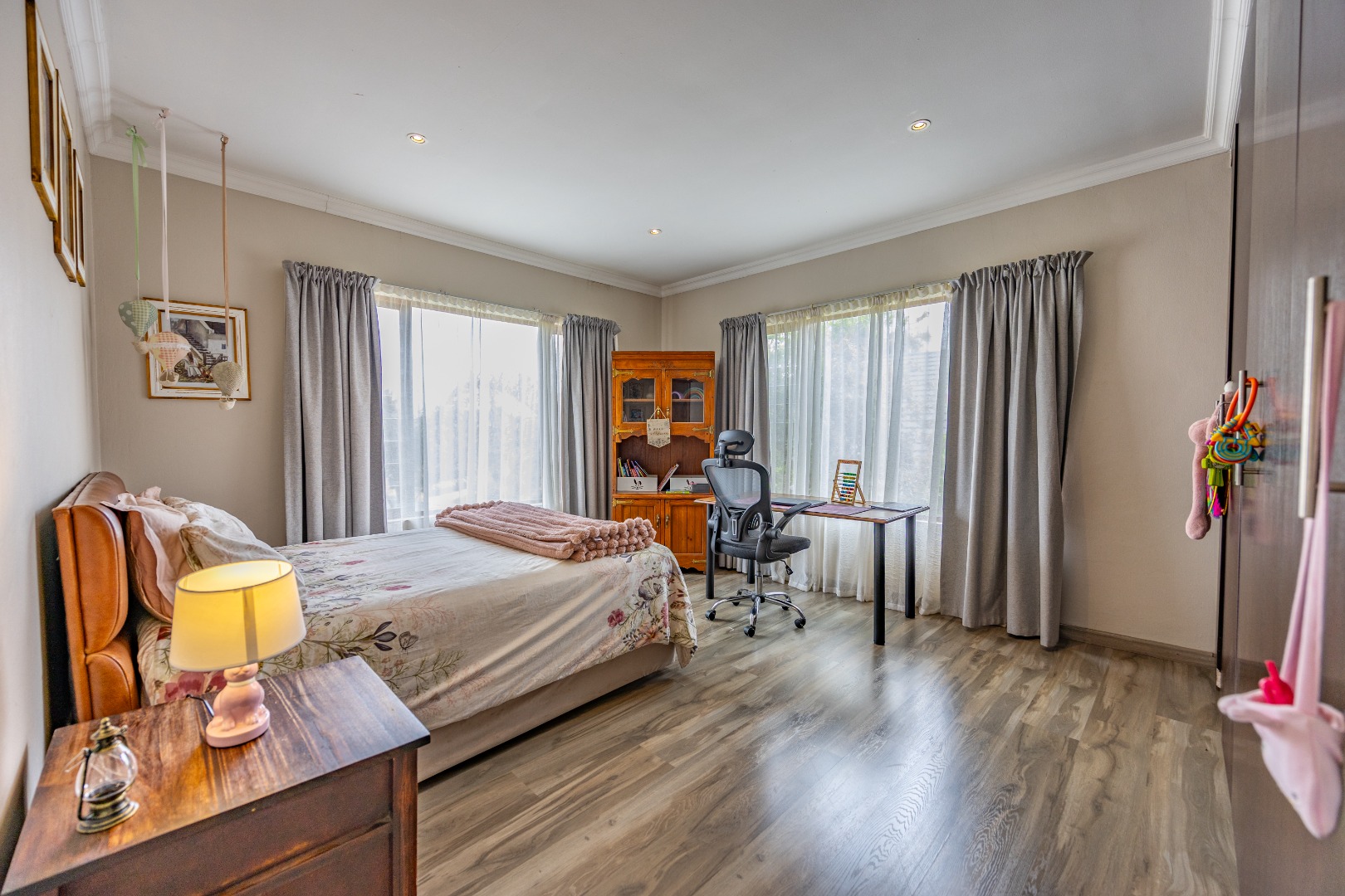 The ground floor welcomes you with light-filled living areas that flow seamlessly from a formal lounge and dining room to a relaxed family room. The open-plan kitchen, fitted with a gas stove and electric oven, offers an abundance of cupboard space and a separate scullery for added convenience.