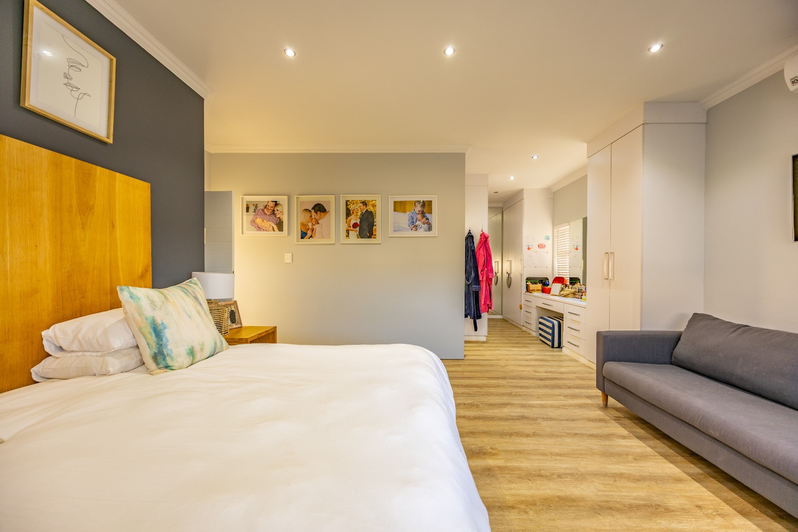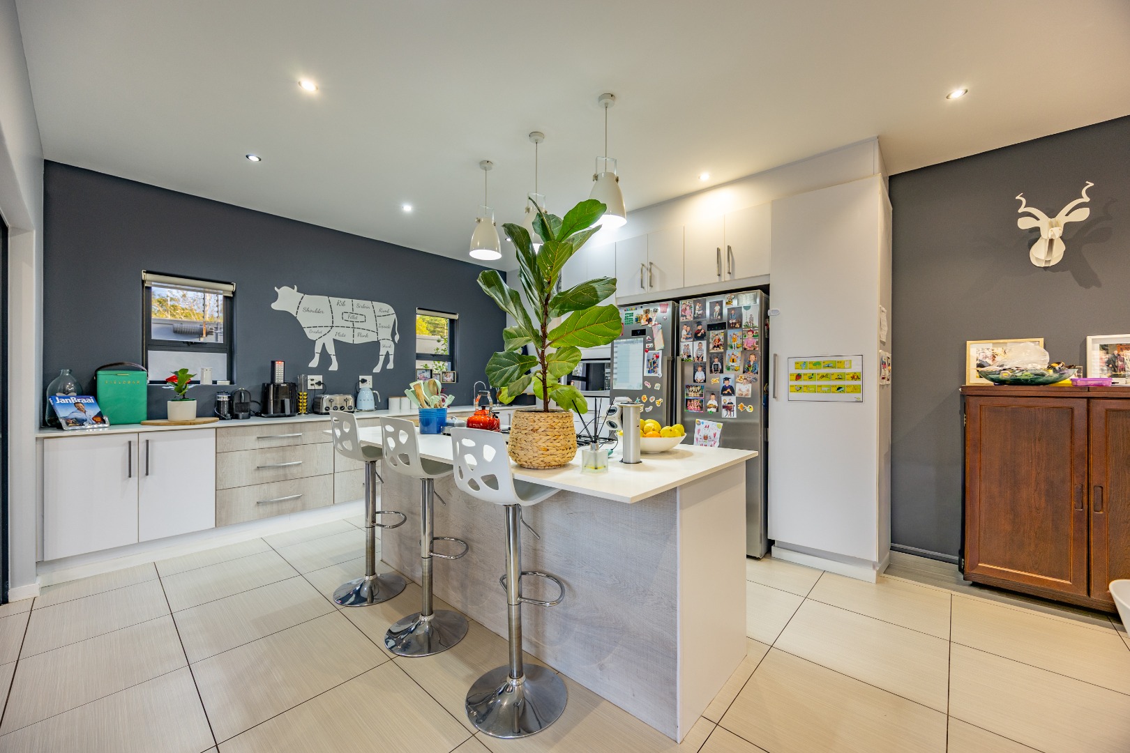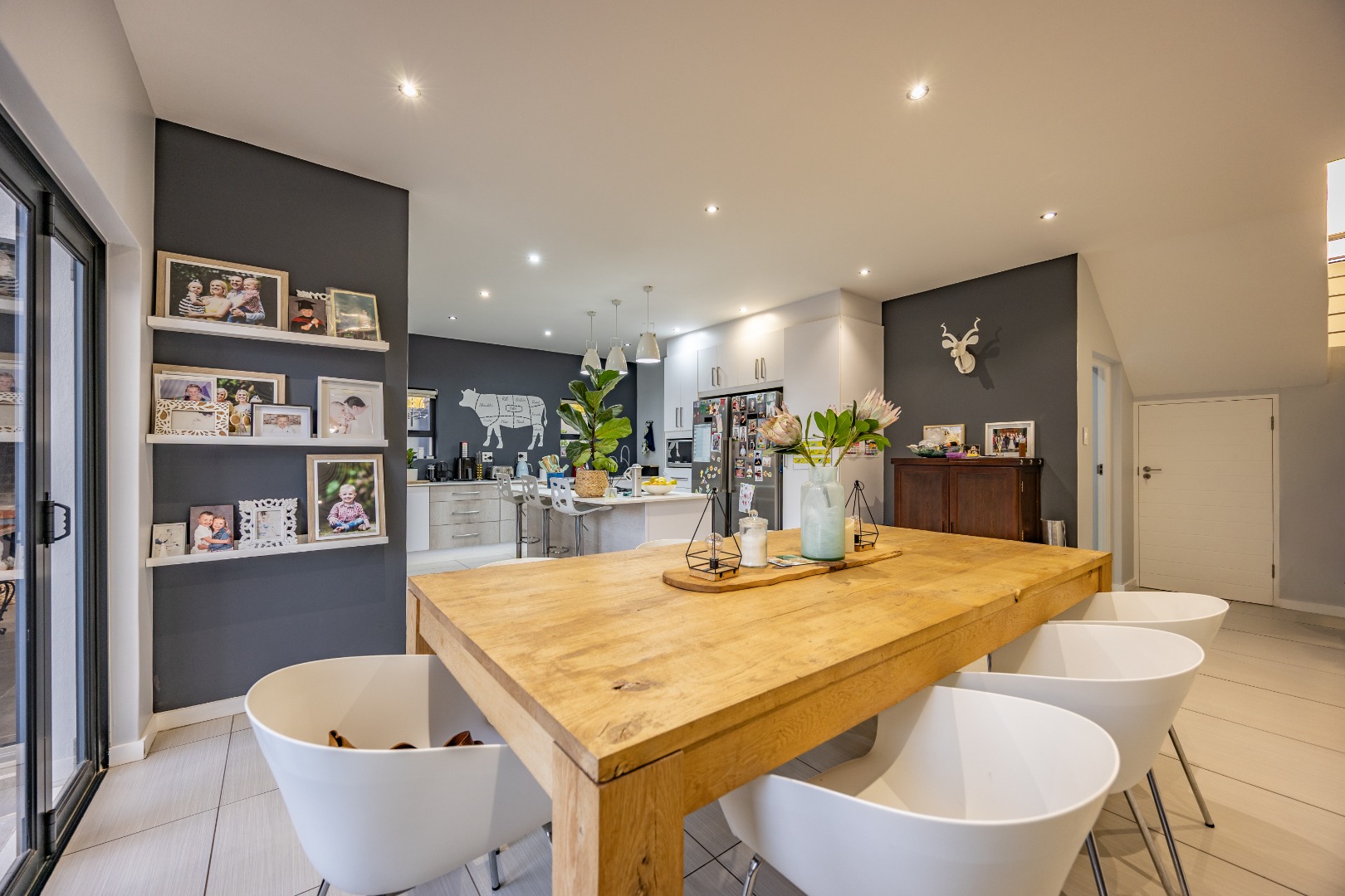 The open-plan layout flows effortlessly between the lounge, dining area, and kitchen — every inch designed for connection and lifestyle. The lounge is complete with air-conditioning for all-season comfort, while the dining space blends beautifully with a chef’s kitchen finished in sleek Caesarstone and complemented by a granite scullery with space for two appliances. Every line, surface, and fixture has been chosen to elevate the experience.