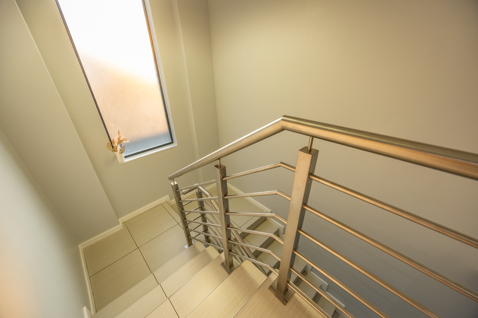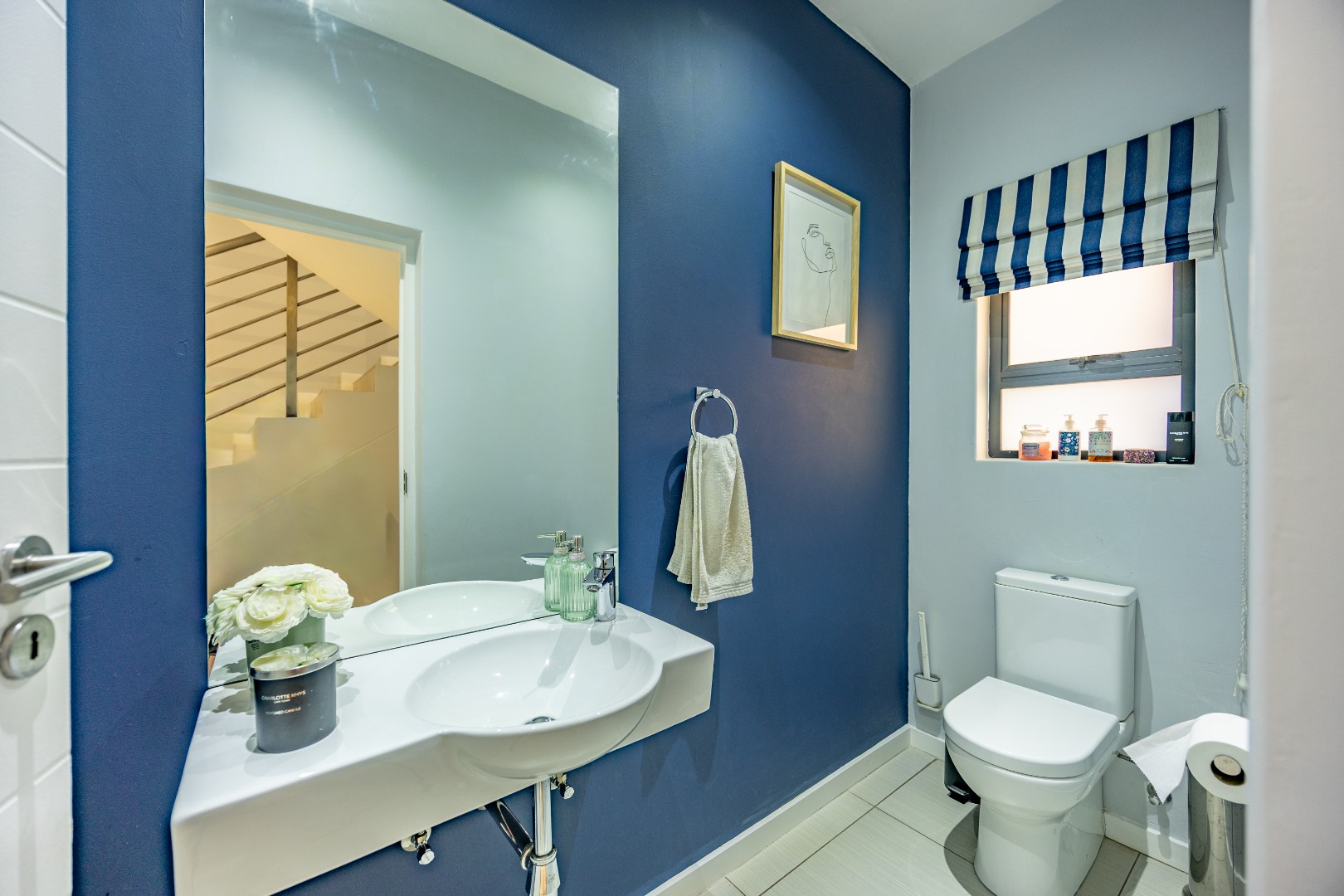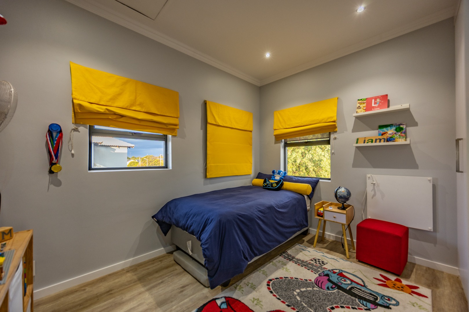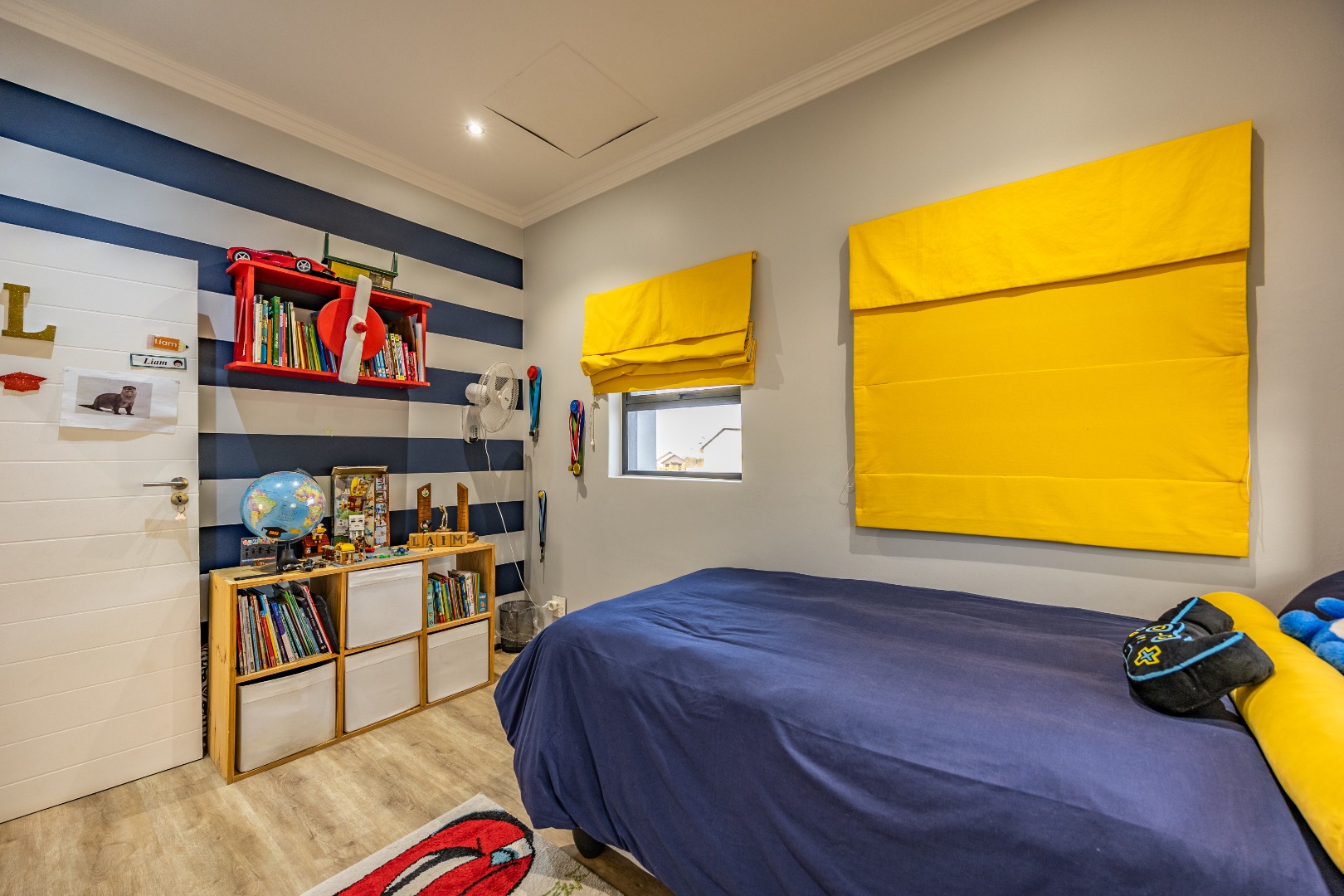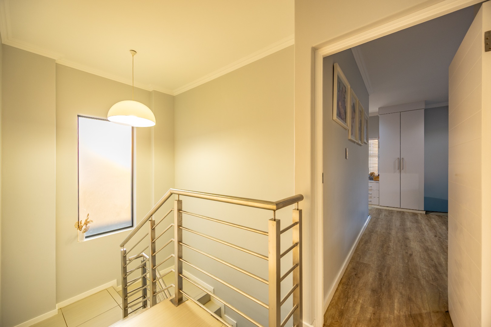 Upstairs, the main suite is a sanctuary of calm sophistication — featuring a walk-in wardrobe, luxurious en-suite bathroom, and air-conditioning for year-round comfort. The additional bedrooms echo the same level of quality, each offering built-in cupboards, laminated flooring, and roller blinds, all serviced by a stylish shared bathroom. A linen cupboard adds practical convenience without compromising on aesthetic flow.