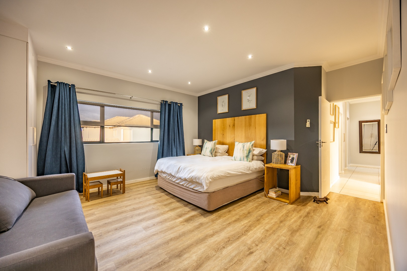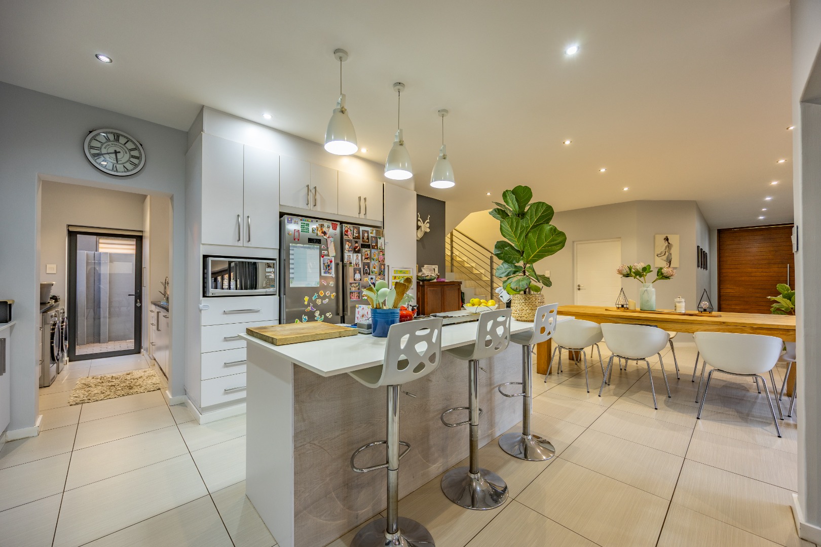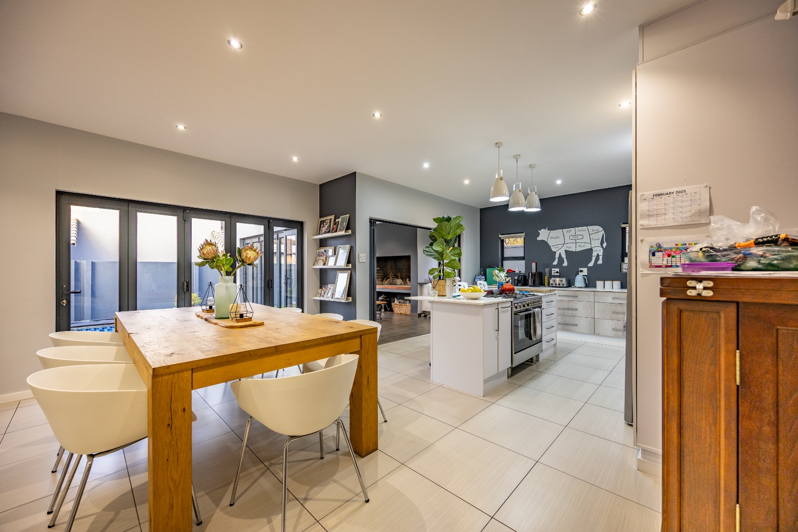 The open-plan layout flows effortlessly between the lounge, dining area, and kitchen — every inch designed for connection and lifestyle. The lounge is complete with air-conditioning for all-season comfort, while the dining space blends beautifully with a chef’s kitchen finished in sleek Caesarstone and complemented by a granite scullery with space for two appliances. Every line, surface, and fixture has been chosen to elevate the experience.