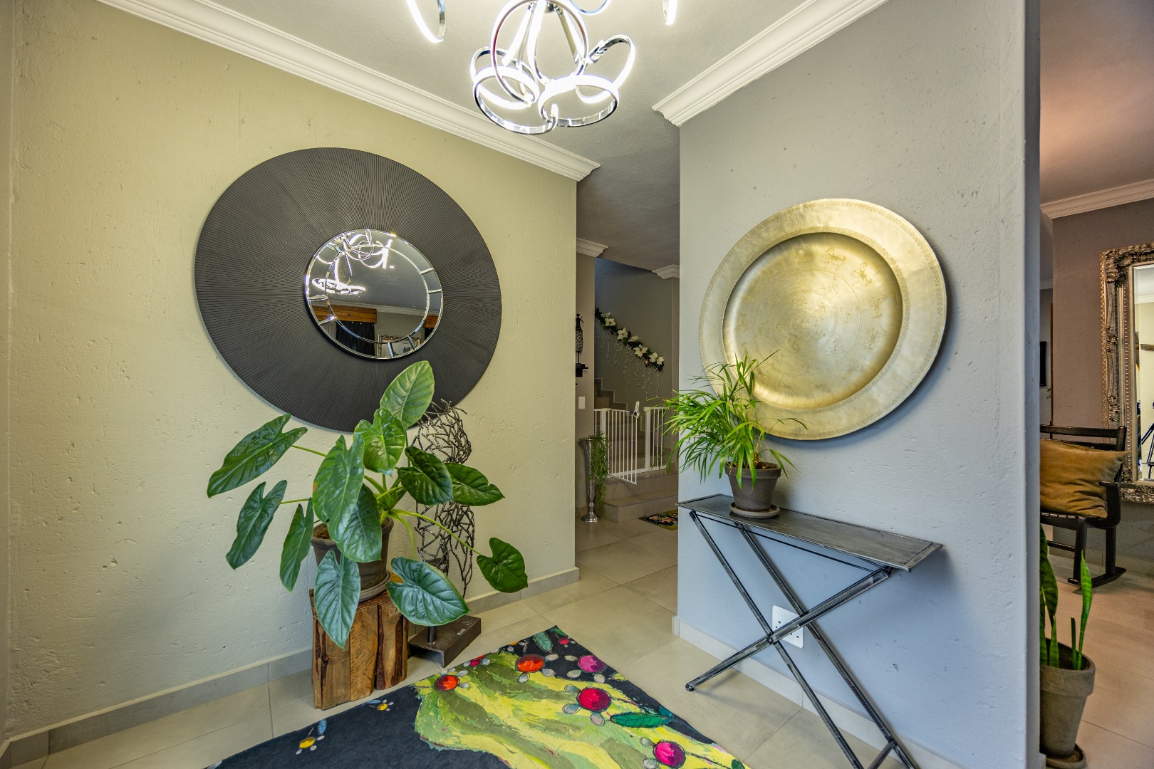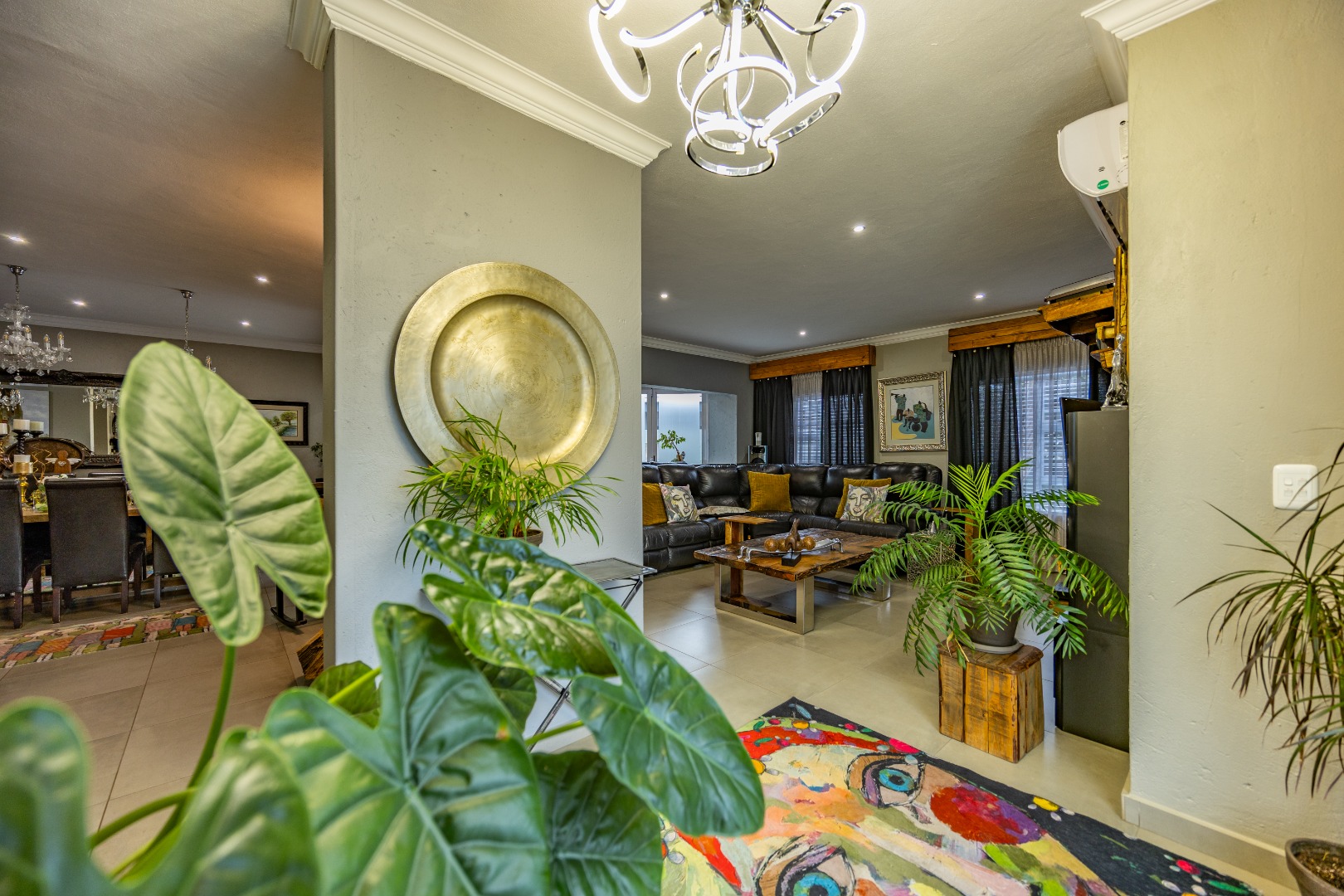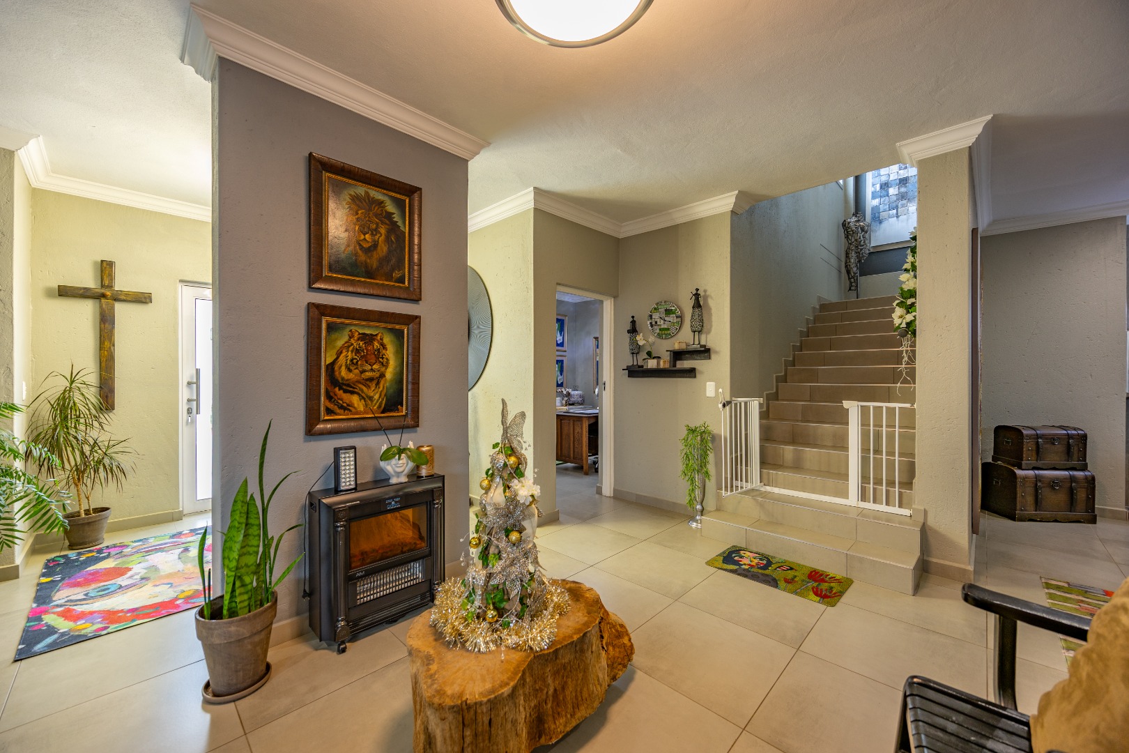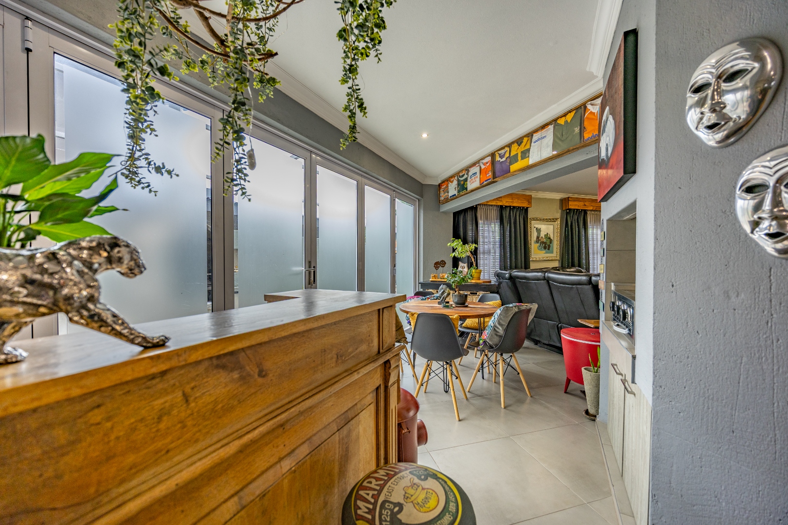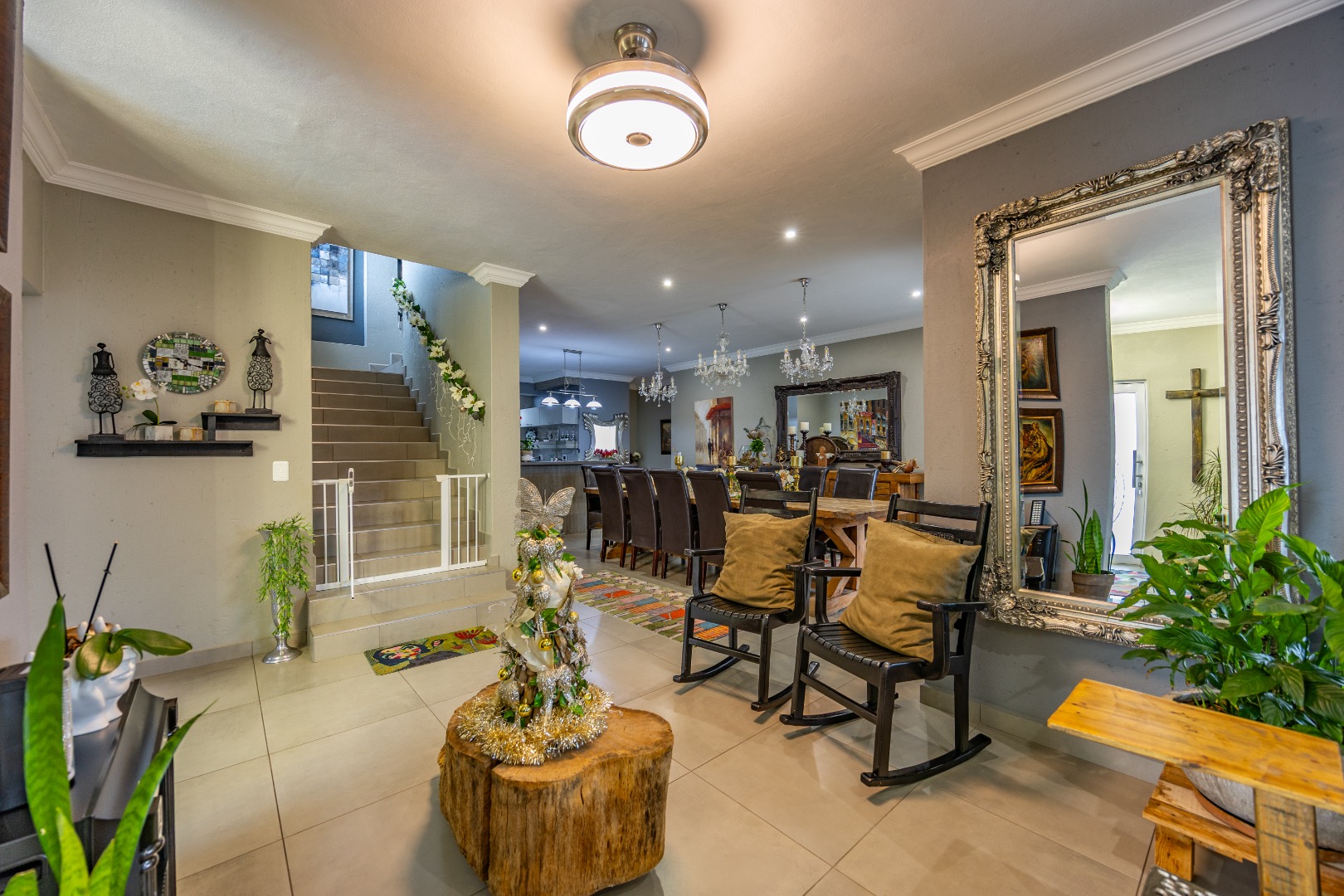 This beautifully designed 5-bedroom residence offers an exceptional blend of luxury, comfort, and modern living in one of Olympus AH’s most desirable estates. The ground floor welcomes you with generous living spaces including an inviting family TV room, a dining area, and a spacious study. A well-appointed guest bedroom with a full en-suite bathroom provides privacy for visitors. The open-plan kitchen features granite countertops, a gas hob, pantry, and separate scullery, flowing effortlessly to the built-in braai area, patio, lush garden, heated swimming pool, and Jacuzzi—perfect for year-round entertaining.