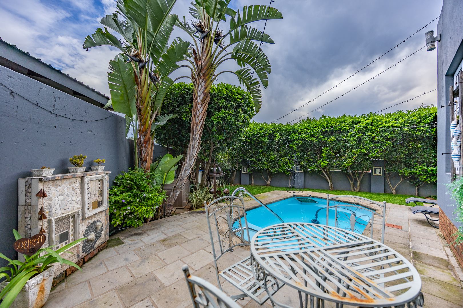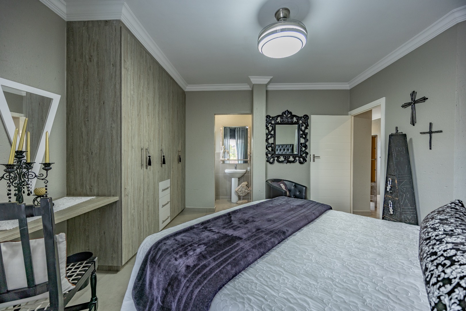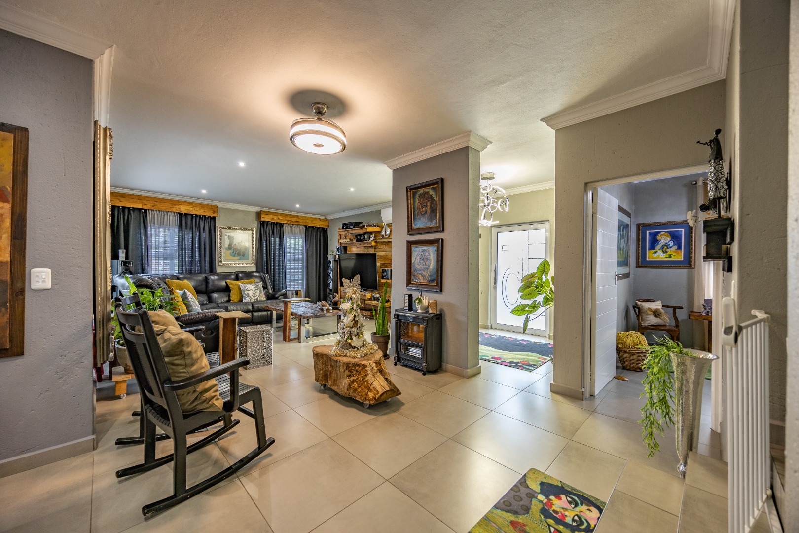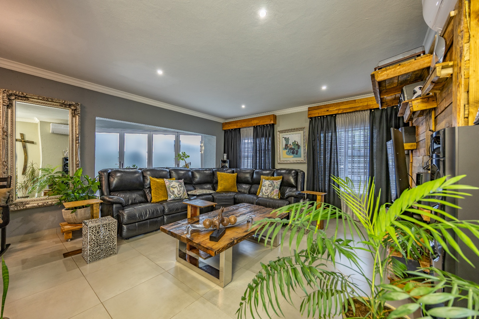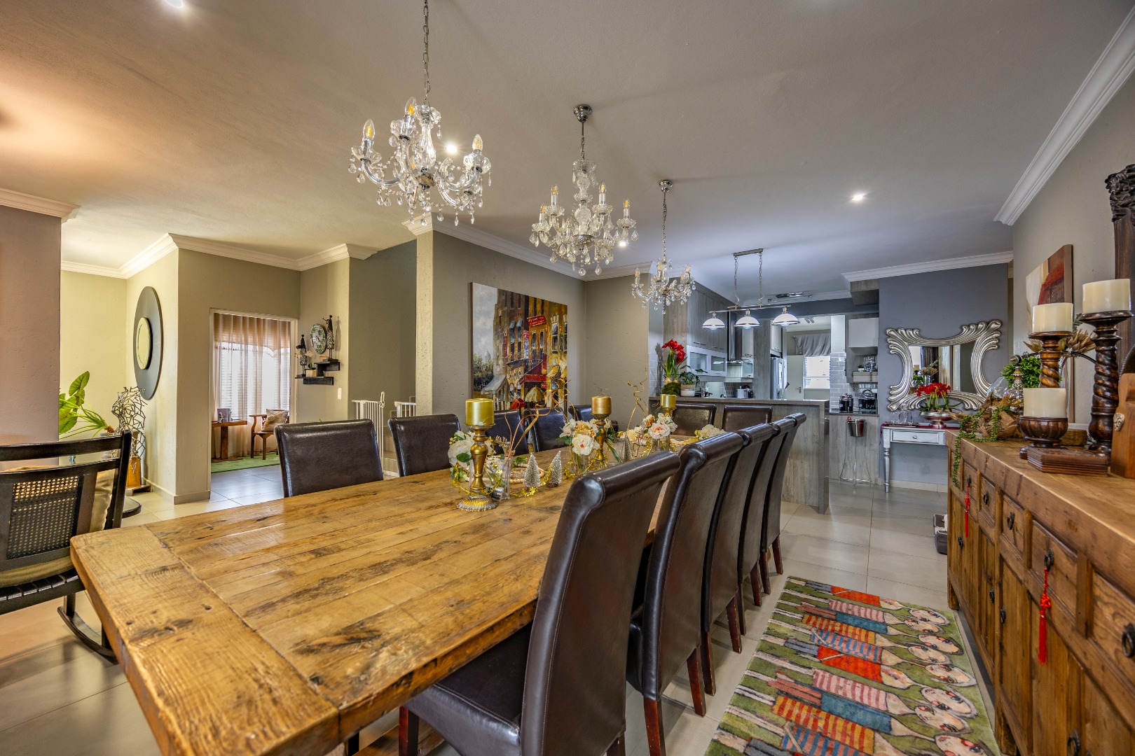 This beautifully designed 5-bedroom residence offers an exceptional blend of luxury, comfort, and modern living in one of Olympus AH’s most desirable estates. The ground floor welcomes you with generous living spaces including an inviting family TV room, a dining area, and a spacious study. A well-appointed guest bedroom with a full en-suite bathroom provides privacy for visitors. The open-plan kitchen features granite countertops, a gas hob, pantry, and separate scullery, flowing effortlessly to the built-in braai area, patio, lush garden, heated swimming pool, and Jacuzzi—perfect for year-round entertaining.