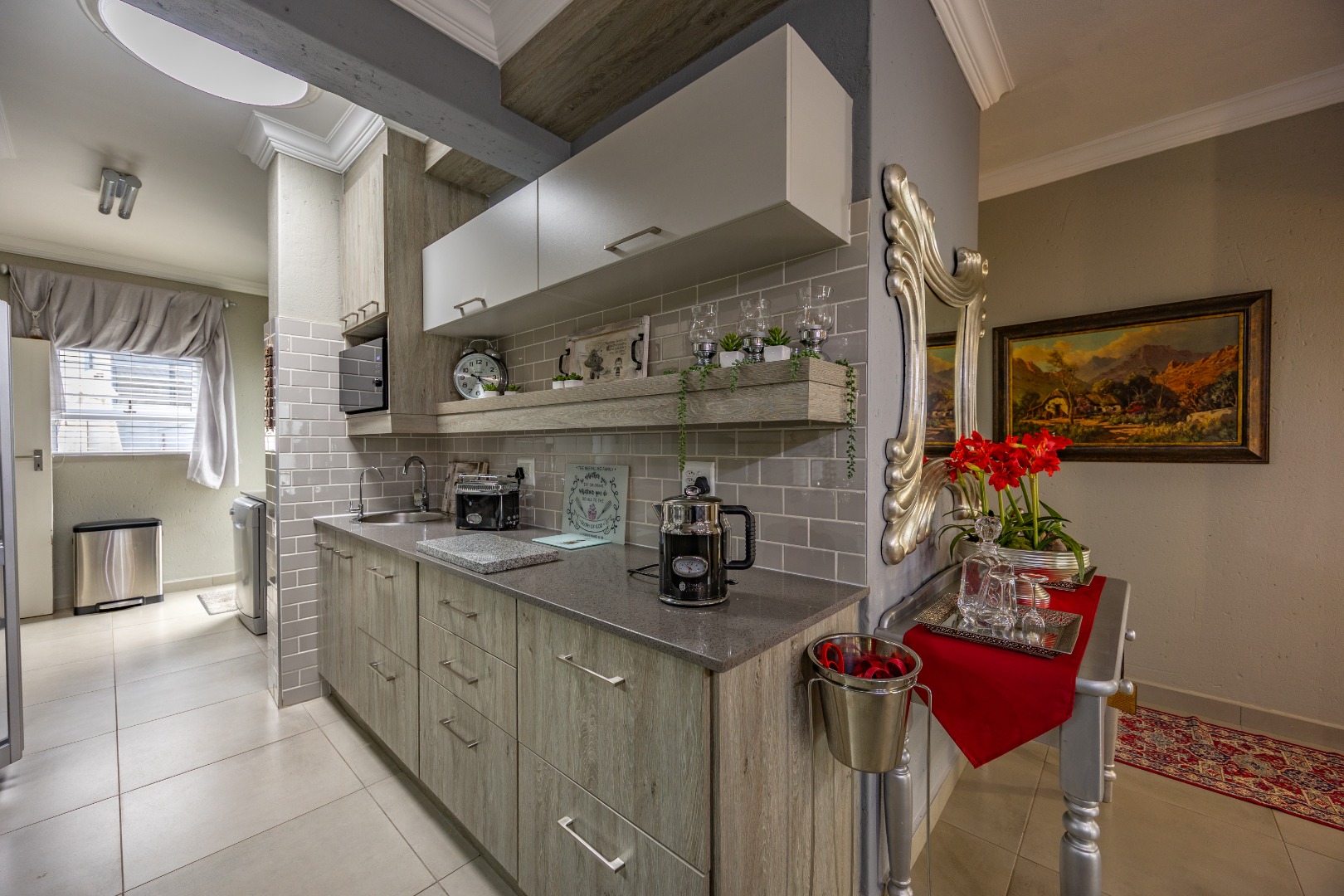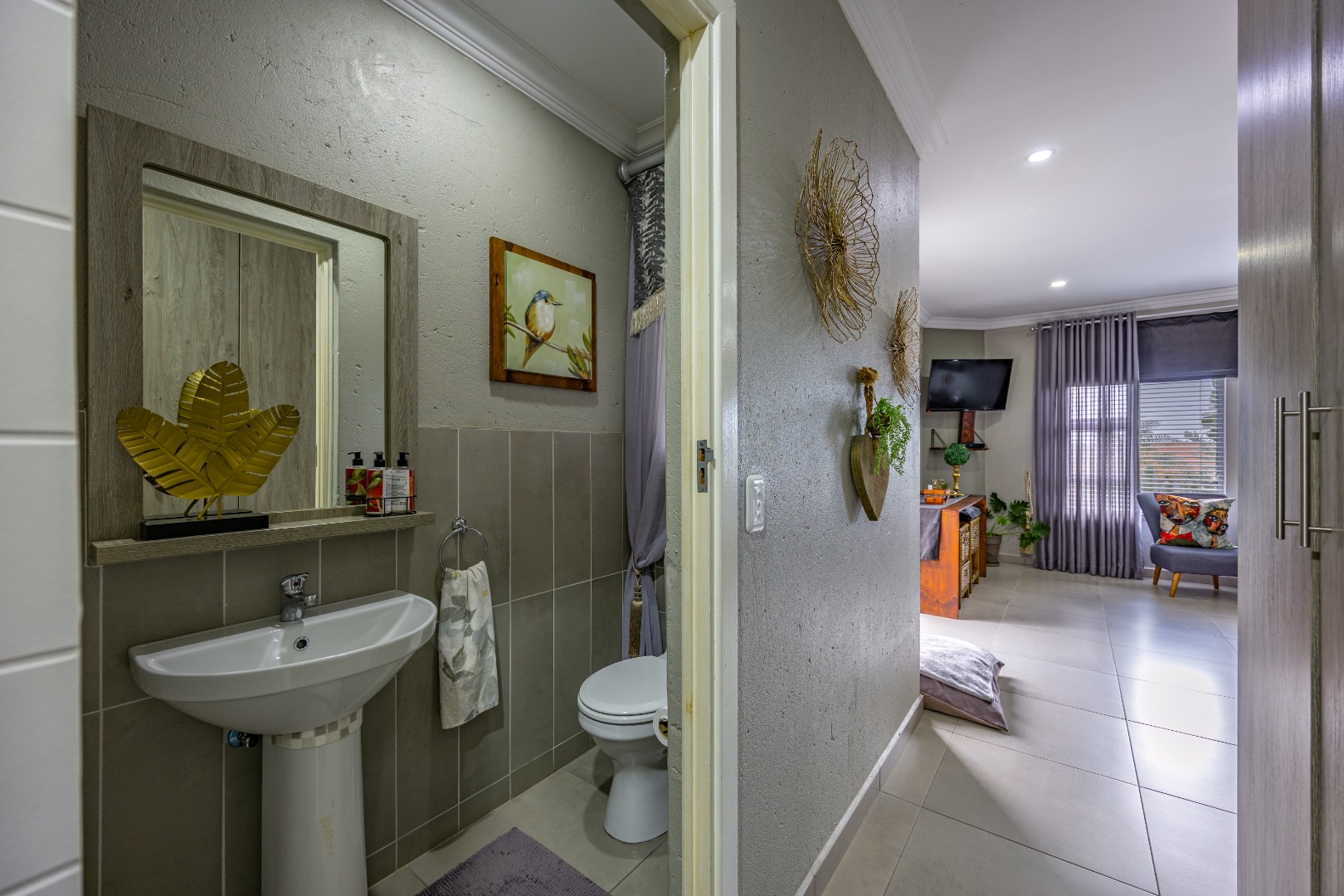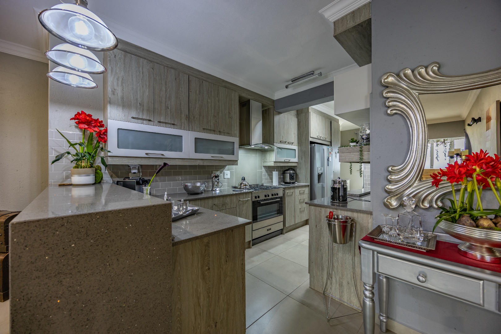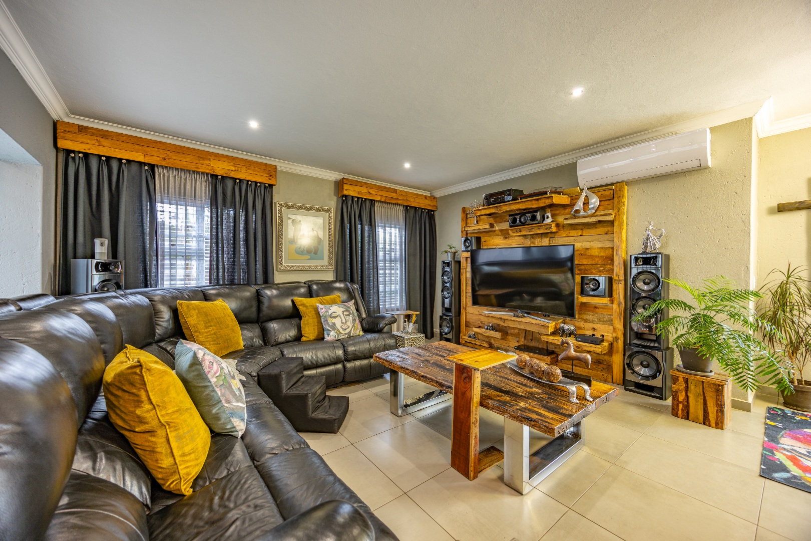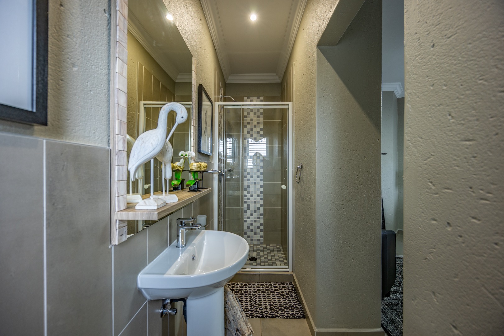 This beautifully designed 5-bedroom residence offers an exceptional blend of luxury, comfort, and modern living in one of Olympus AH’s most desirable estates. The ground floor welcomes you with generous living spaces including an inviting family TV room, a dining area, and a spacious study. A well-appointed guest bedroom with a full en-suite bathroom provides privacy for visitors. The open-plan kitchen features granite countertops, a gas hob, pantry, and separate scullery, flowing effortlessly to the built-in braai area, patio, lush garden, heated swimming pool, and Jacuzzi—perfect for year-round entertaining.