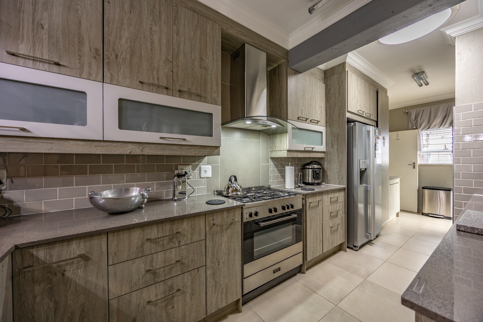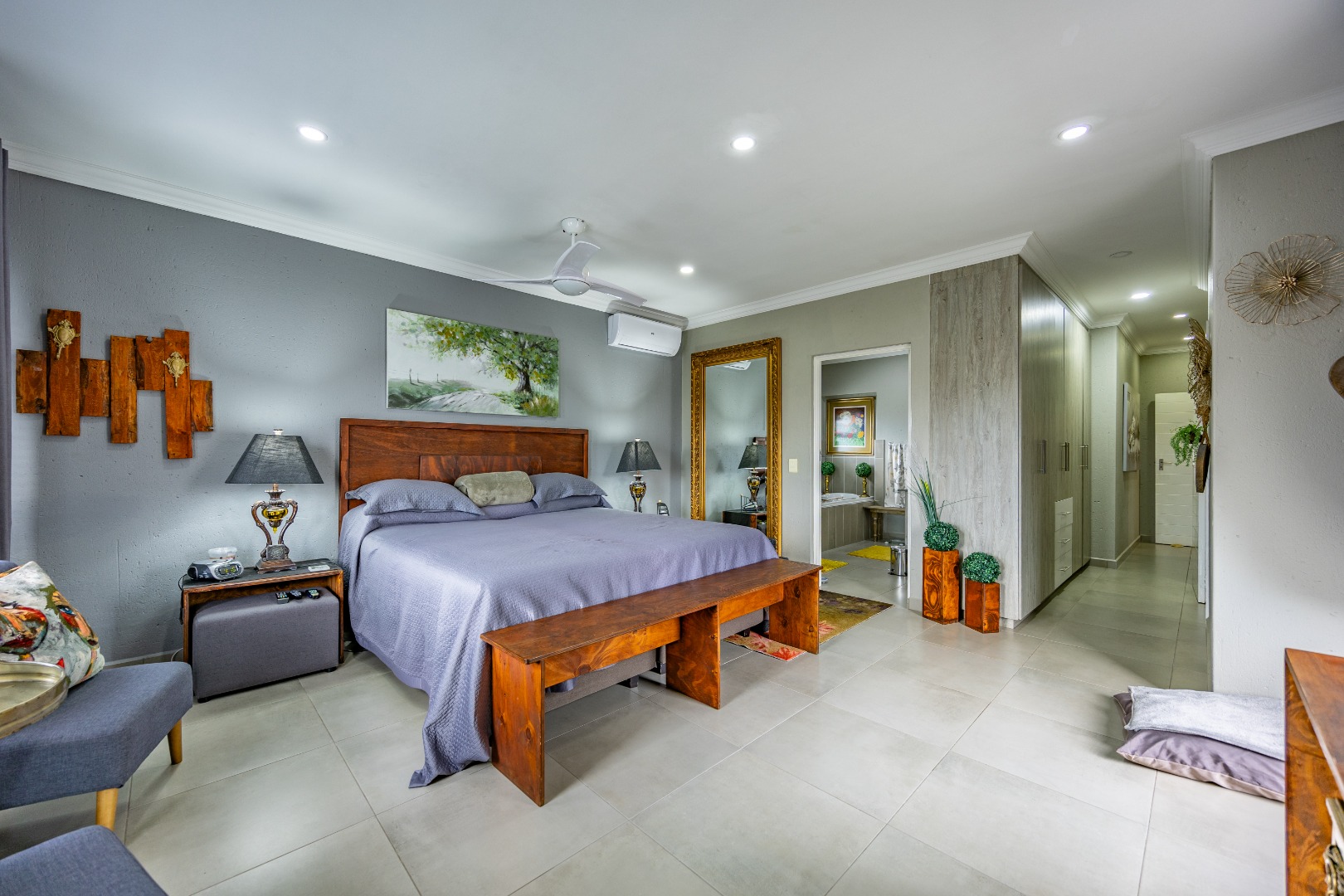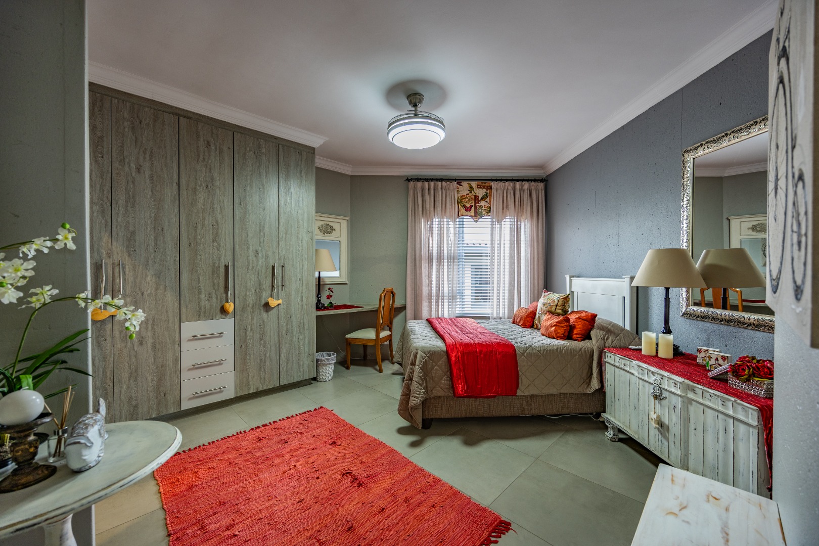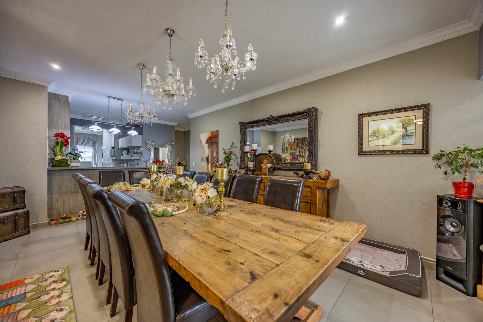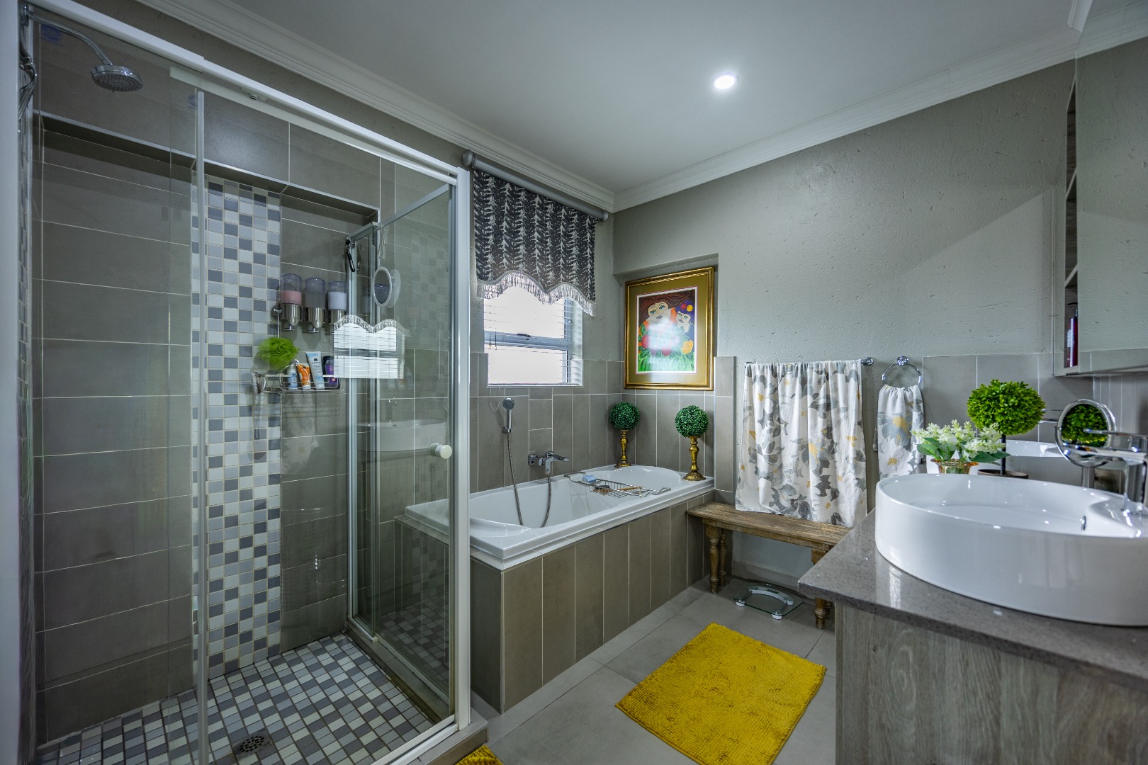 This beautifully designed 5-bedroom residence offers an exceptional blend of luxury, comfort, and modern living in one of Olympus AH’s most desirable estates. The ground floor welcomes you with generous living spaces including an inviting family TV room, a dining area, and a spacious study. A well-appointed guest bedroom with a full en-suite bathroom provides privacy for visitors. The open-plan kitchen features granite countertops, a gas hob, pantry, and separate scullery, flowing effortlessly to the built-in braai area, patio, lush garden, heated swimming pool, and Jacuzzi—perfect for year-round entertaining.