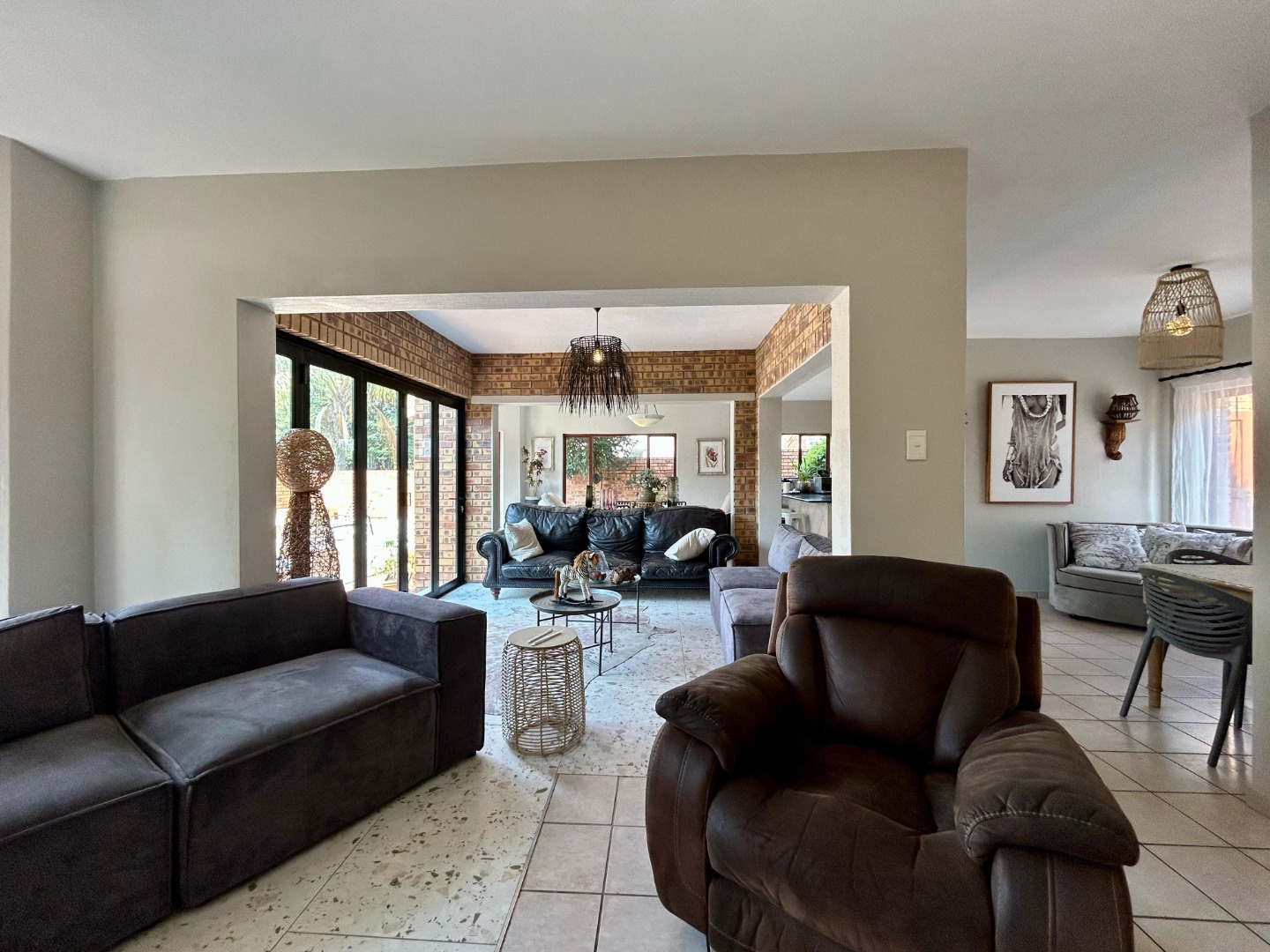 Upon entering, you are greeted by a spacious double-volume foyer that sets the tone for the home's sophisticated ambiance. The open-plan living and dining areas flow seamlessly, accentuated by high ceilings, large windows, and sliding doors that allow natural light to flood the interiors. A built-in fireplace in the lounge adds warmth and charm, perfect for cozy evenings in.